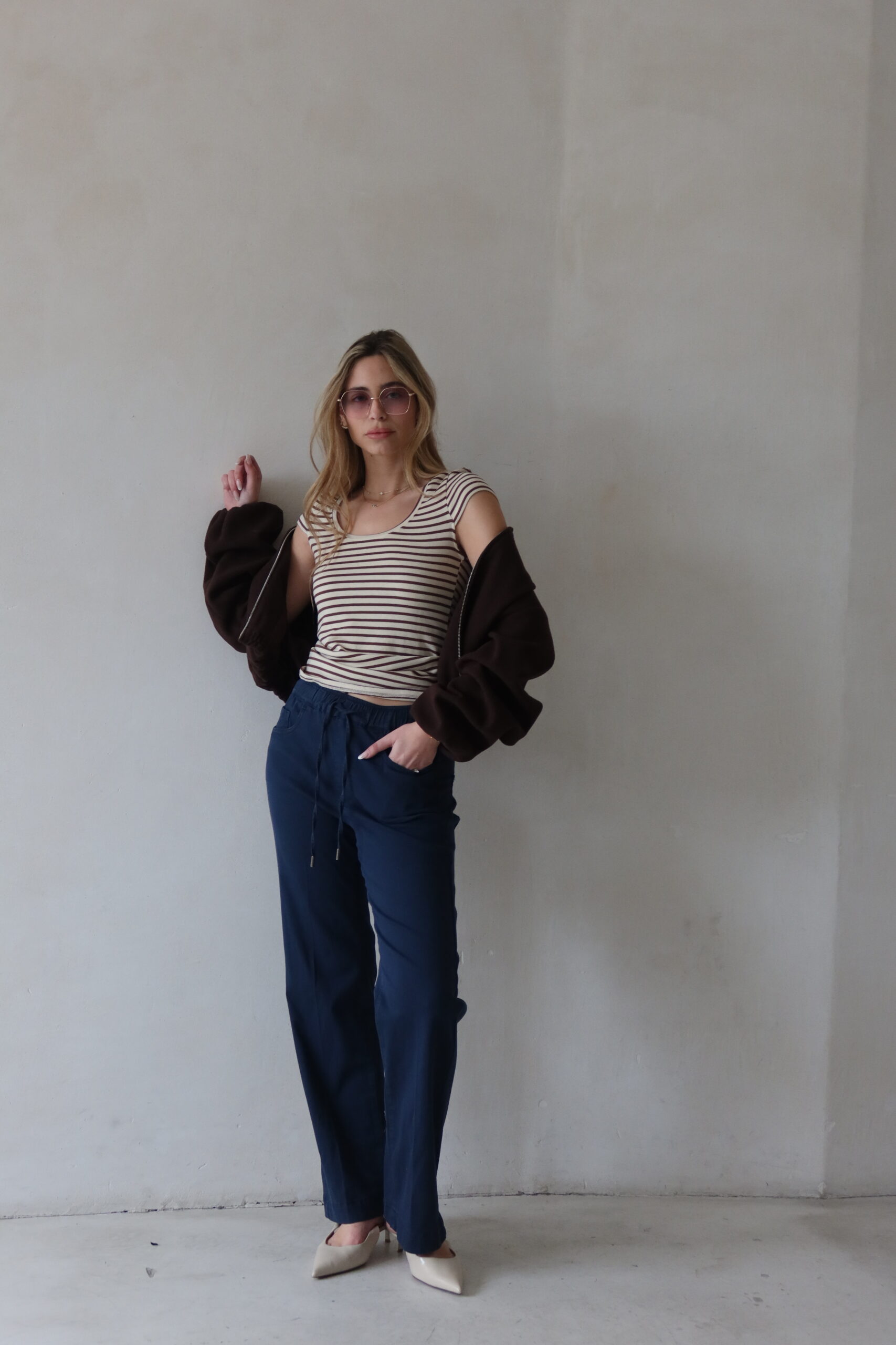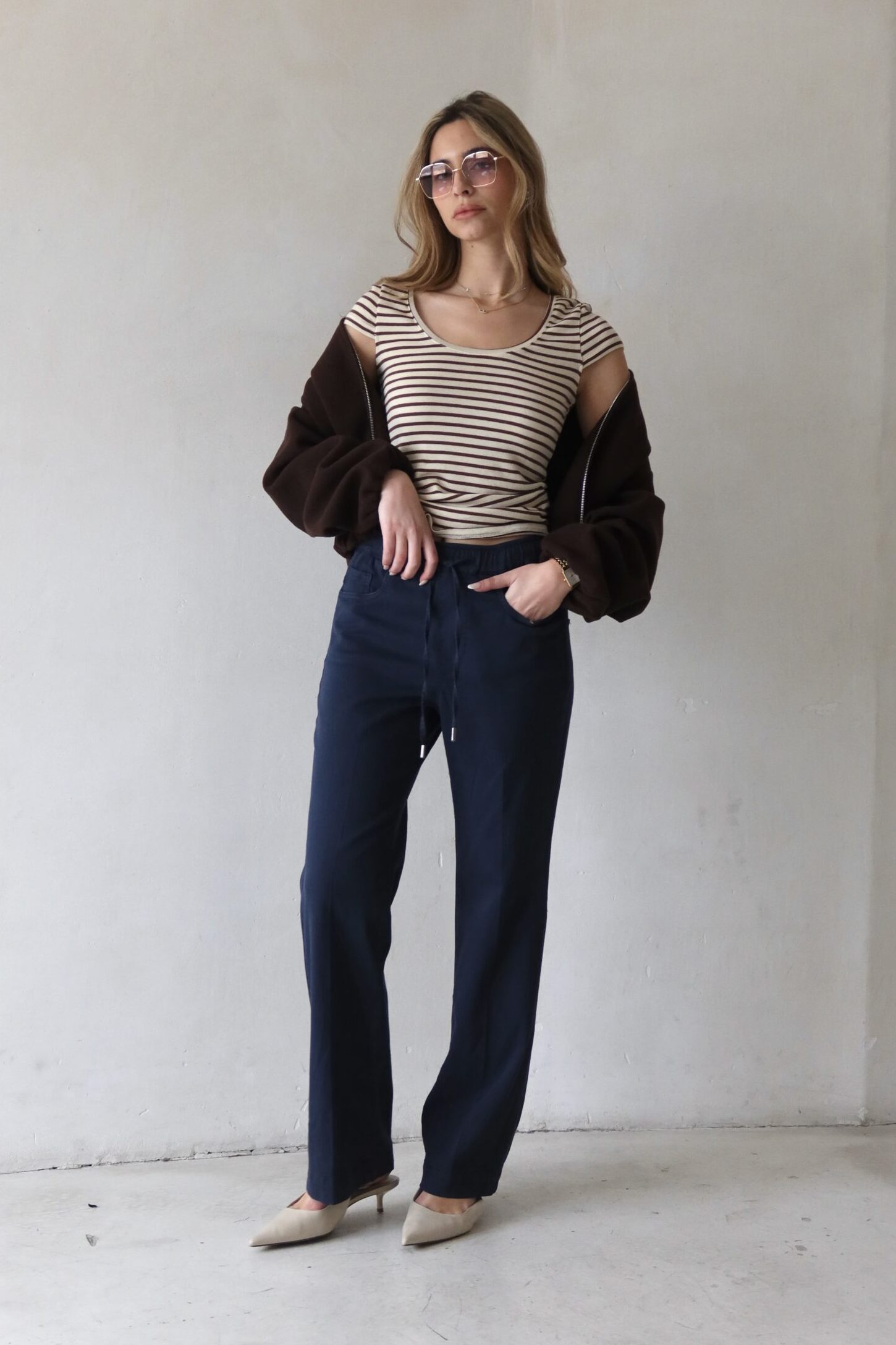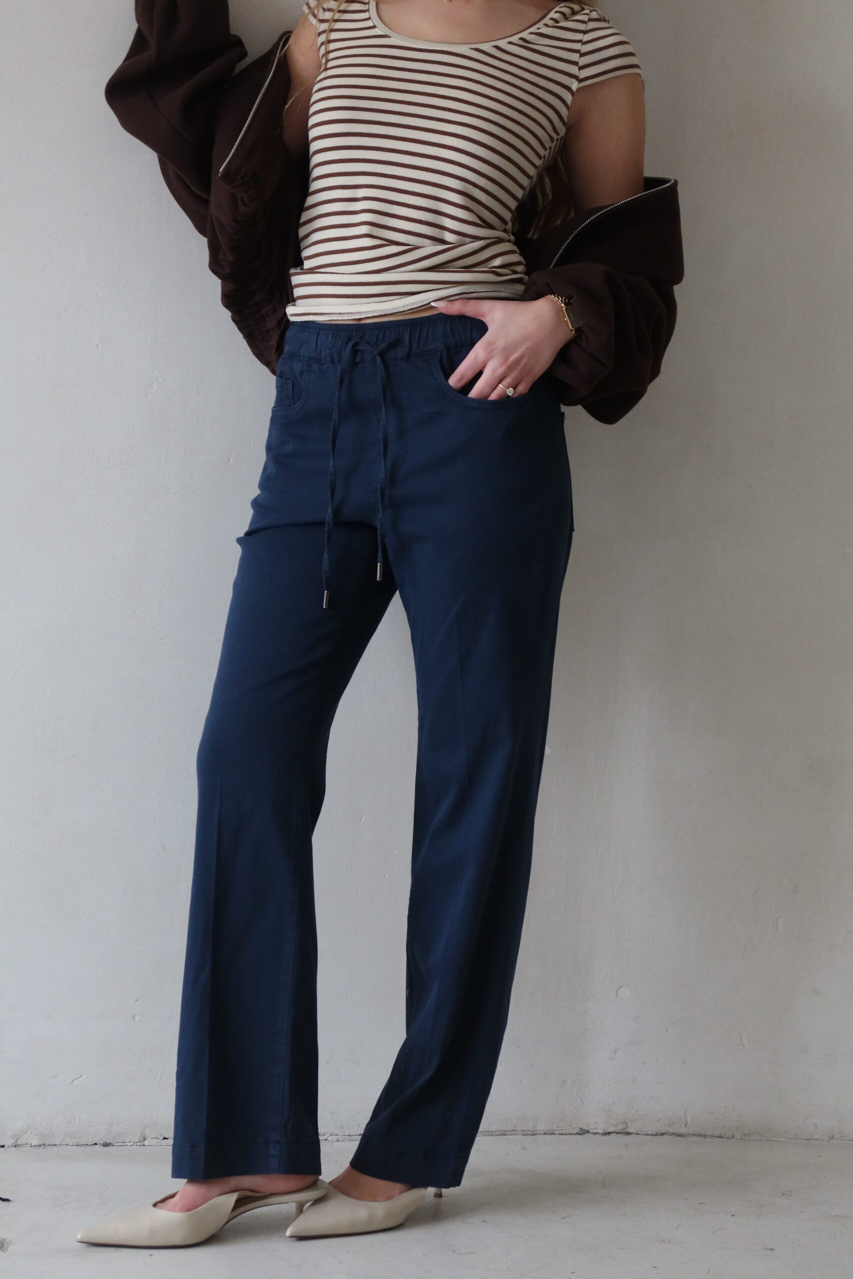מכנסי כותנה בגיזרה ישרה בסיומת עם גומי וקשירת שרוך עם לייקרה