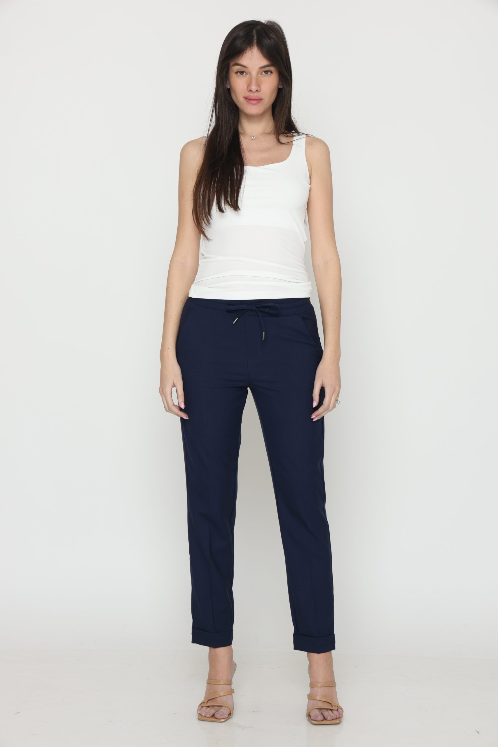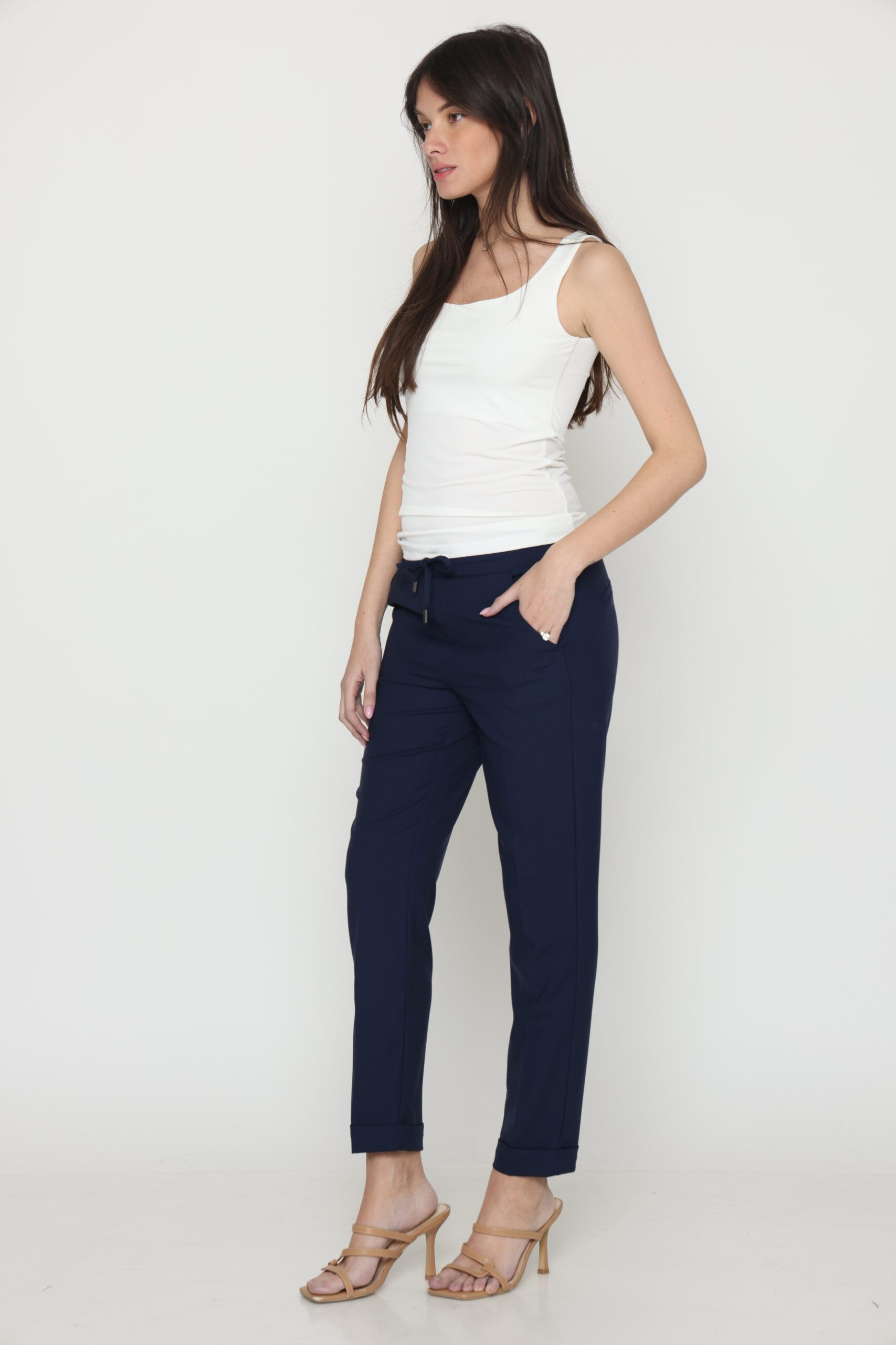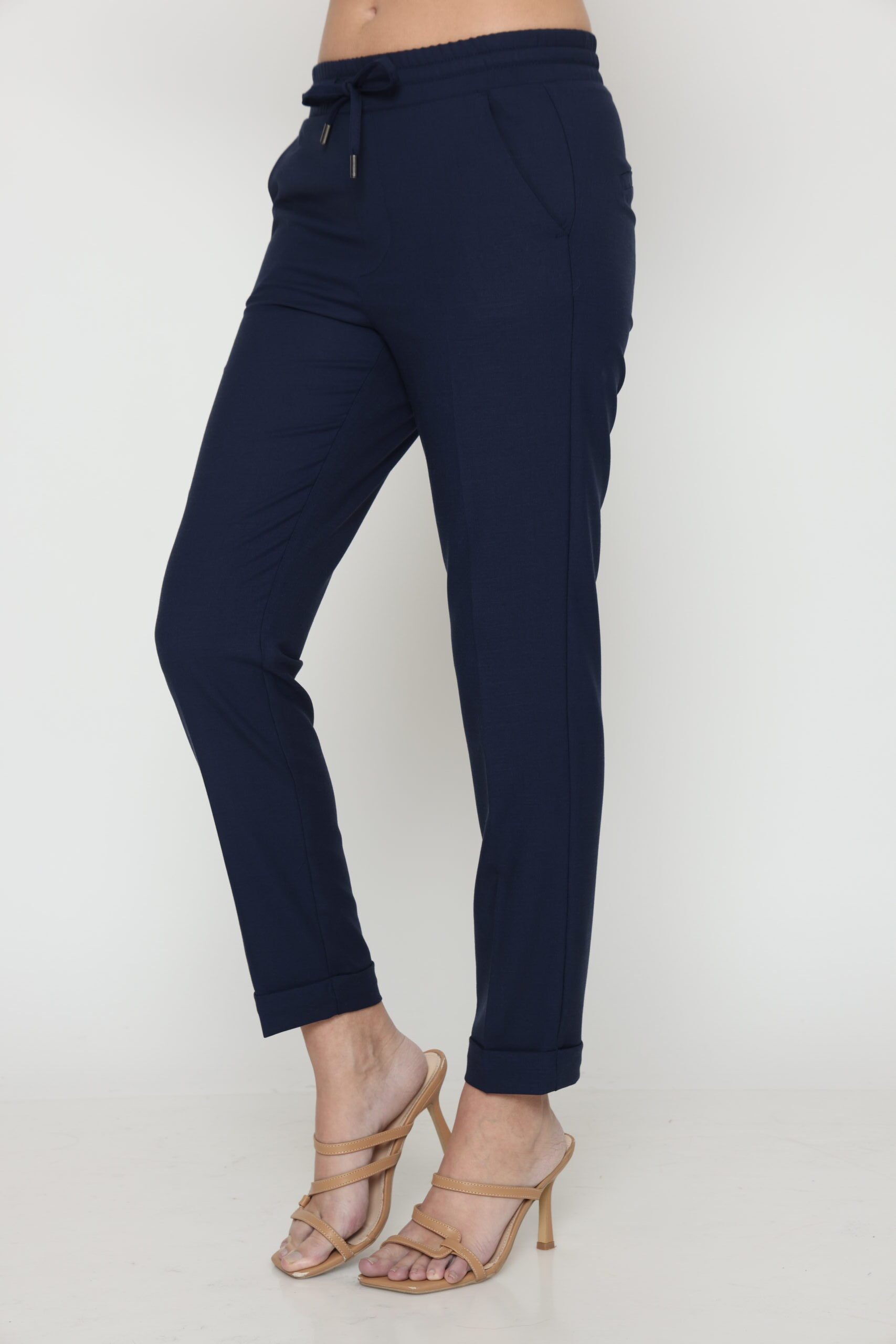 מכנסיים בגזרת לוס מבד במראה פשתן, אורך קרסול עם גומי במותן ושרוך קשירה. קיפול מובנה בסיומת.