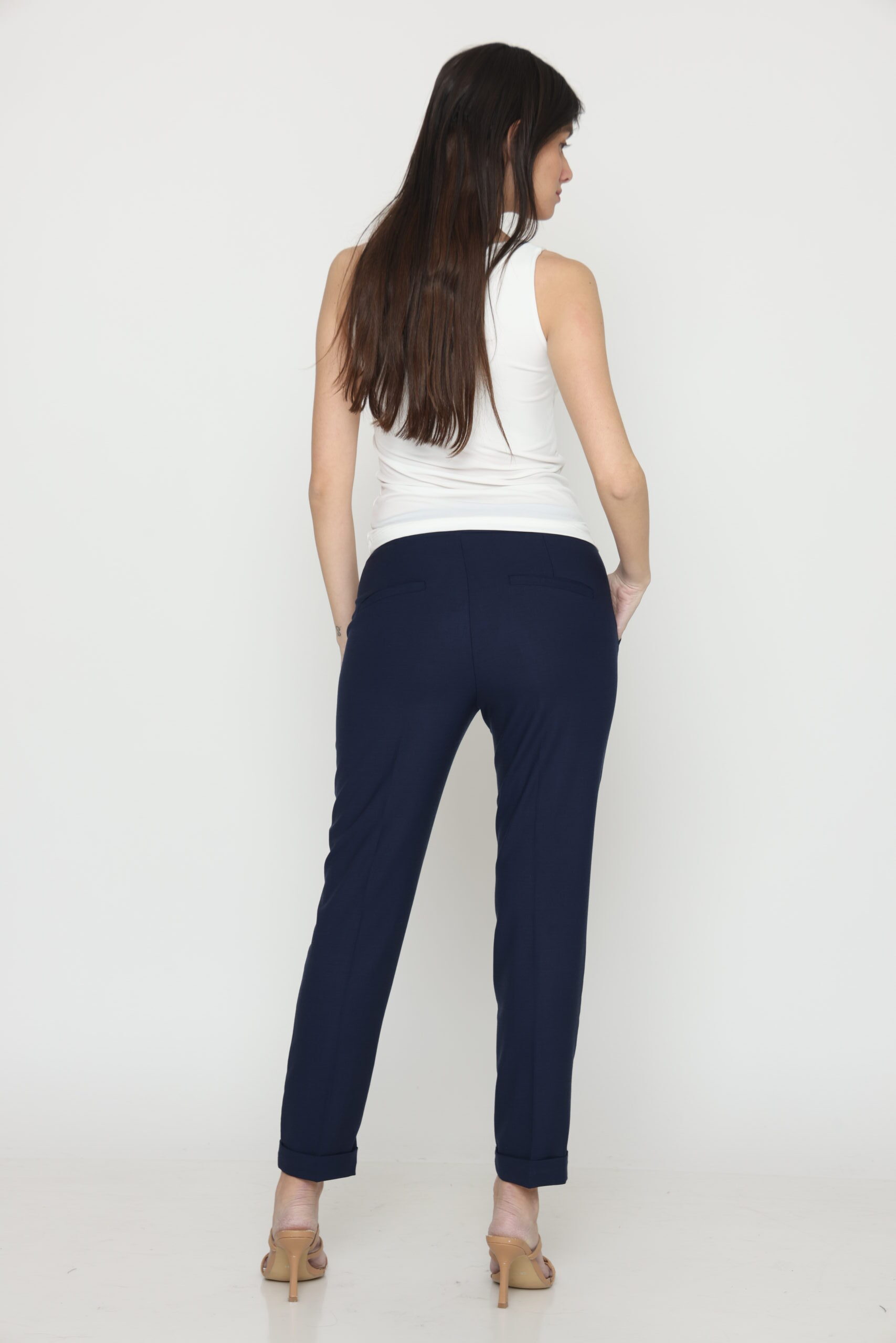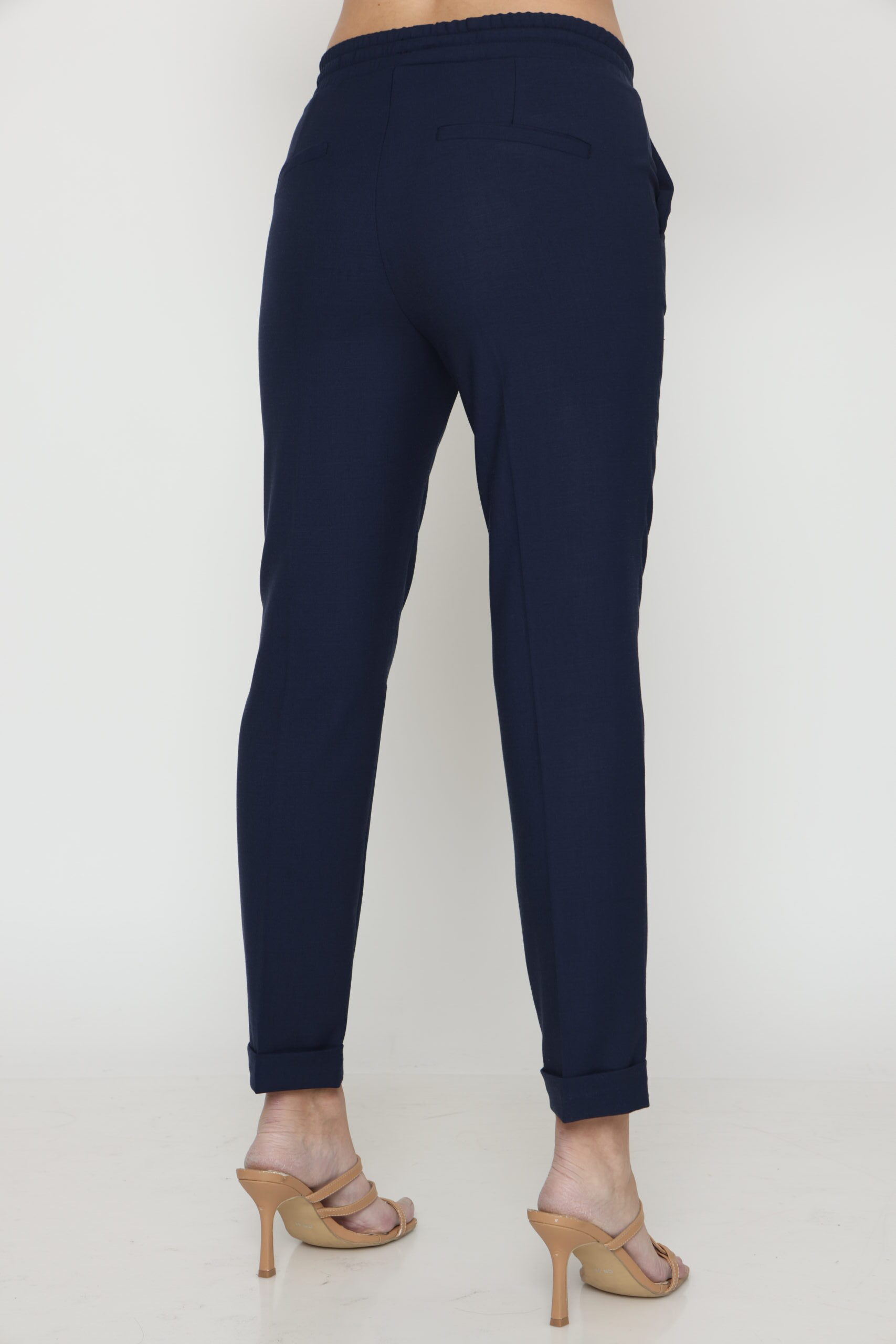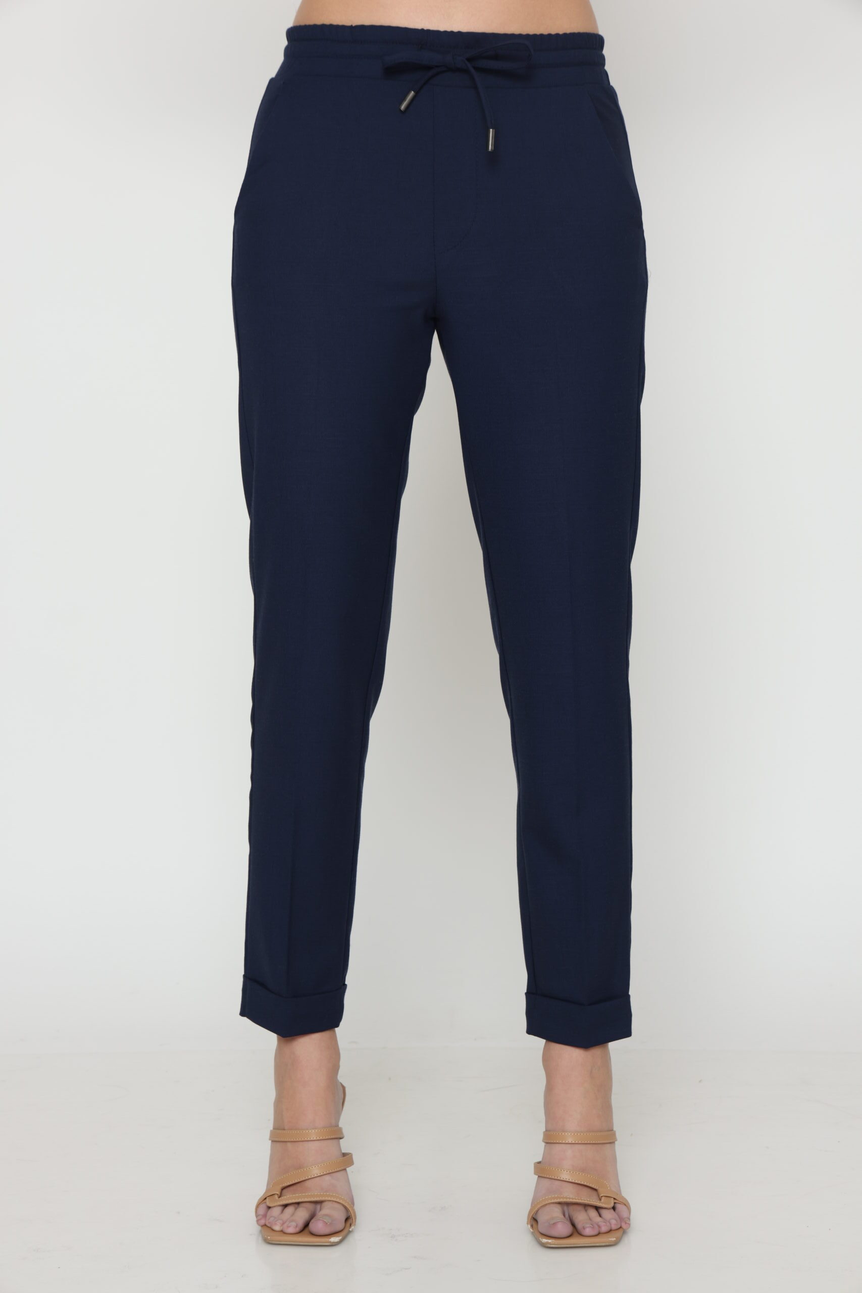 מכנסיים בגזרת לוס מבד במראה פשתן, אורך קרסול עם גומי במותן ושרוך קשירה. קיפול מובנה בסיומת.