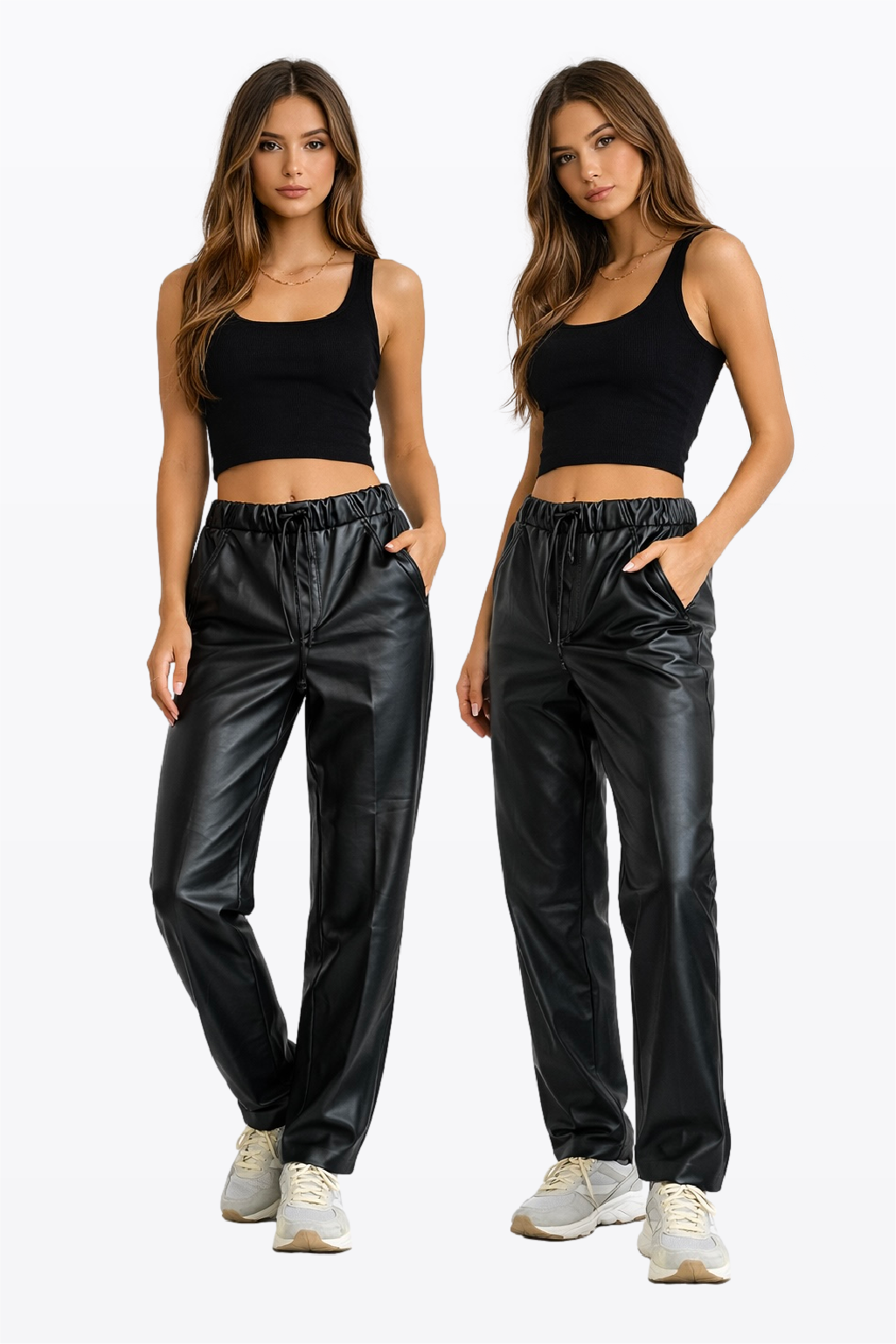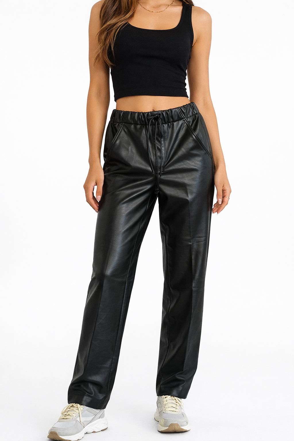 מכנסי עור בגיזרה ישרה עם גומי ושרוך עם לייקרה