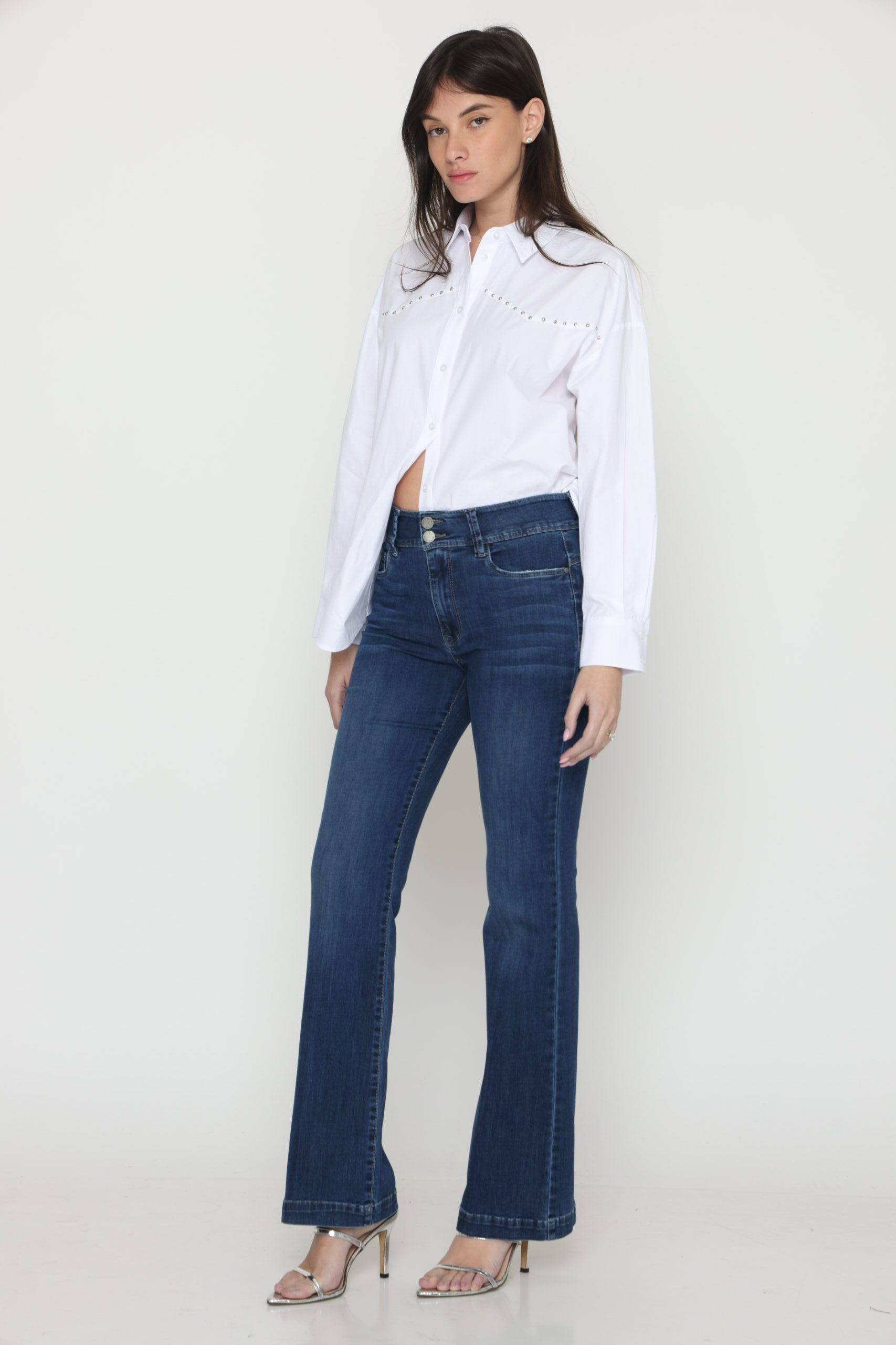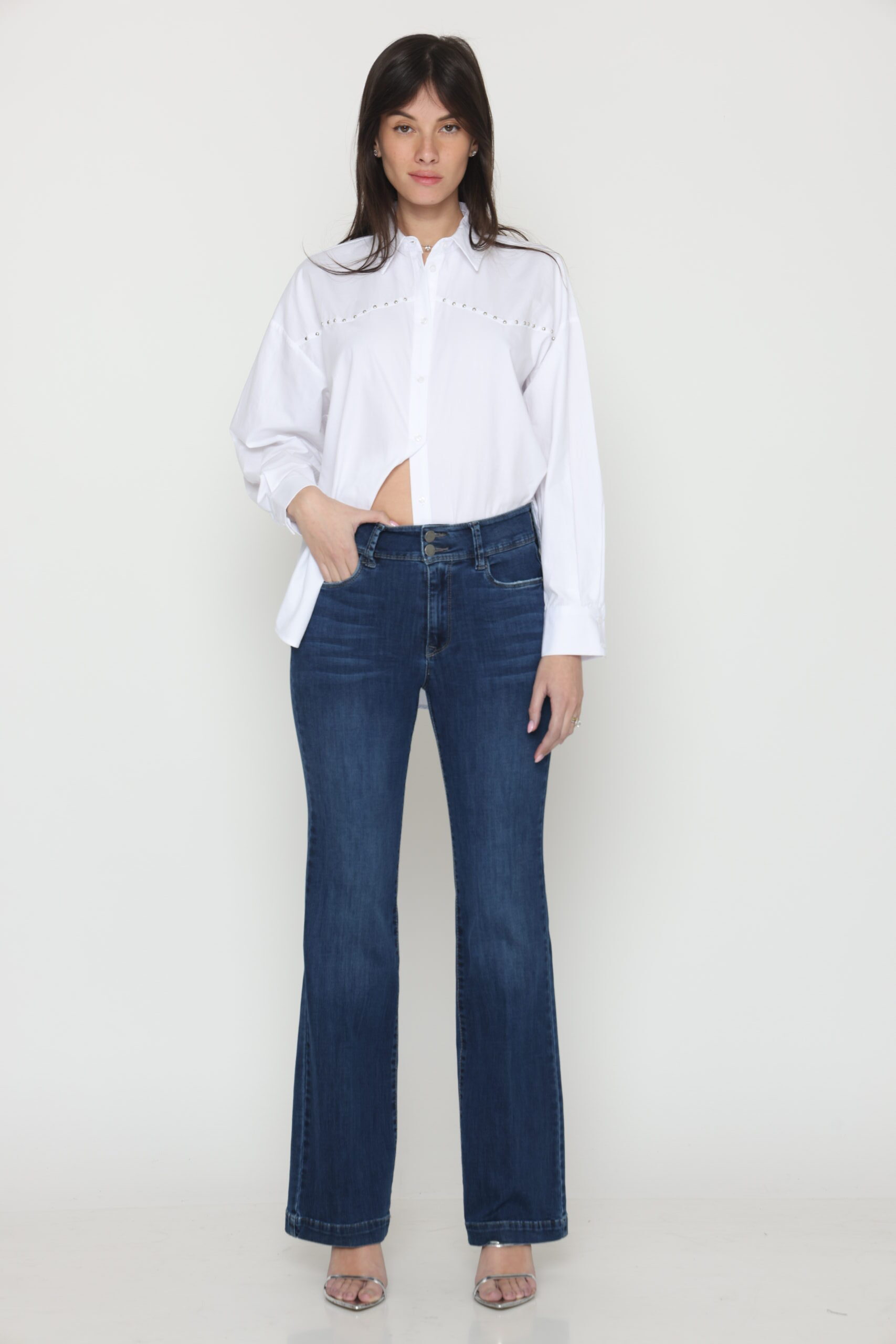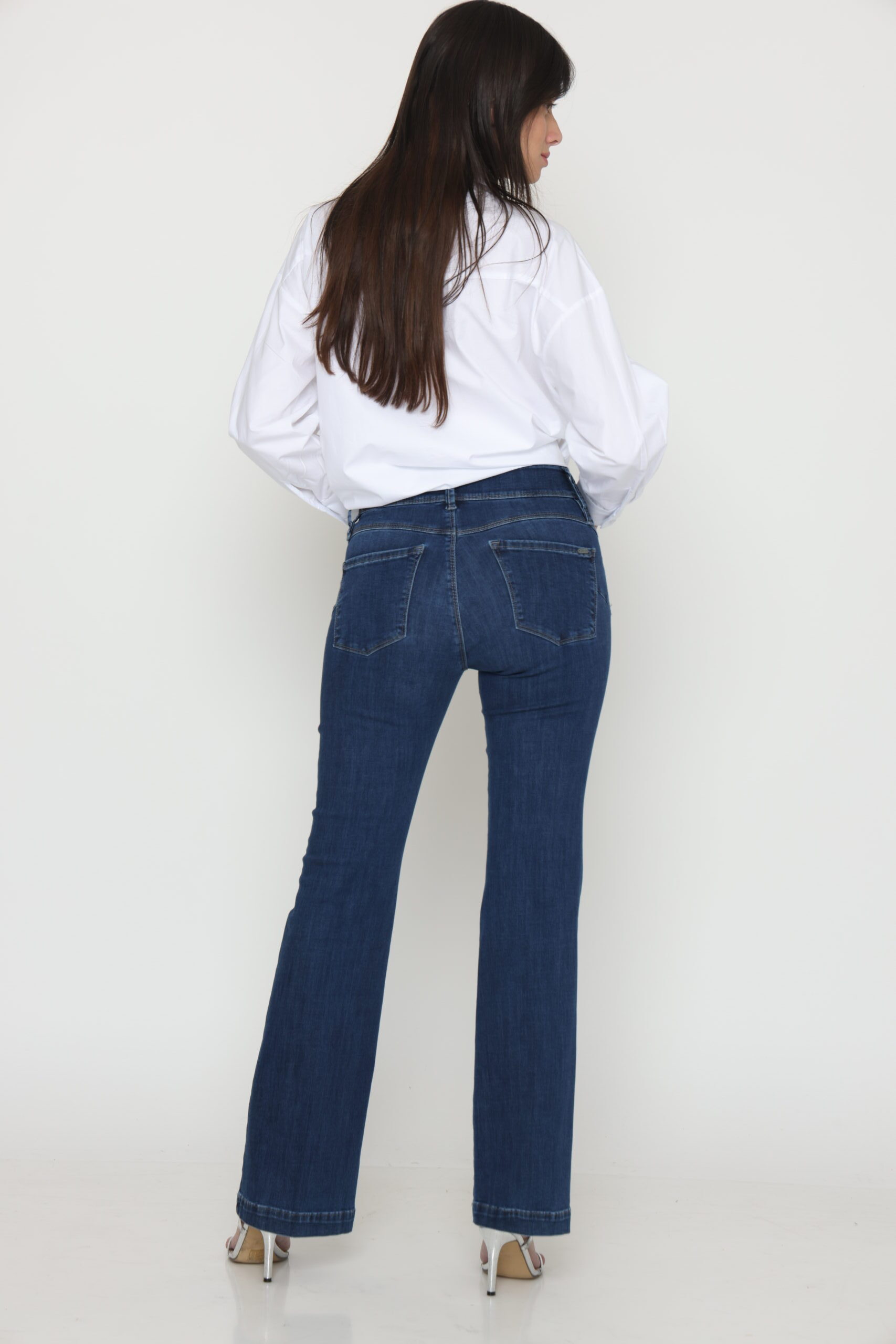 גינס בגיזרת פלייר ארוכה עם שני כפתורים בחגורה עם לייקרה