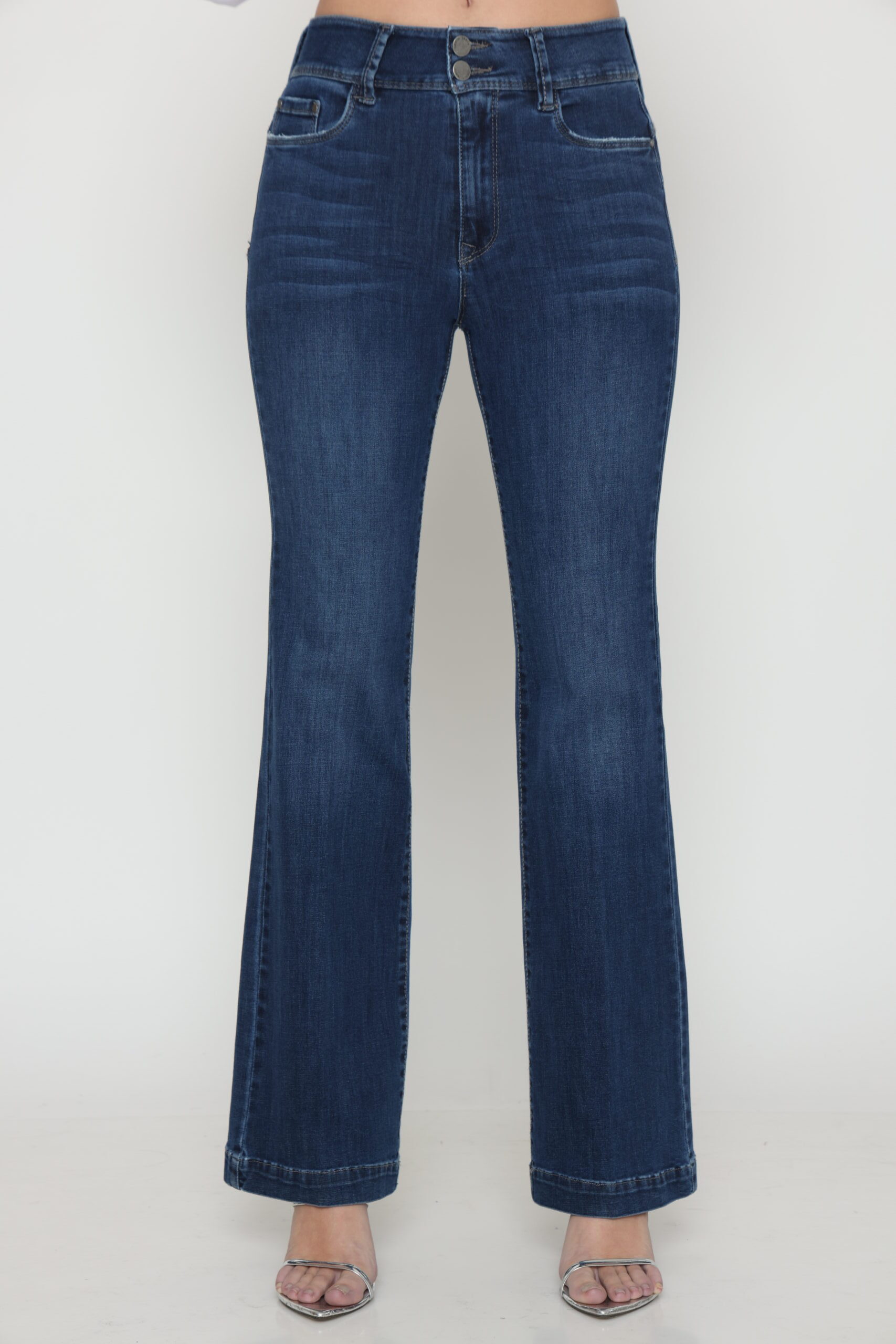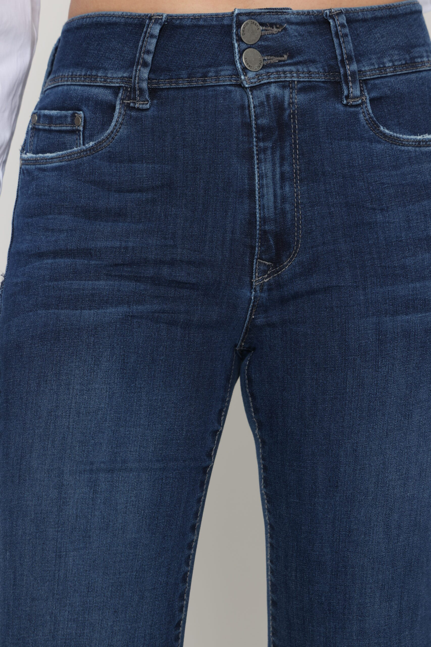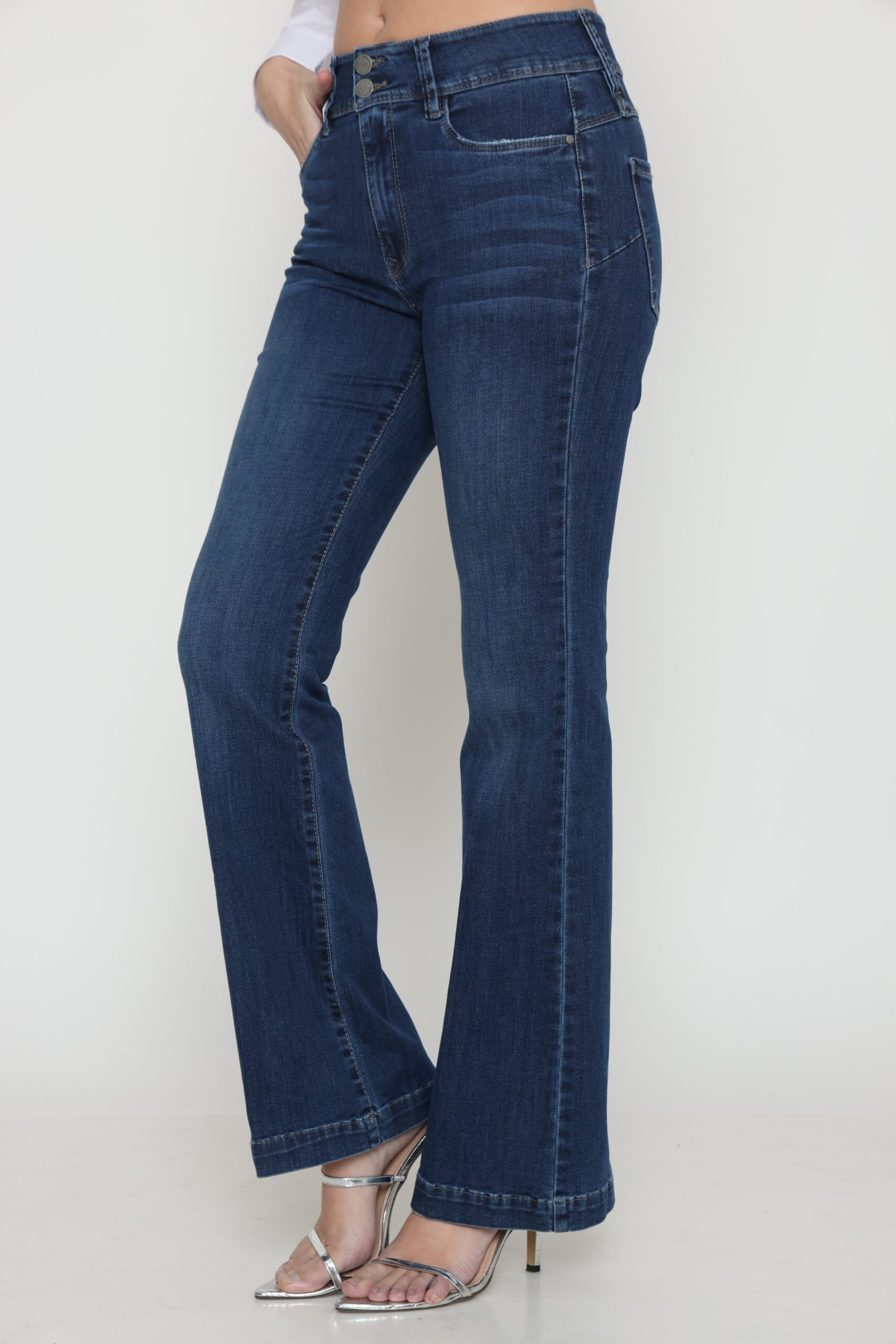 גינס בגיזרת פלייר ארוכה עם שני כפתורים בחגורה עם לייקרה