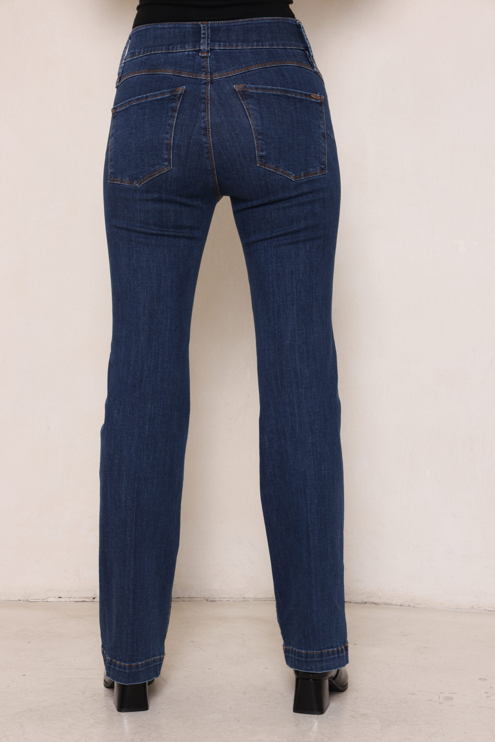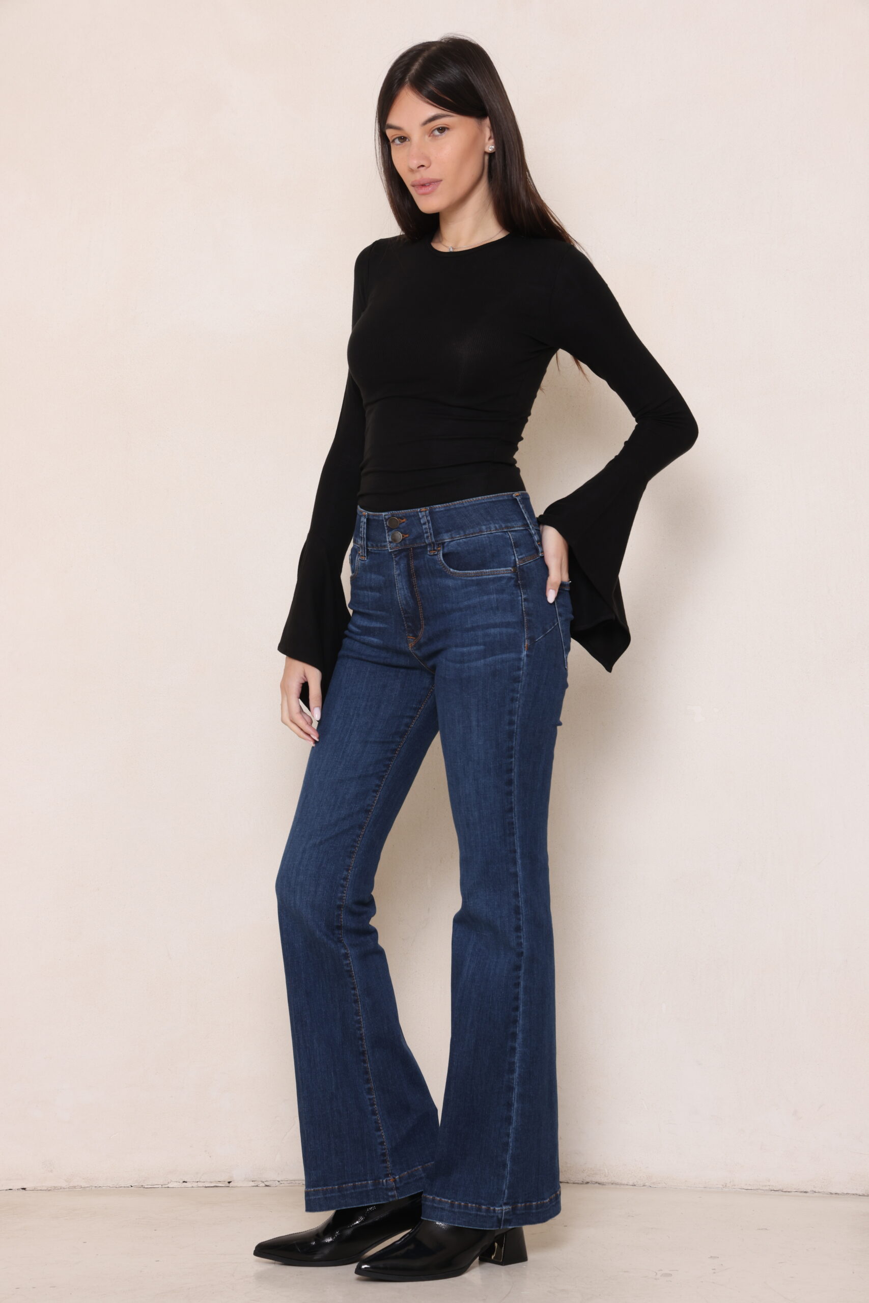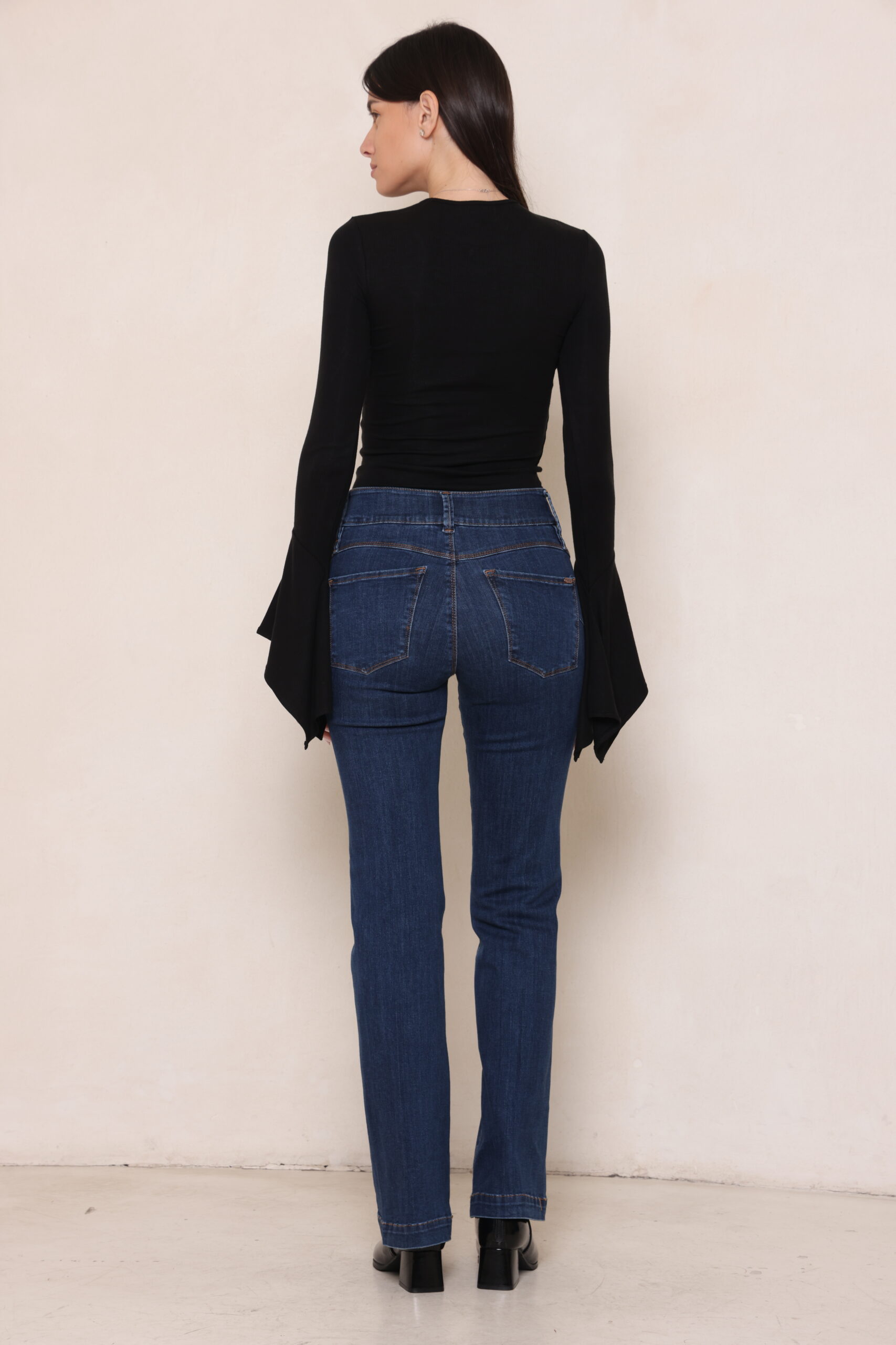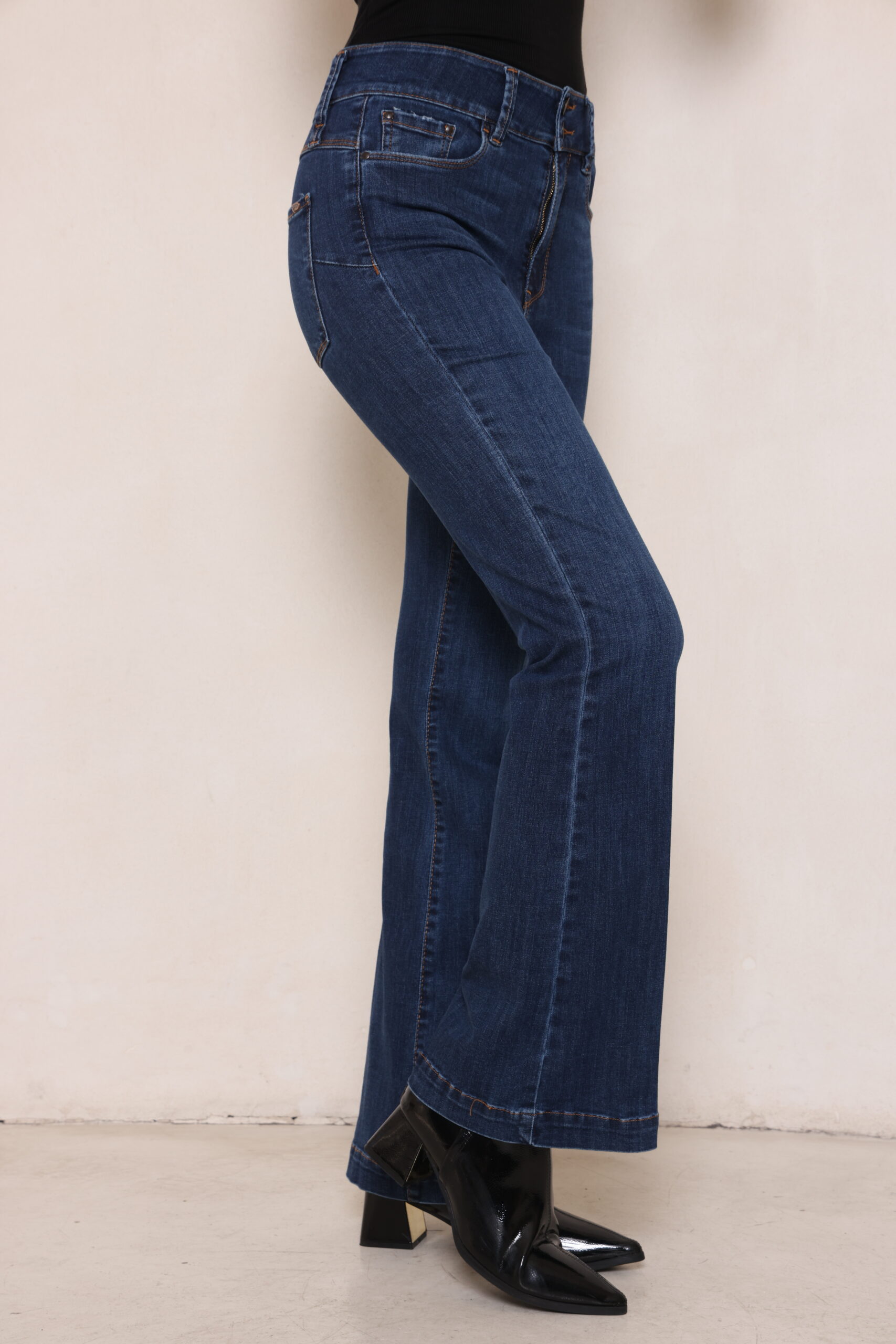 גינס בגזרה מתרחבת ארוכה עם לייקרה ושני כפתורים בחגורה