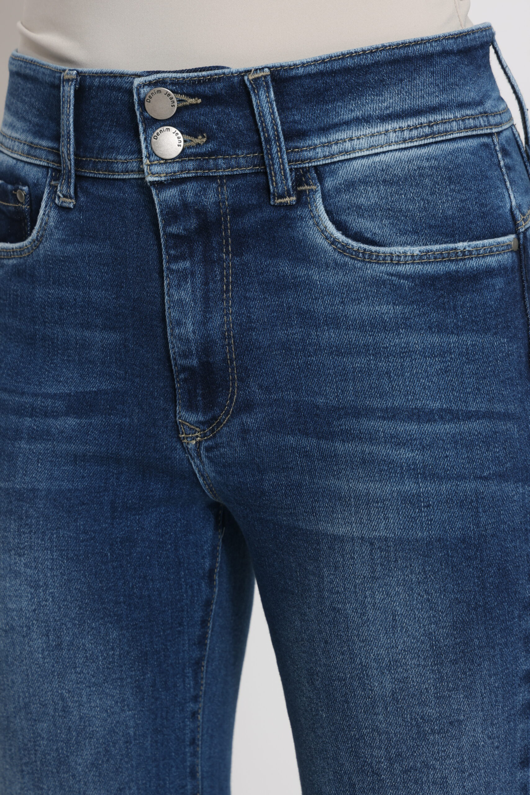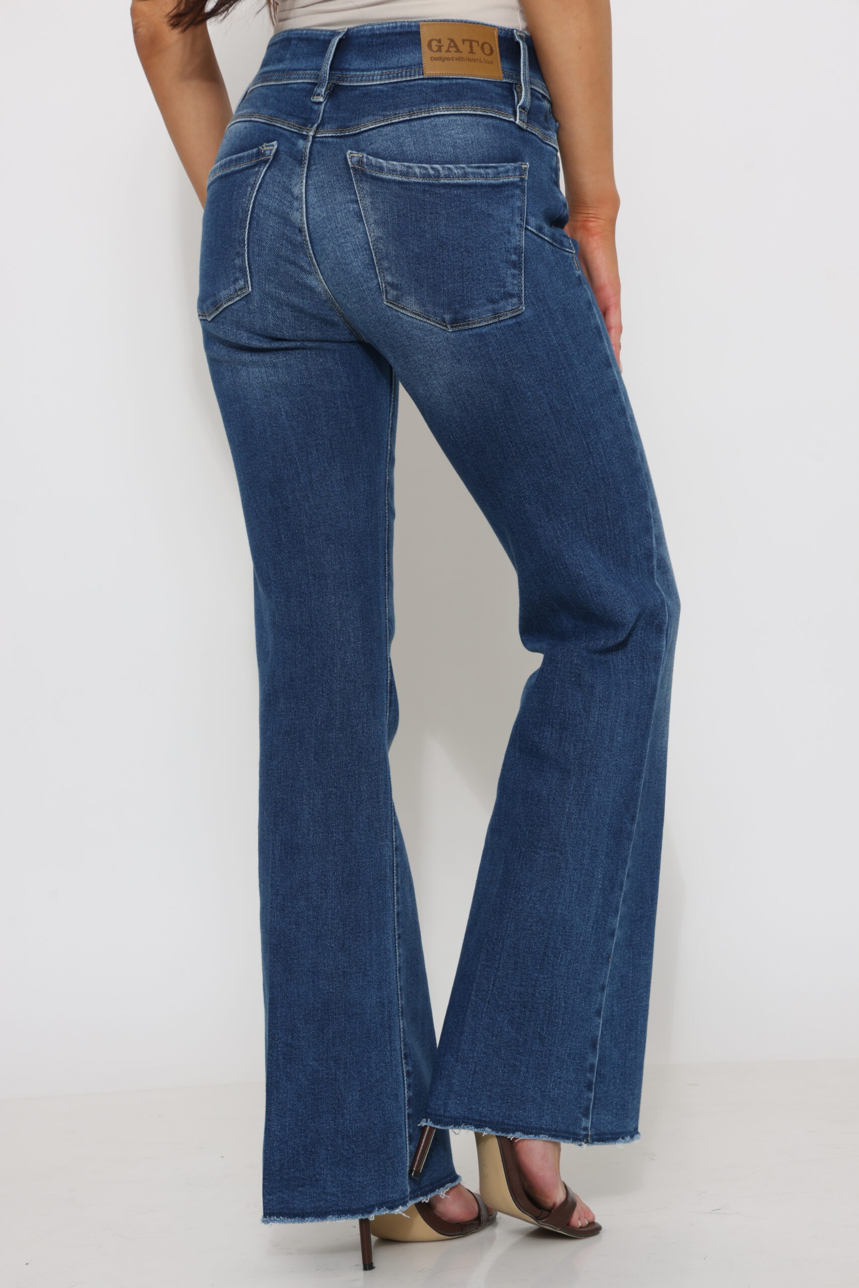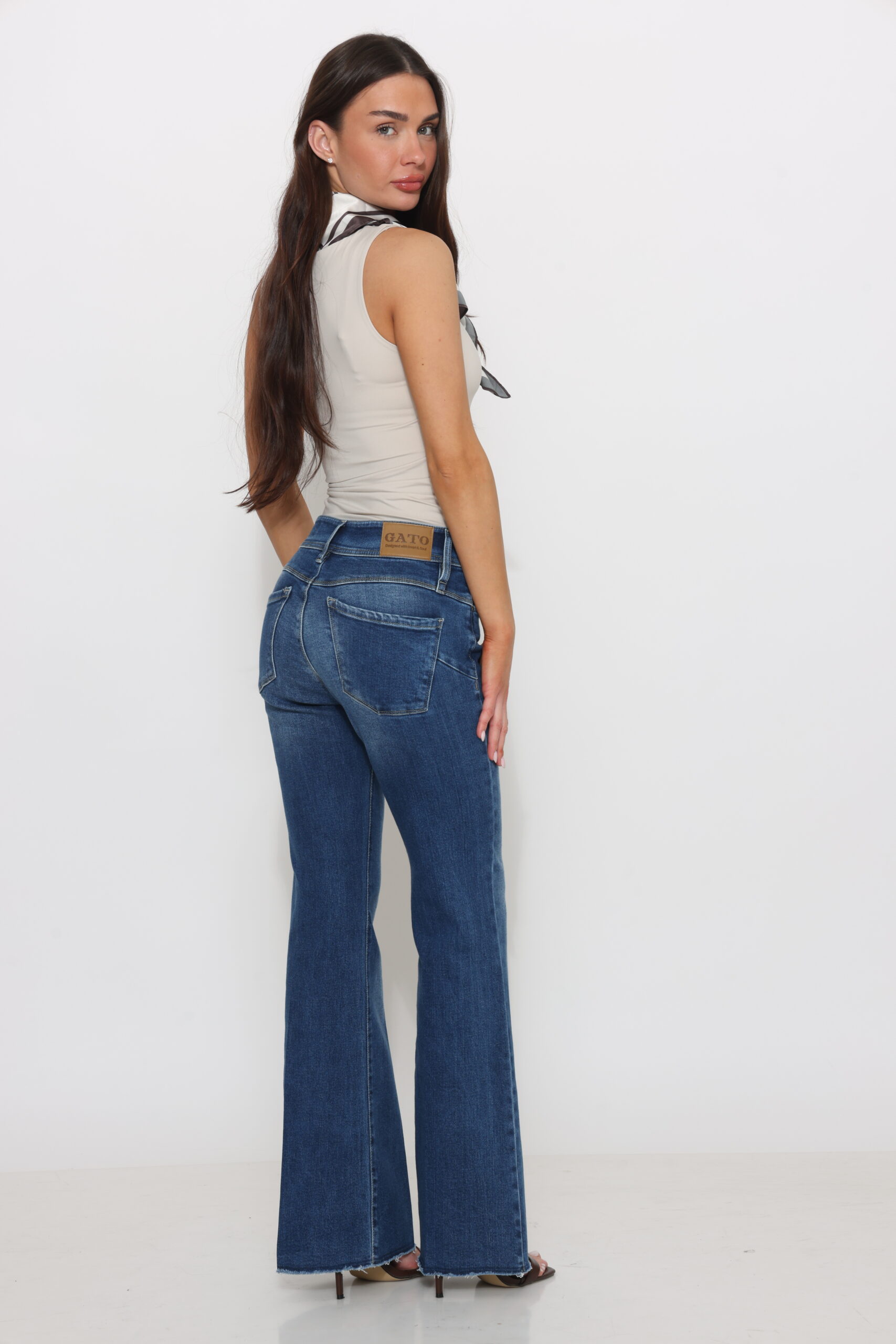 גינס בגזרת פלייר בגוון כהה עם שני כפתורים בחגורה עם לייקרה מחטבת