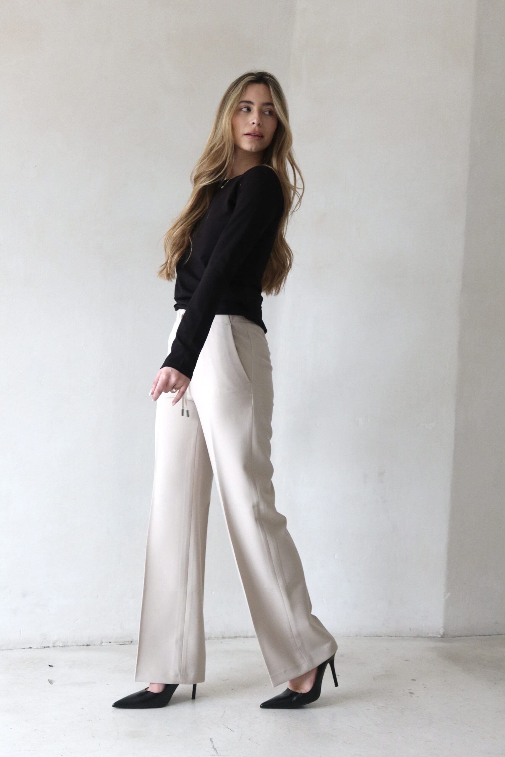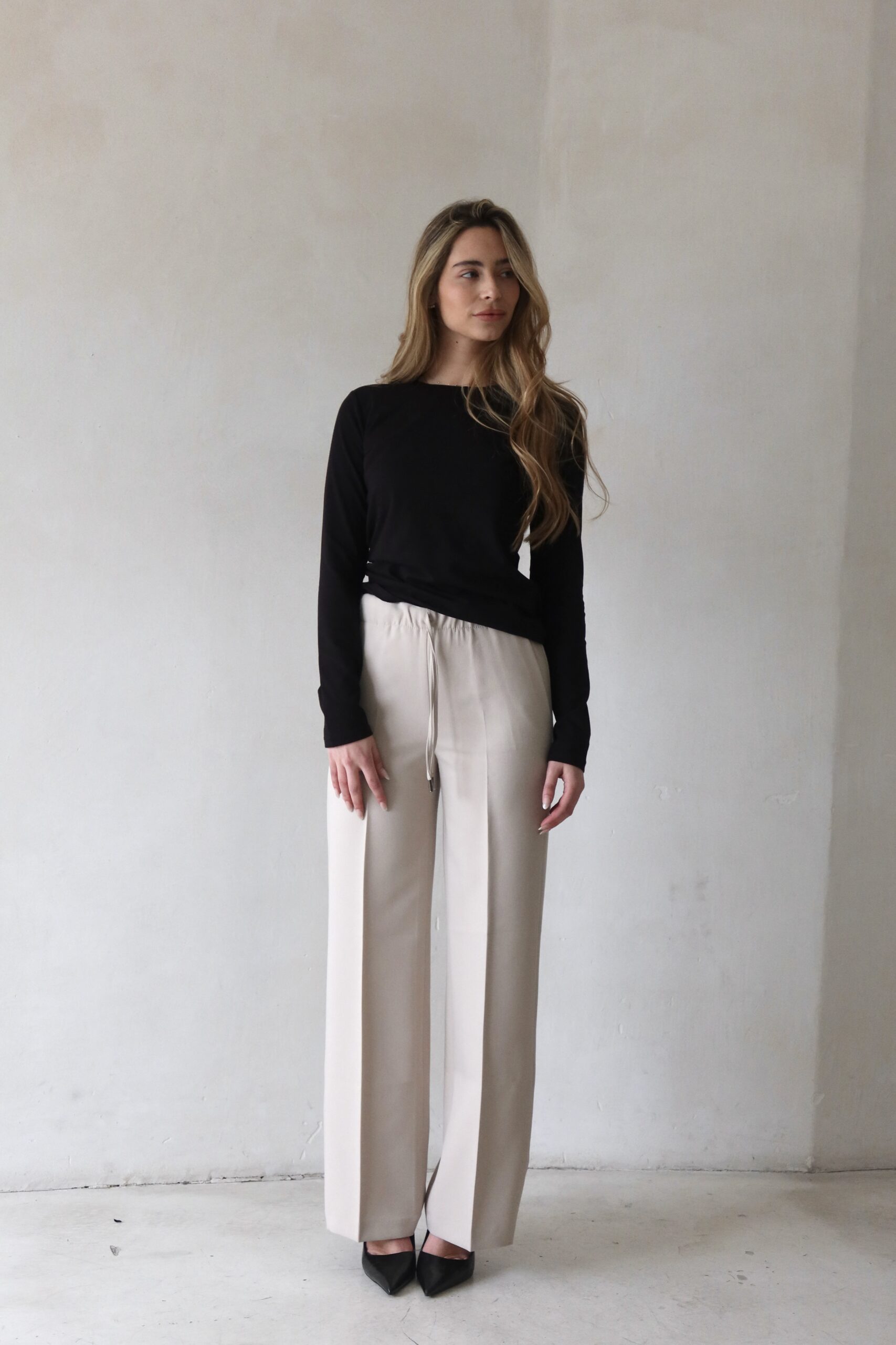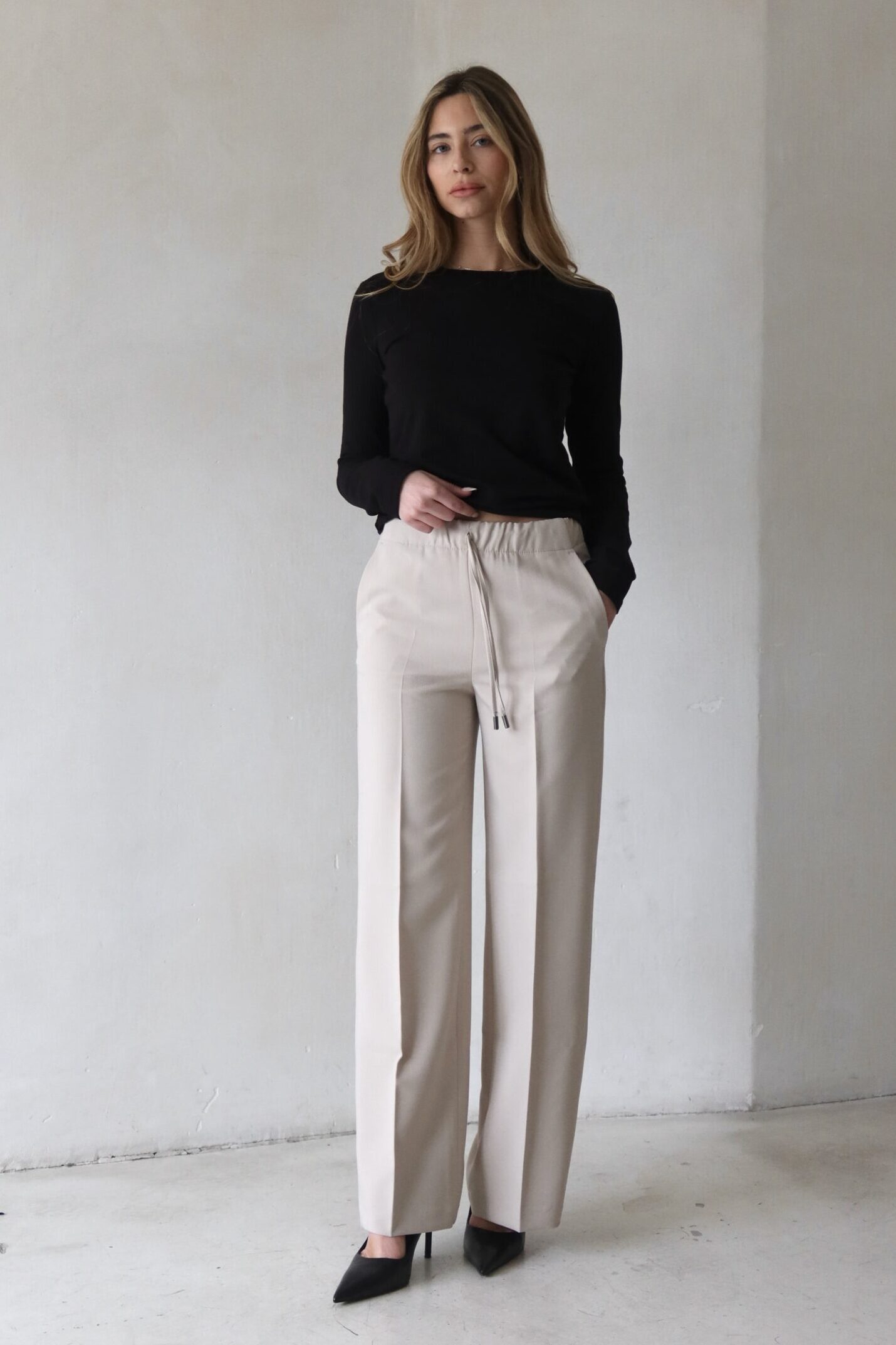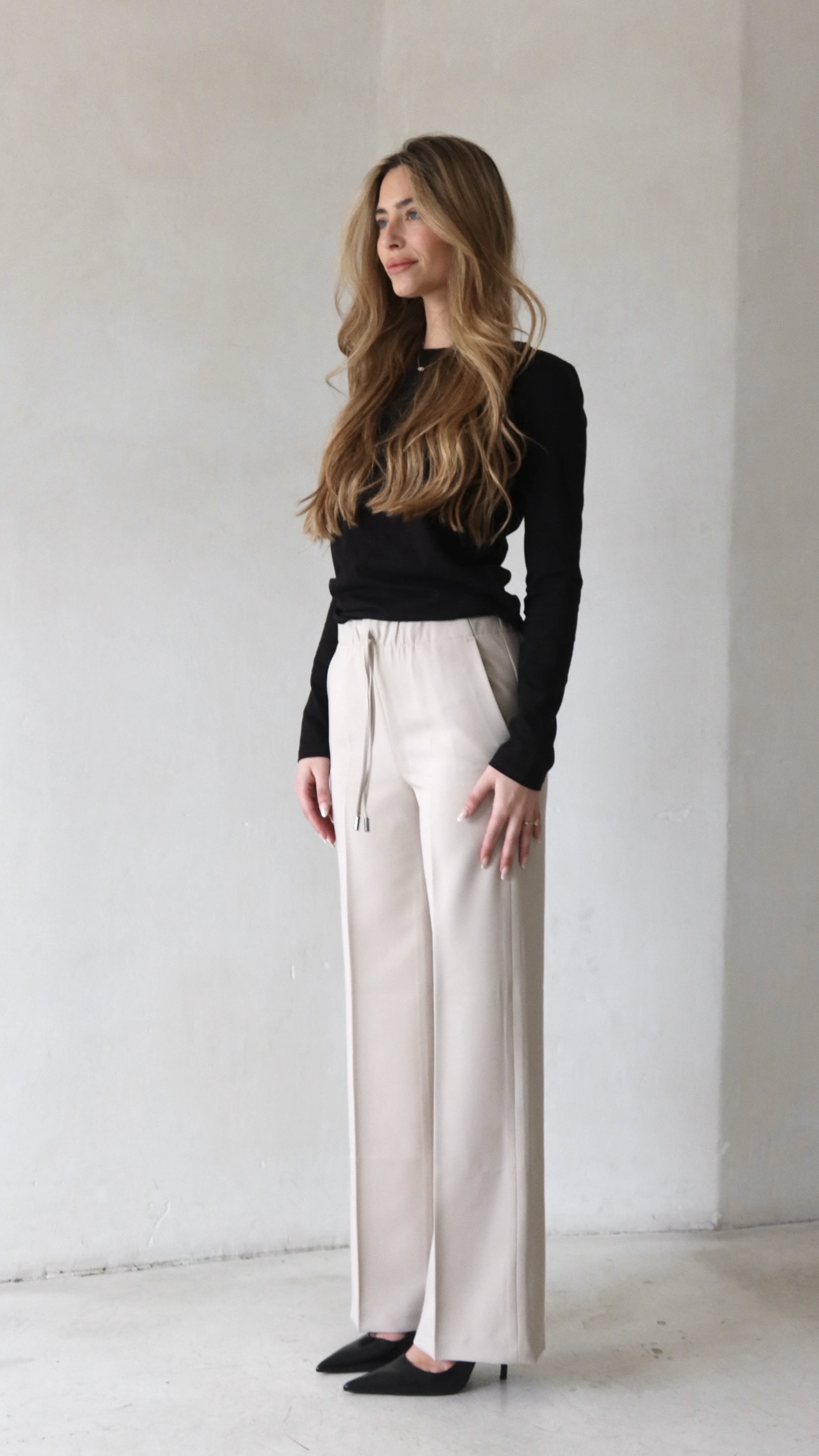 מכנס מבד נשפך עם לייקרה וטקסטורת פס עדינה טון על טון, גומי במותן ושרוך בגיזרה ישרה מהמותן