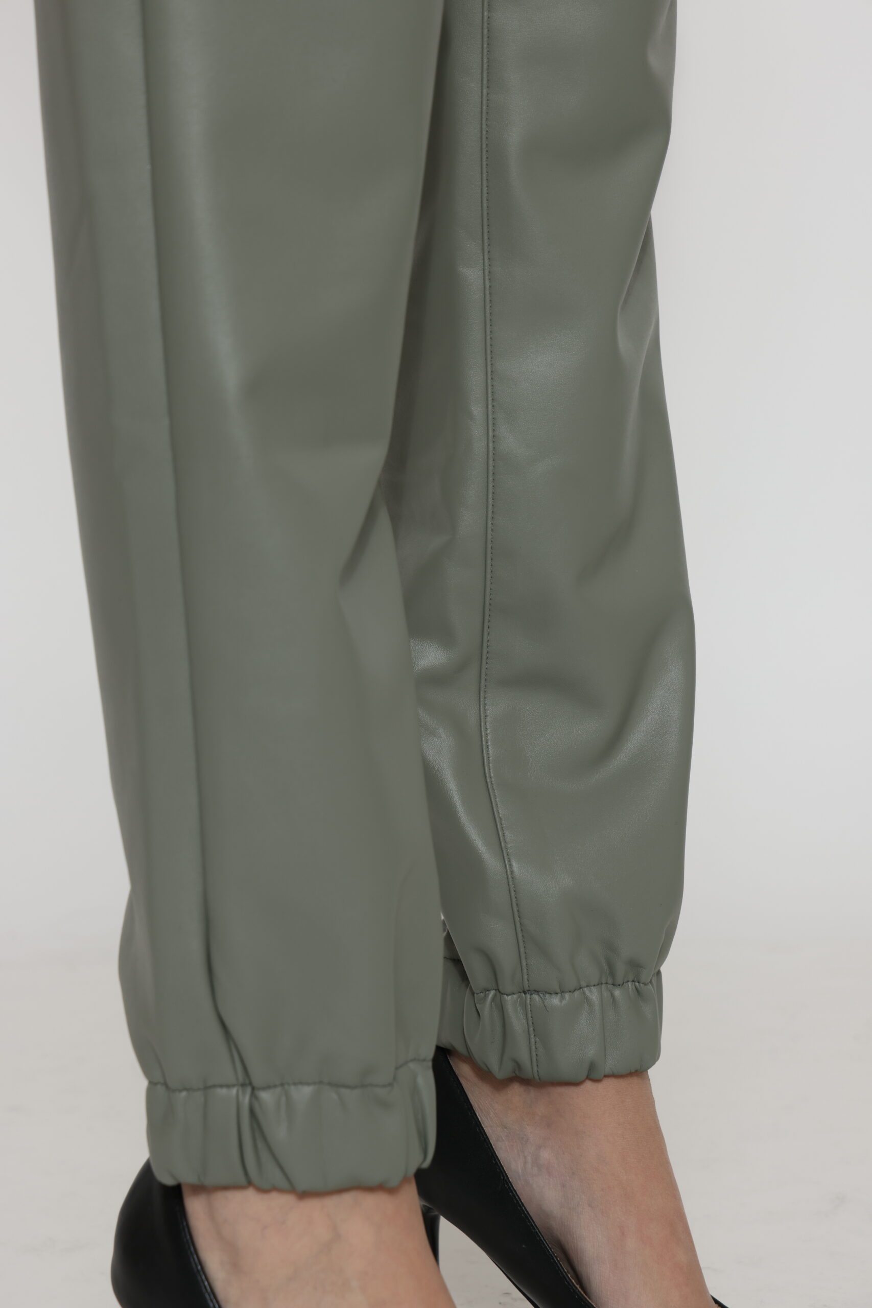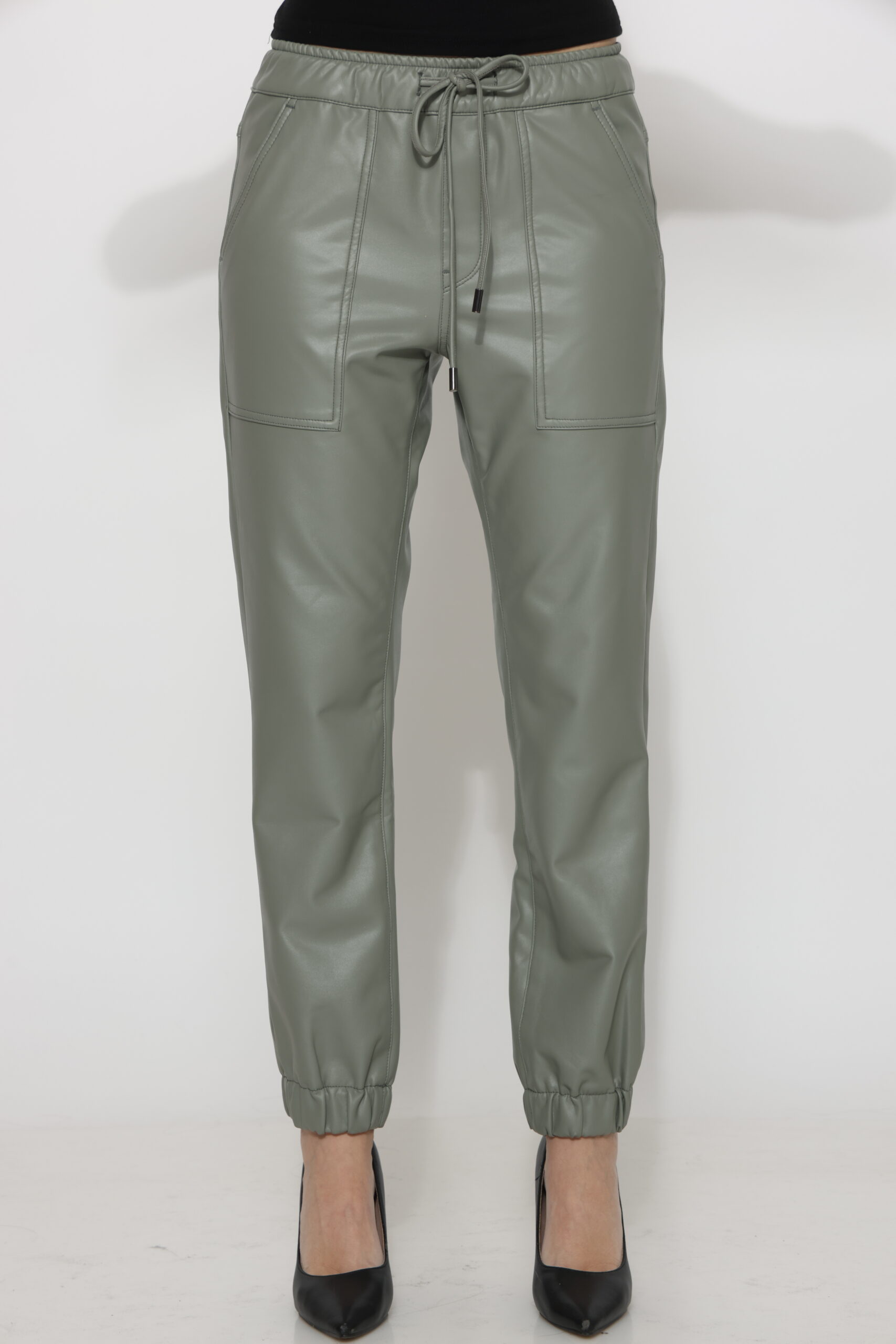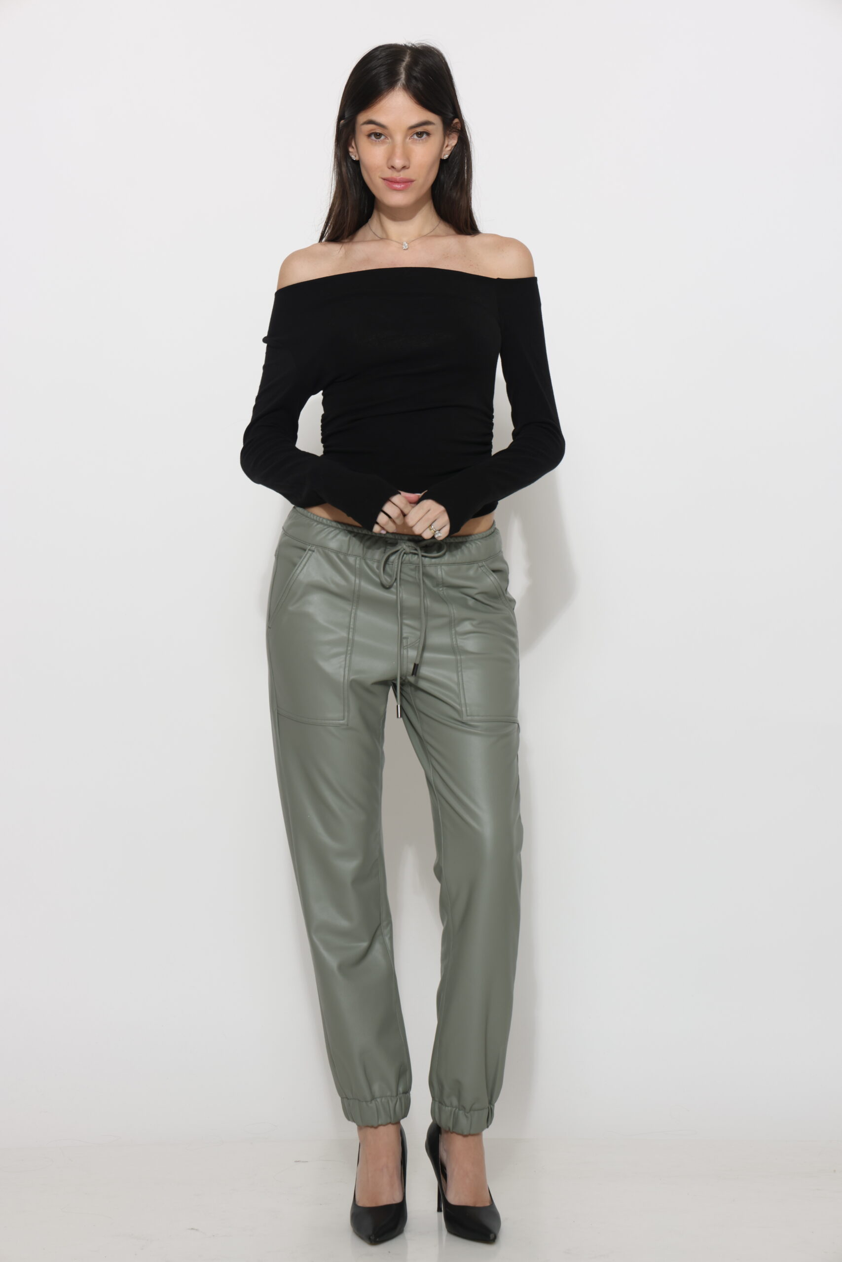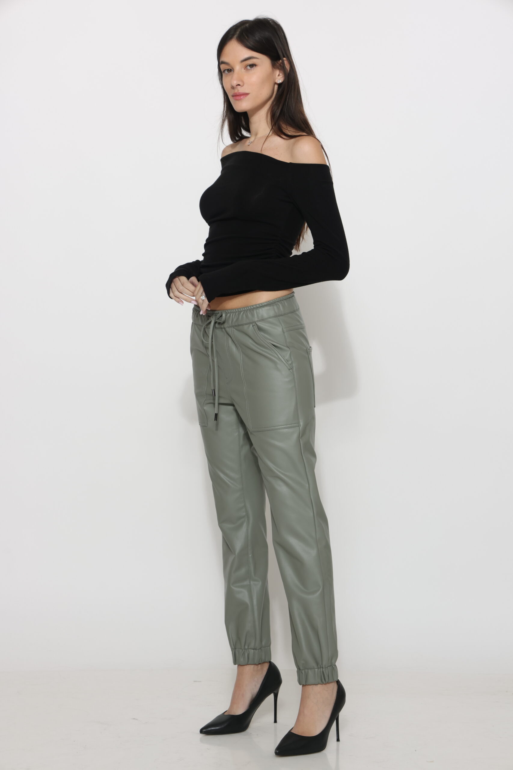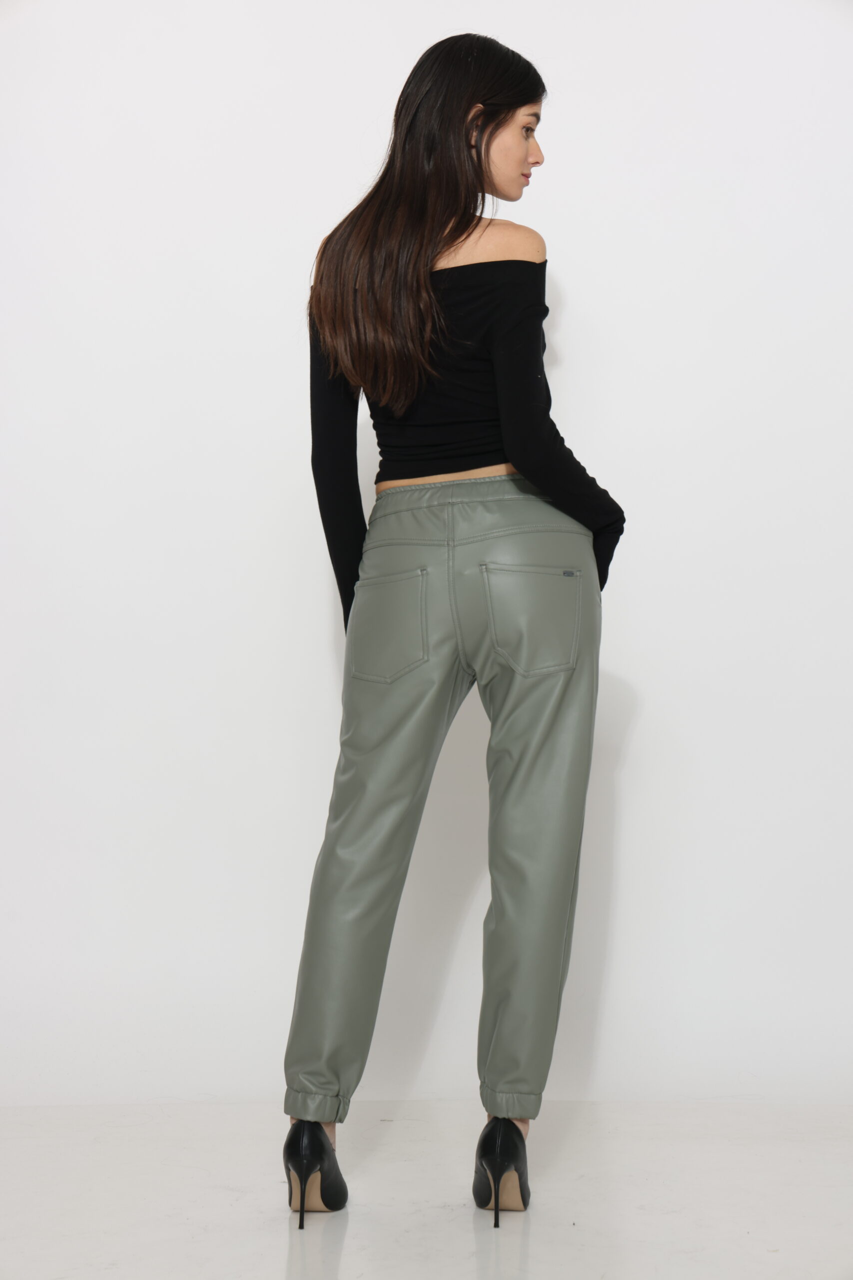 מכנסי עור מבד איכותי עם לייקרה, בגזרת גומי במותן ושרוך עם גומי בסיומת הרגל