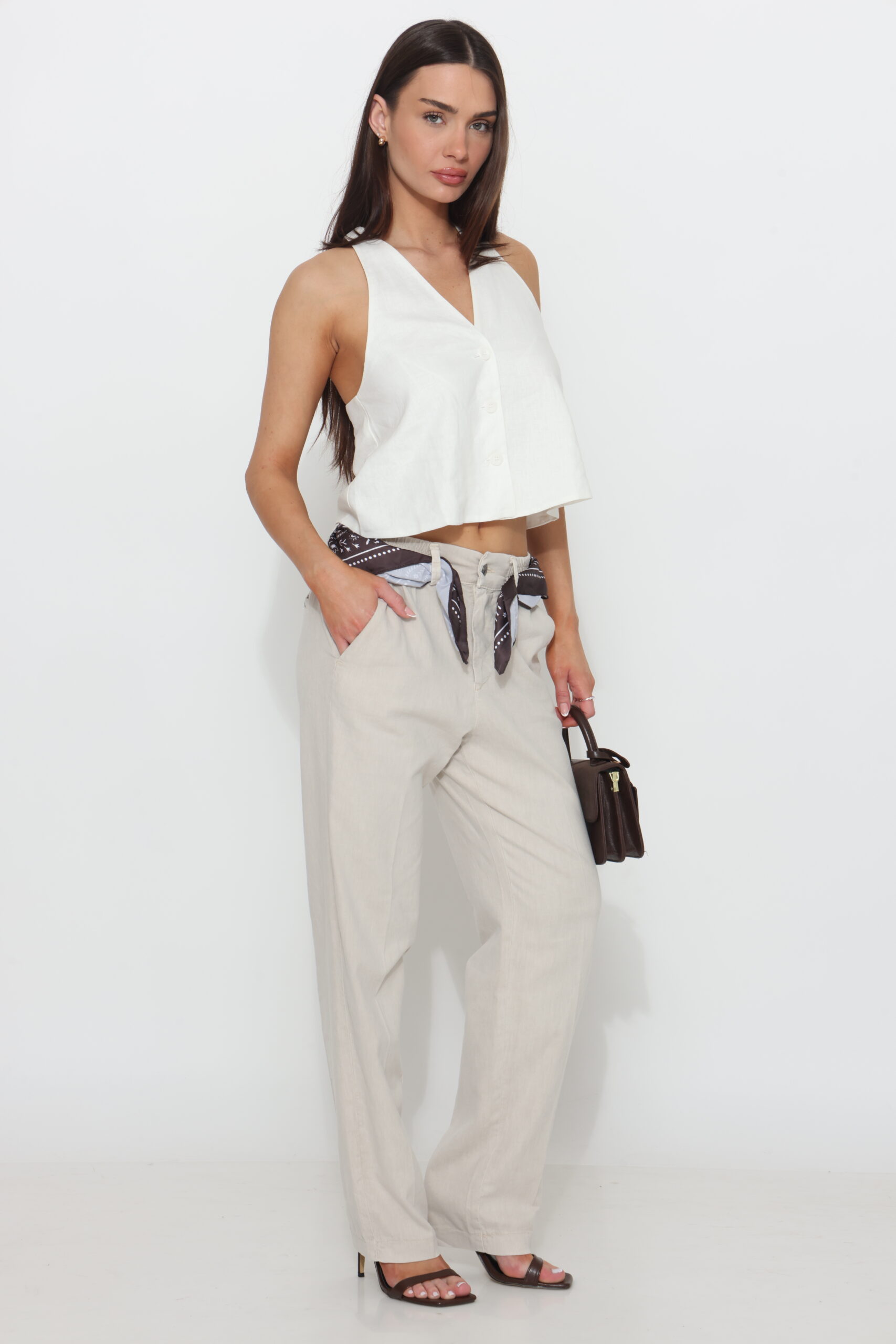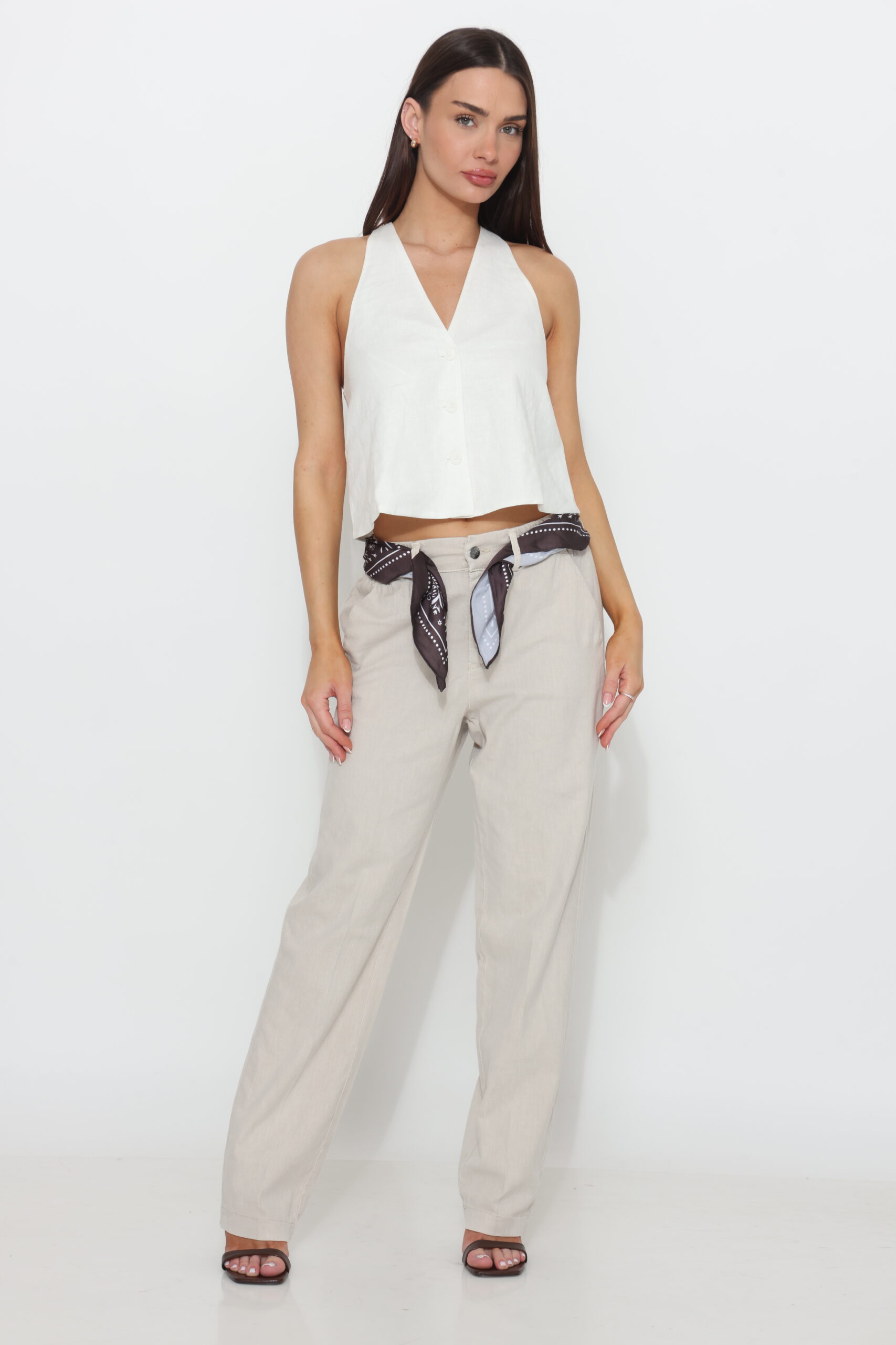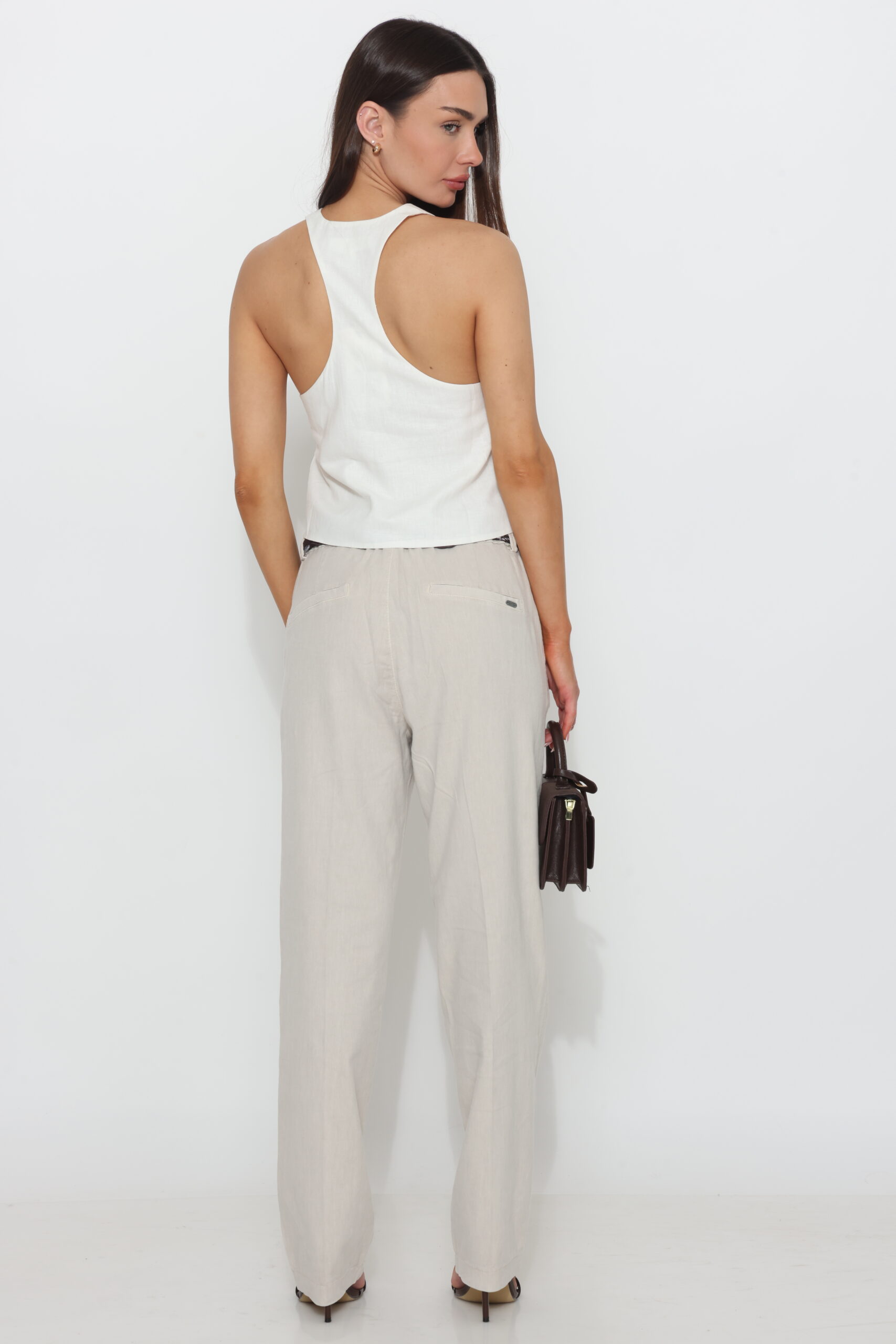 מכנס כותנה בגיזרה ישרה משוחררת עם שני כפתורים וגומי נסתר