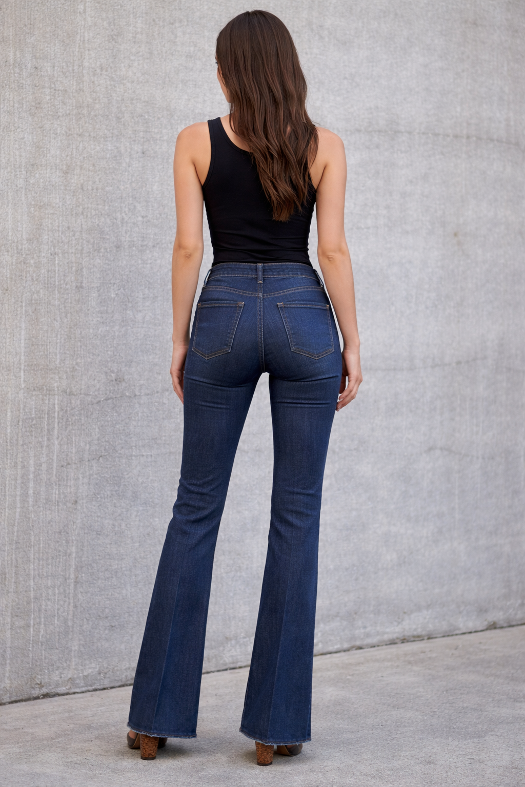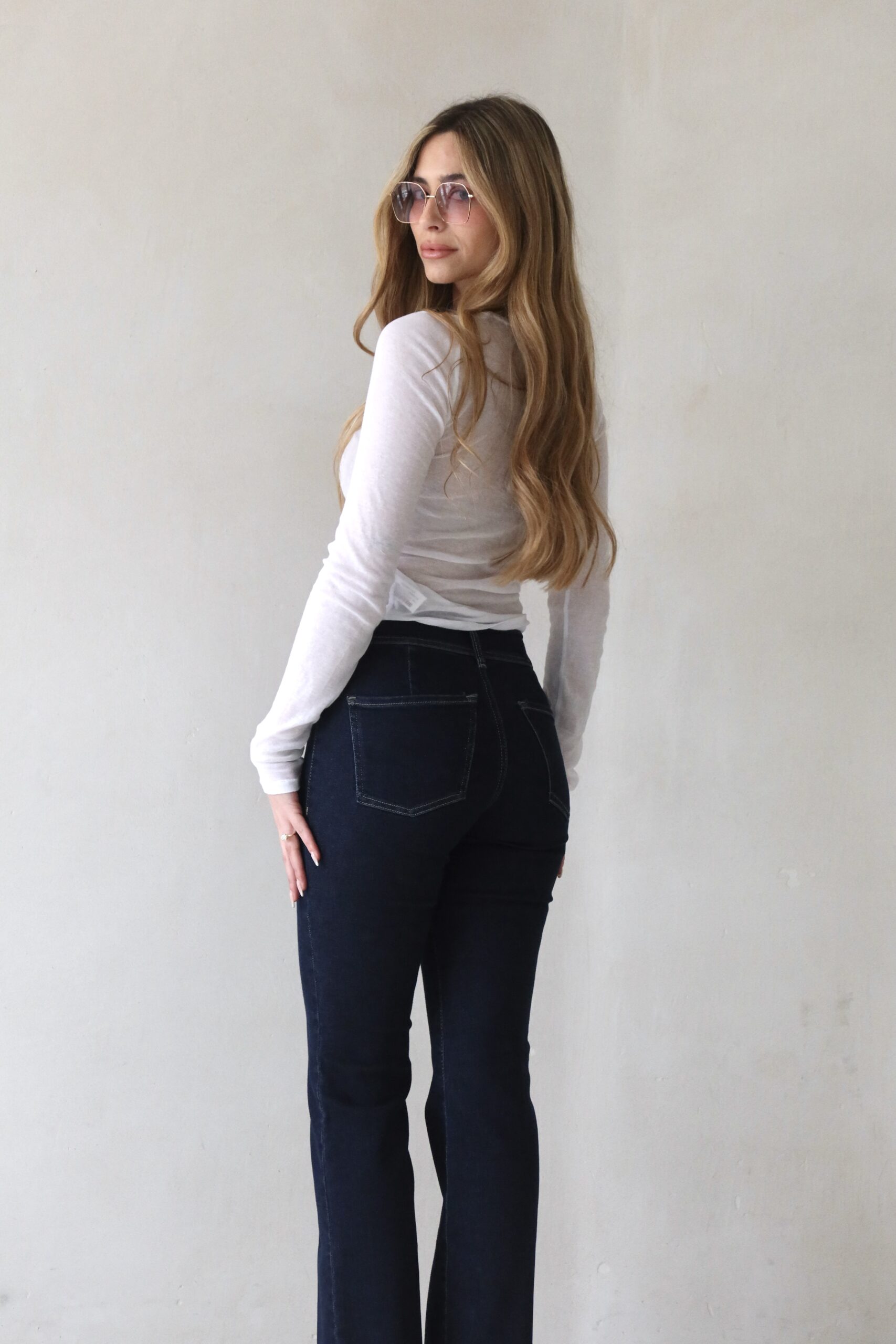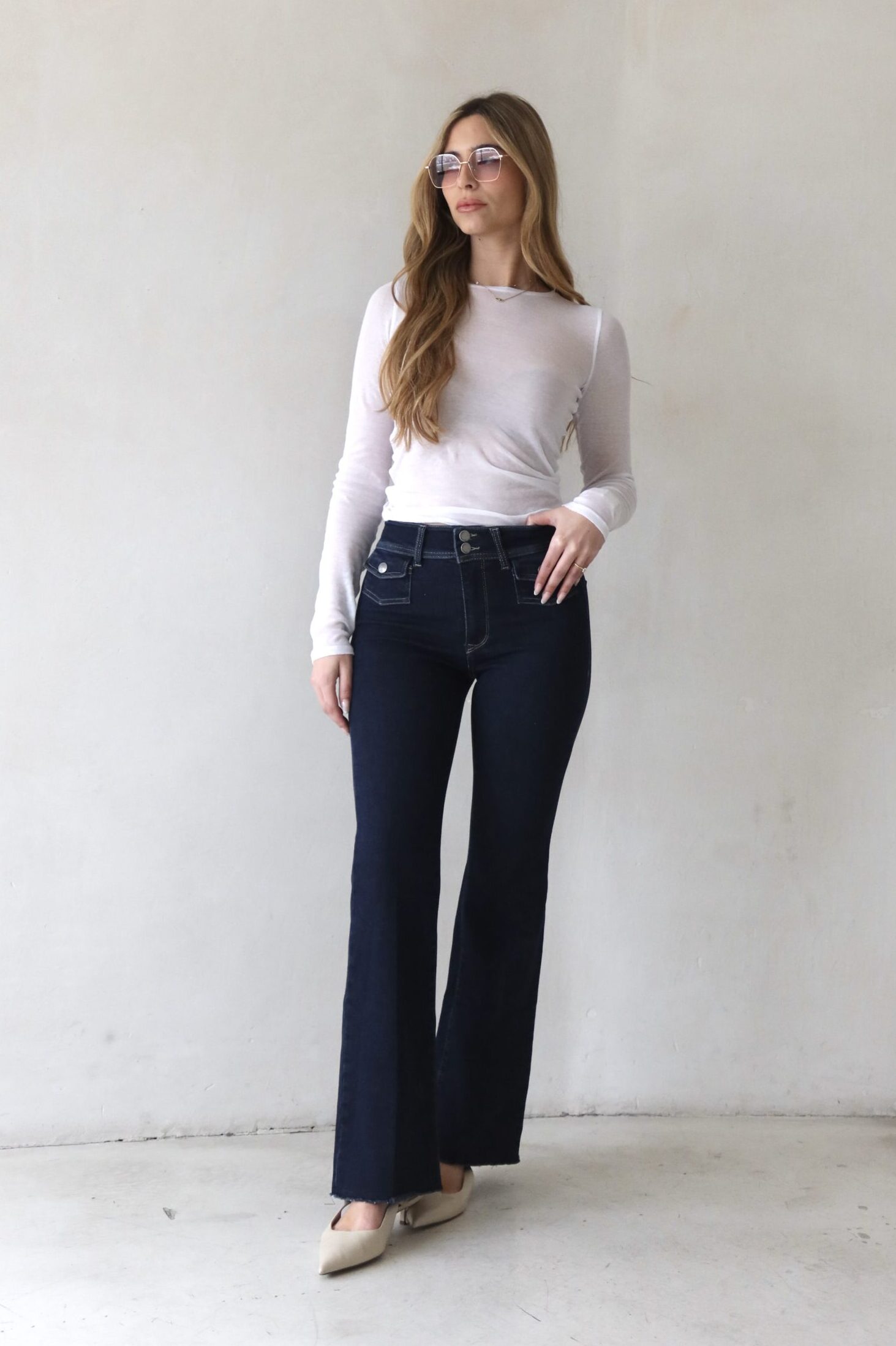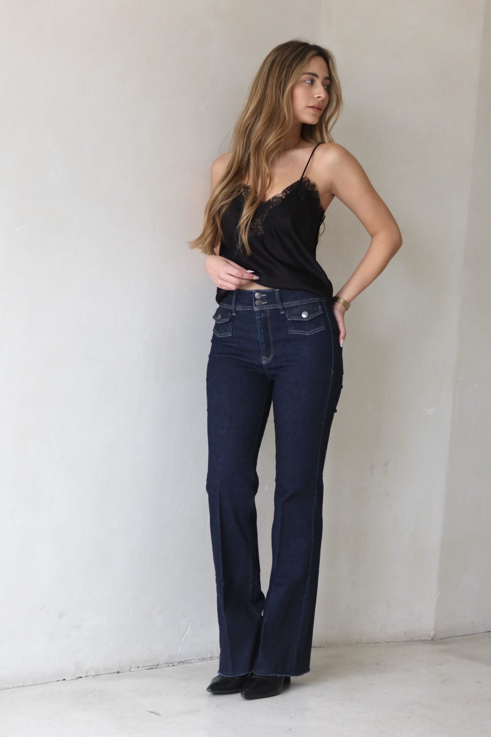 ג׳ינס פלייר ארוך עם לייקרה מחטבת וכיסי קלפות מקדימה