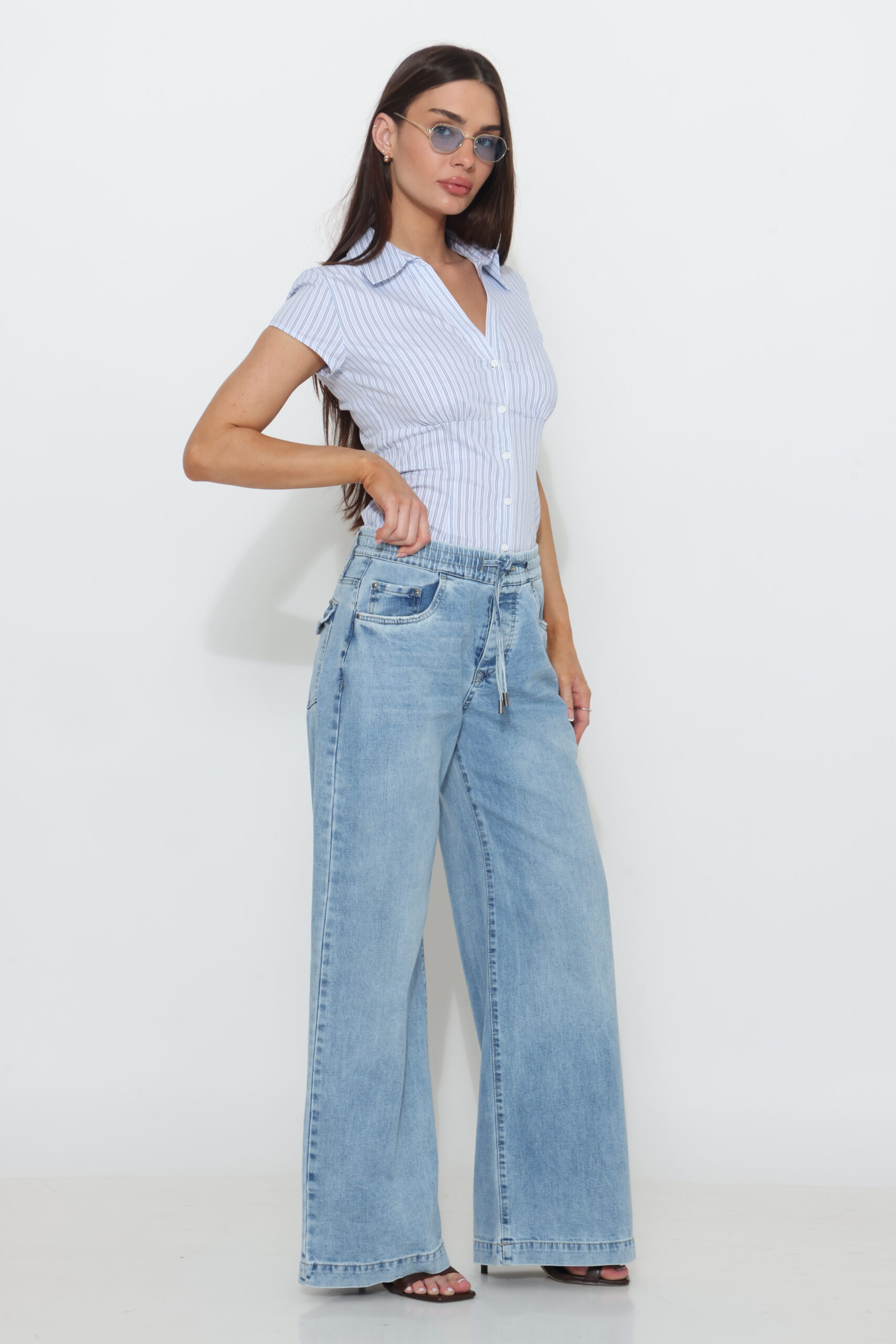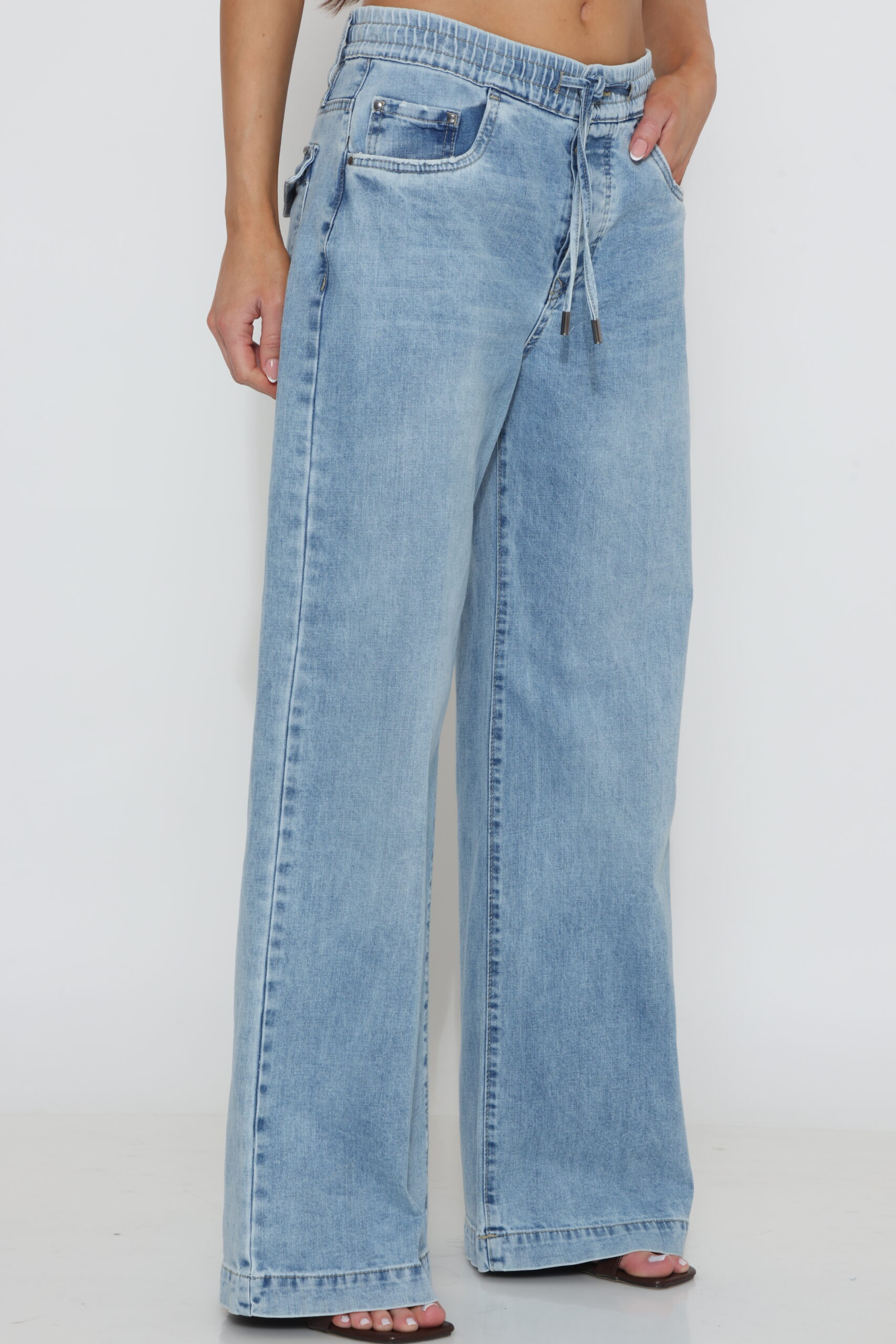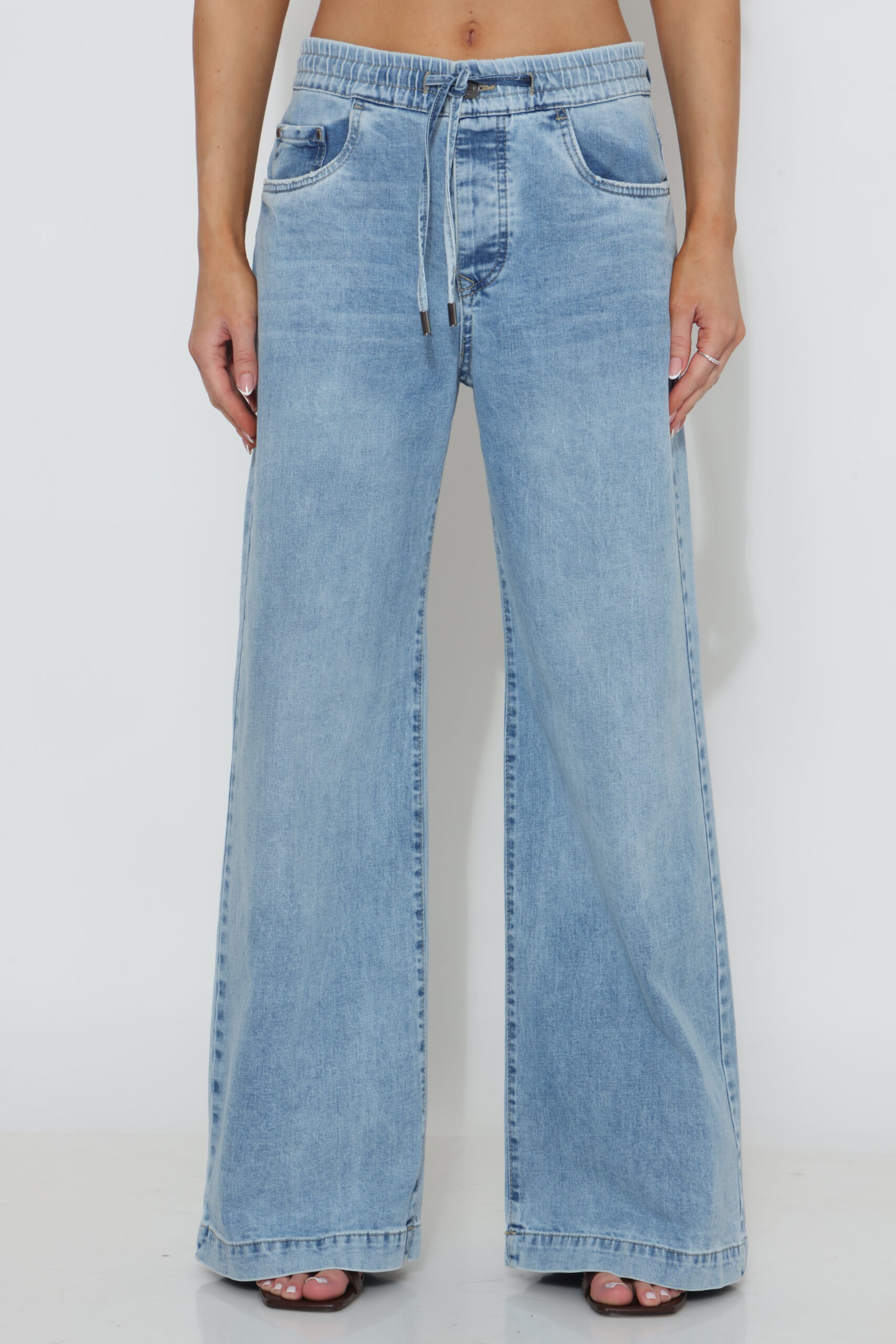 גינס בגיזרה ישרה עם גומי ושרוך וסגירת כפתור עם לייקרה