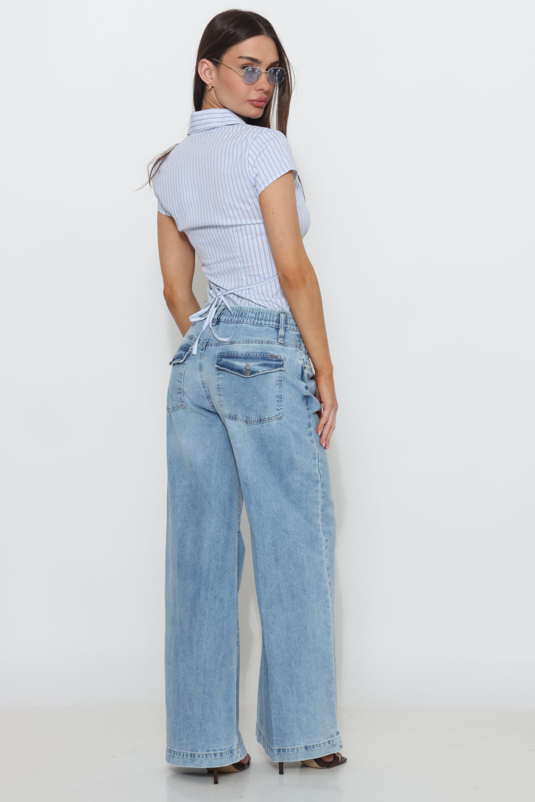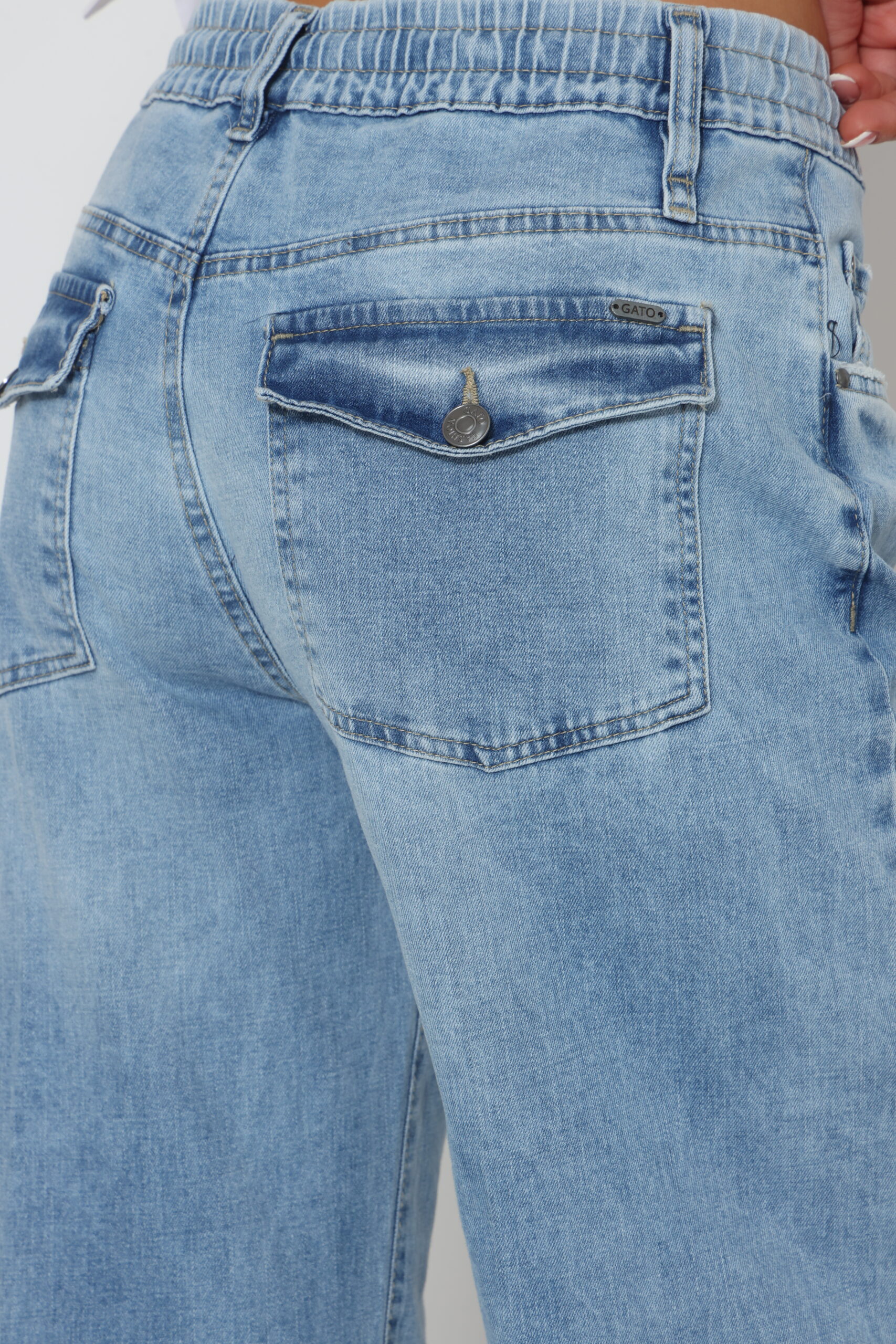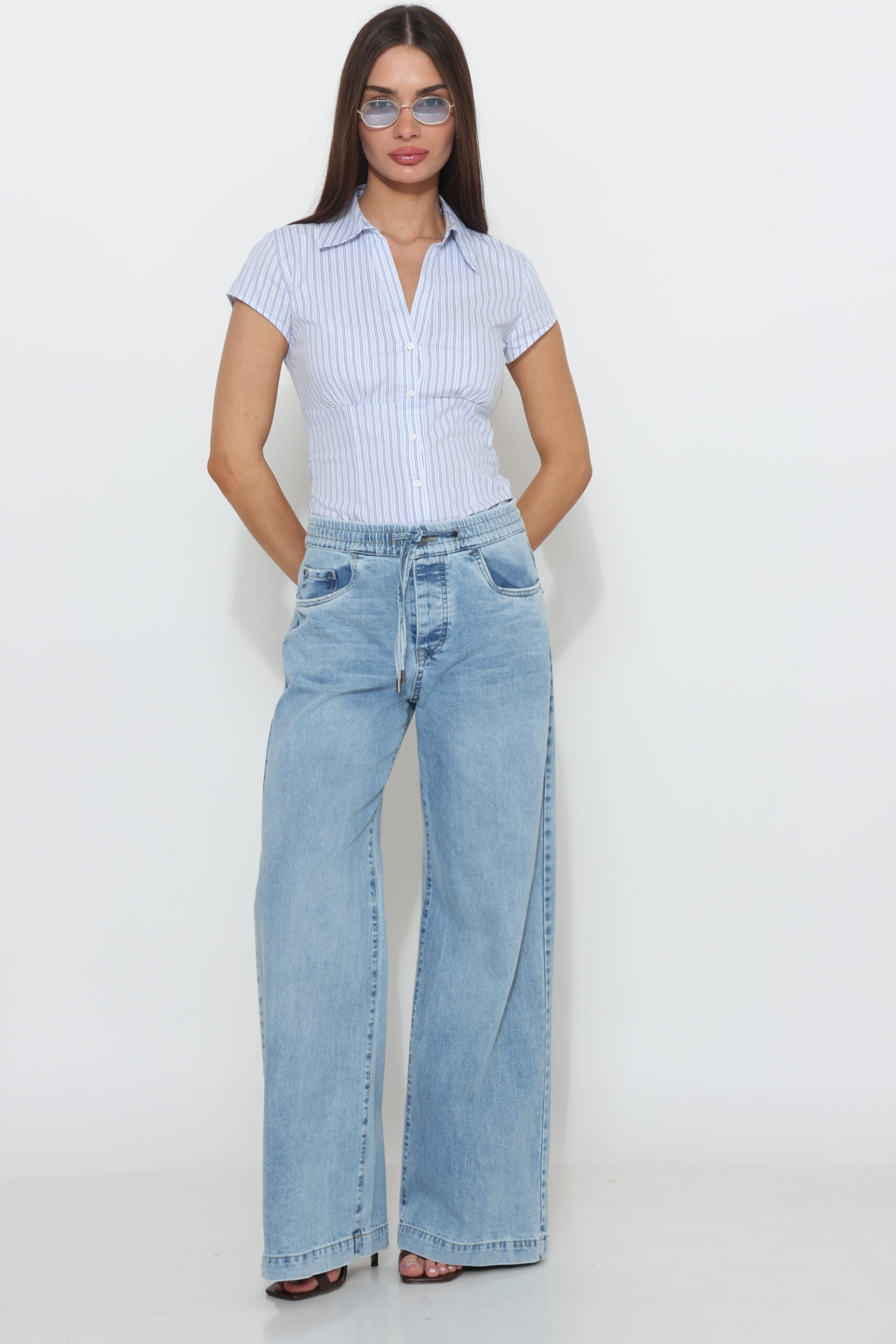 גינס בגיזרה ישרה עם גומי ושרוך וסגירת כפתור עם לייקרה
