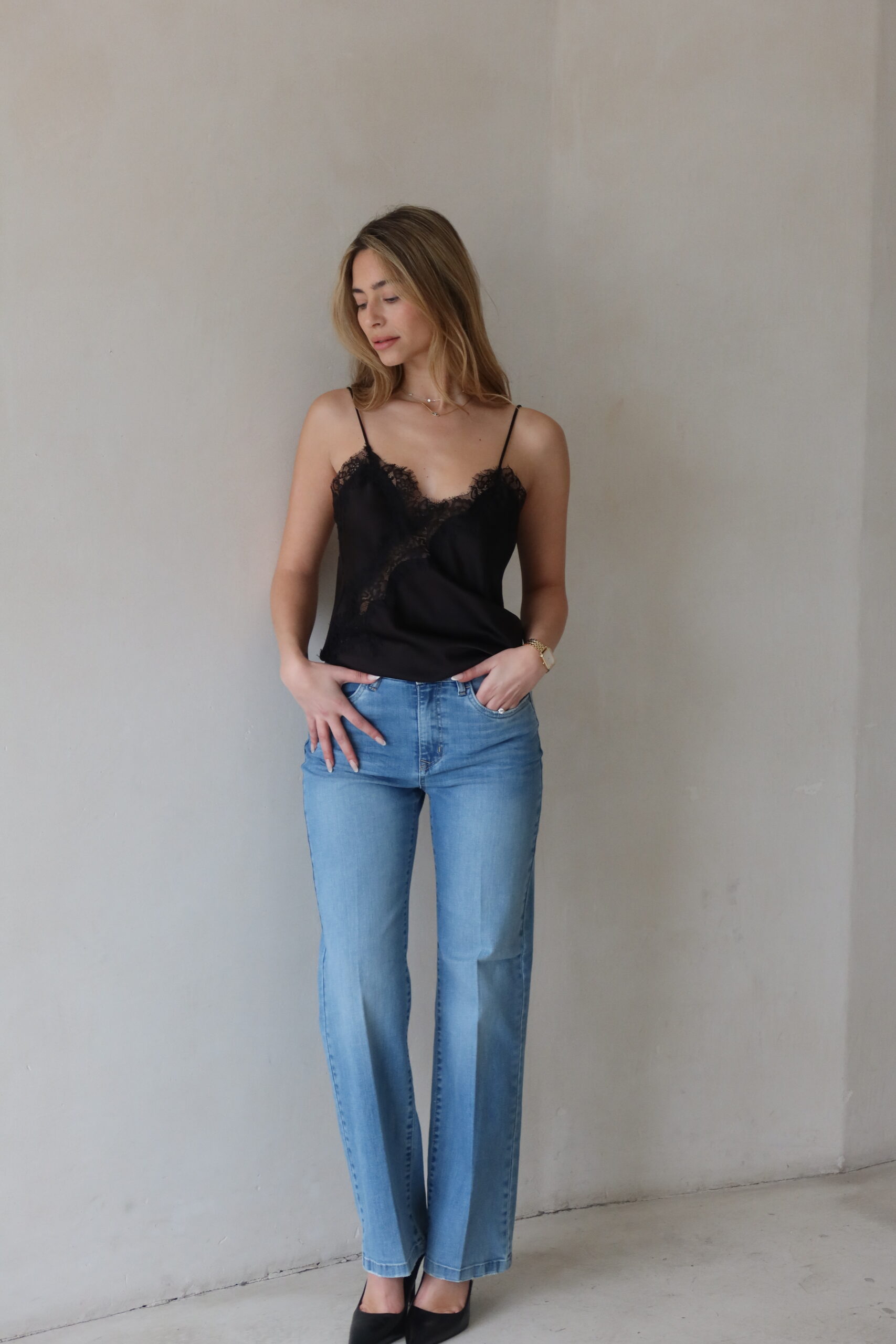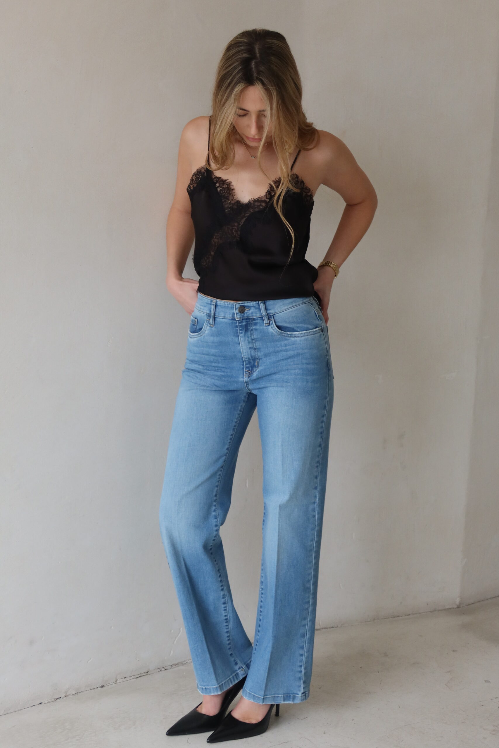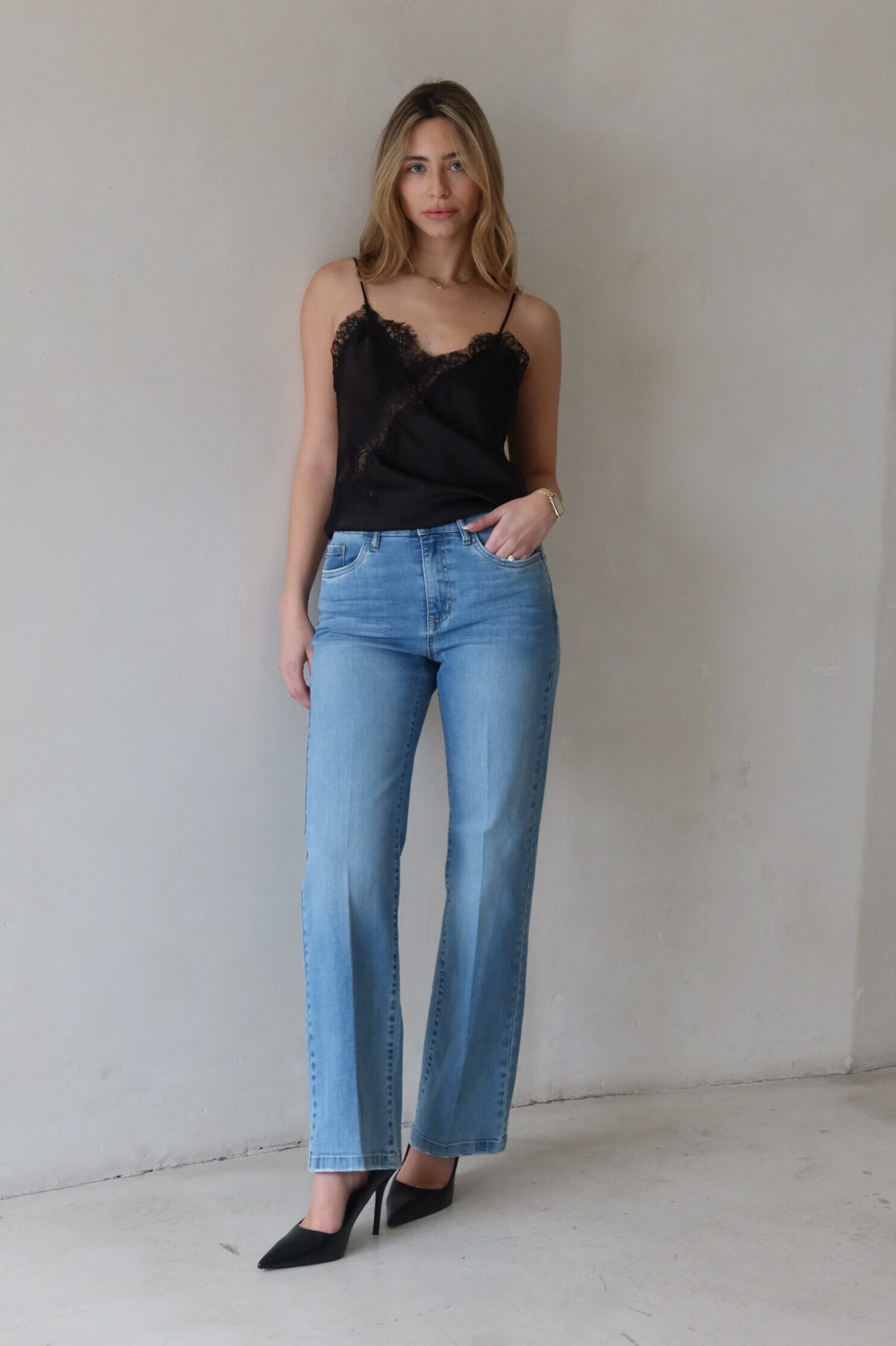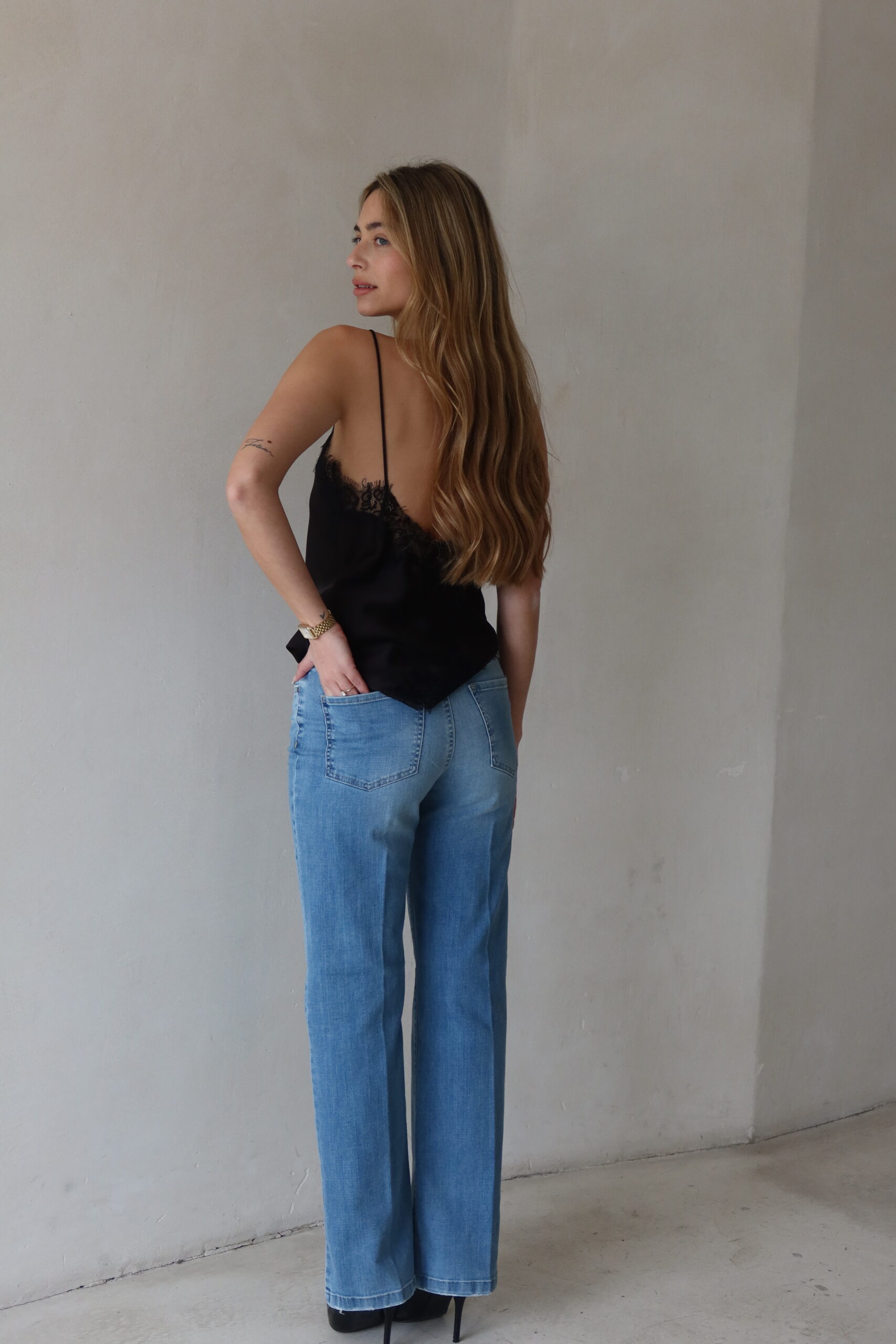 גינס בגיזרה ישרה בגוון כהה עם תיפור בצבע אבן