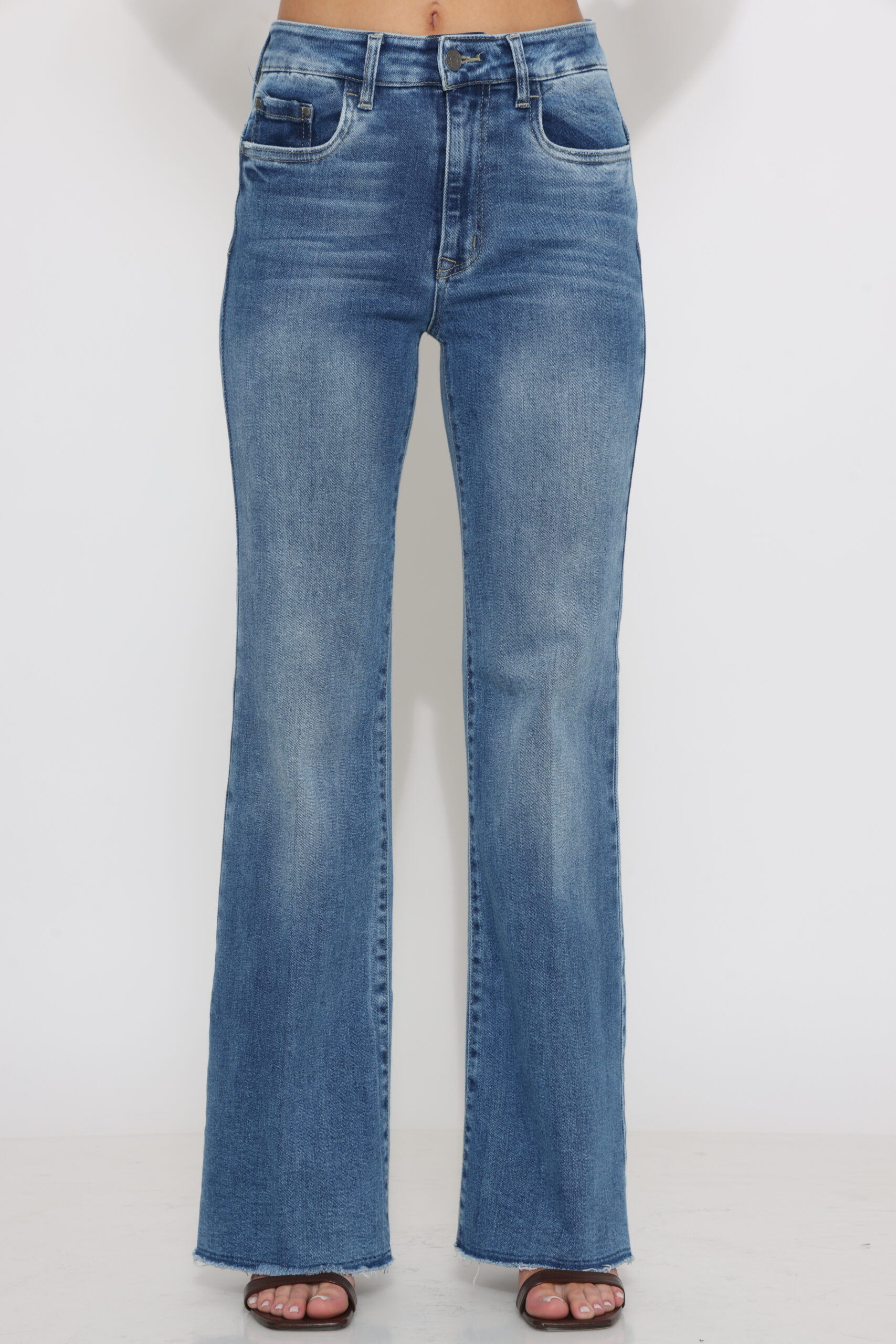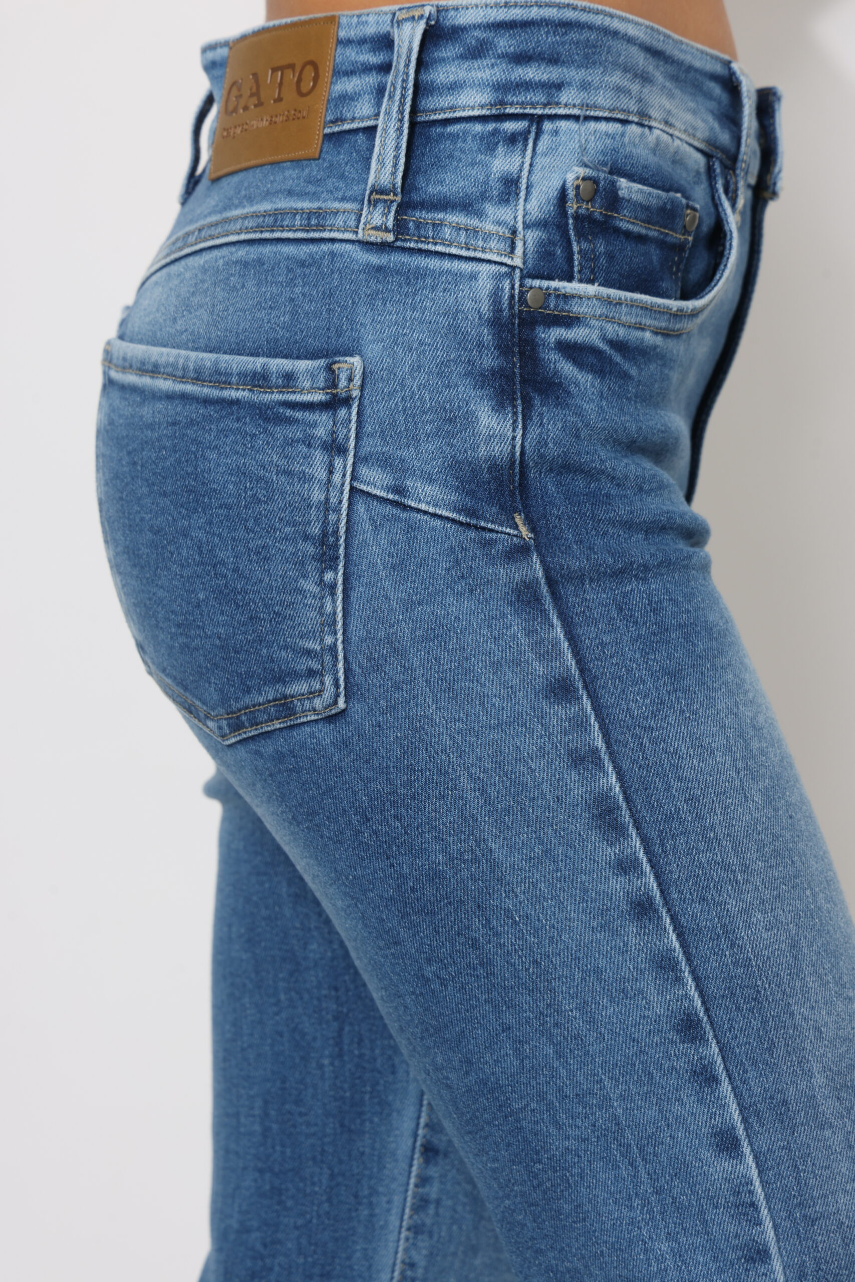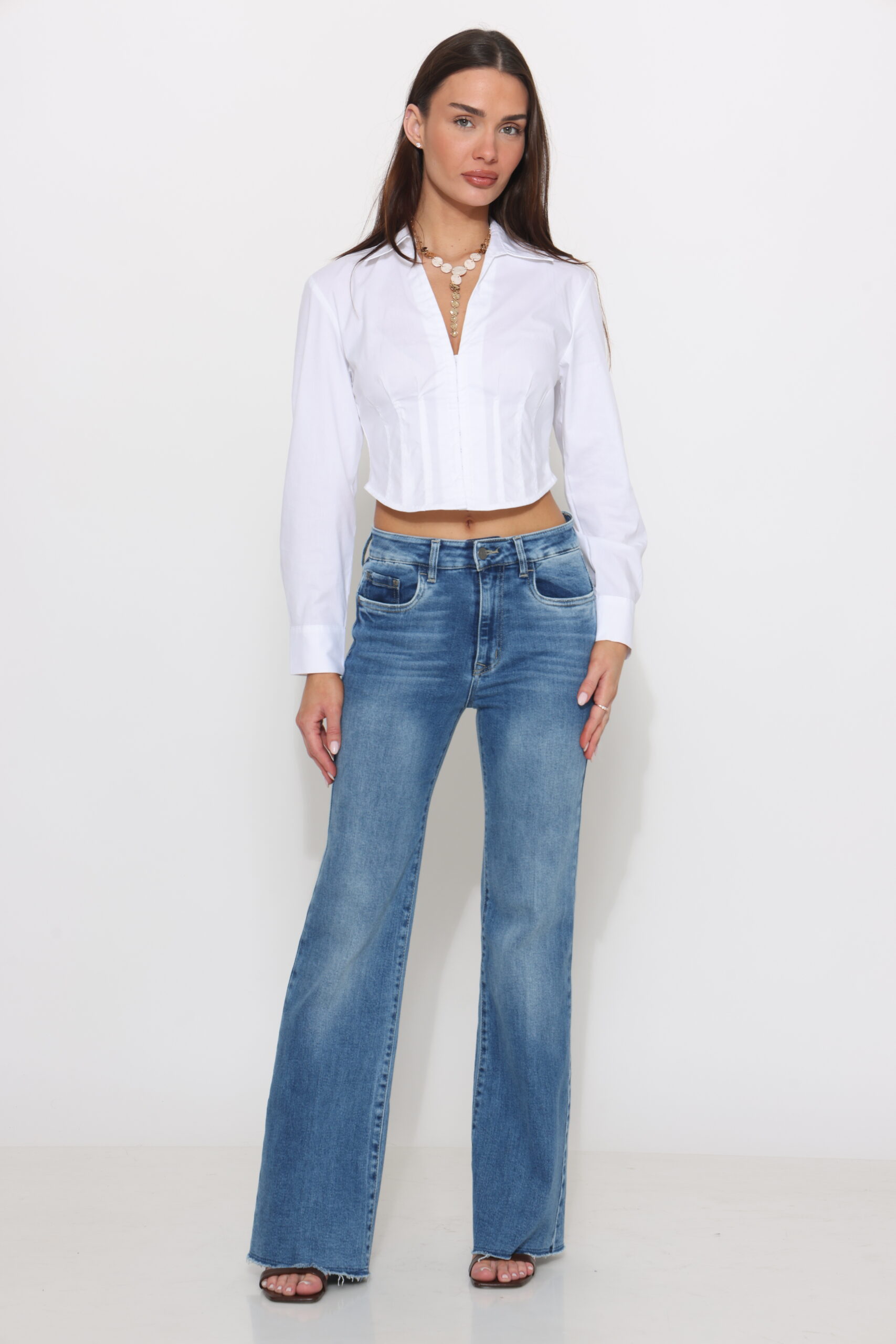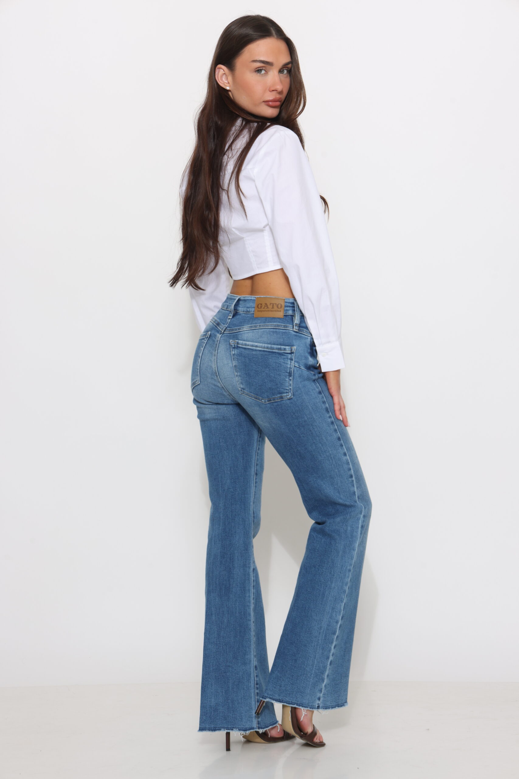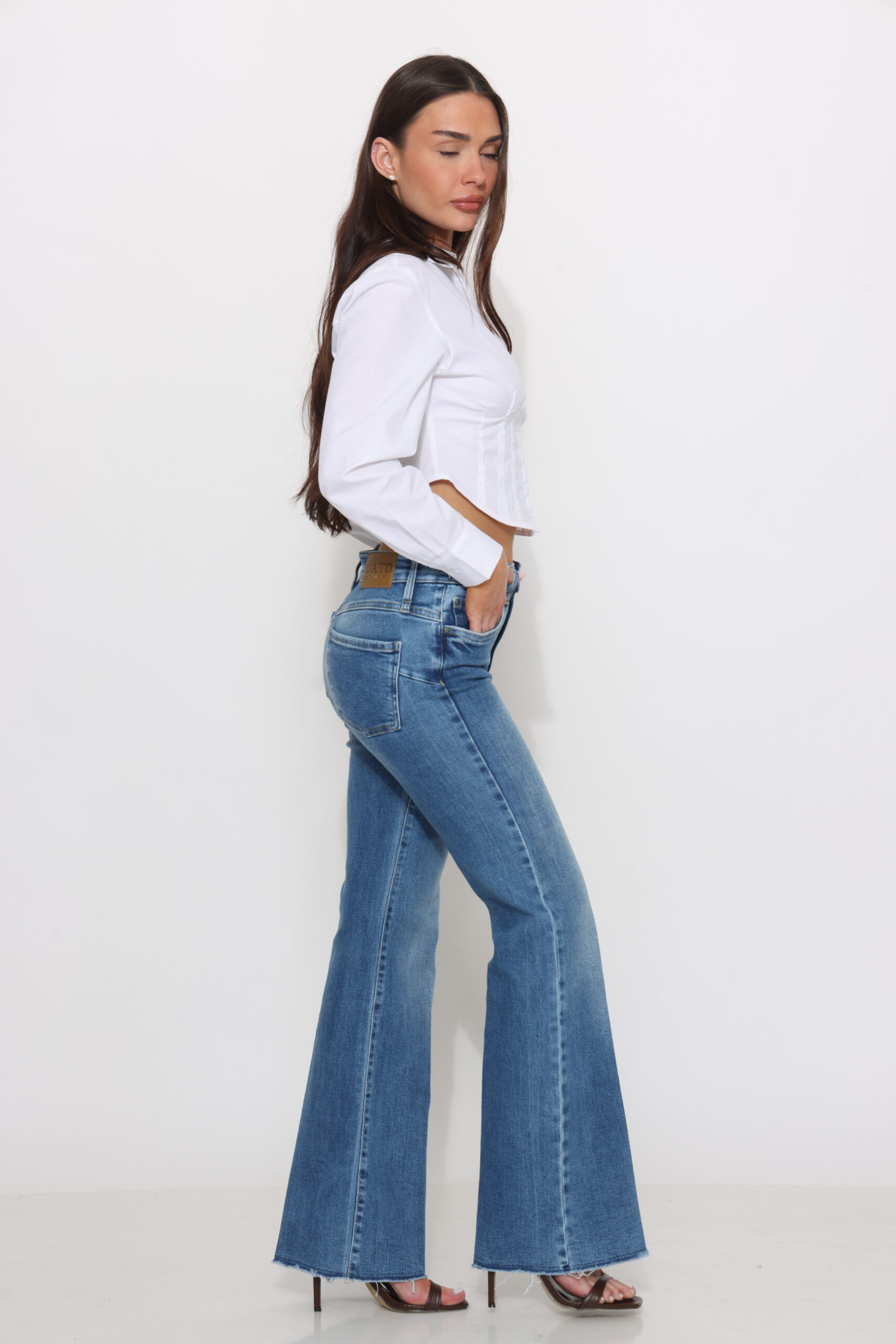 ג׳ינס בגוון אמצע עם לייקרה בגיזרה גבוה מתרחב עם סיומת גזורה.