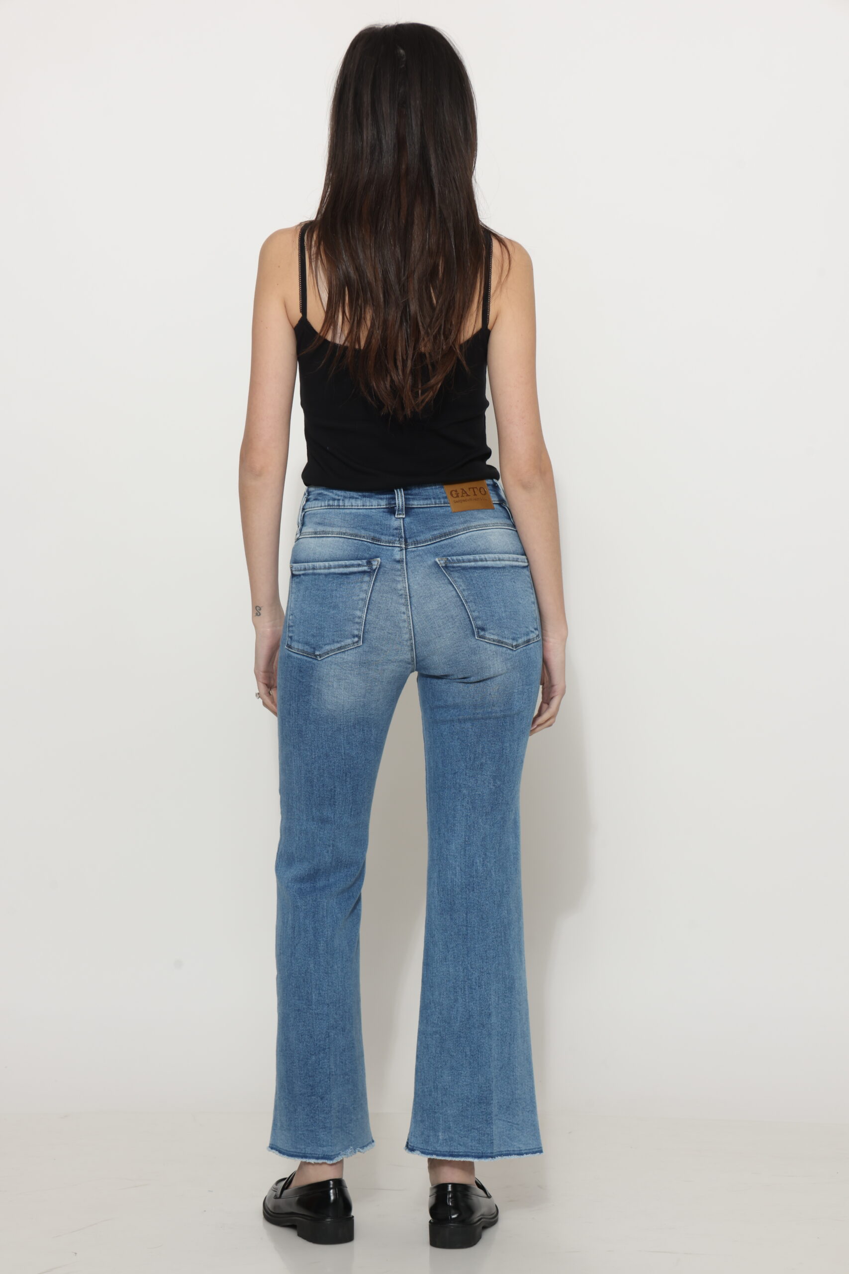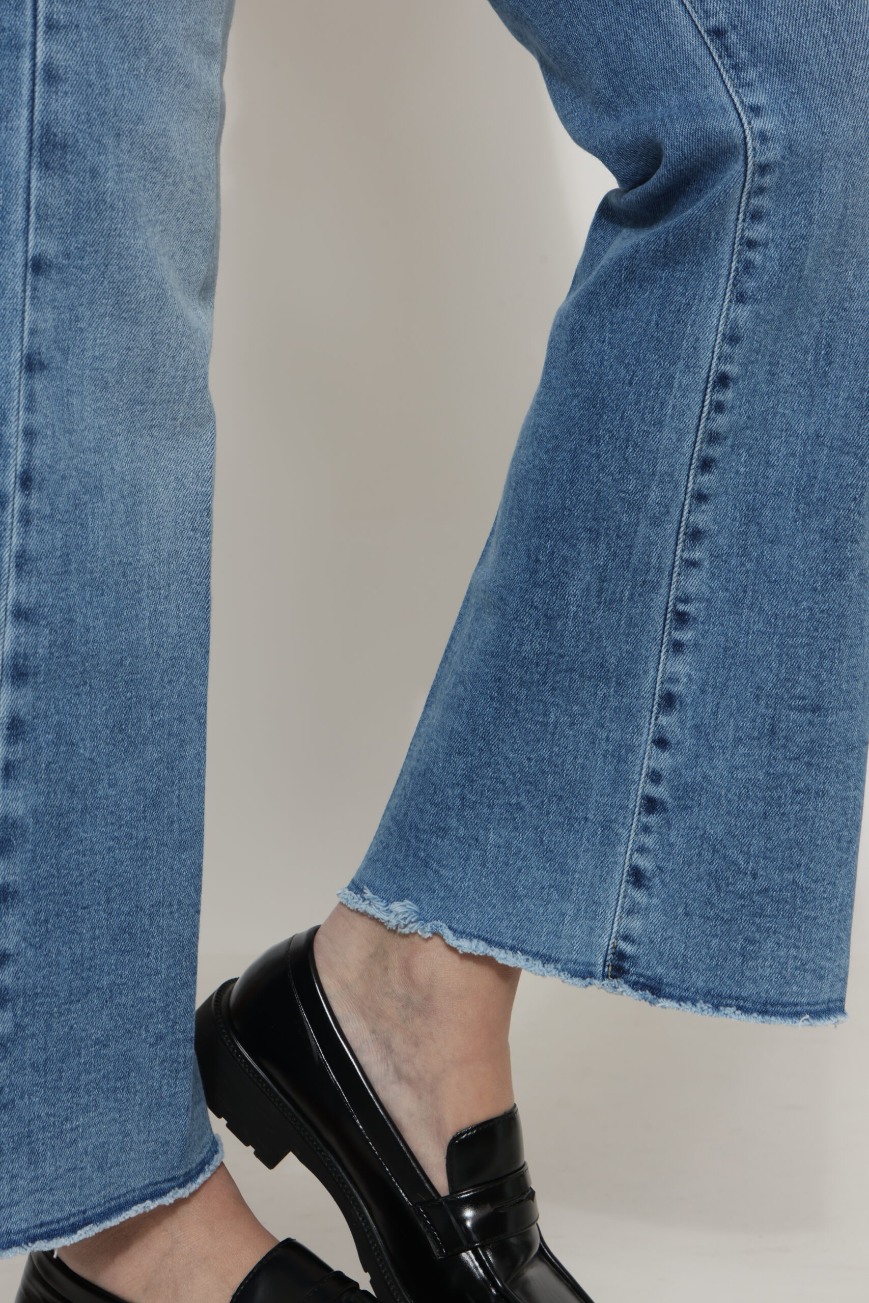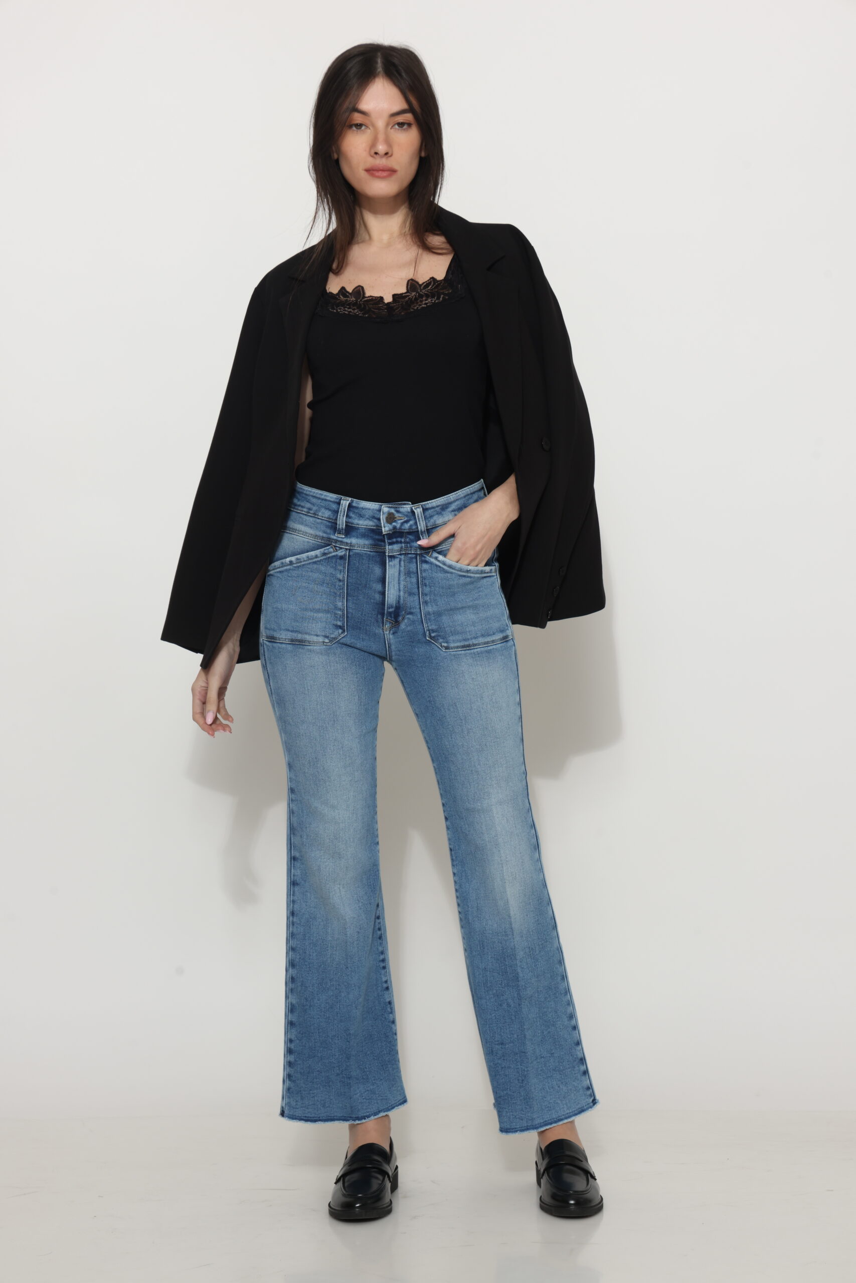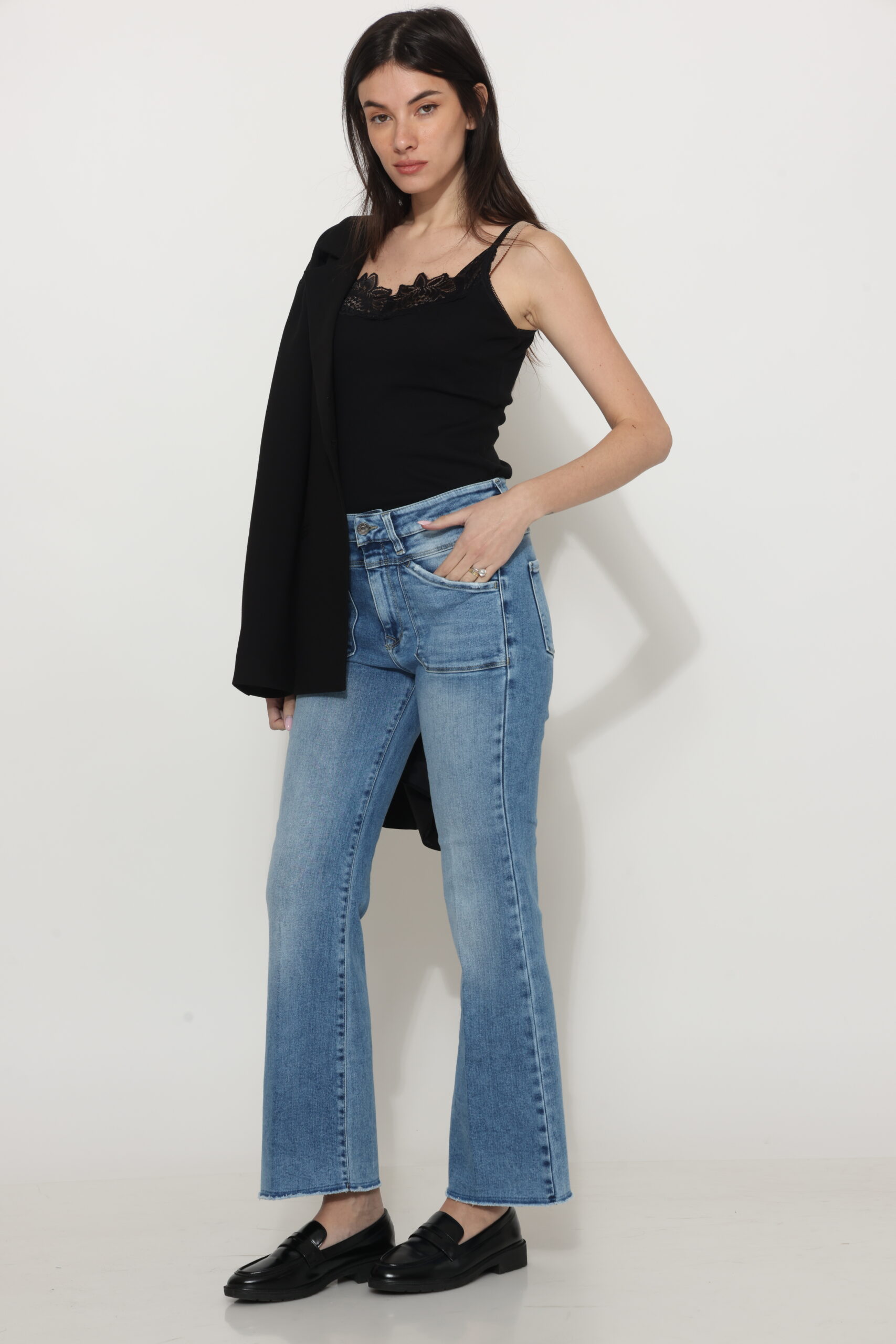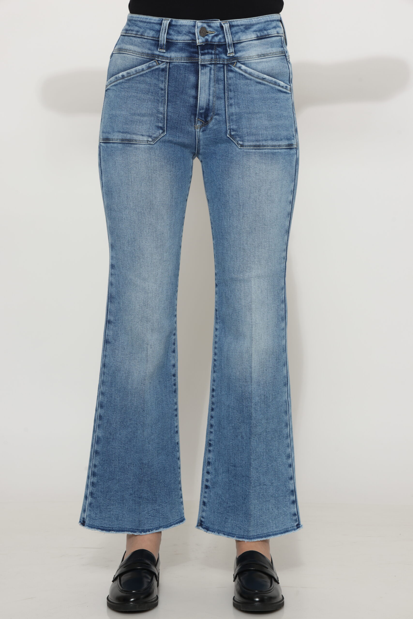 גינס עם כיסים קדמיים בגזרת פלייר גזורה עם לייקרה בגוון בהיר