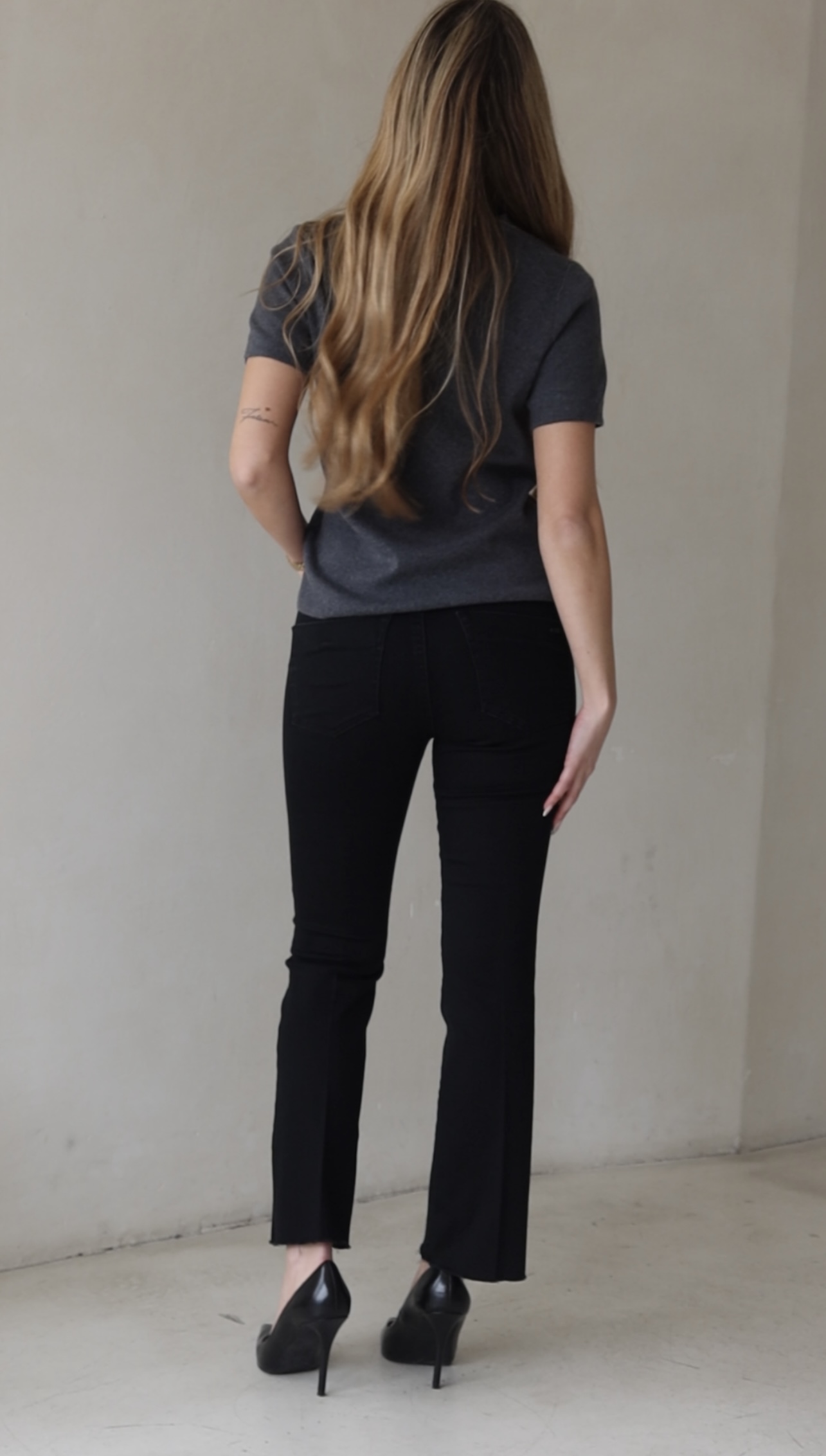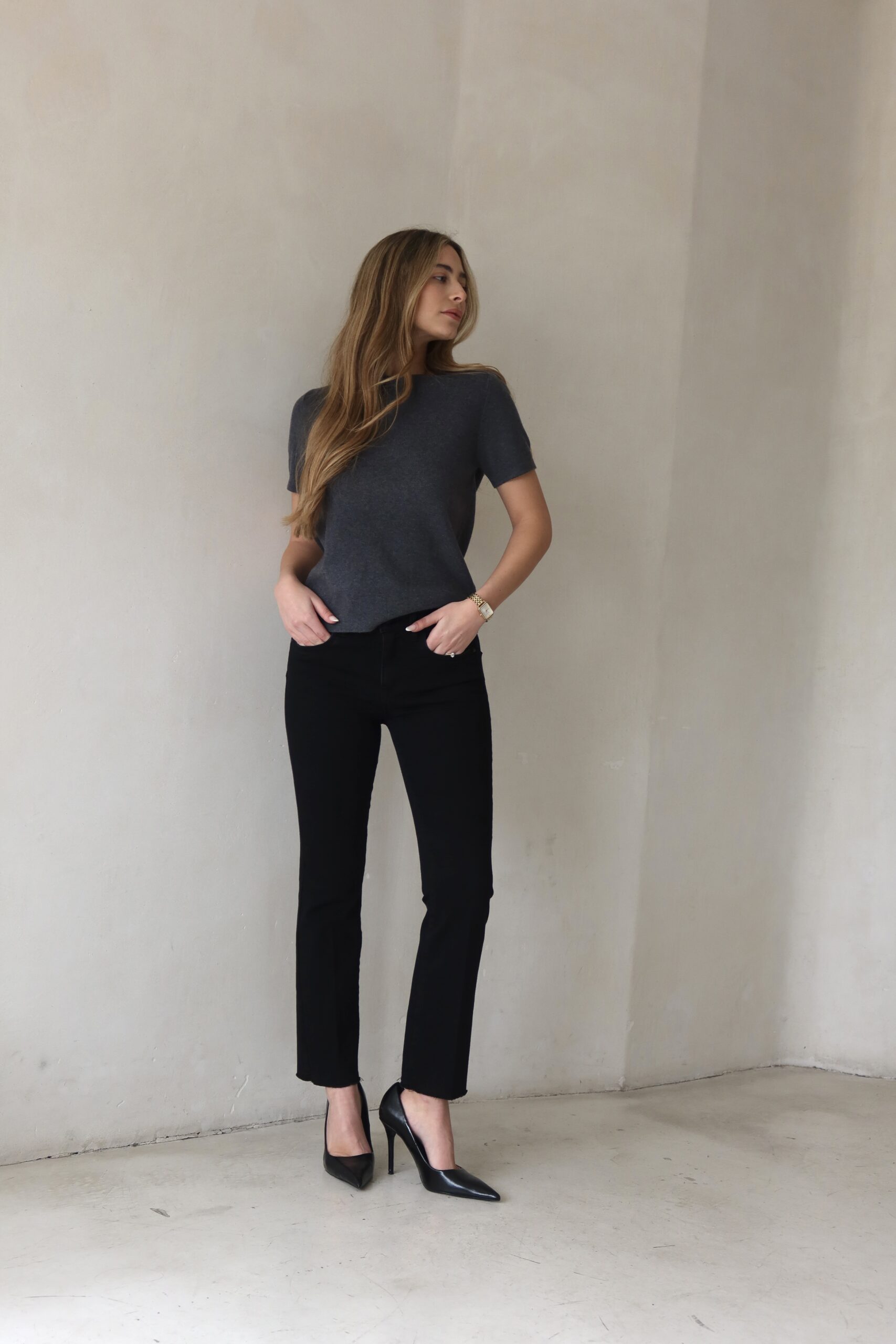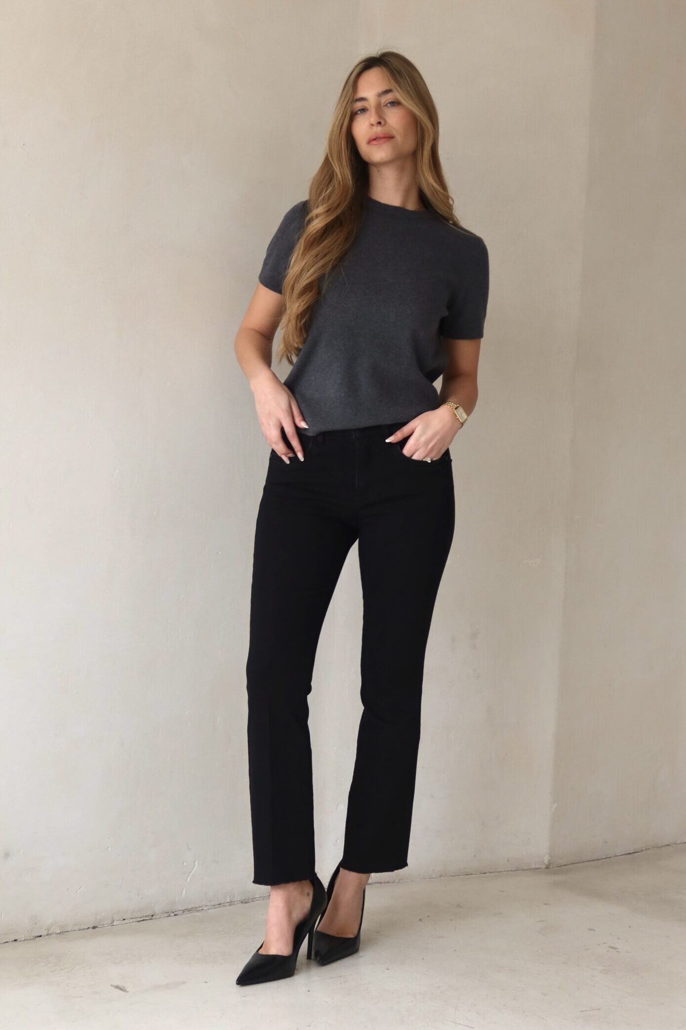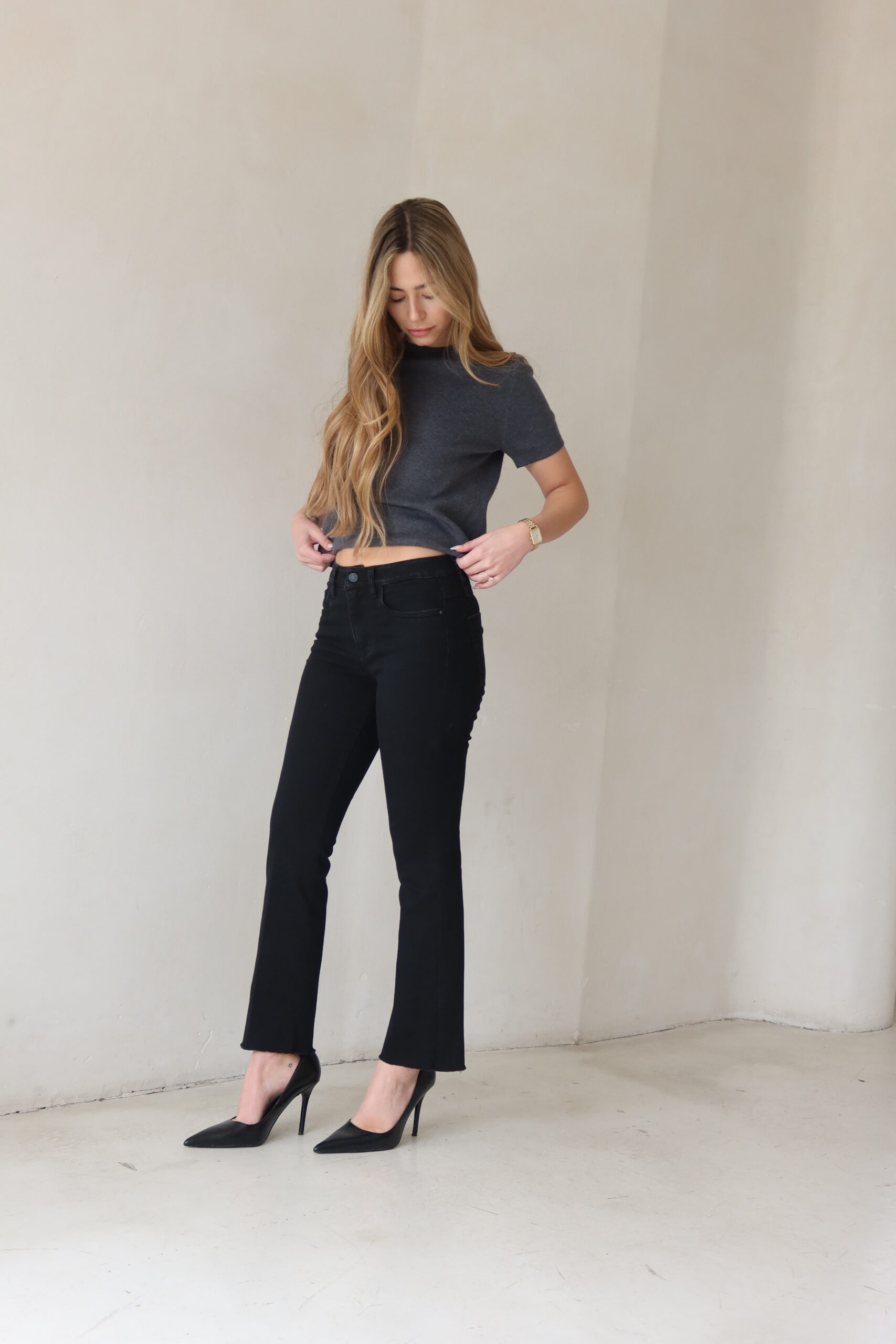 גינס שחור בגיזרת גובה אמצע במותן אורך קרסול עם לייקרה