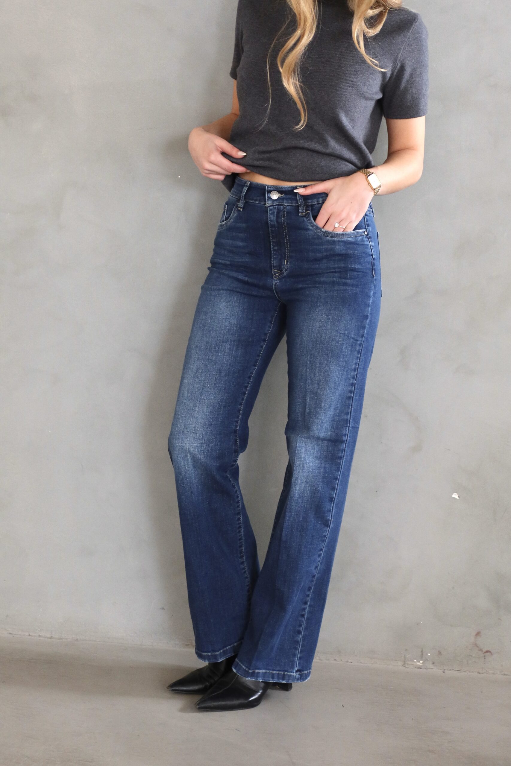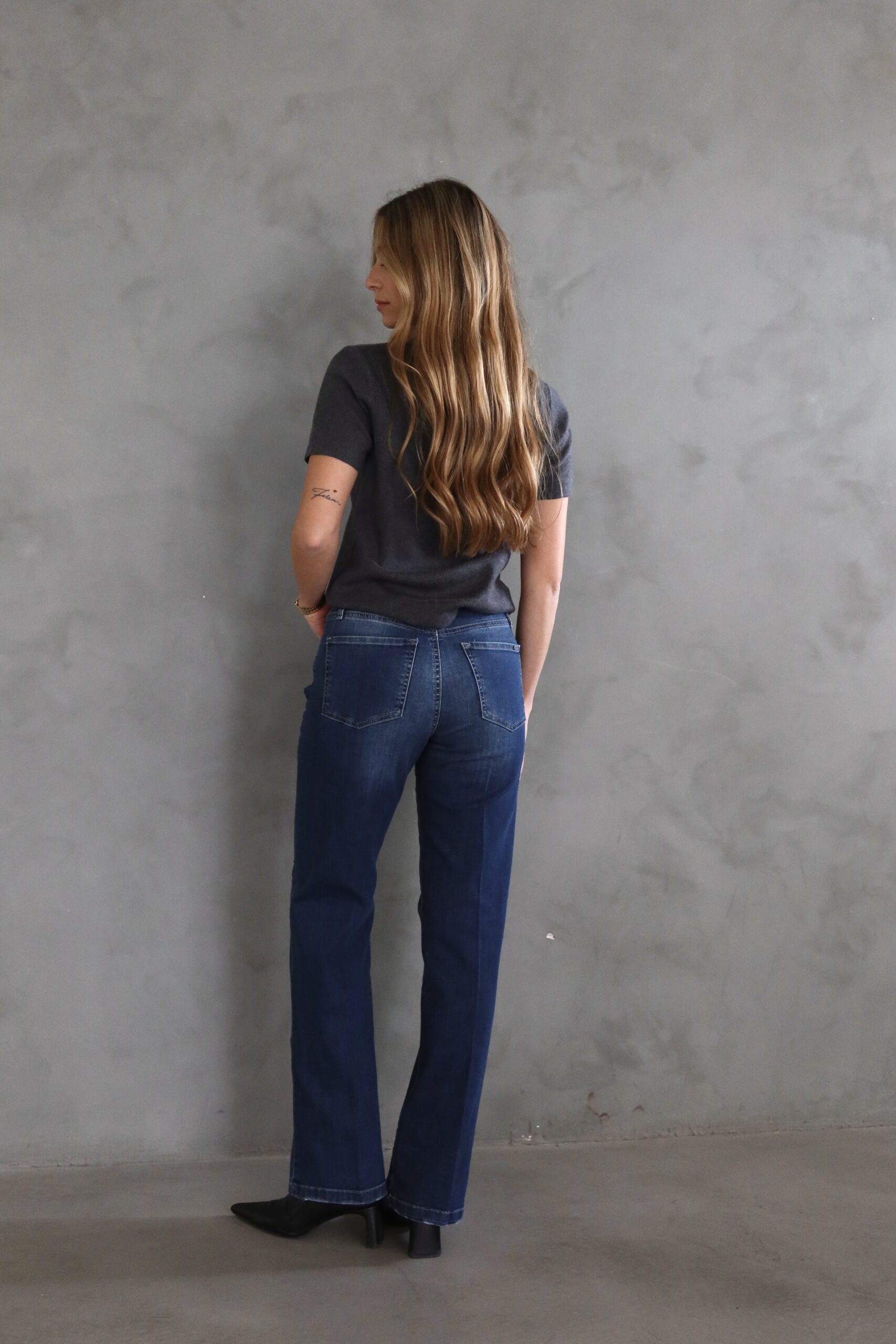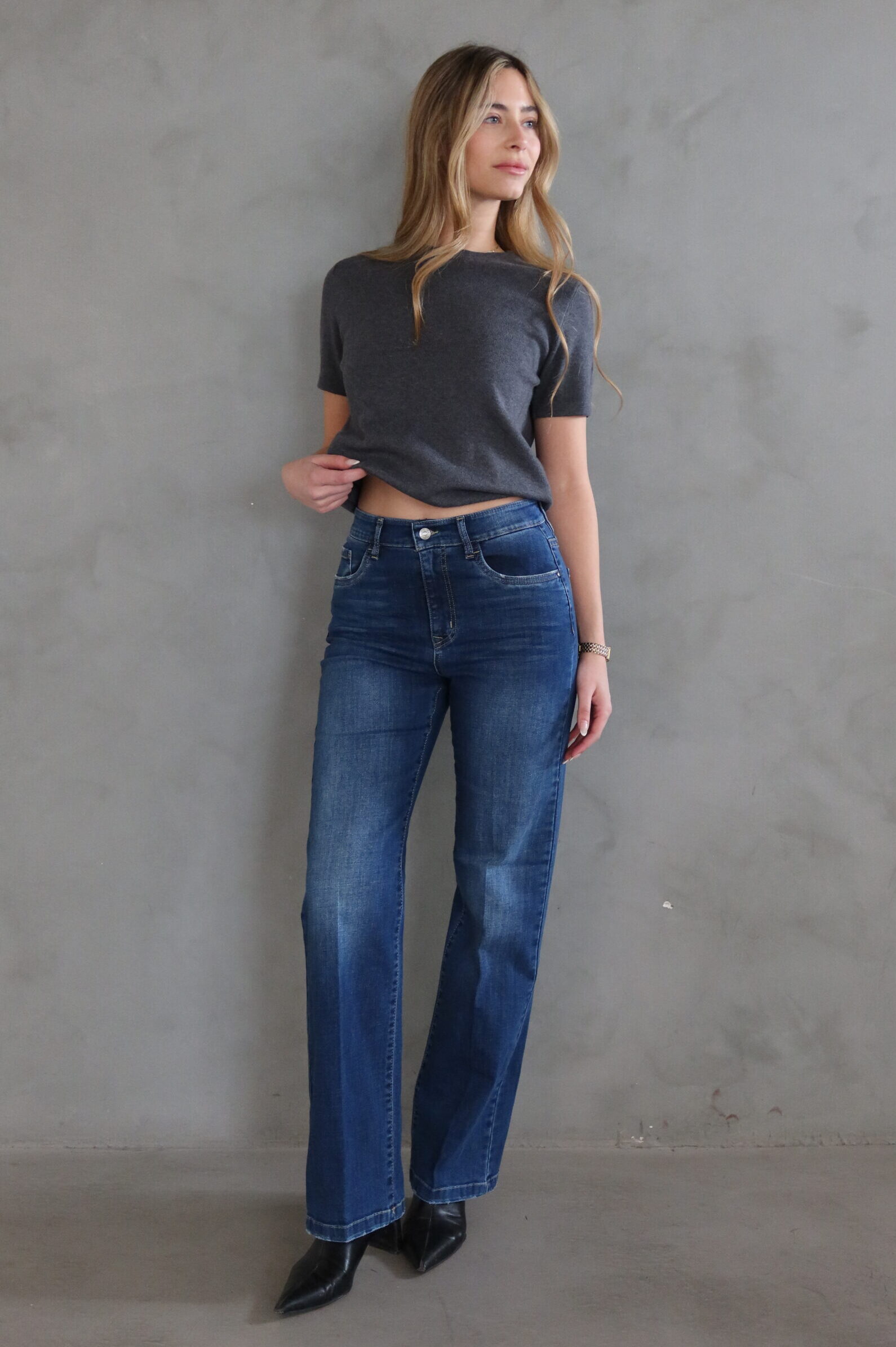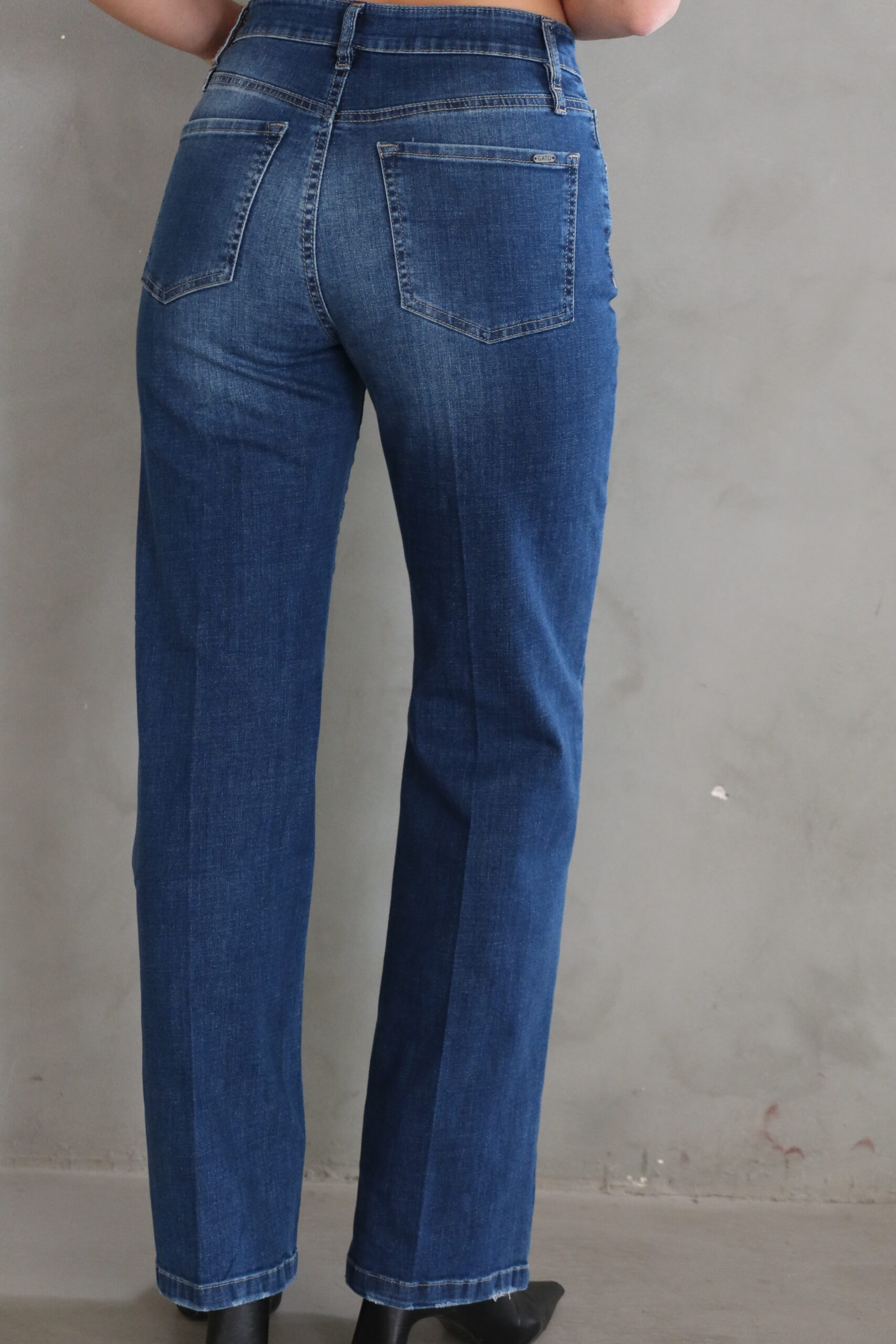 גינס בגיזרה ישרה בגוון כחול עם תיפור בצבע אבן