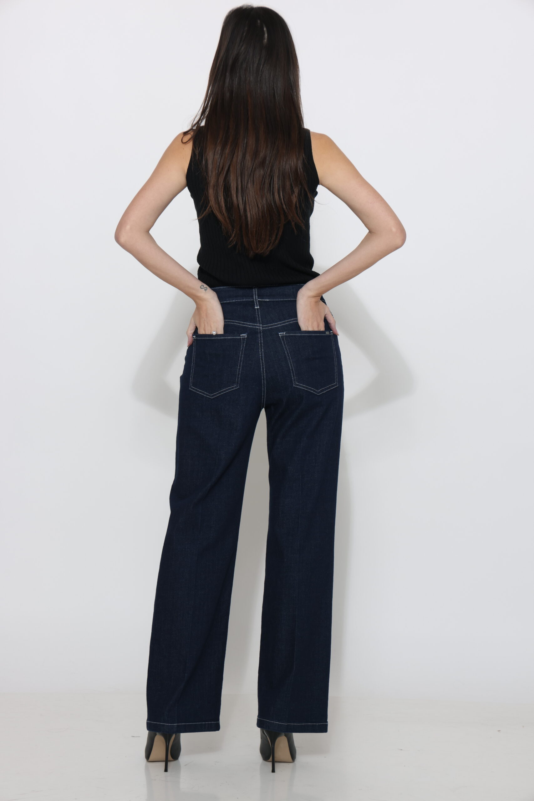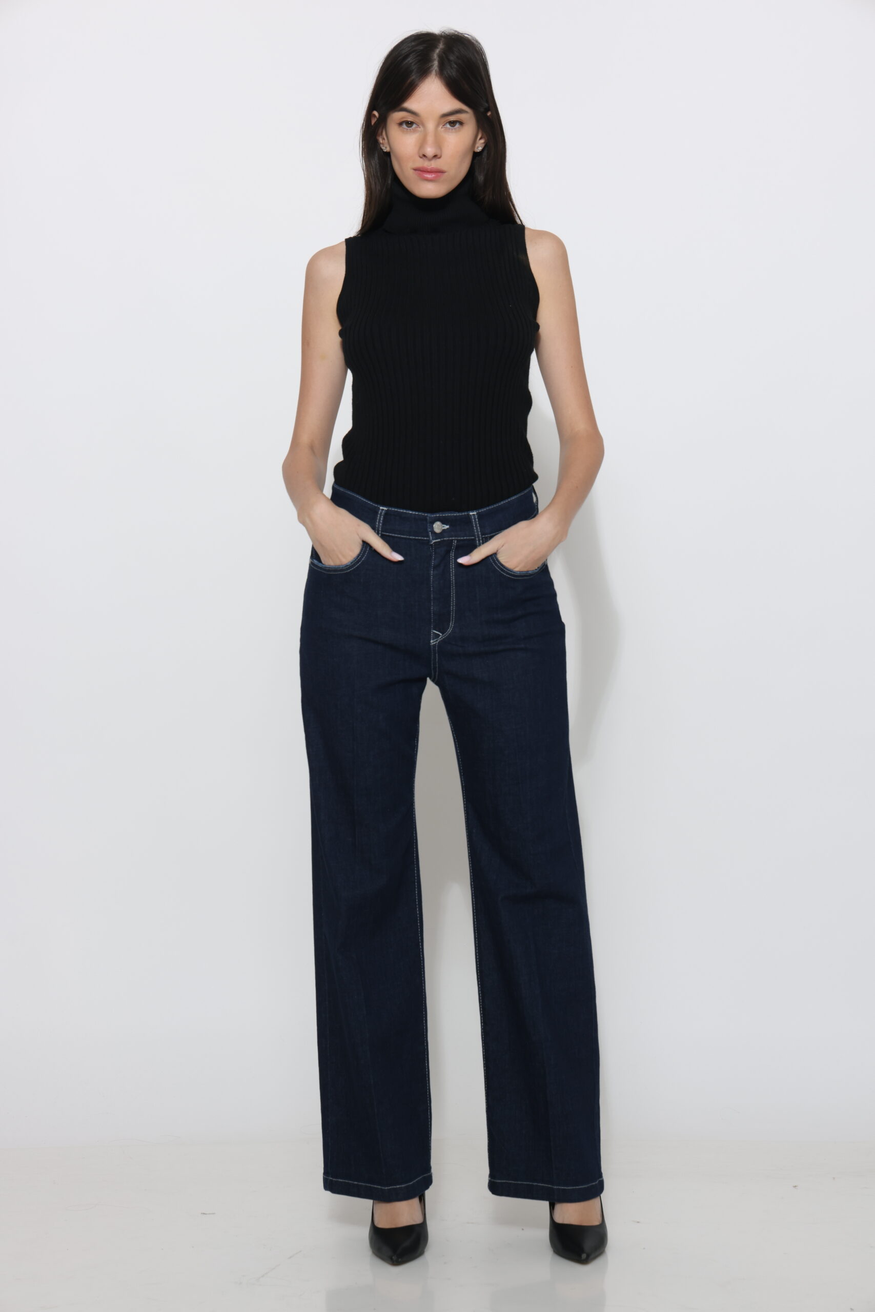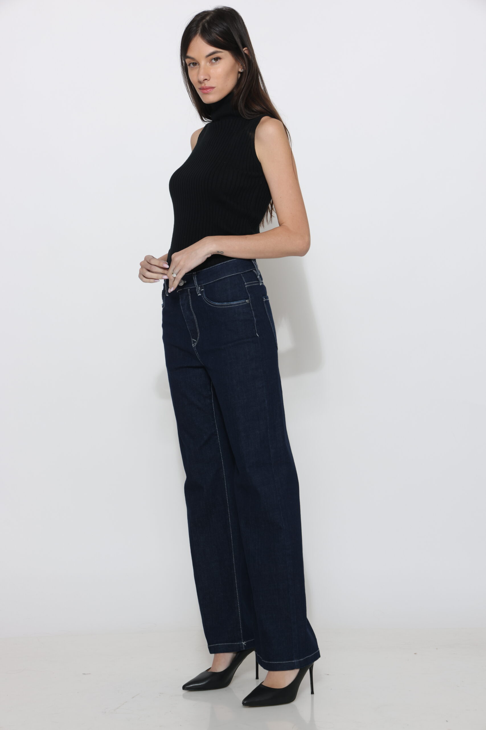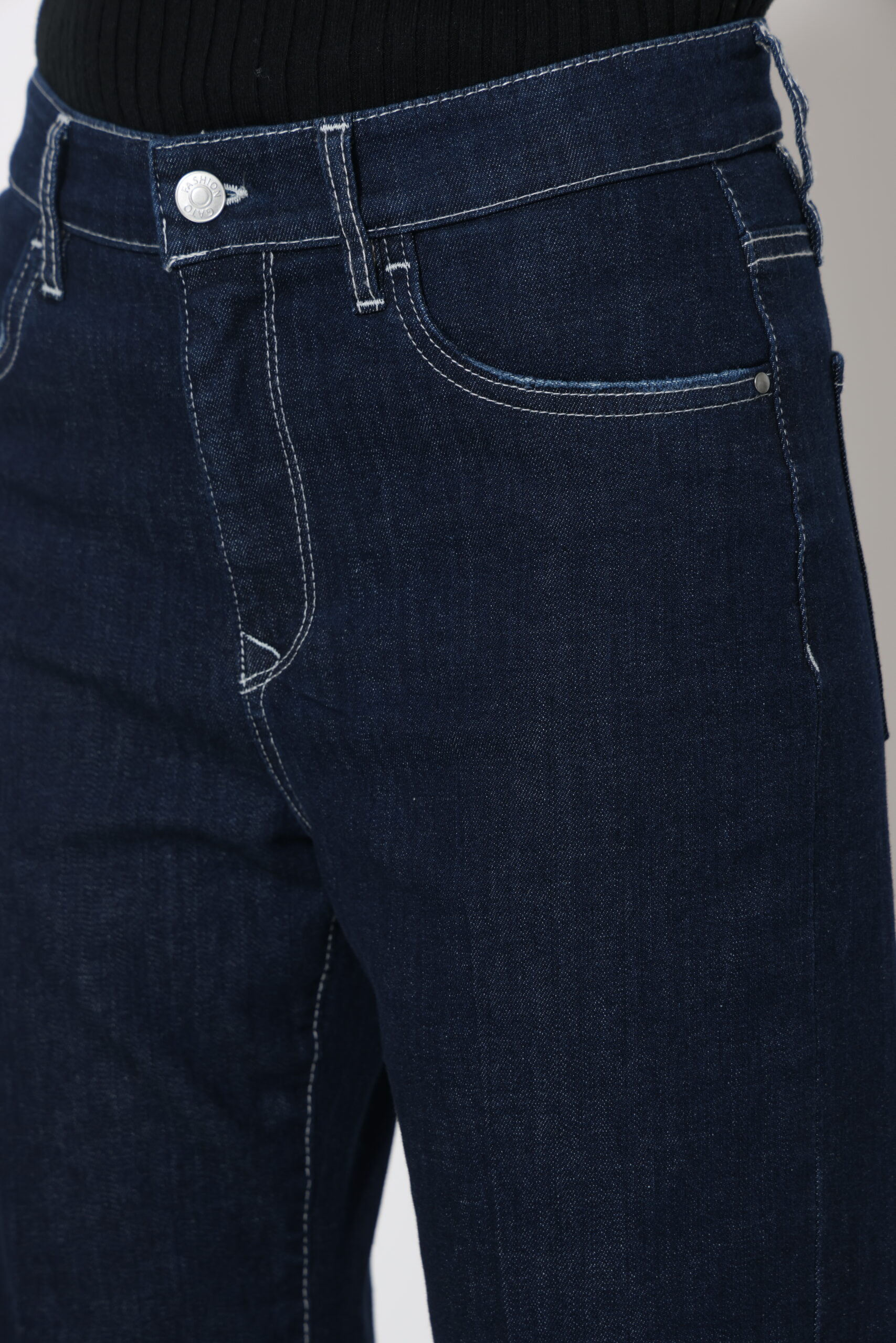גינס בגיזרה ישרה בגוון כהה עם תיפור בצבע אבן