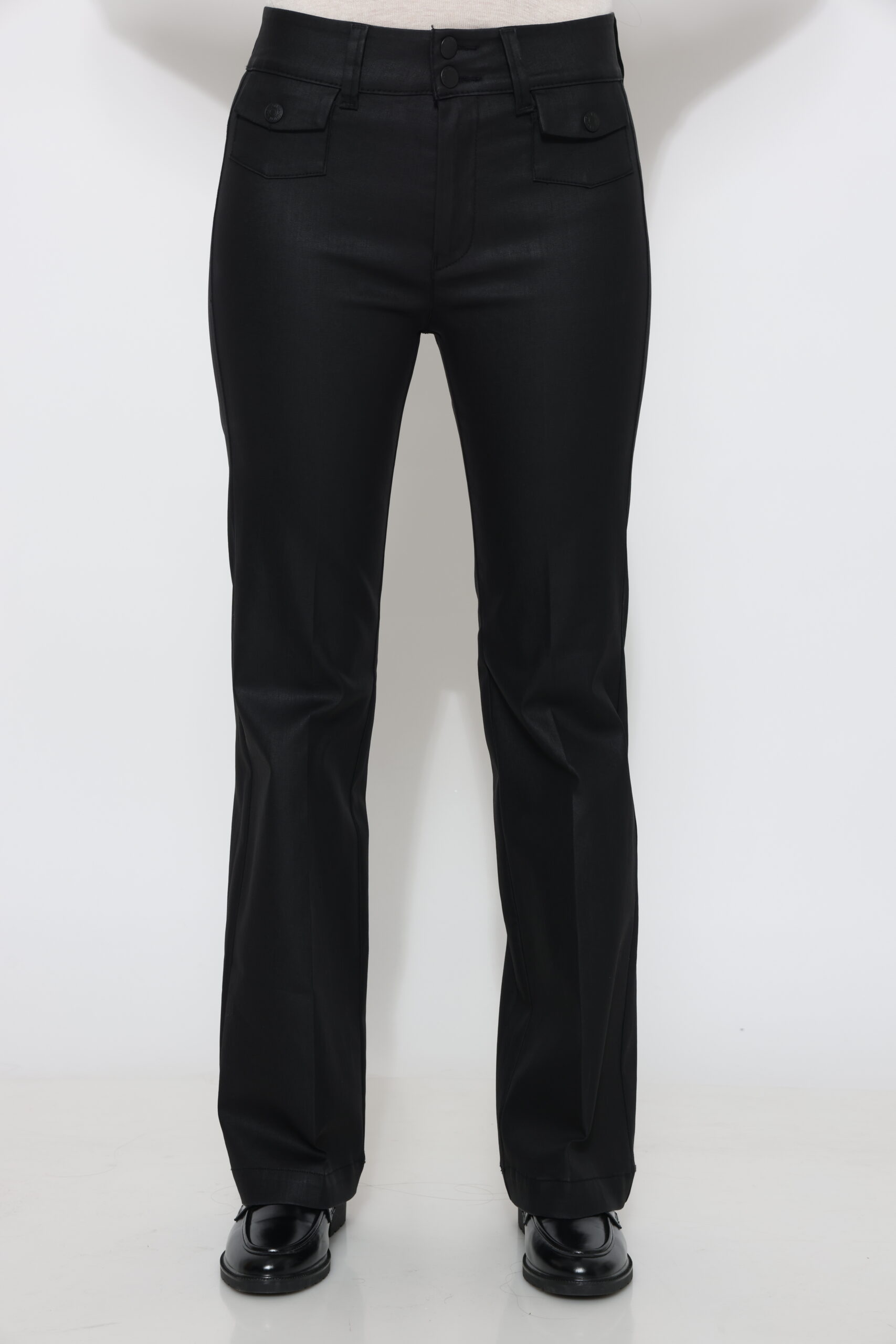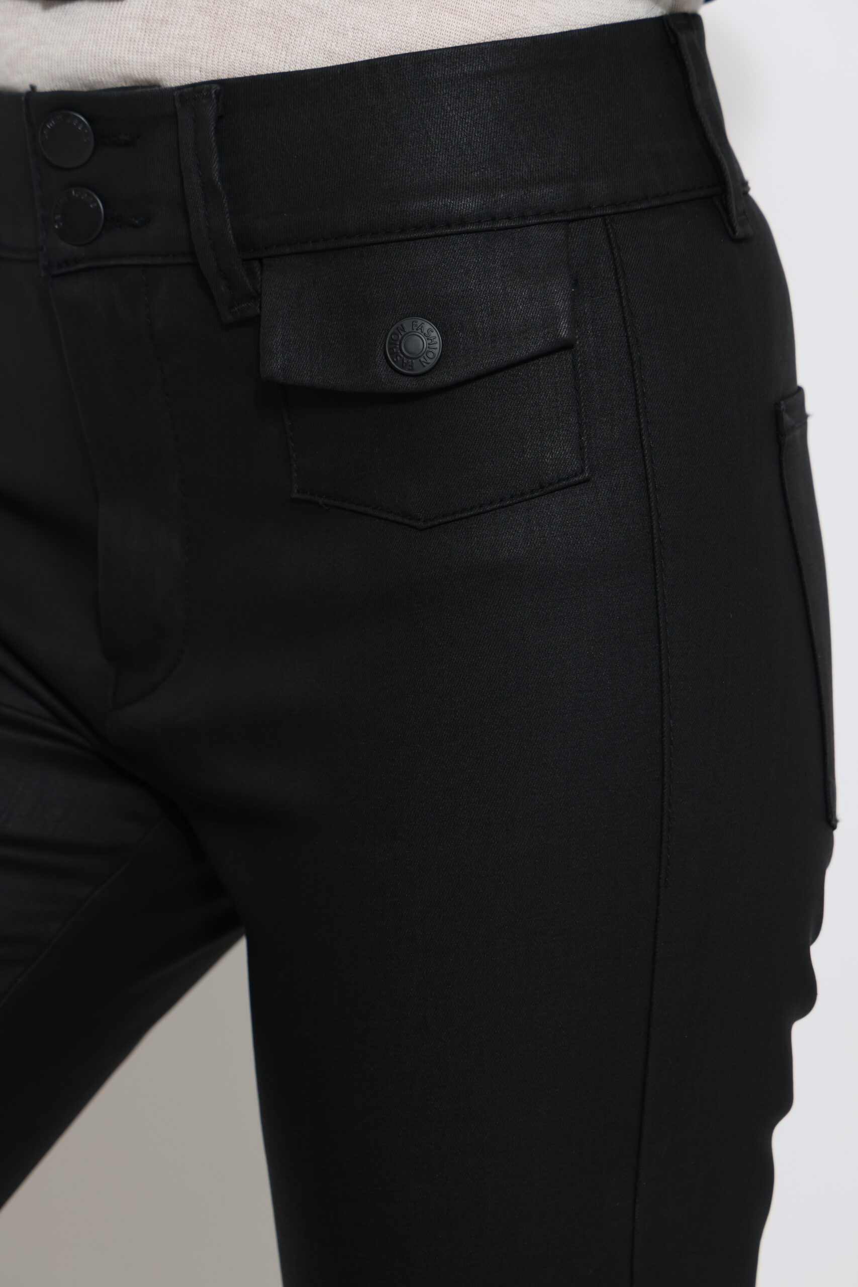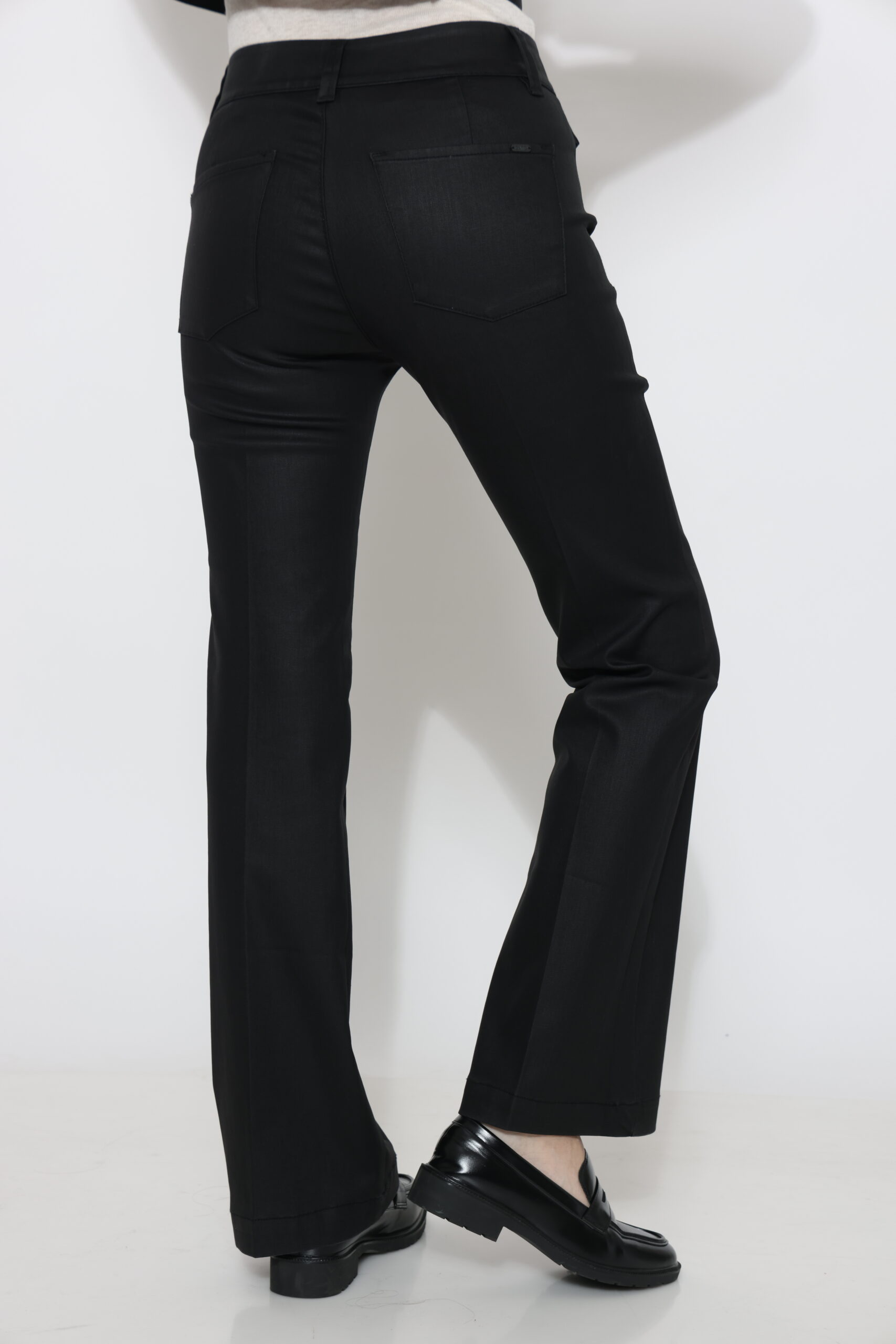 מכנס שחור מבד מראה מט עם לייקרה בגיזרת פלייר ארוכה עם כיסים קטנים קדמיים