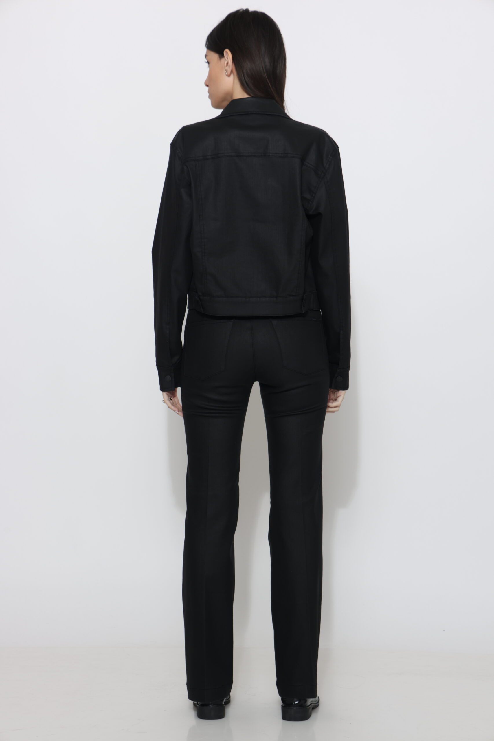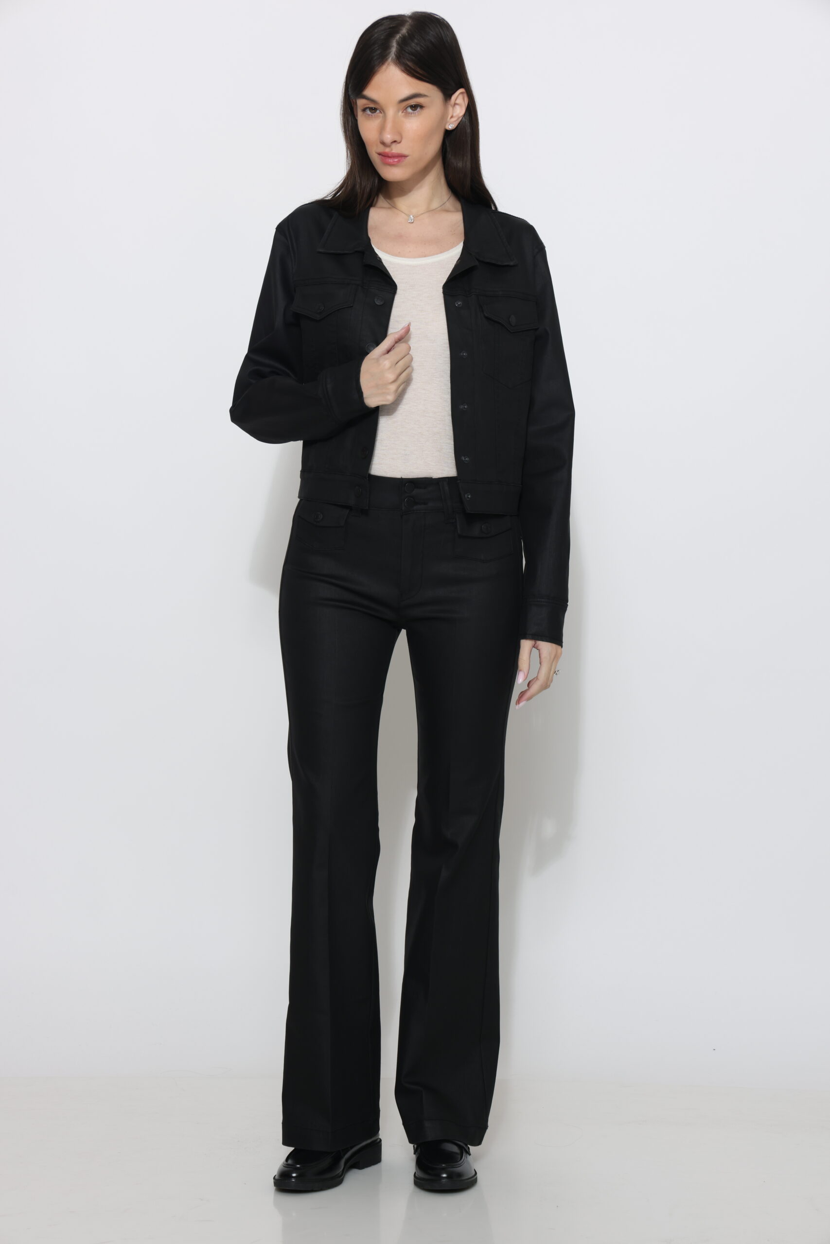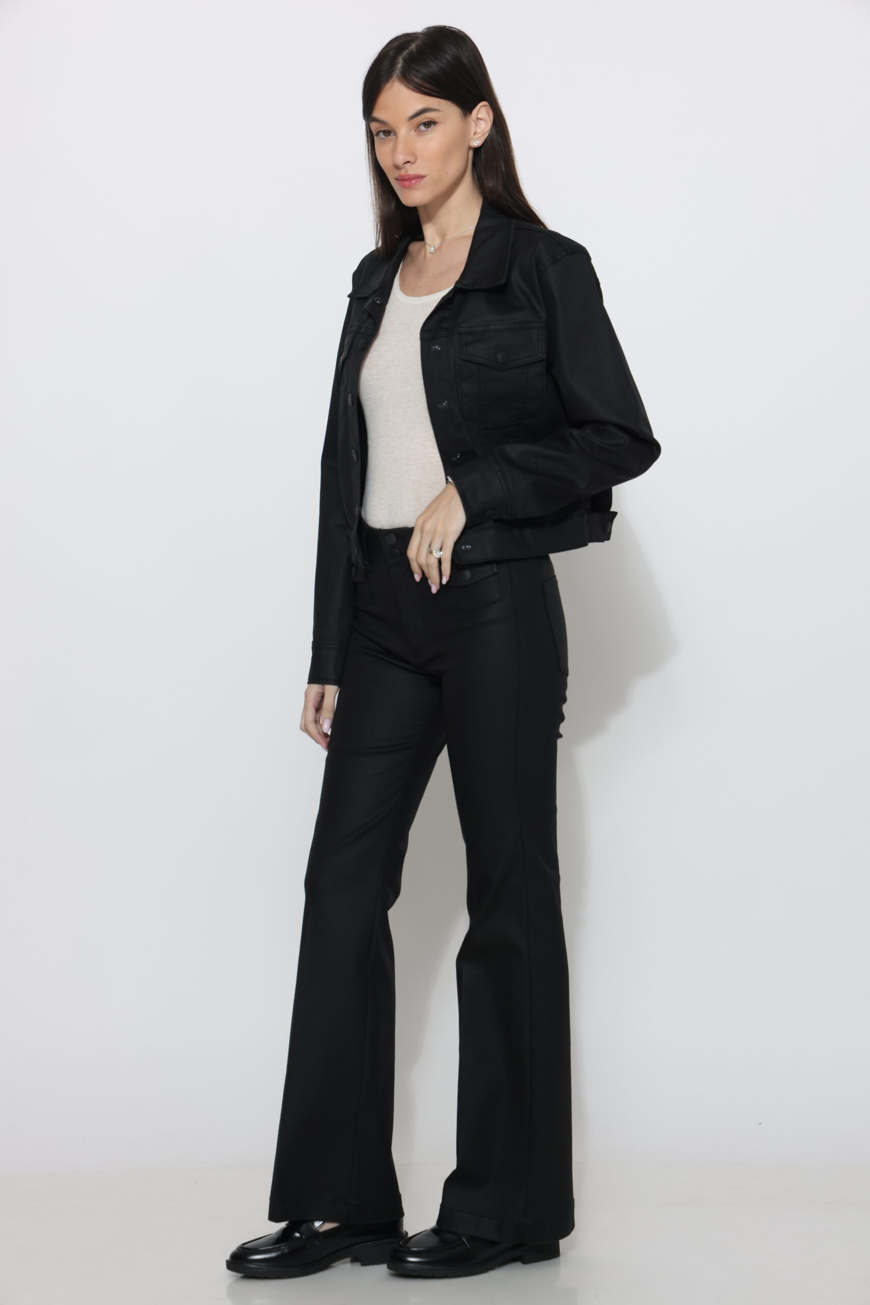 מכנס שחור מבד מראה מט עם לייקרה בגיזרת פלייר ארוכה עם כיסים קטנים קדמיים