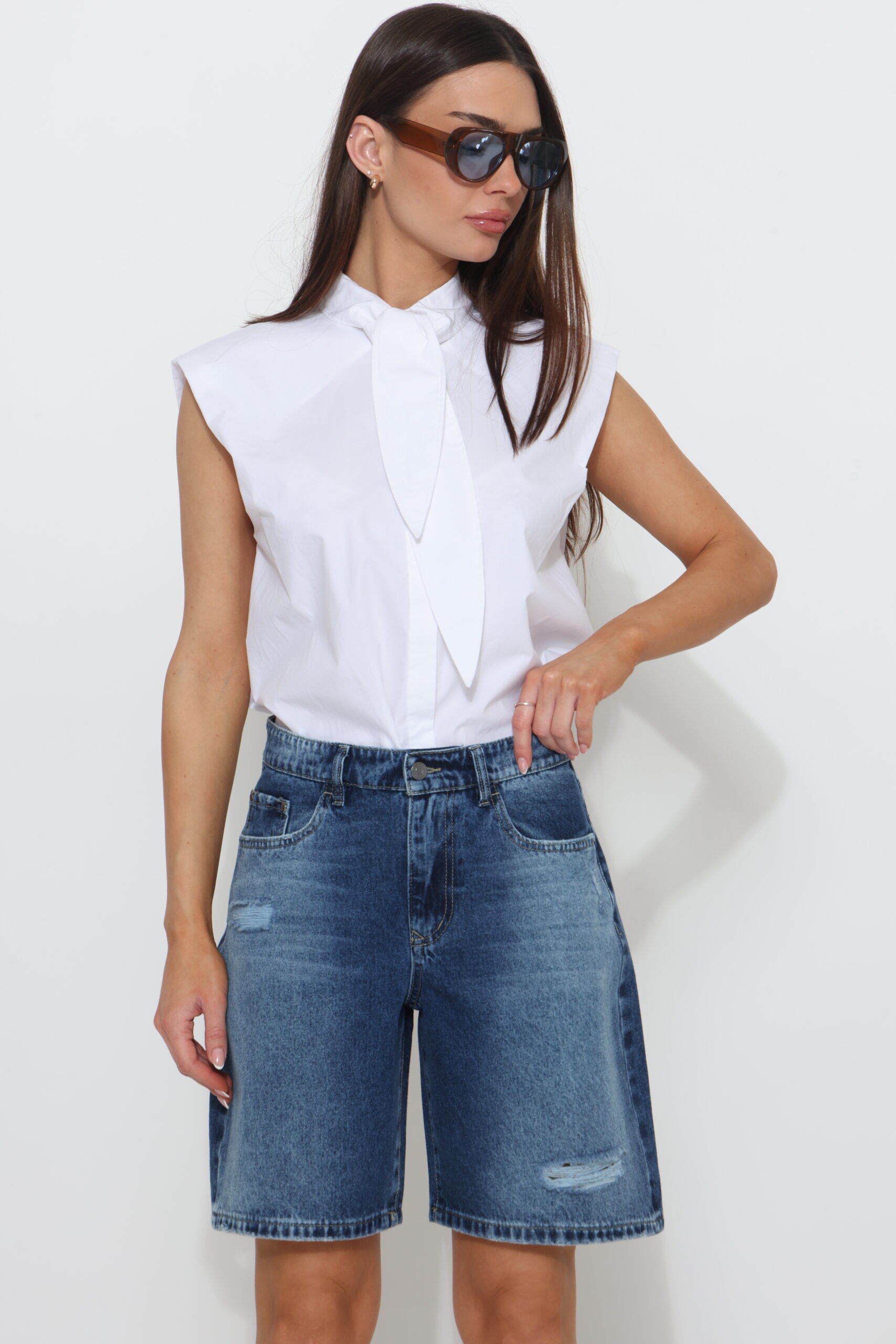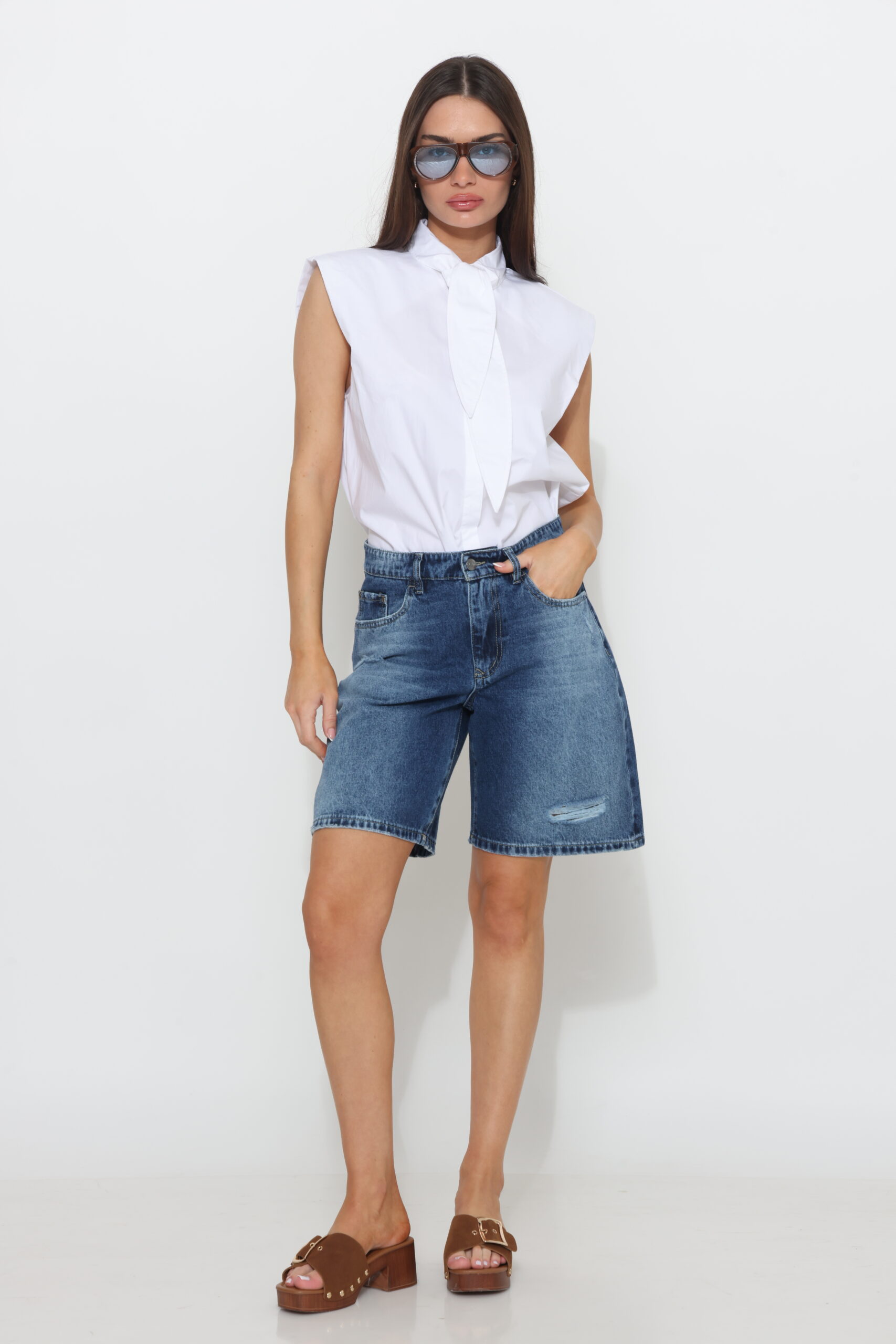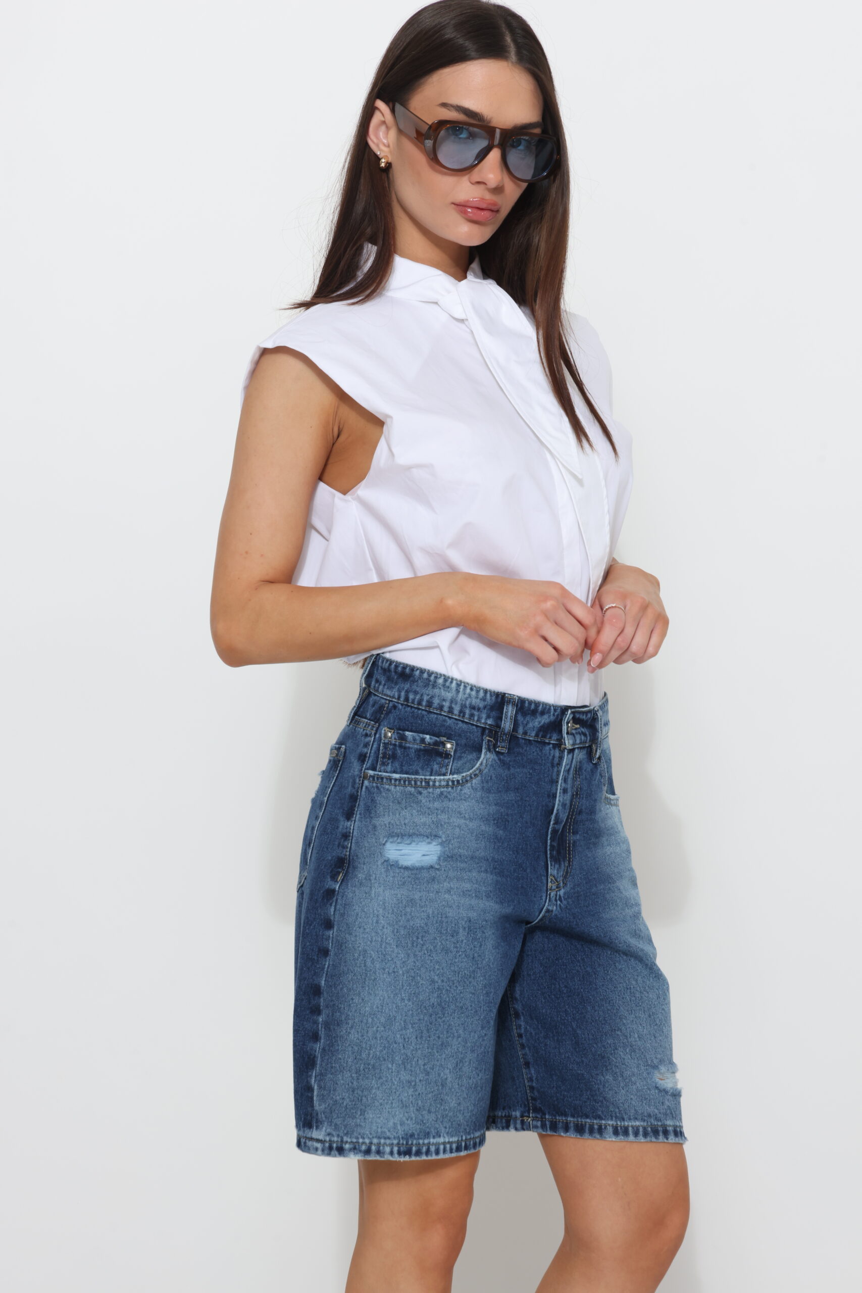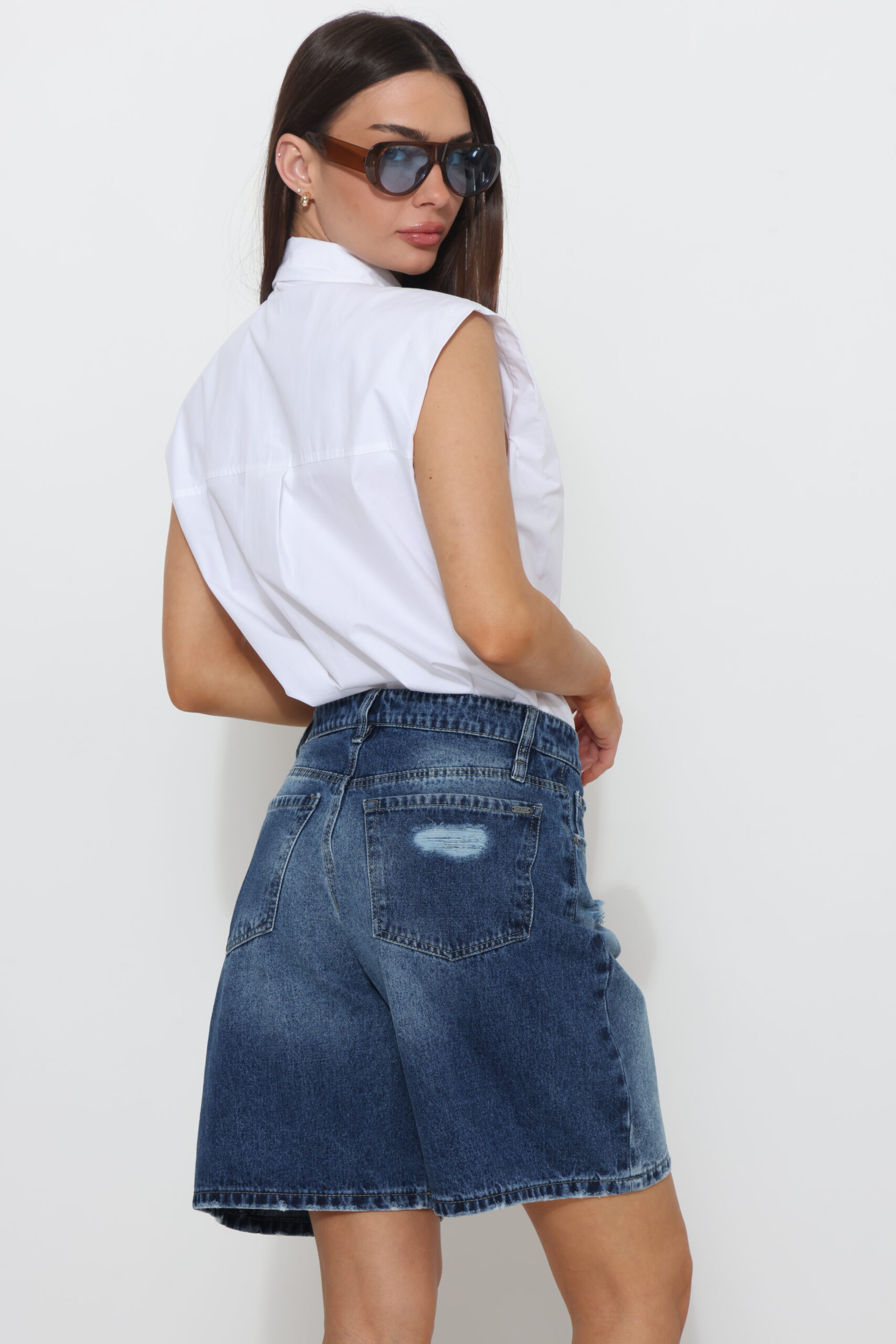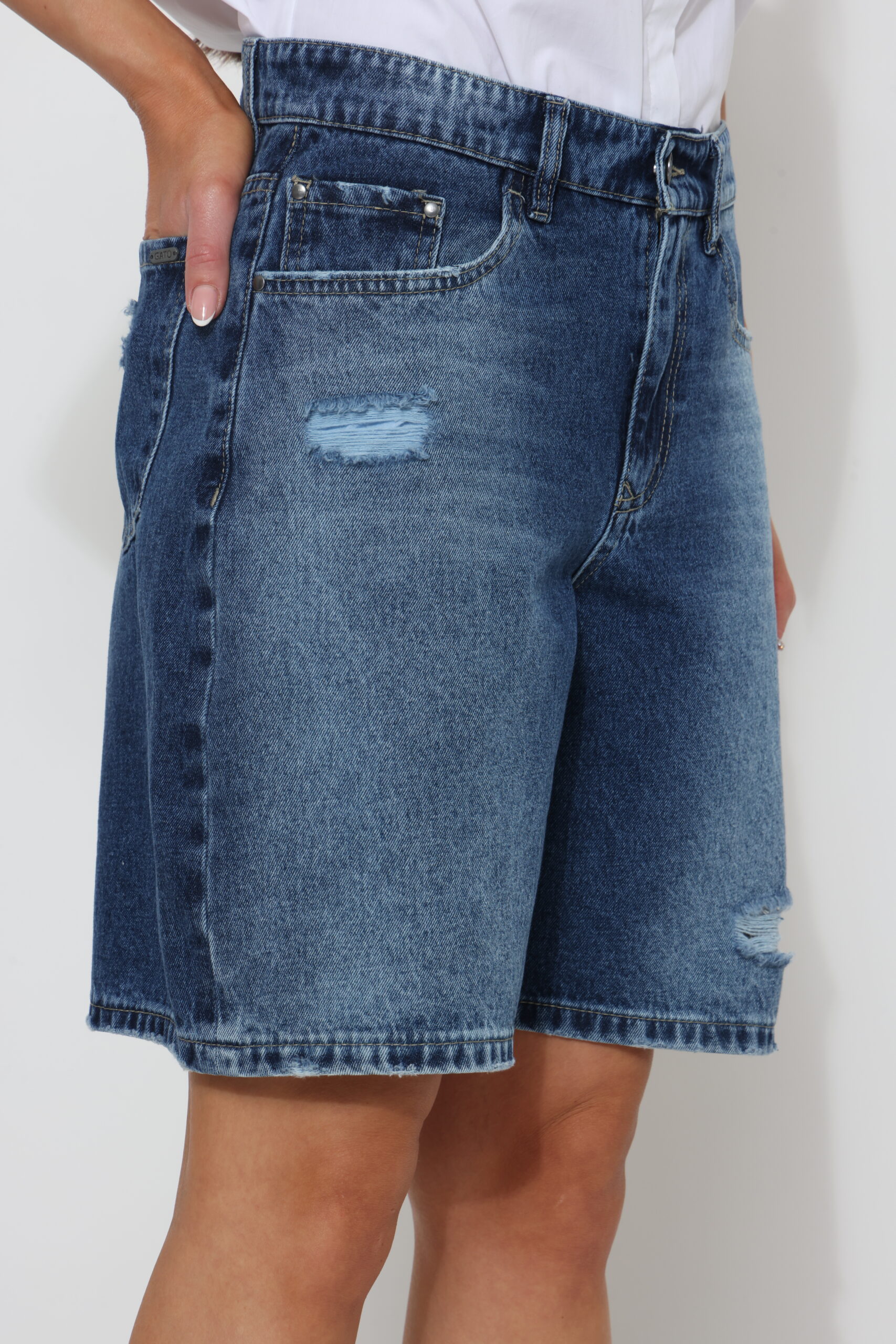 גינס ללא לייקרה אורך מעל הברך עם קרעים עדינים וסגירת כפתור