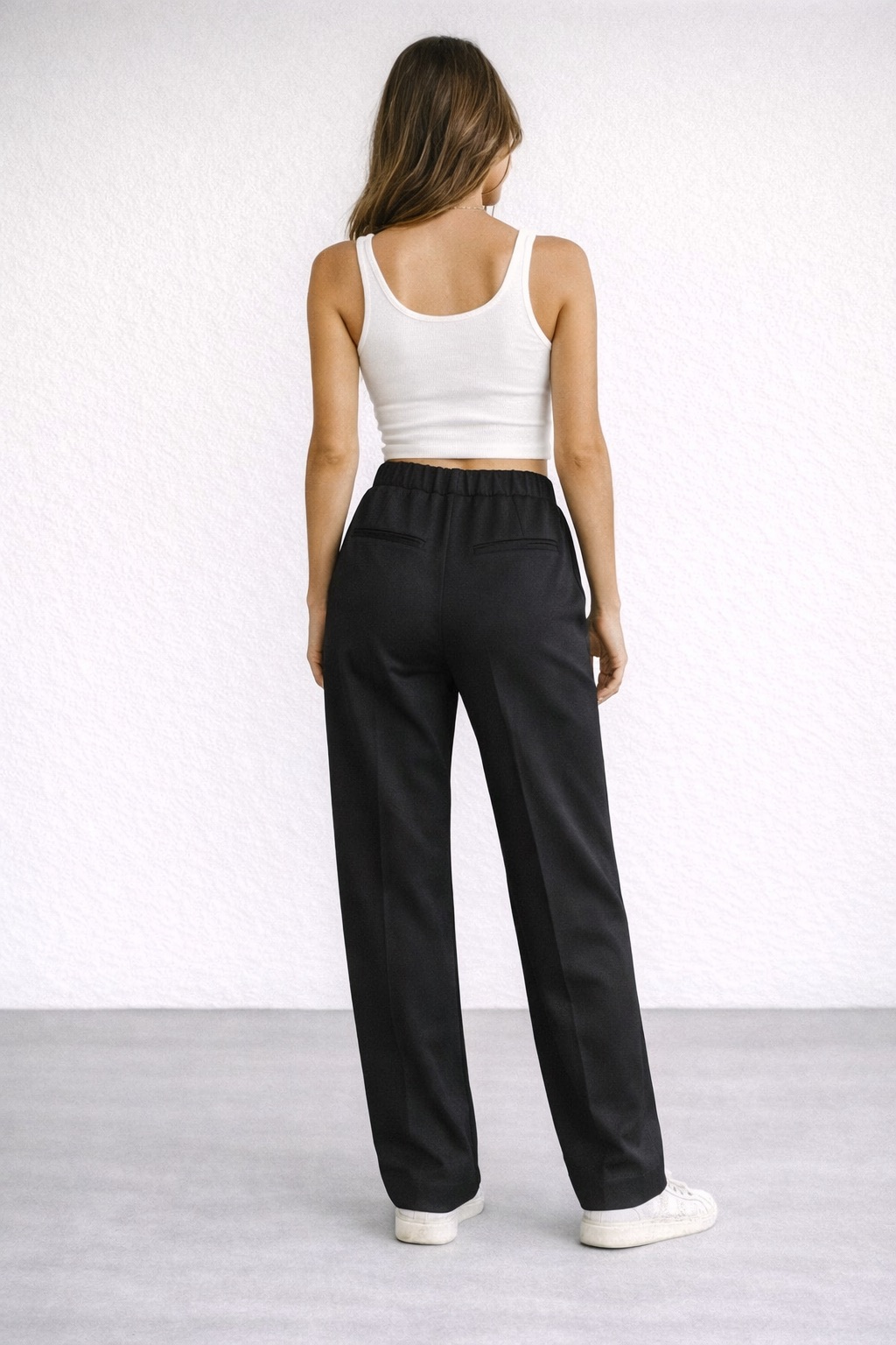 מכנס בגיזרה ישרה מהמותן עם גומי במותן ולייקרה, גזרה משוחררת ונעימה מבד כותנה