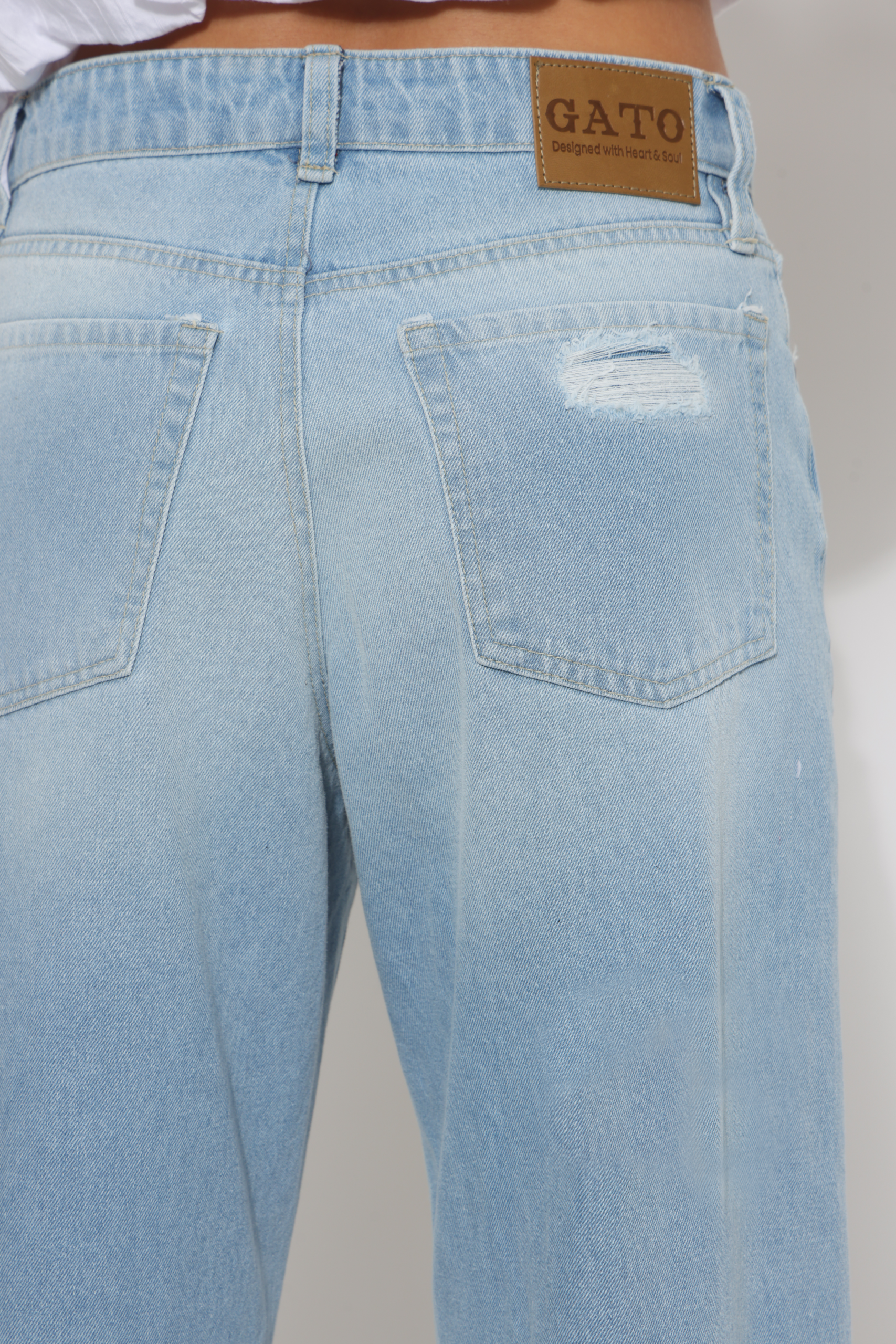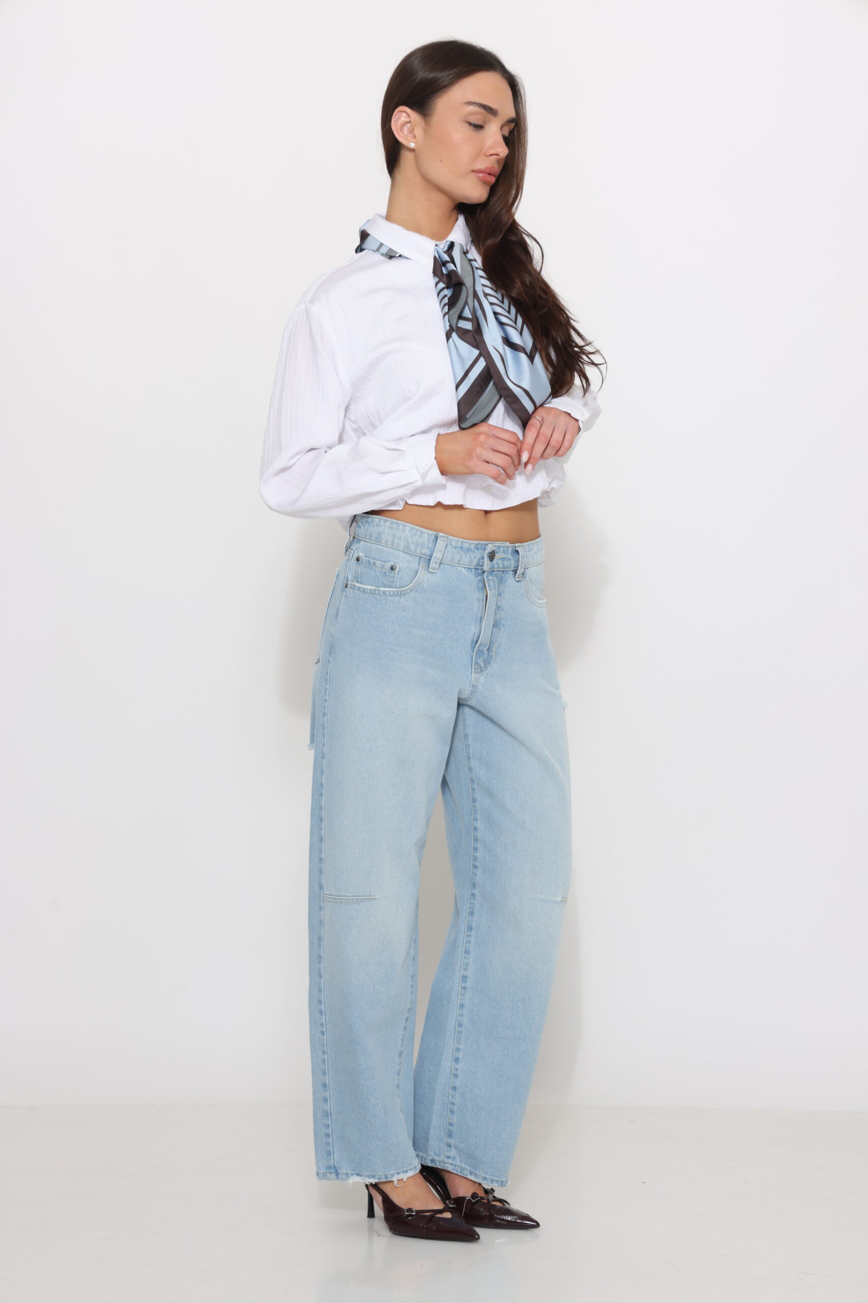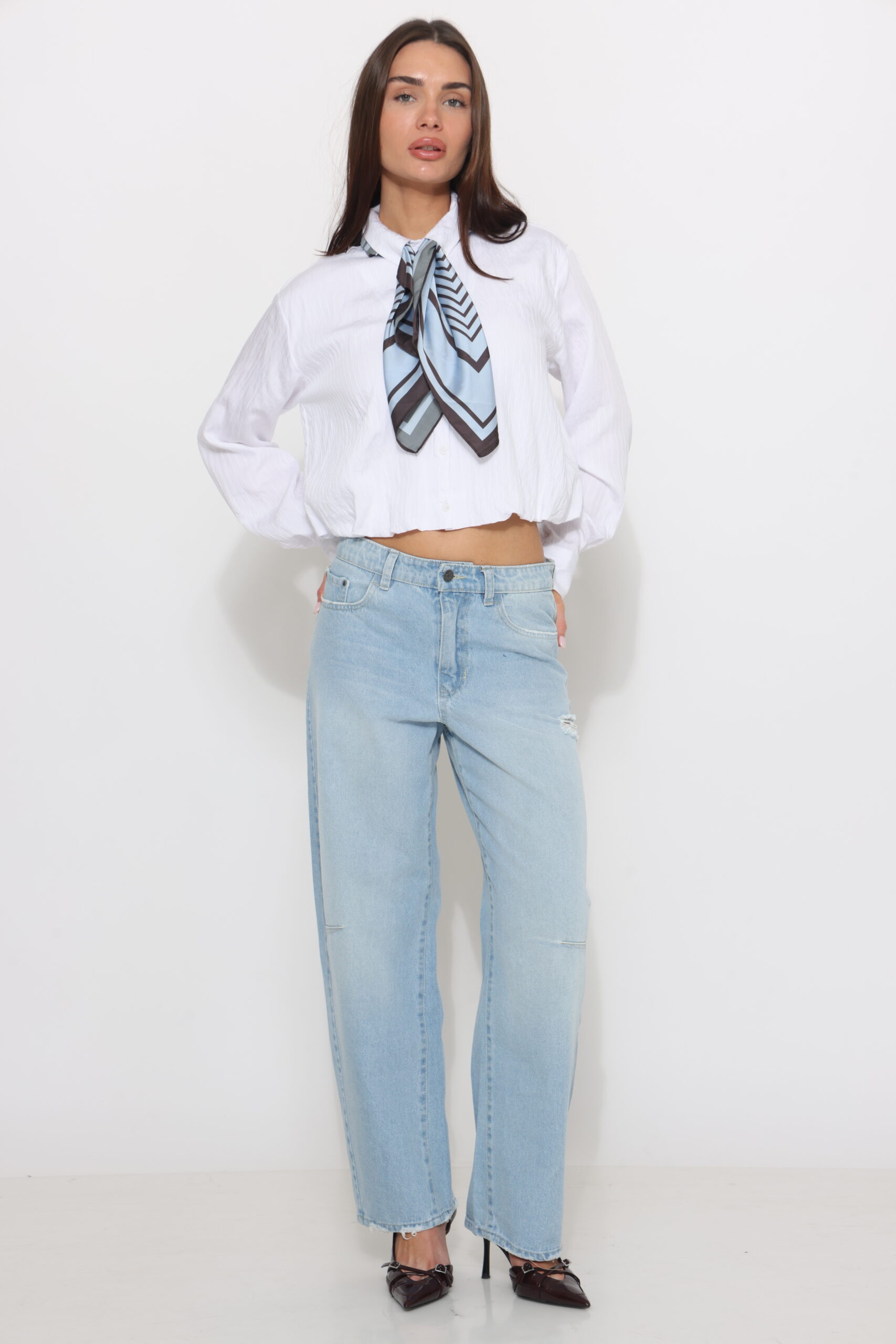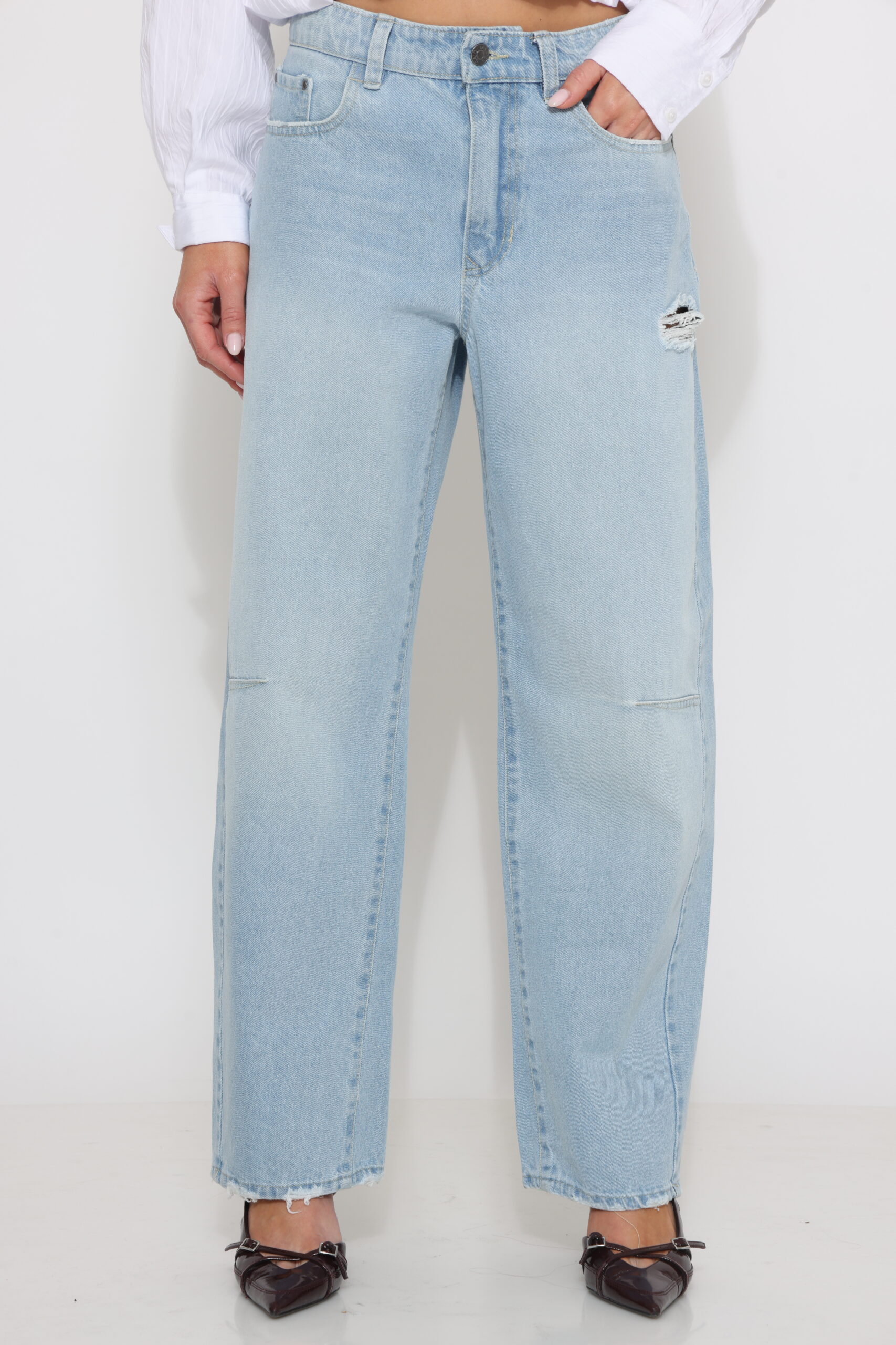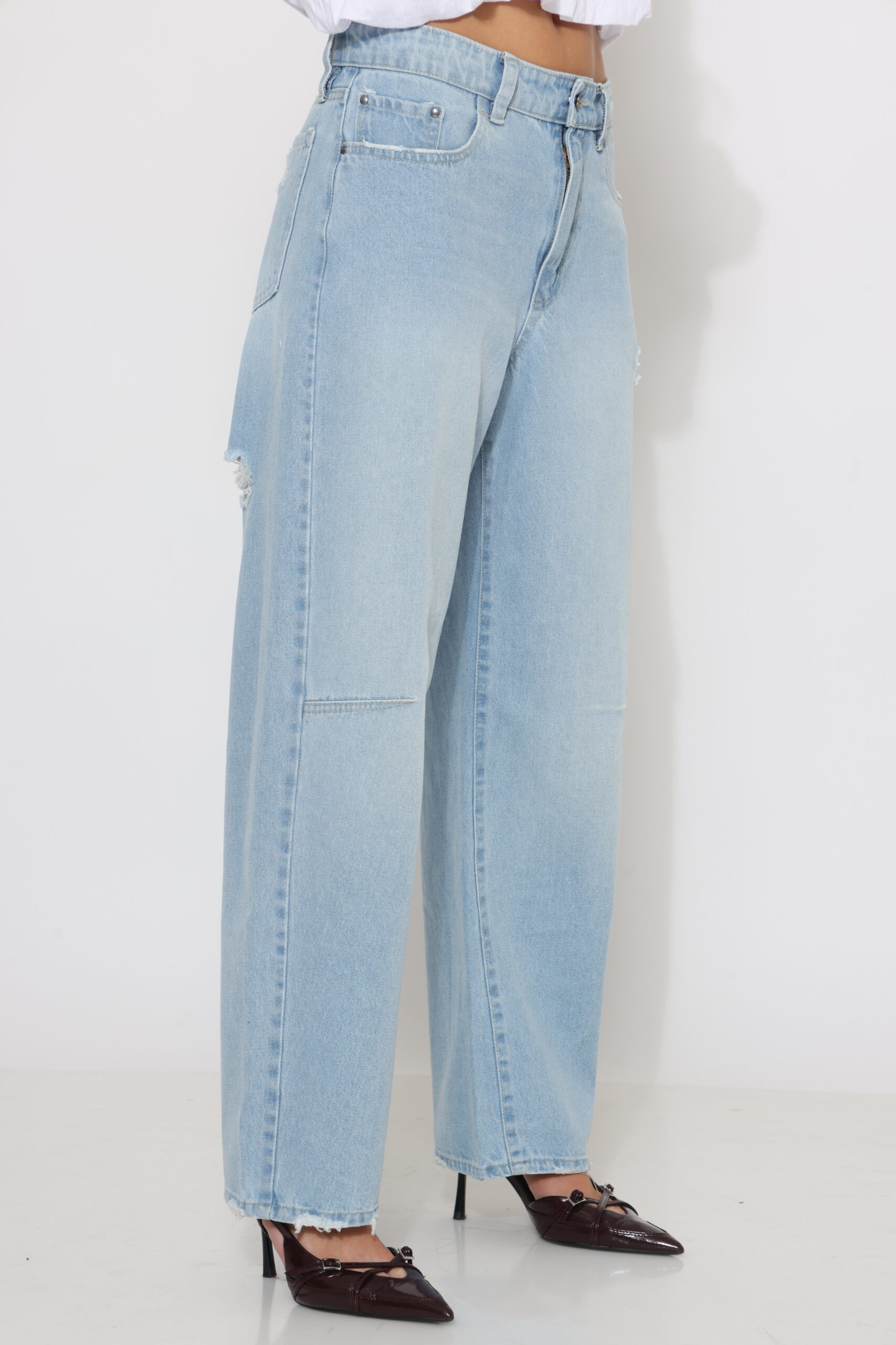 ג׳ינס ללא לייקרה בגזרת בלון עם קרעים עדינים בגוון בהיר