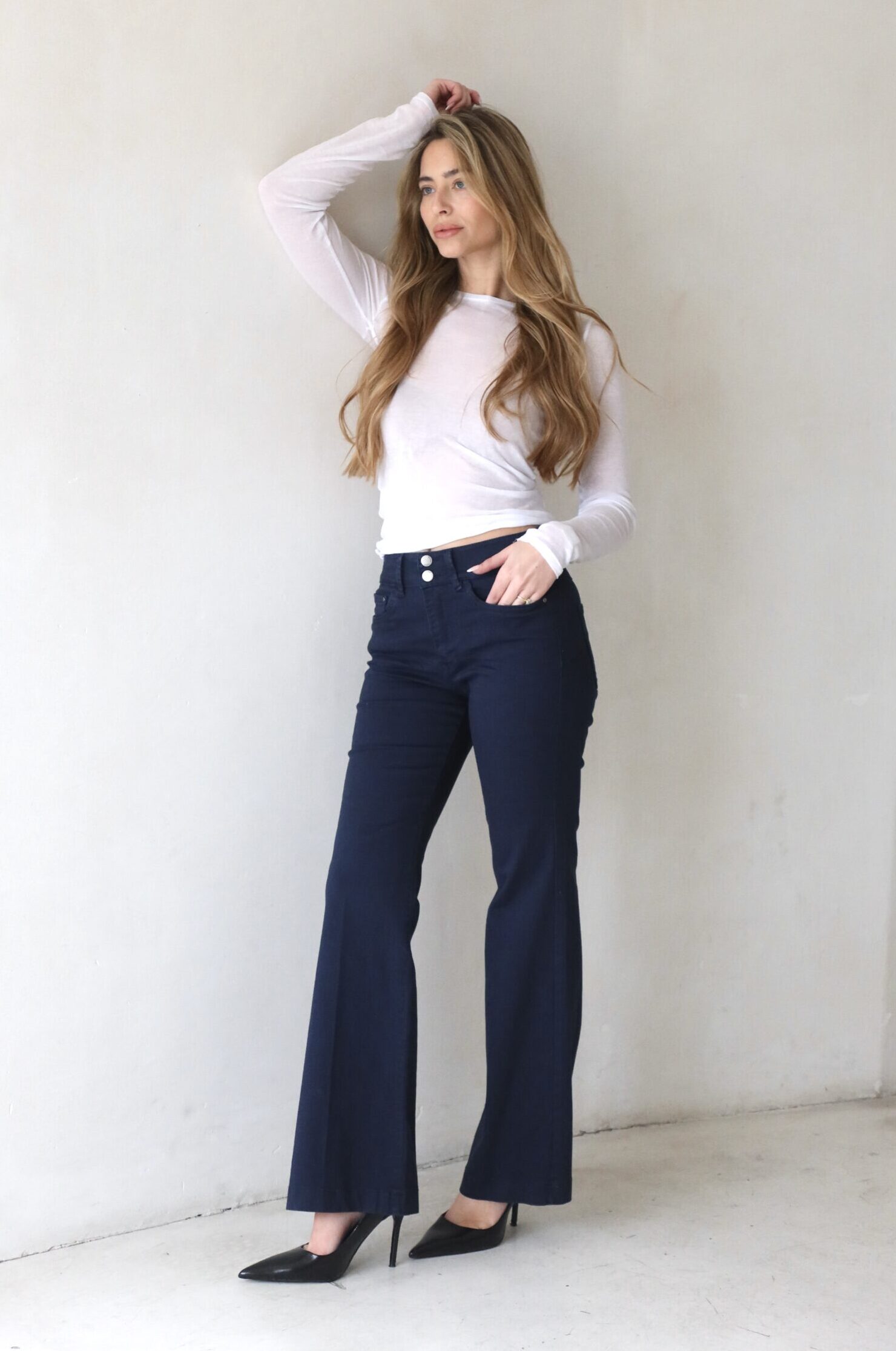 מכנס פלייר ארוך עם שני כפתורים בצבע כחול נייבי עם לייקרה