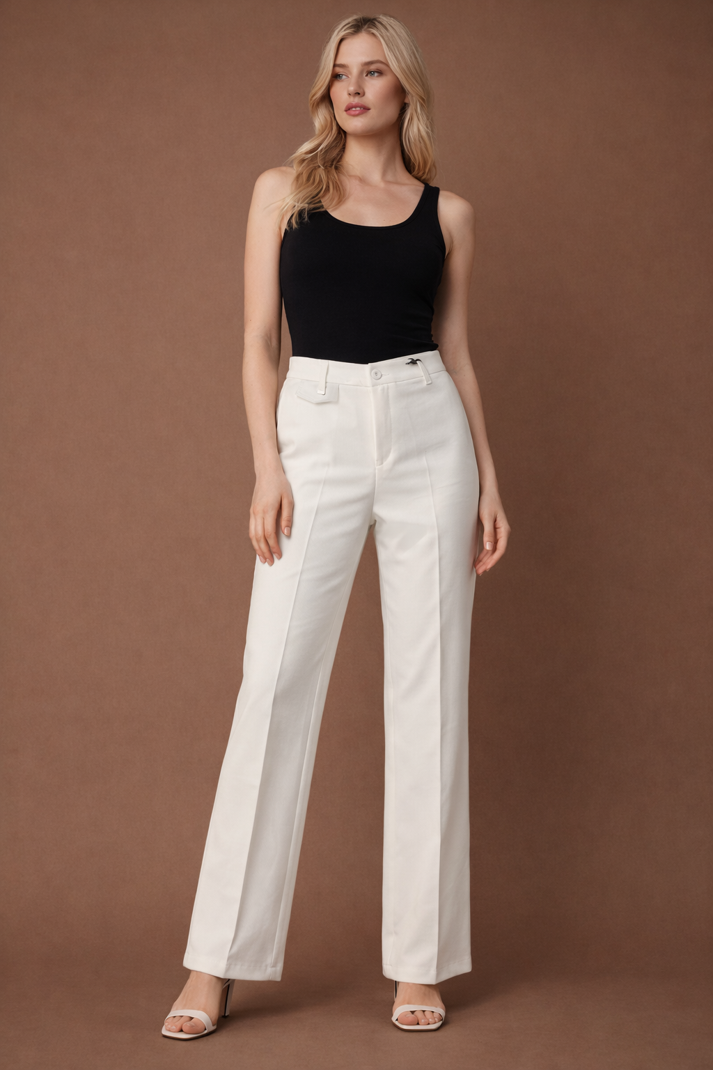 מכנס אלגנט בגיזרה ישרה עם טקסטורת פסים עדינים מאותו הבד, עם כיס קלפה קטן מקדימה