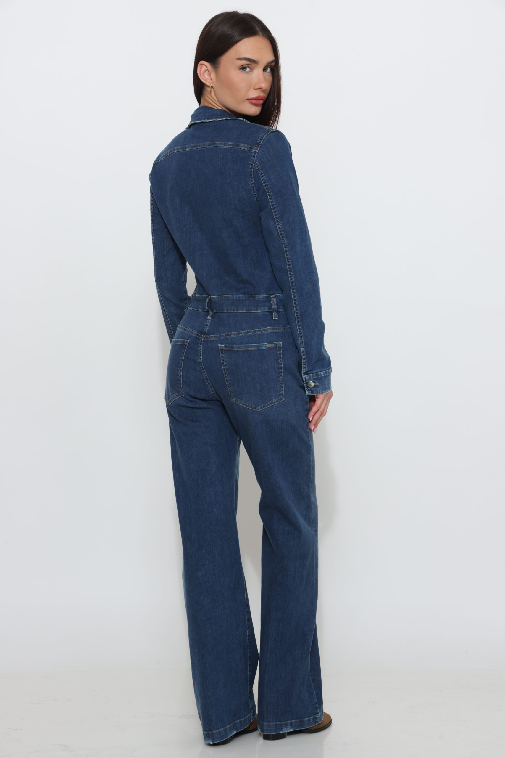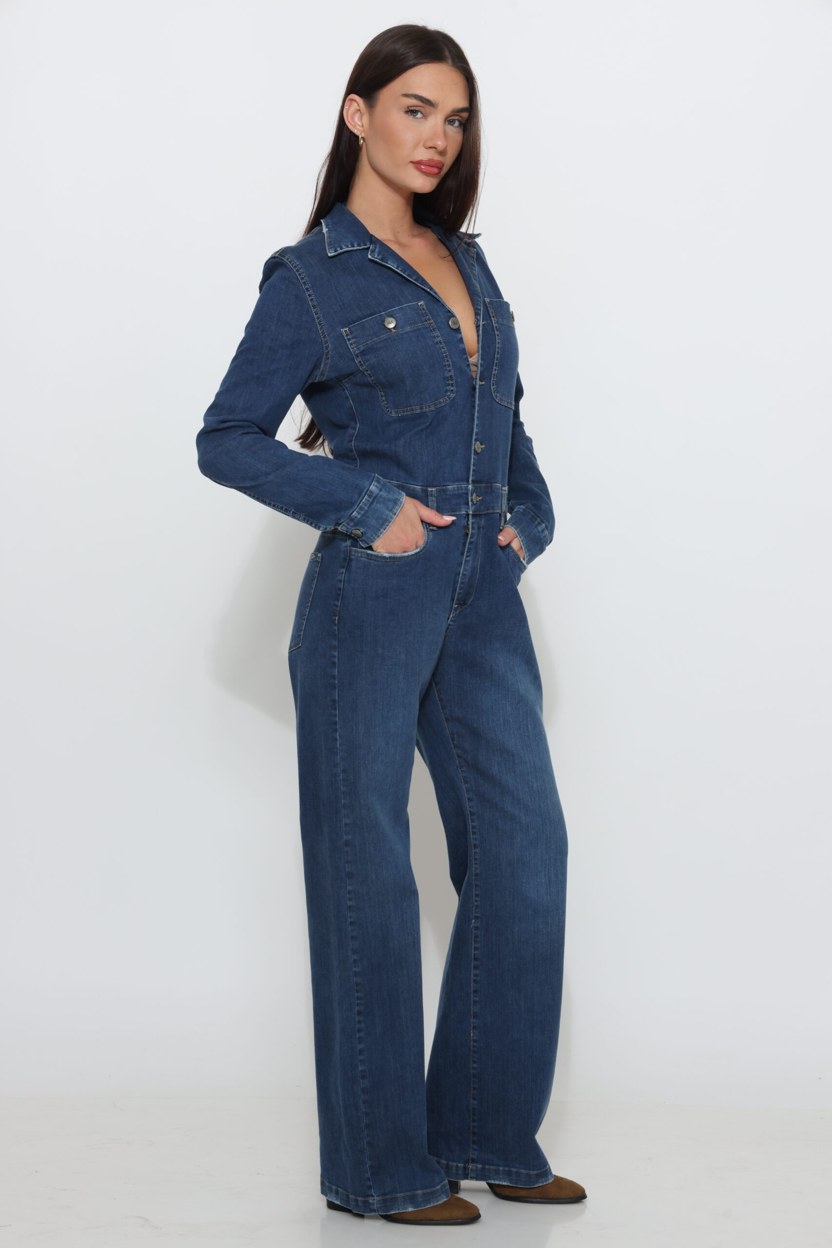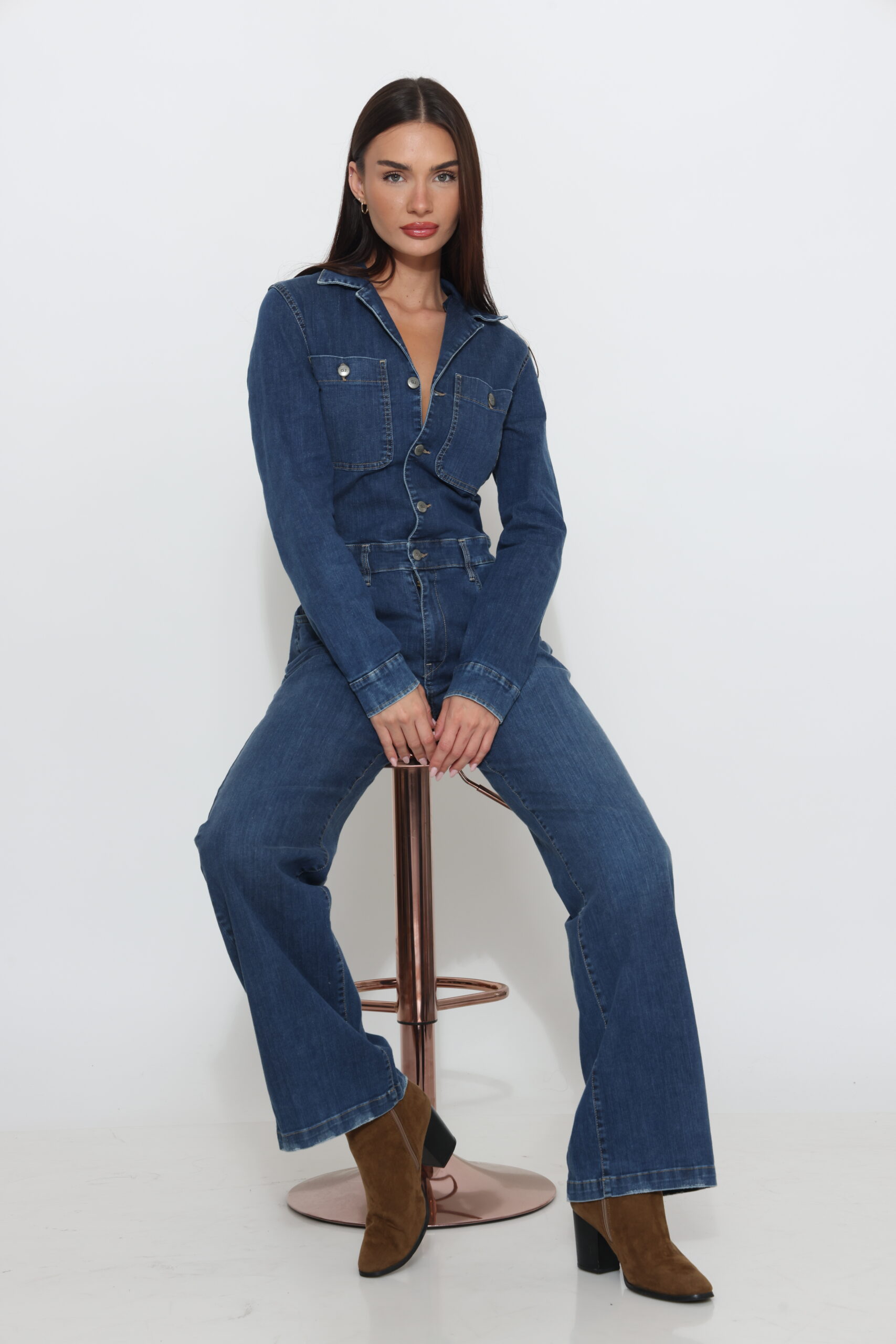 אוברול גינס בגזרת פלייר בגוון אמצע עם לייקרה