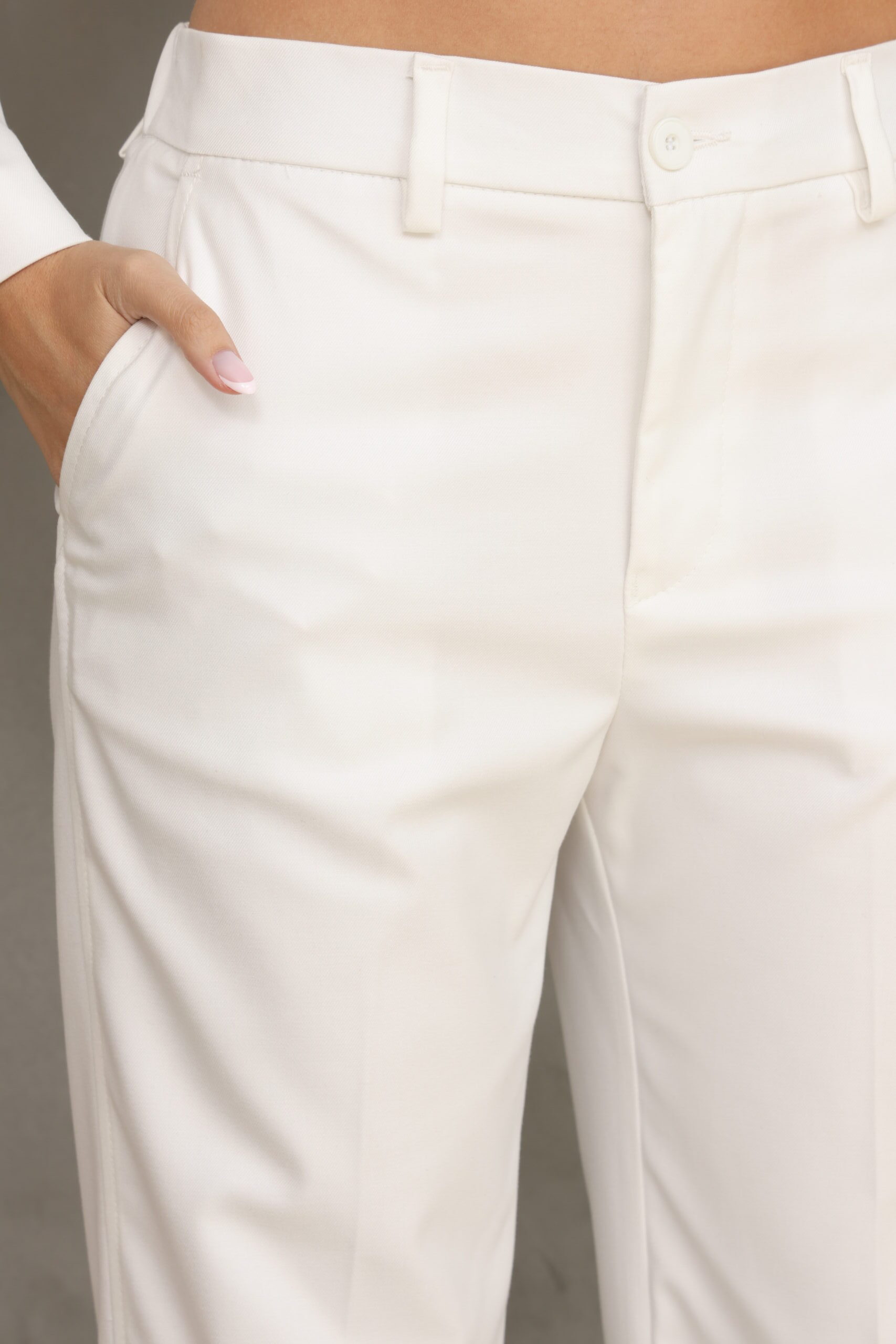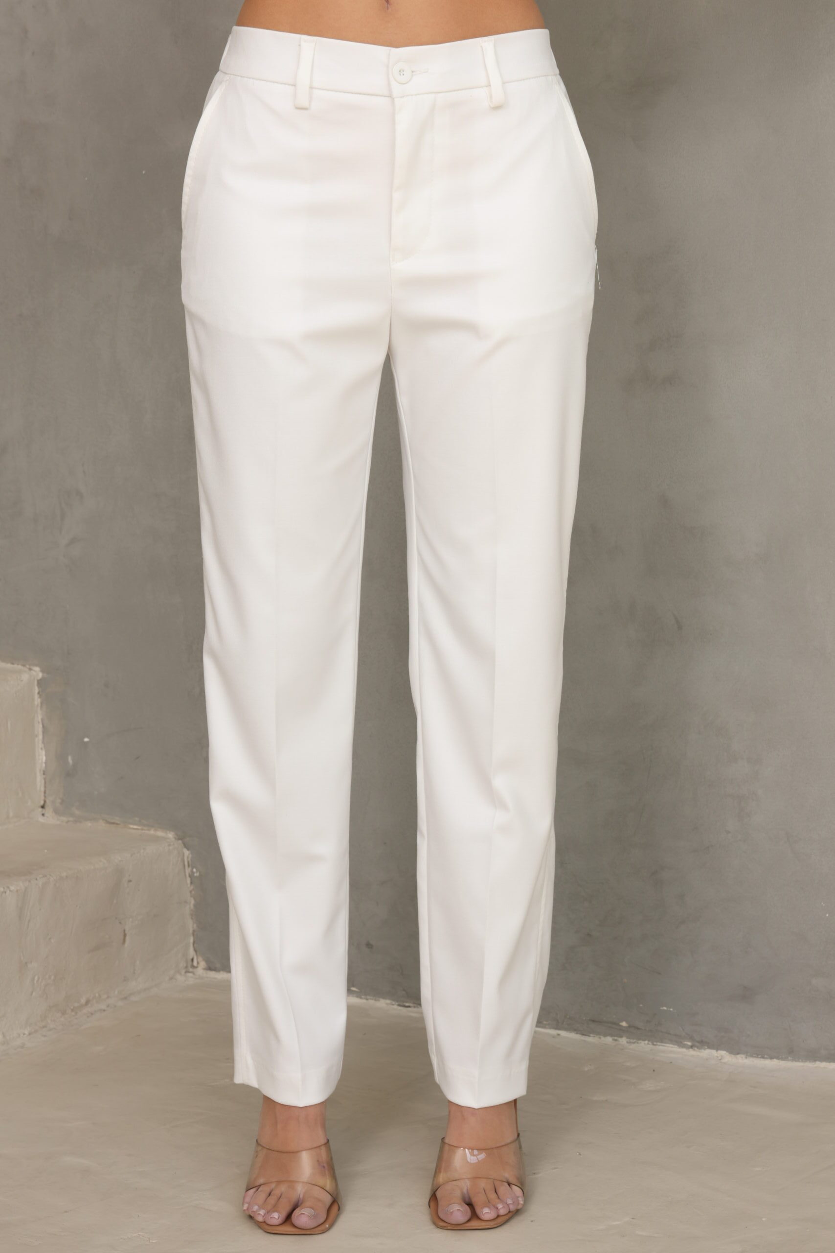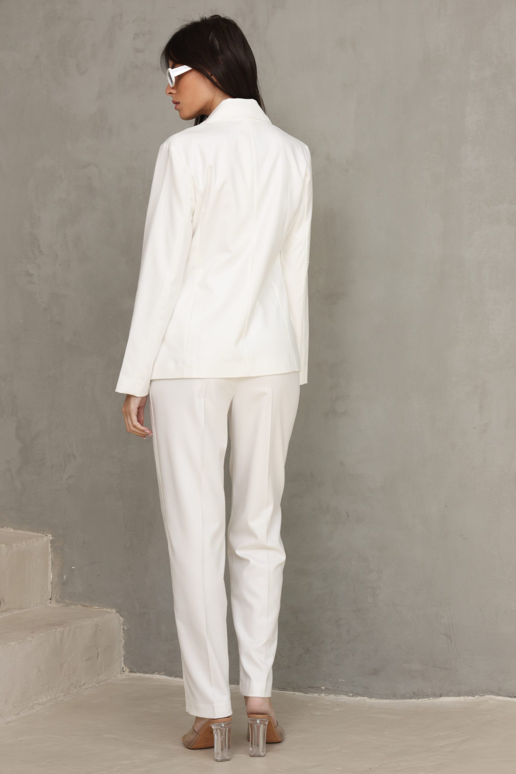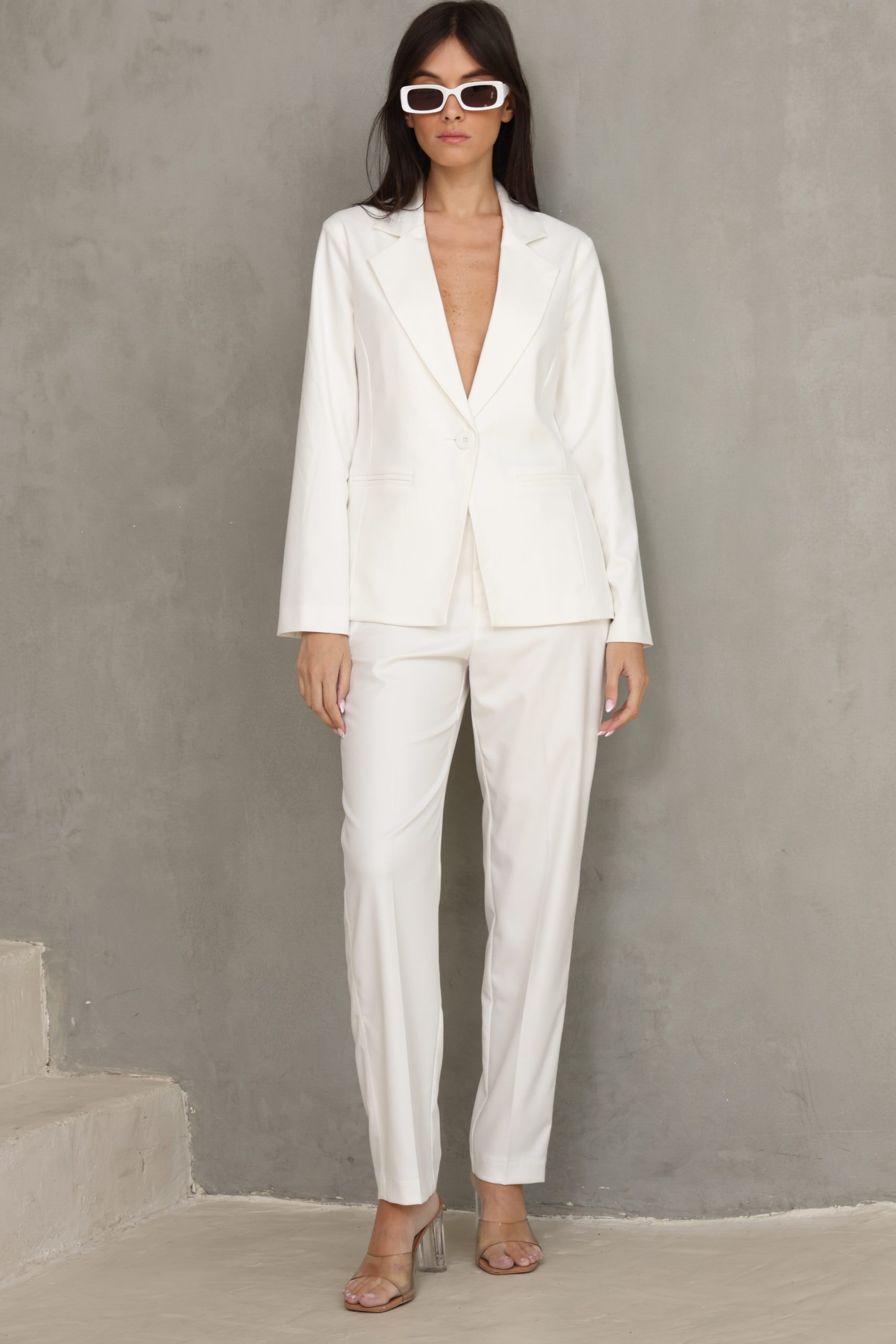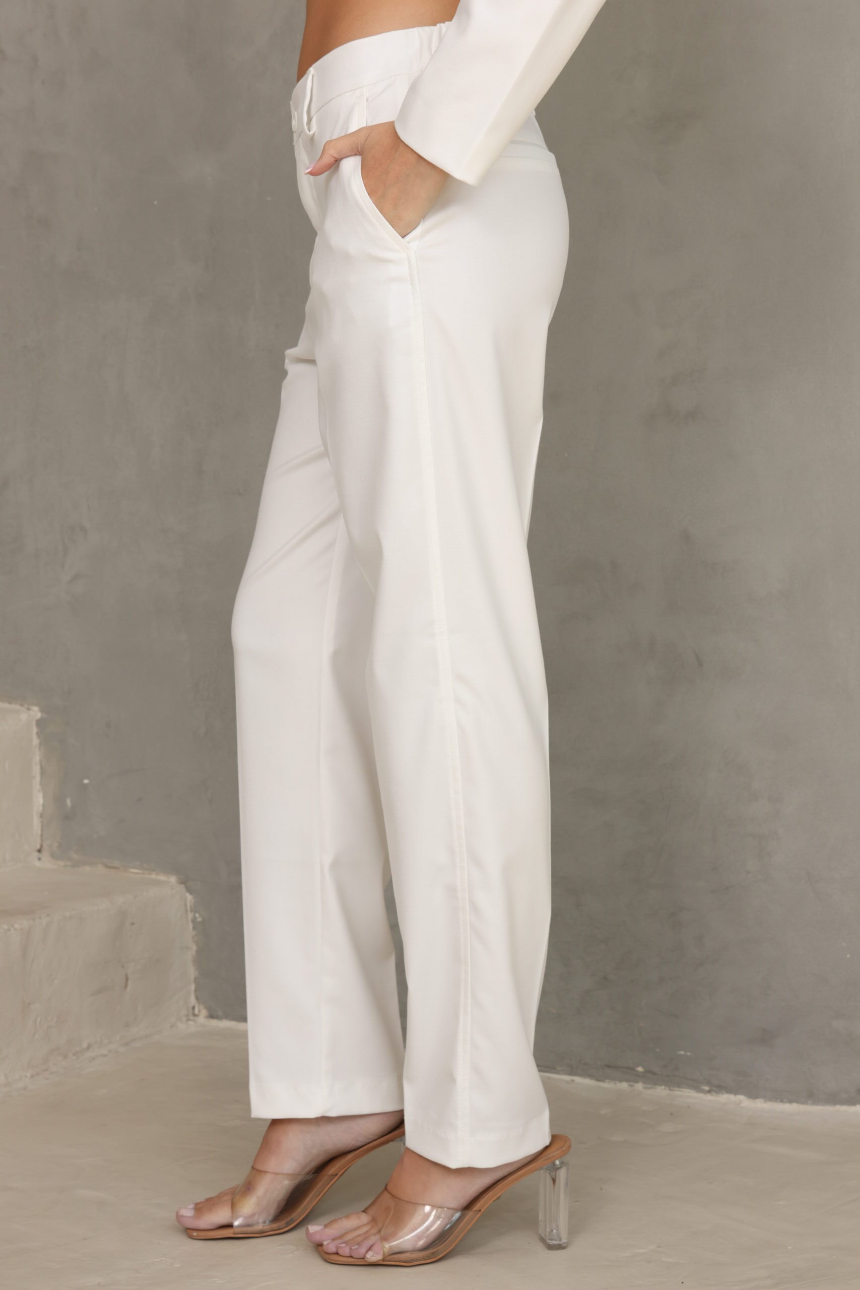 מכנס מחוייט בגיזרה ישרה כפתור ופס בצידי המכנס, מוצר משלים לדגם – בלייזר נייטי לבן