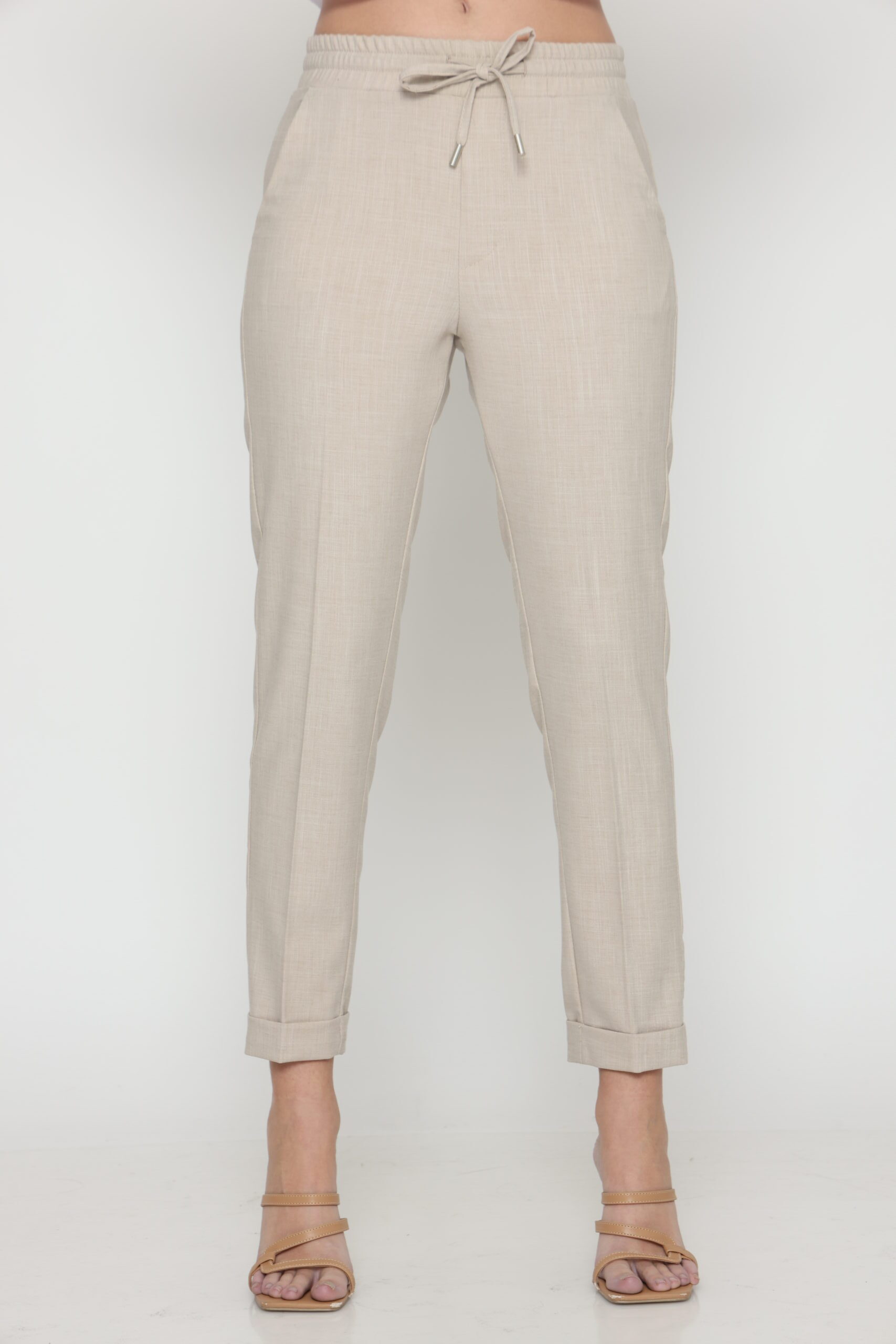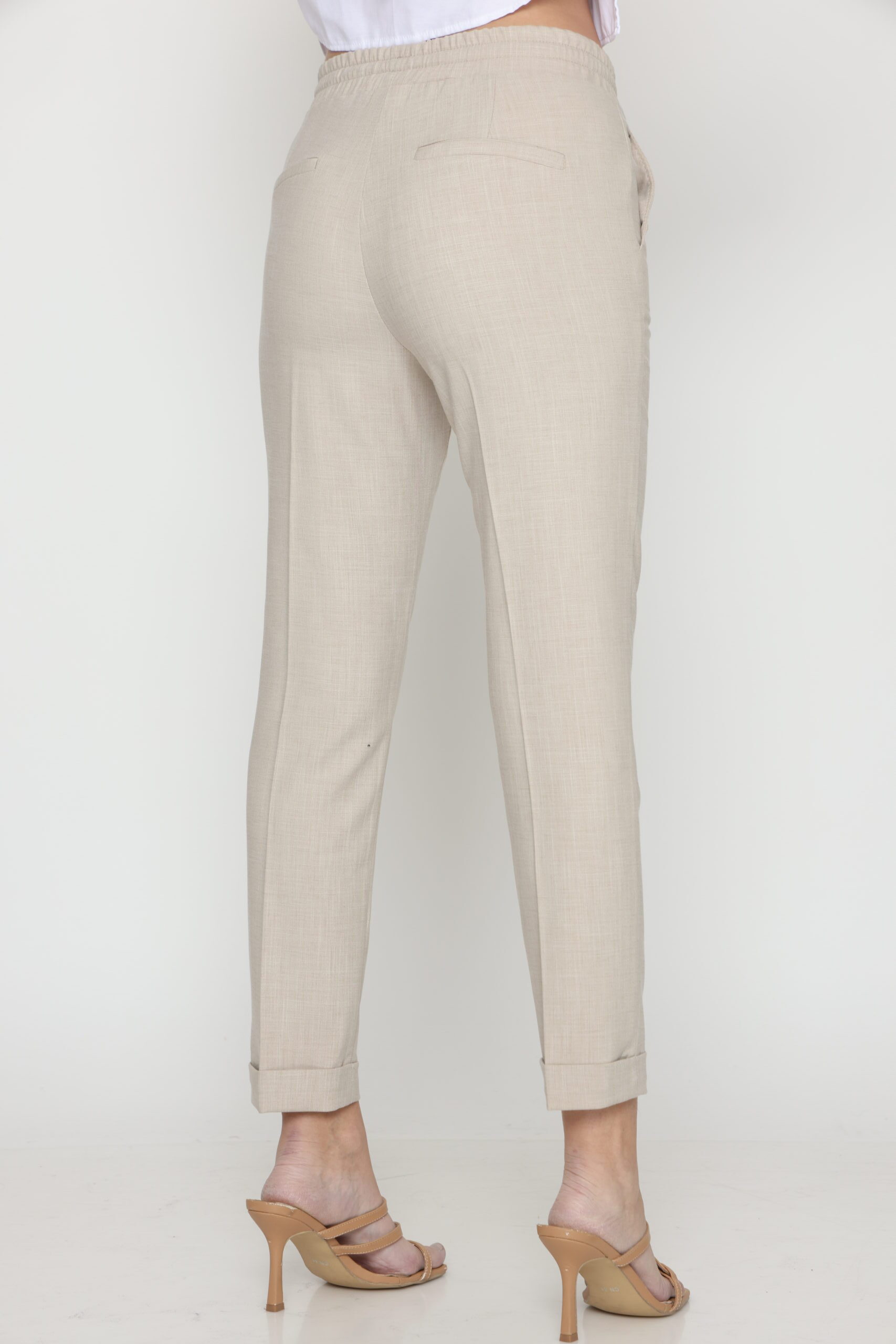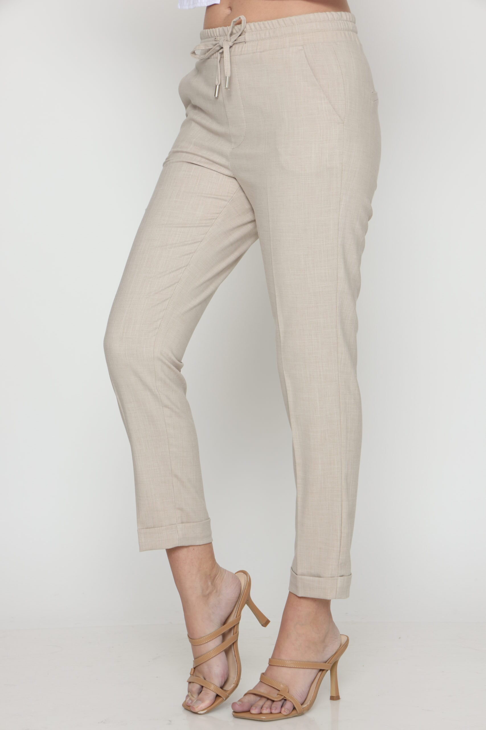 מכנסיים בגזרת לוס מבד במראה פשתן, אורך קרסול עם גומי במותן ושרוך קשירה. קיפול מובנה בסיומת.