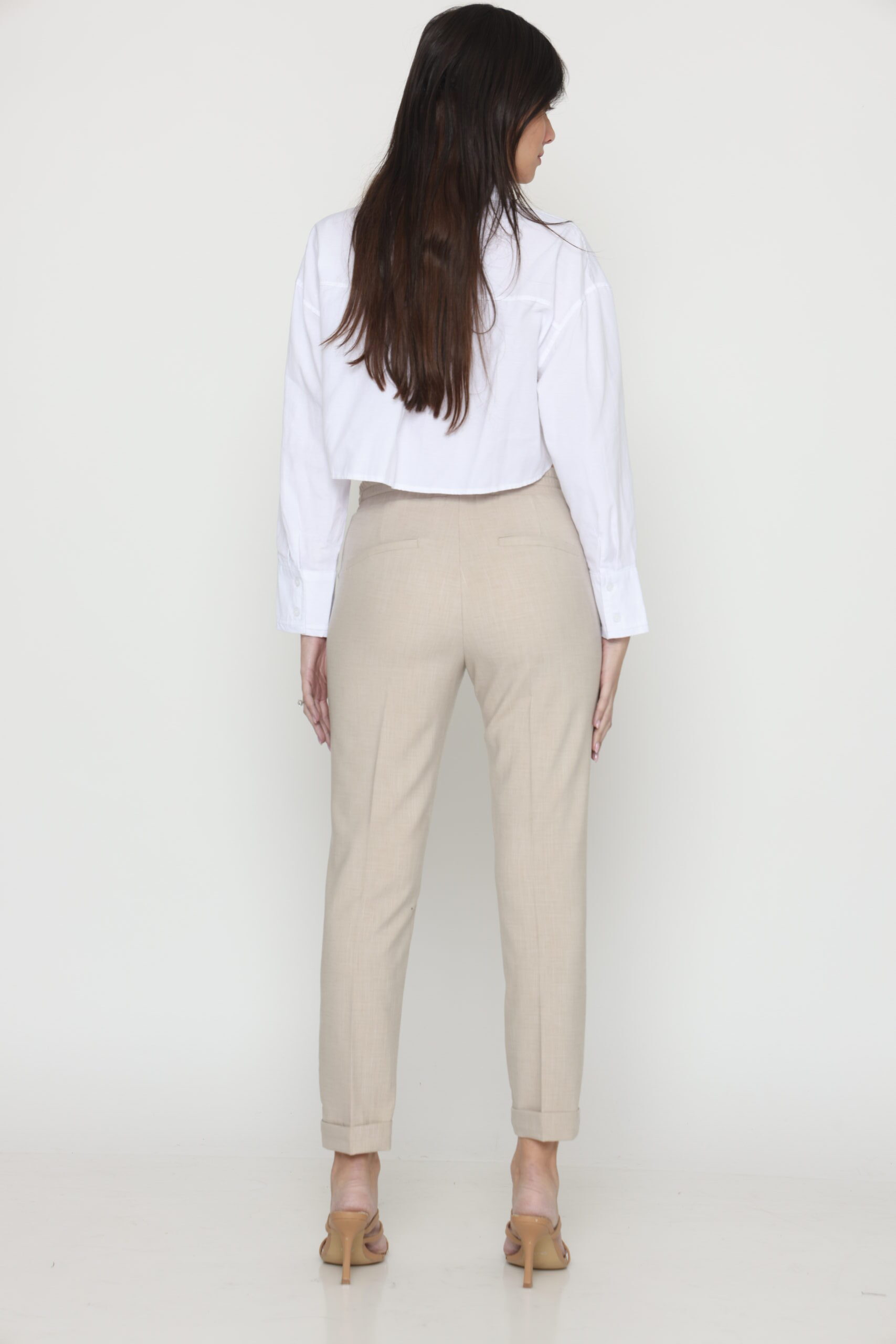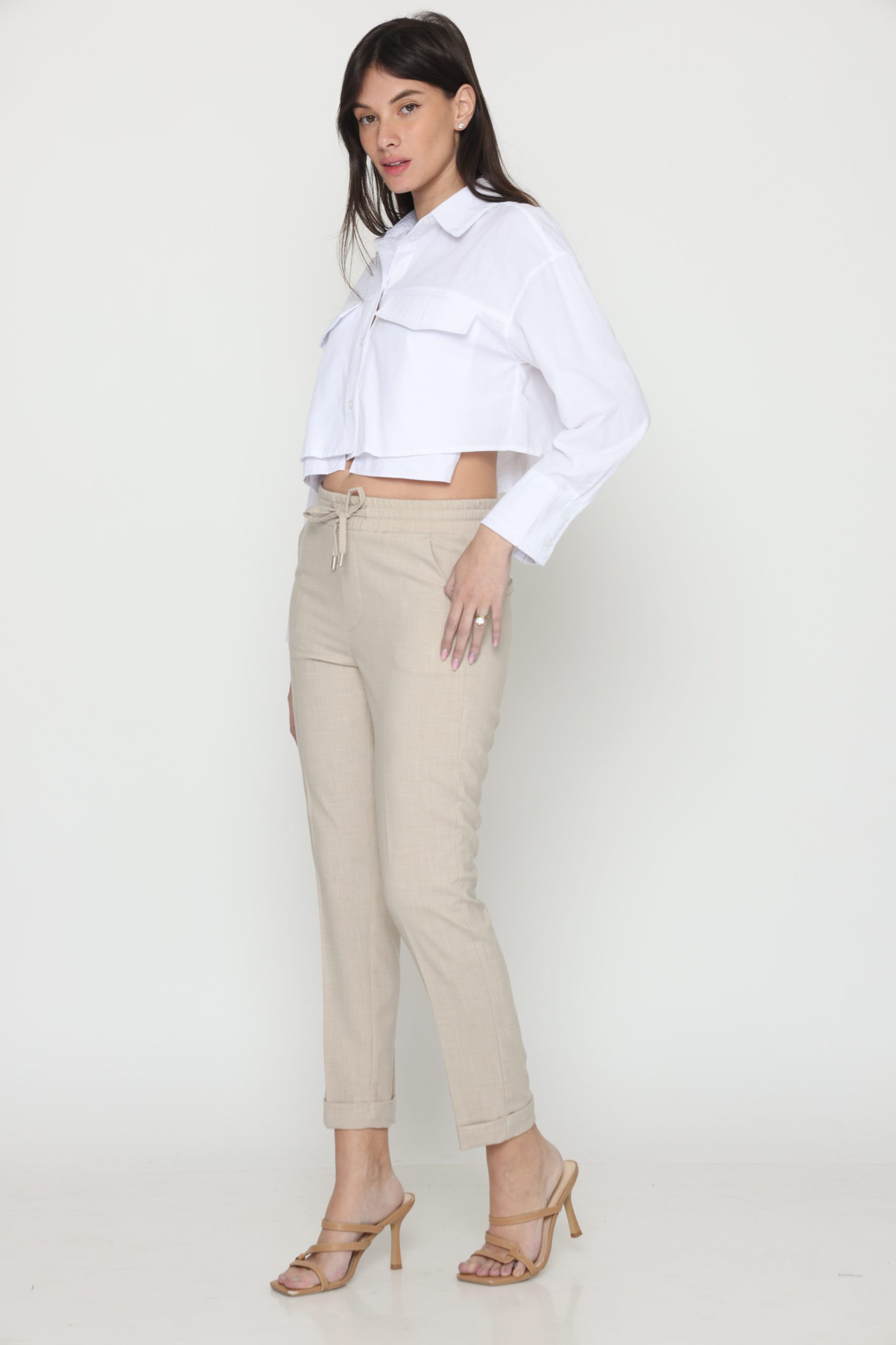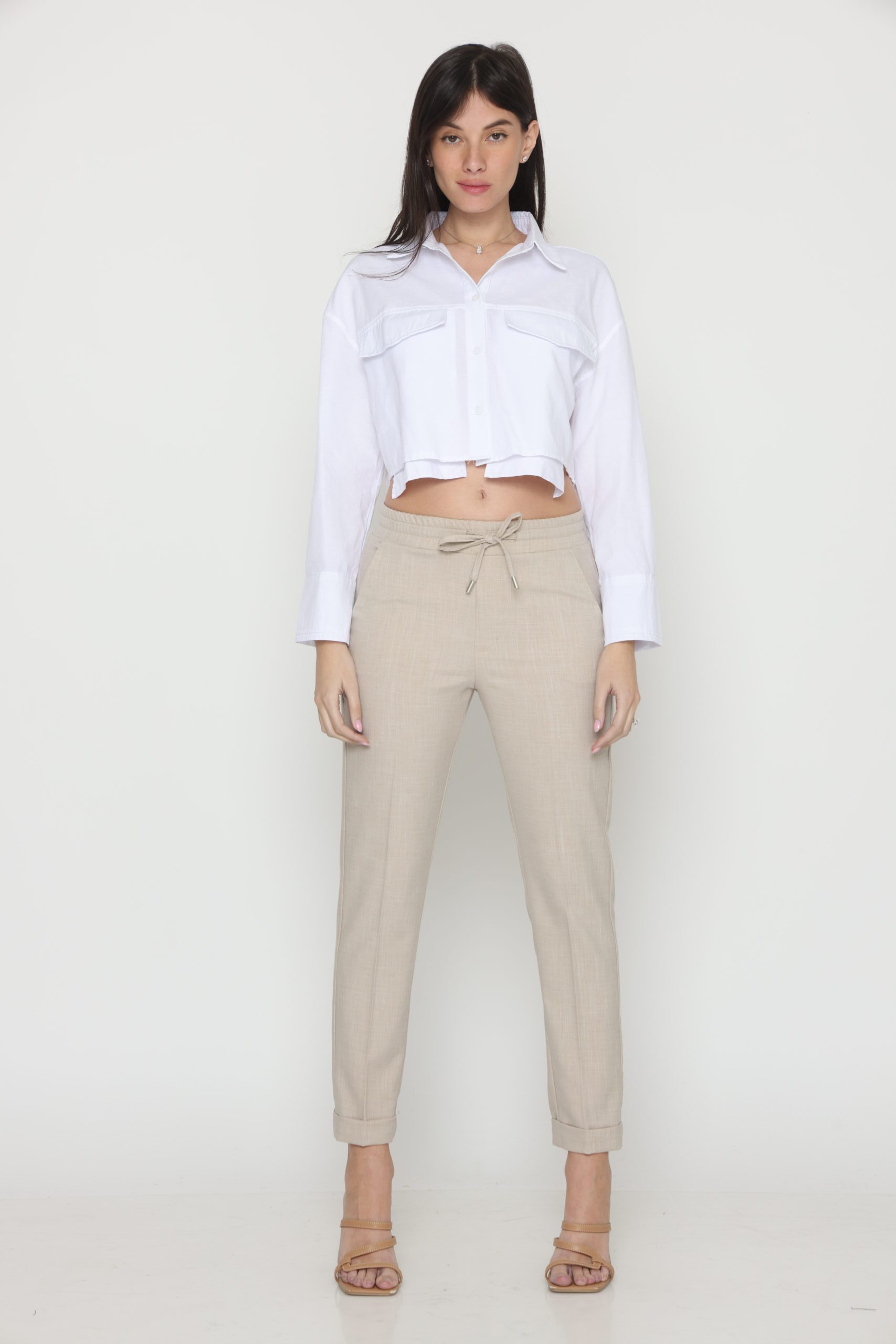 מכנסיים בגזרת לוס מבד במראה פשתן, אורך קרסול עם גומי במותן ושרוך קשירה. קיפול מובנה בסיומת.