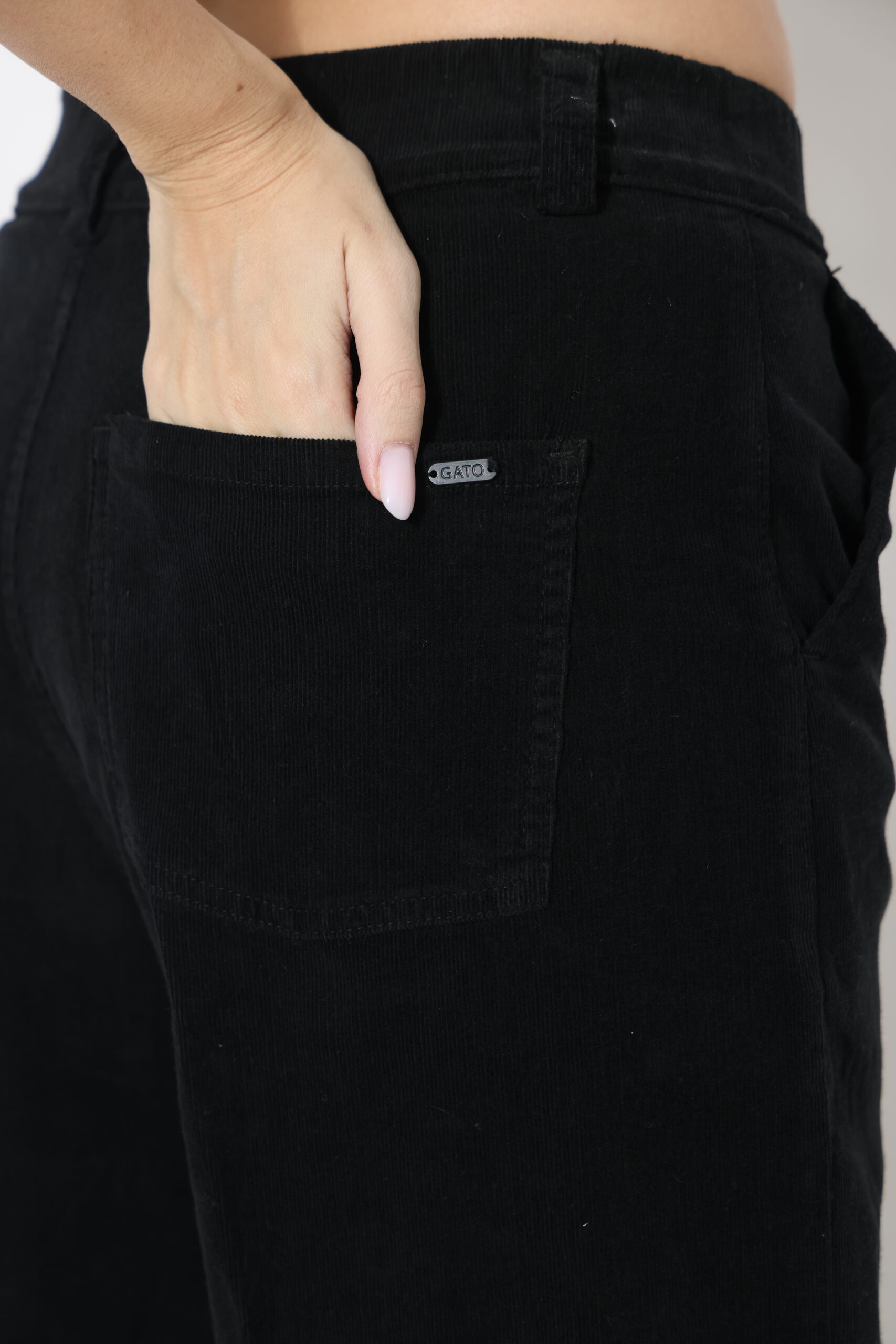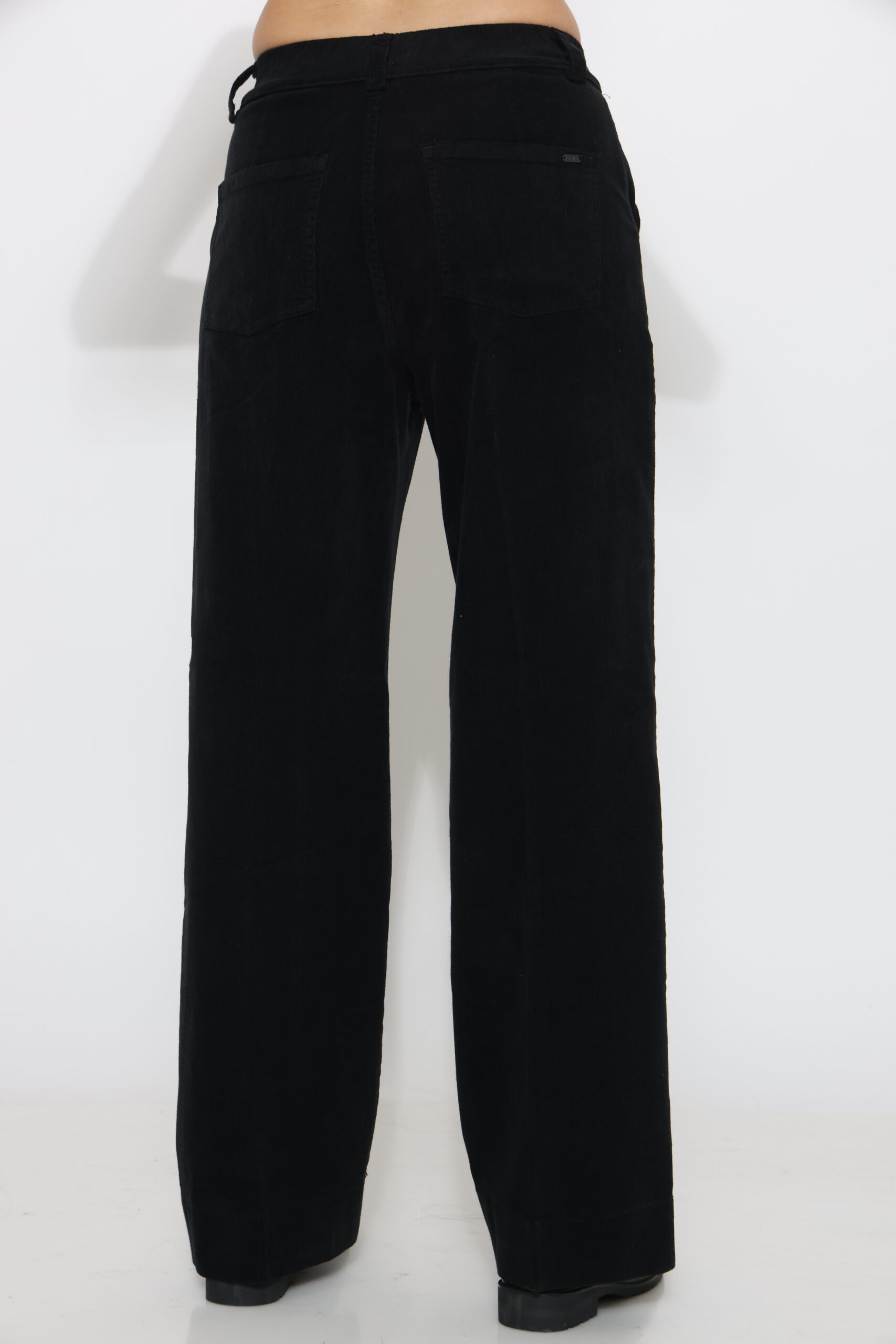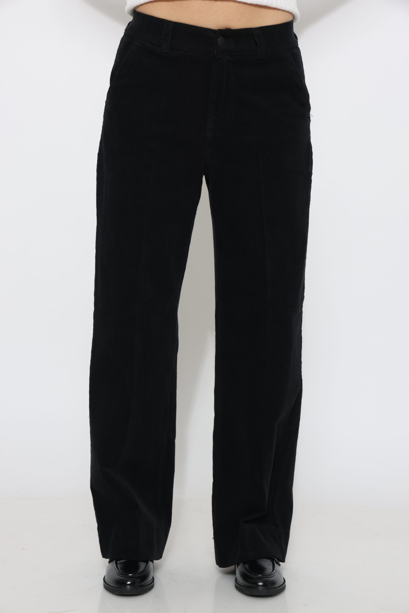 מכנסי קורדרוי בגיזרה ישרה עם גומי נסתר בחגורה וסגירת כפתור עם לייקרה