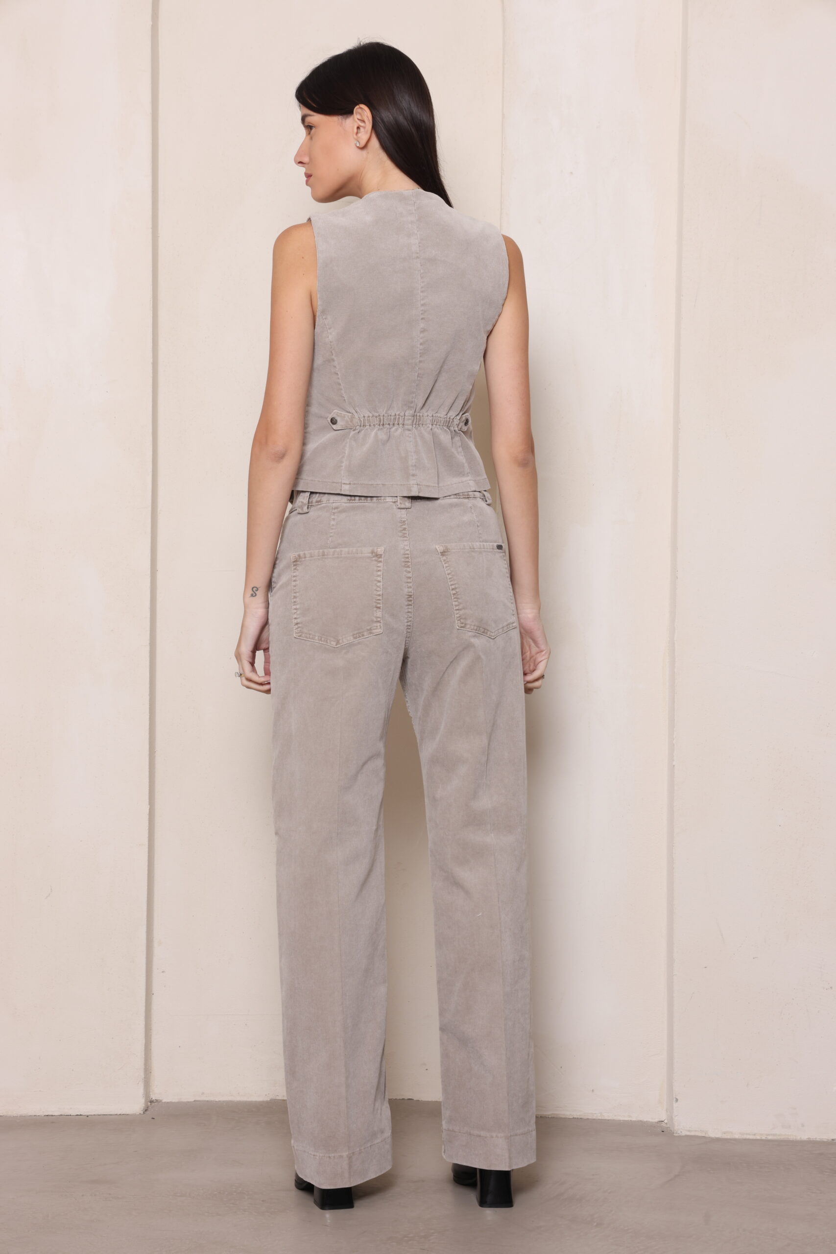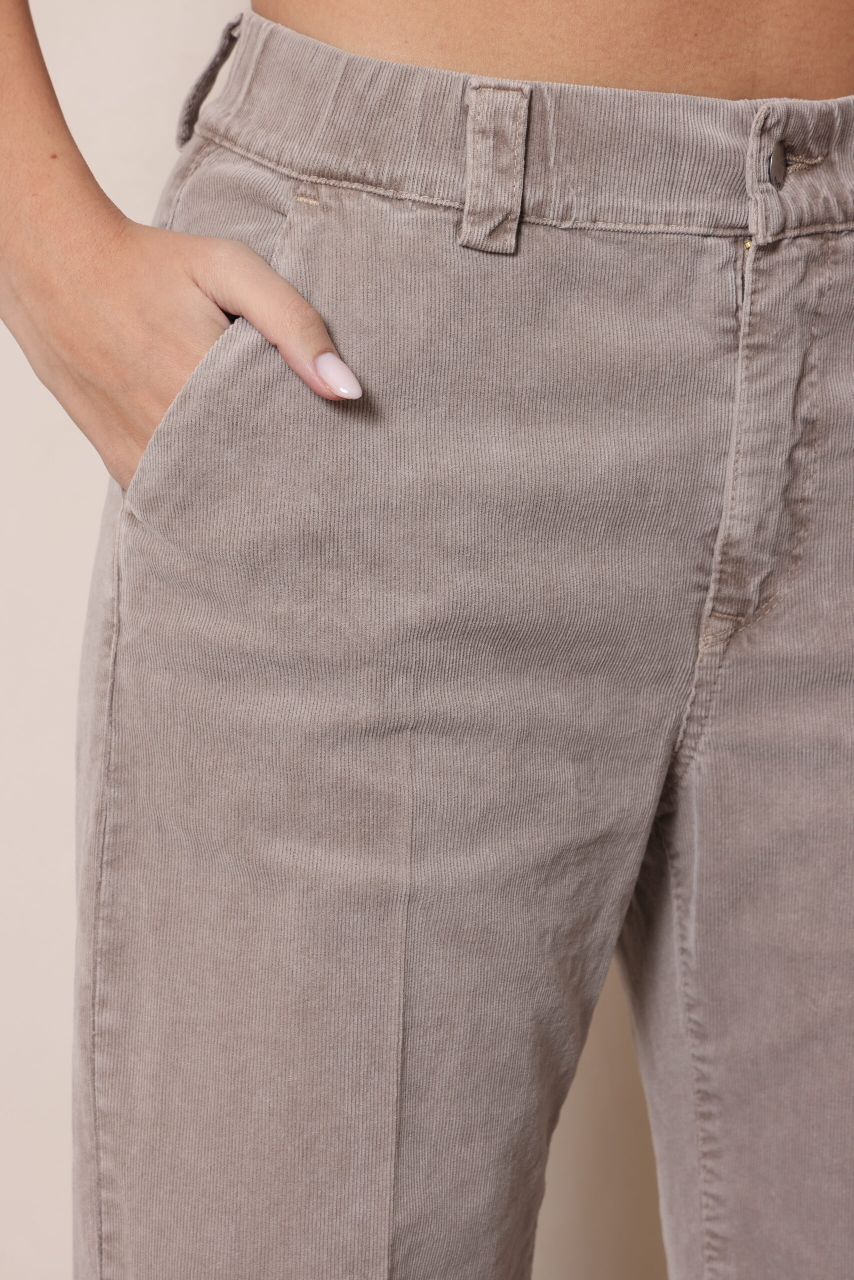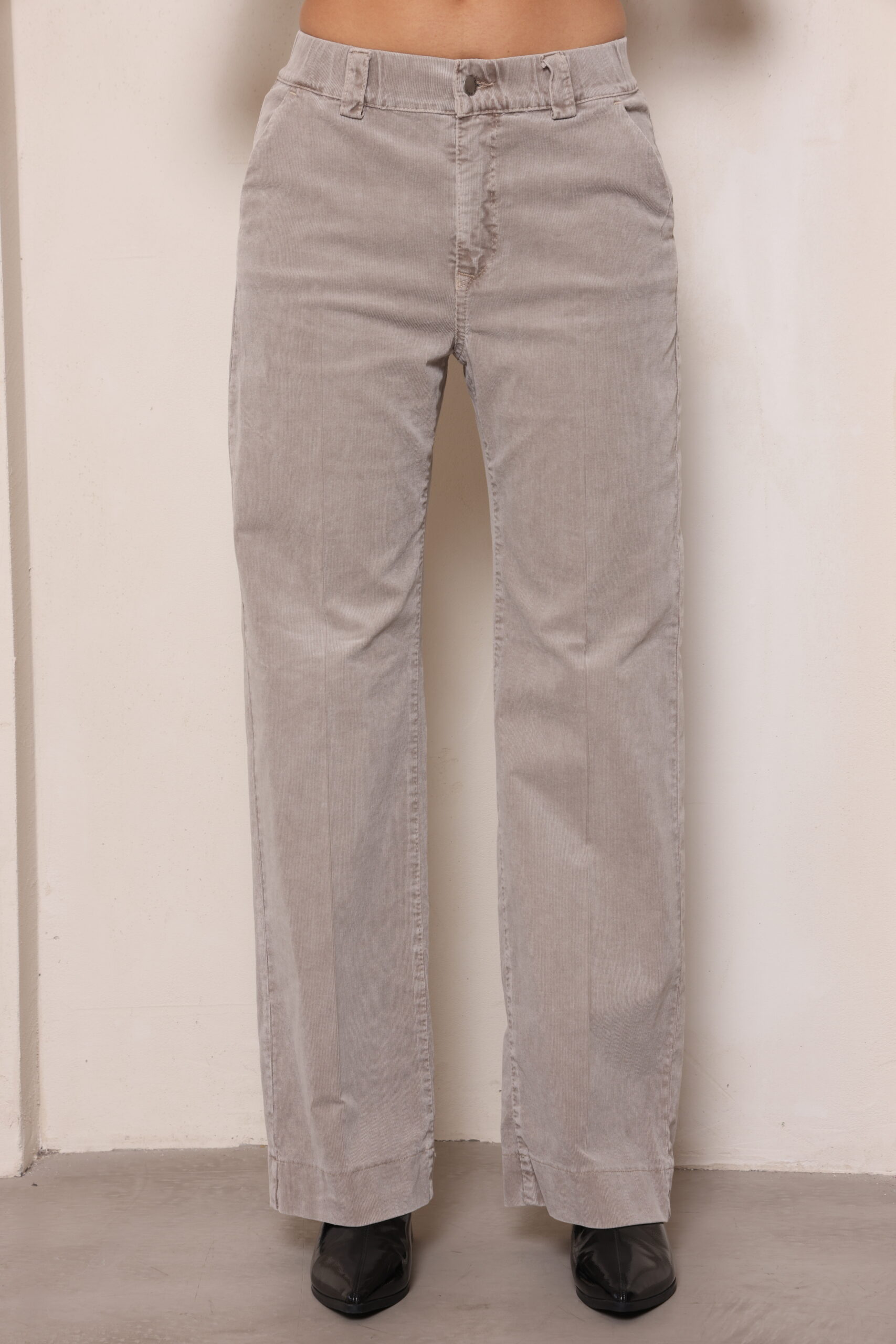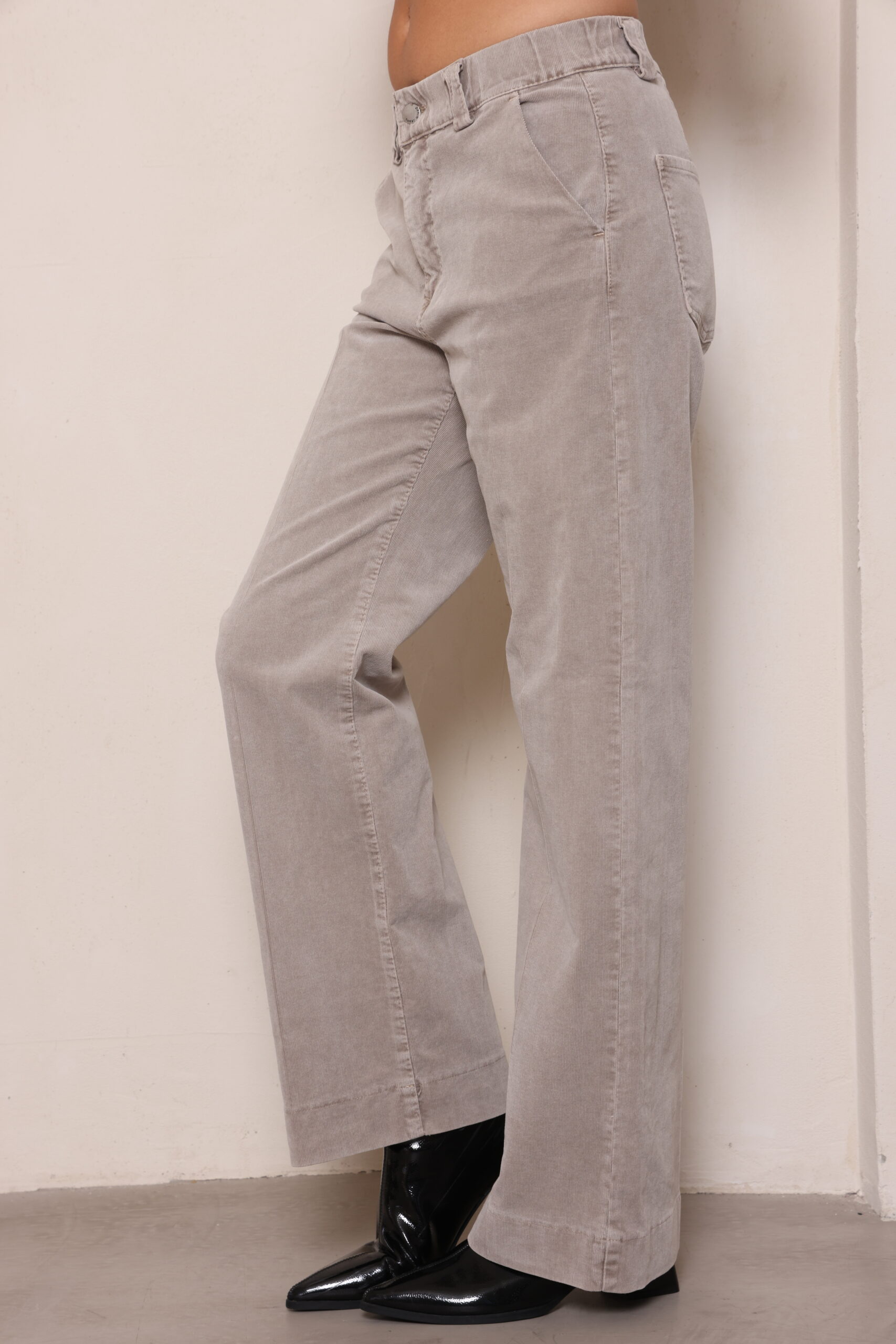 מכנסי קורדרוי בגיזרה ישרה עם גומי נסתר בחגורה וסגירת כפתור עם לייקרה