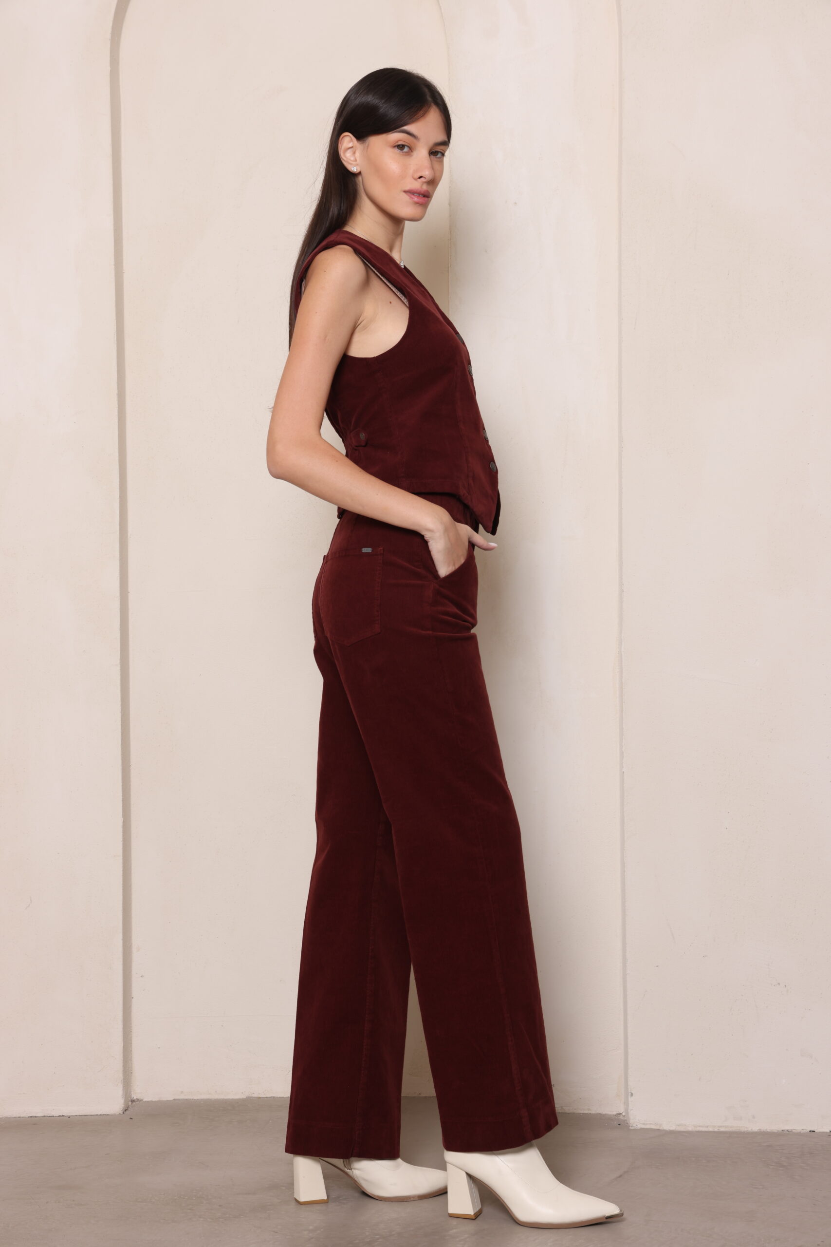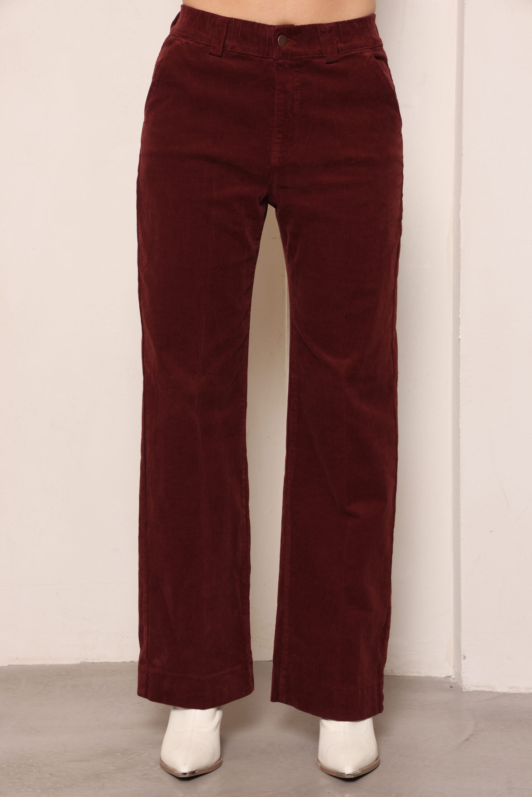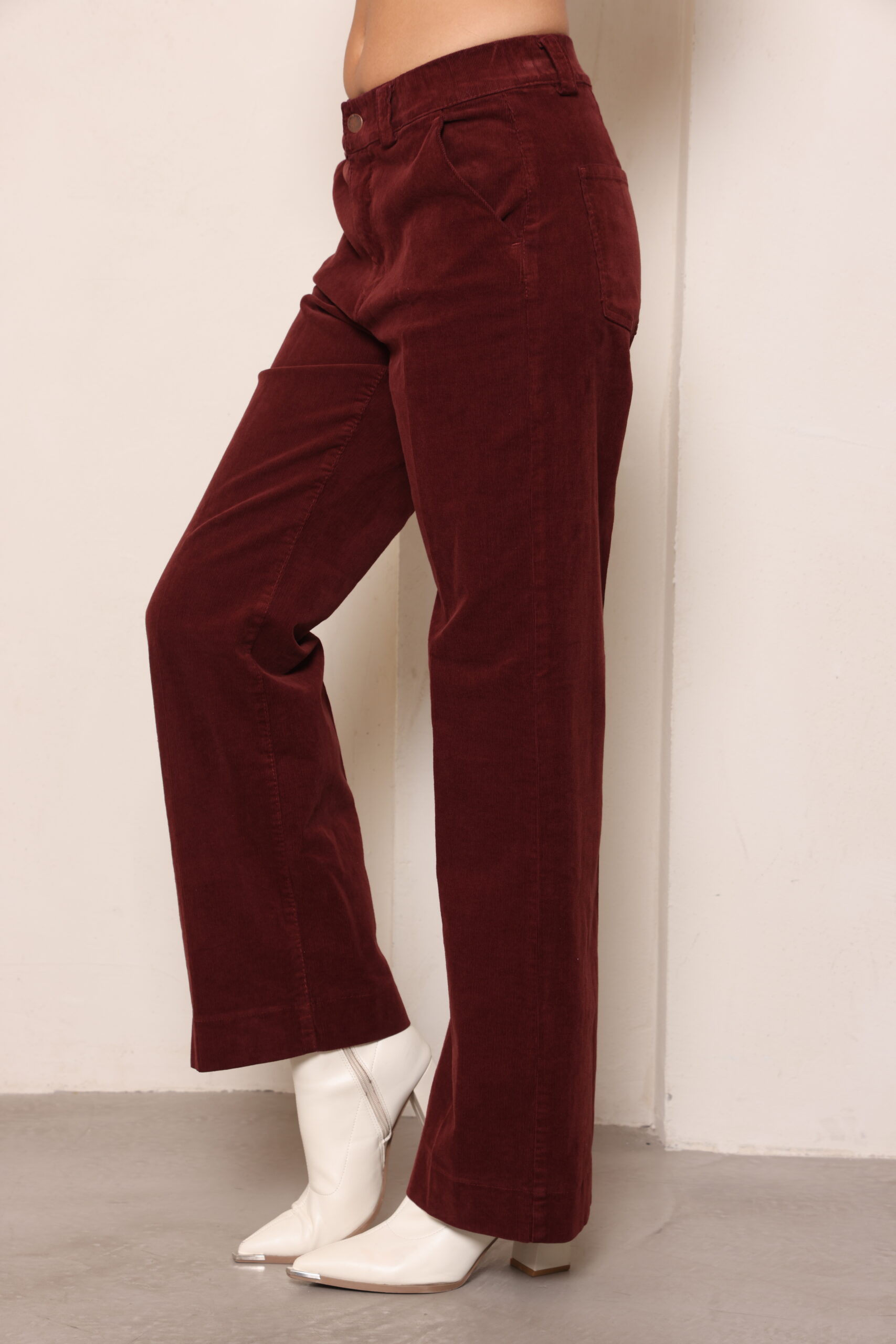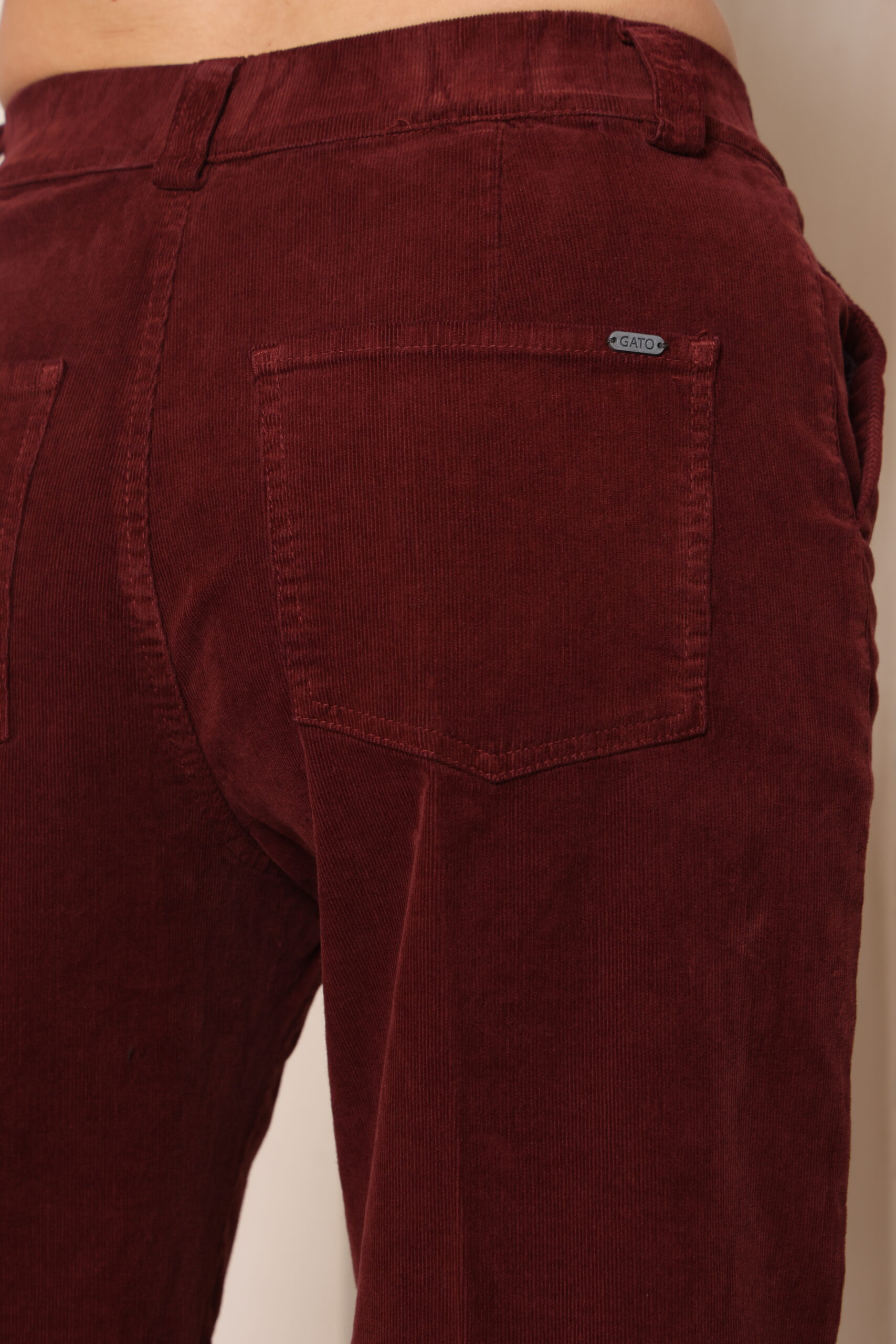 מכנסי קורדרוי בגיזרה ישרה עם גומי נסתר בחגורה וסגירת כפתור עם לייקרה