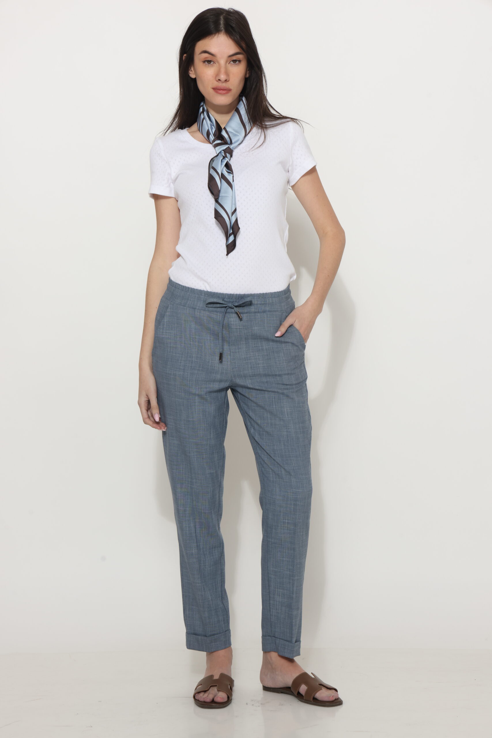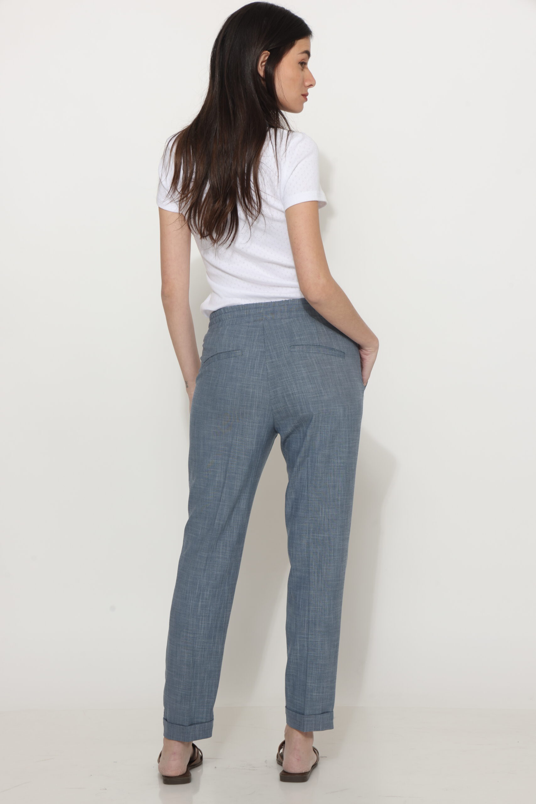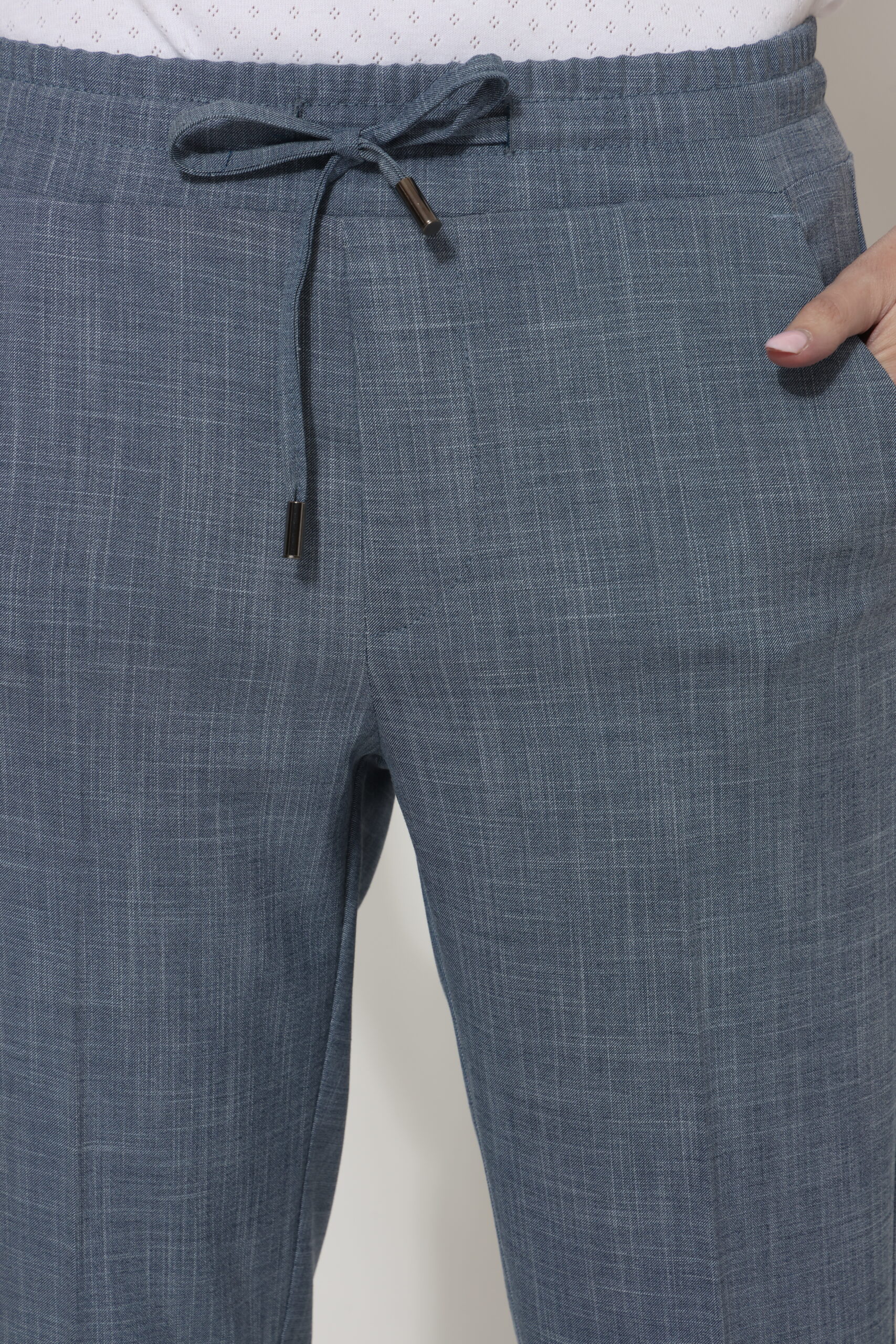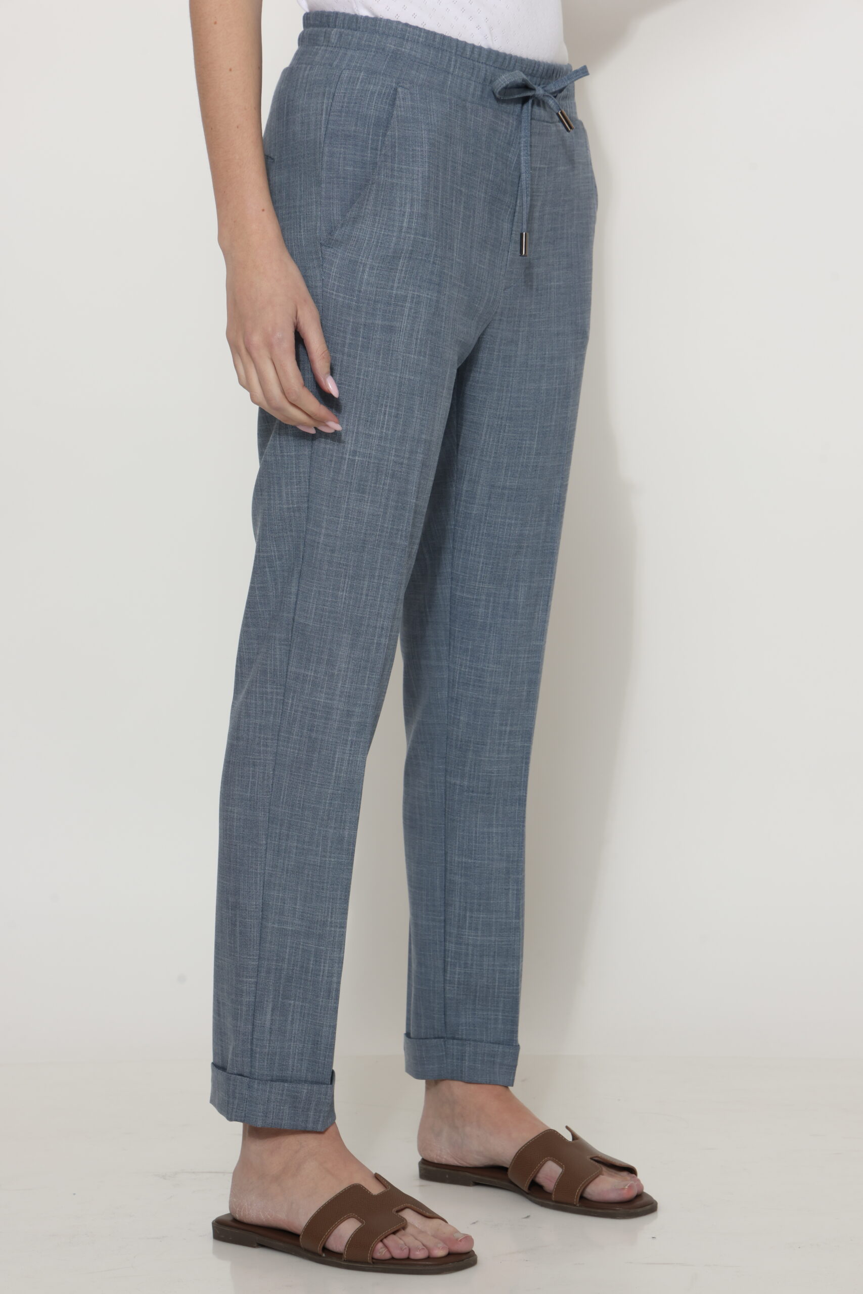 מכנסיים בגזרת לוס מבד במראה פשתן, אורך קרסול עם גומי במותן ושרוך קשירה. קיפול מובנה בסיומת.
