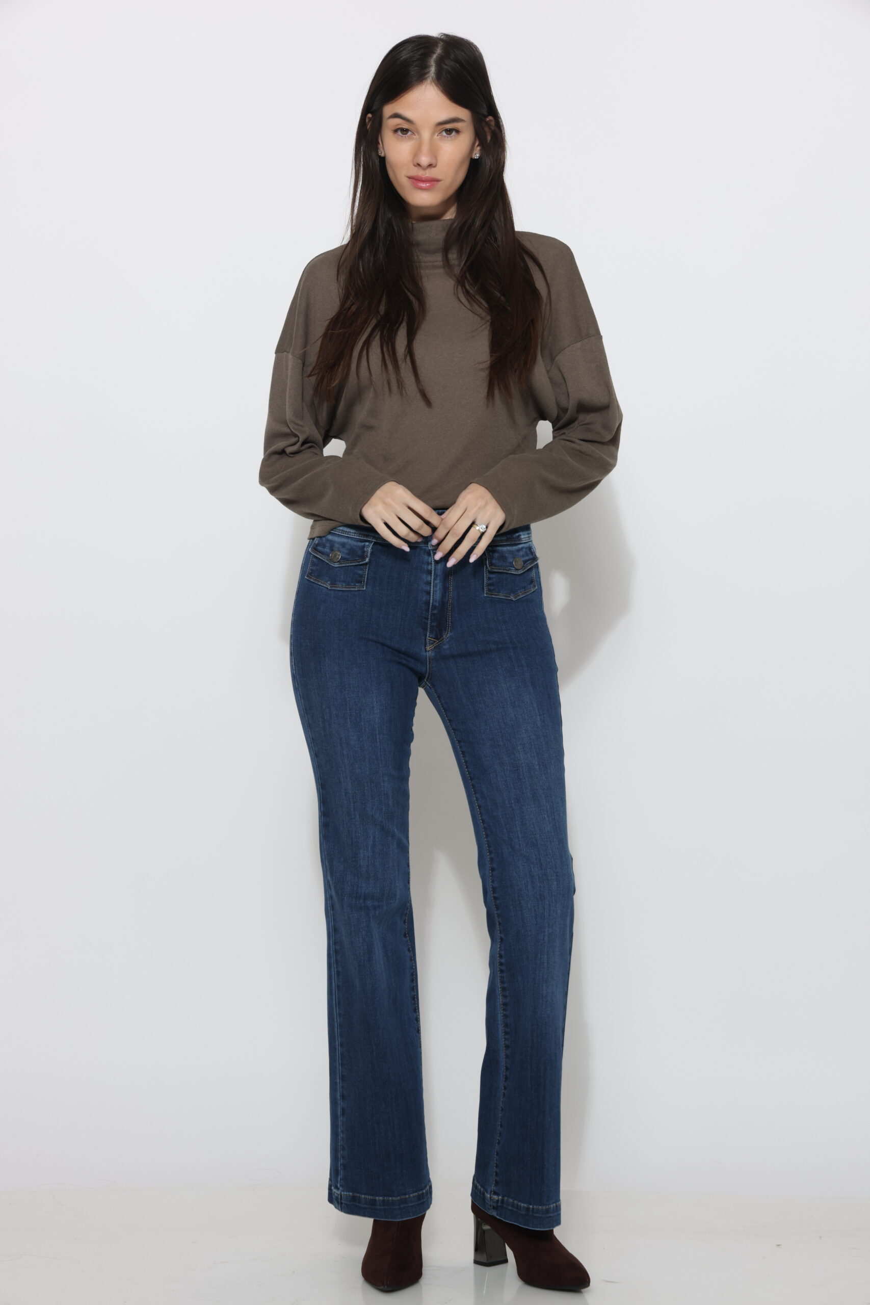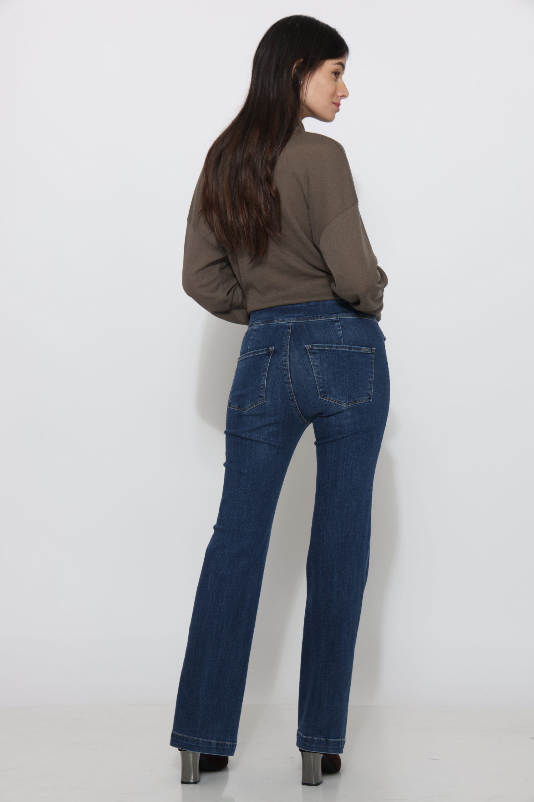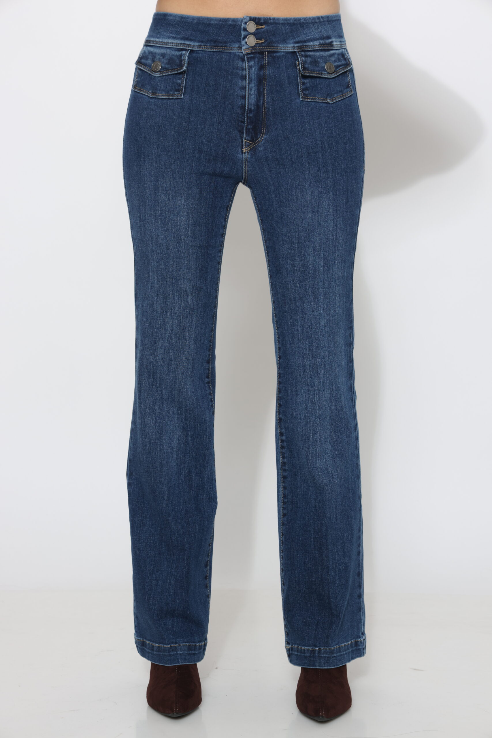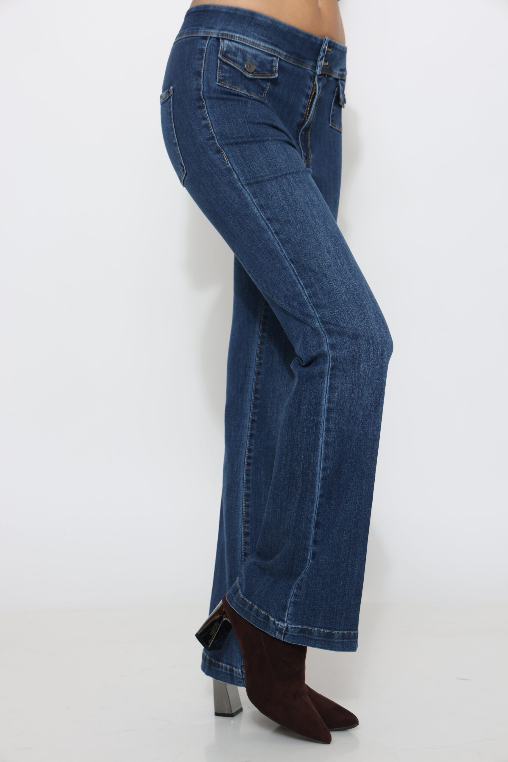 גינס בגזרה מתרחב ארוכה עם שני כפתורים בחגורה רחבה עם כיסים קטנים מקדימה, לייקרה מחטבת