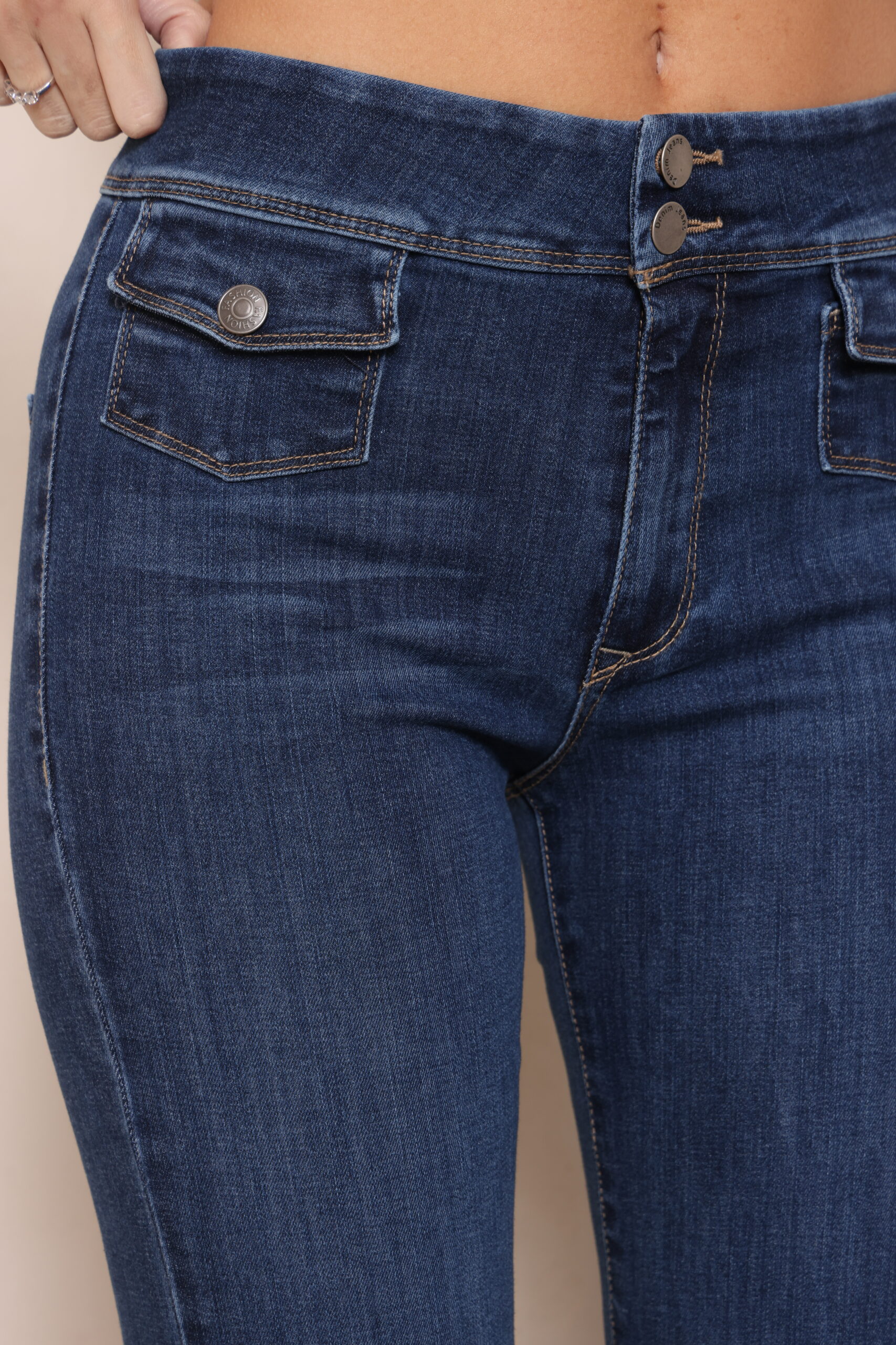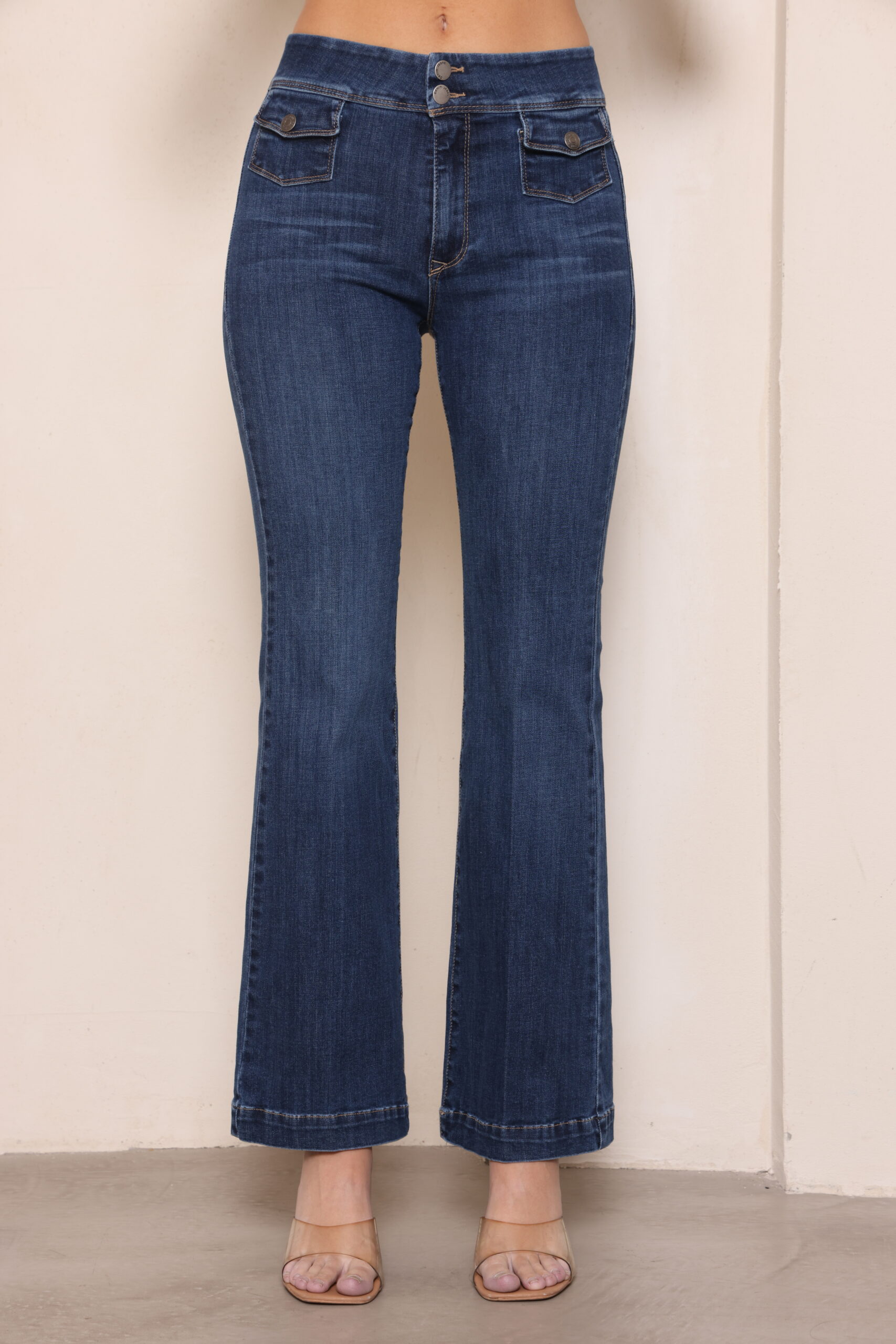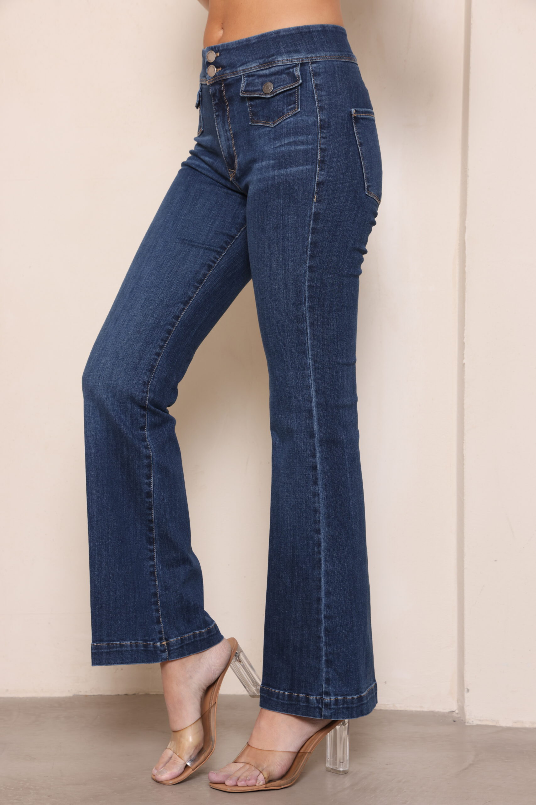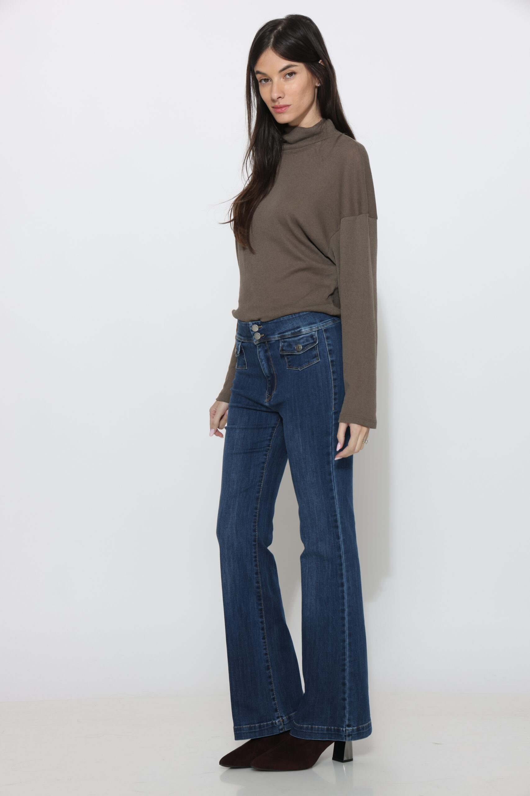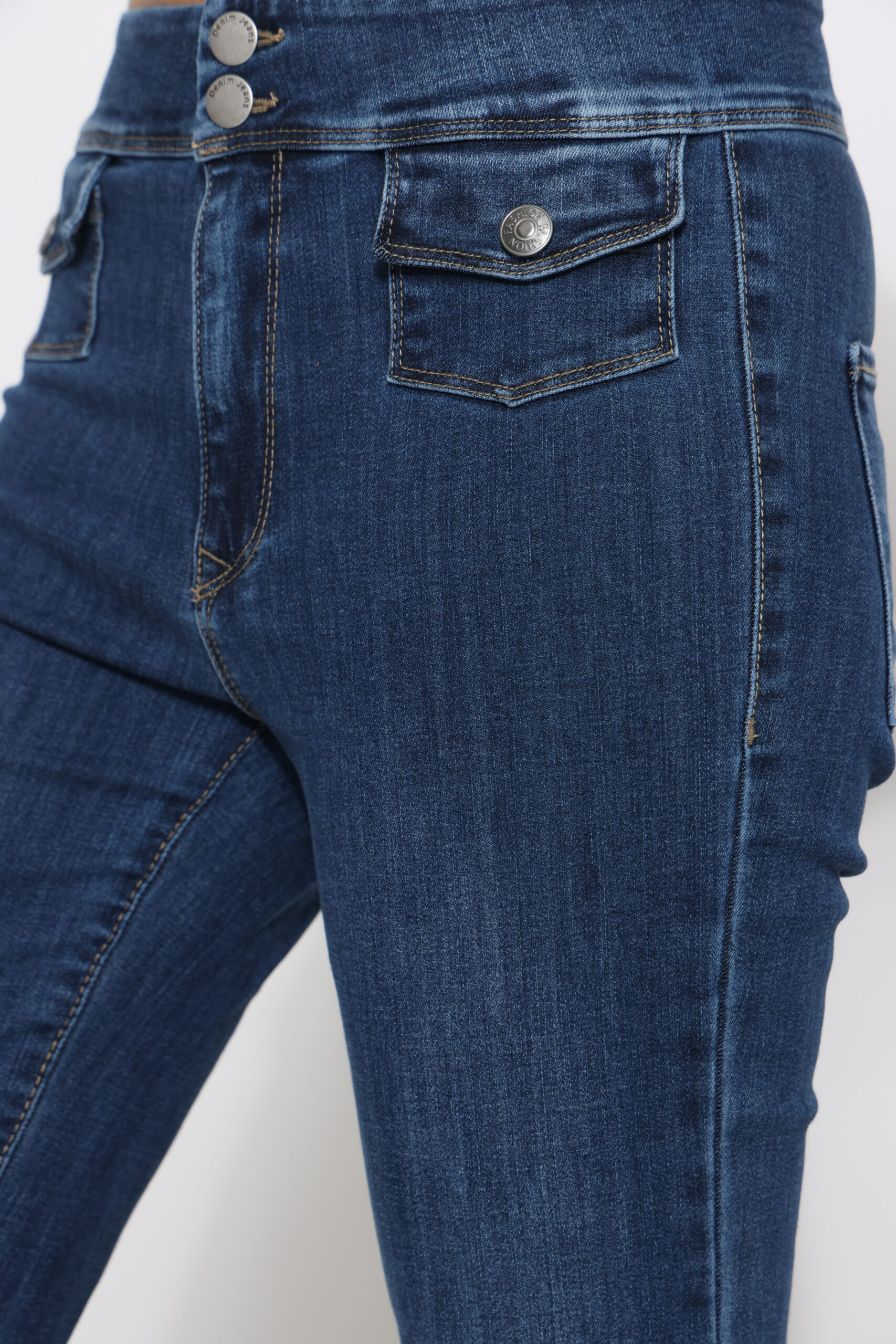 גינס בגזרה מתרחב ארוכה עם שני כפתורים בחגורה רחבה עם כיסים קטנים מקדימה, לייקרה מחטבת