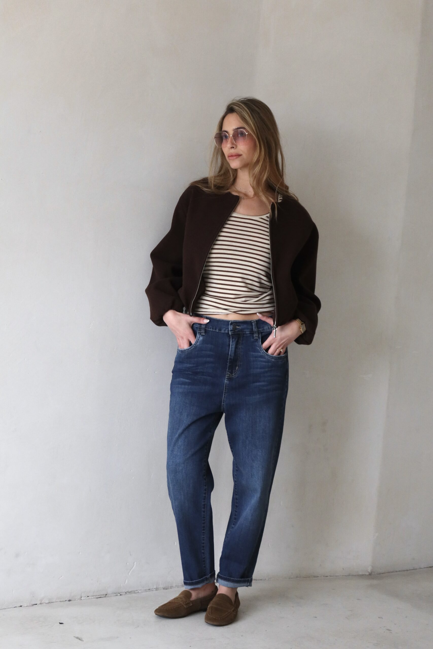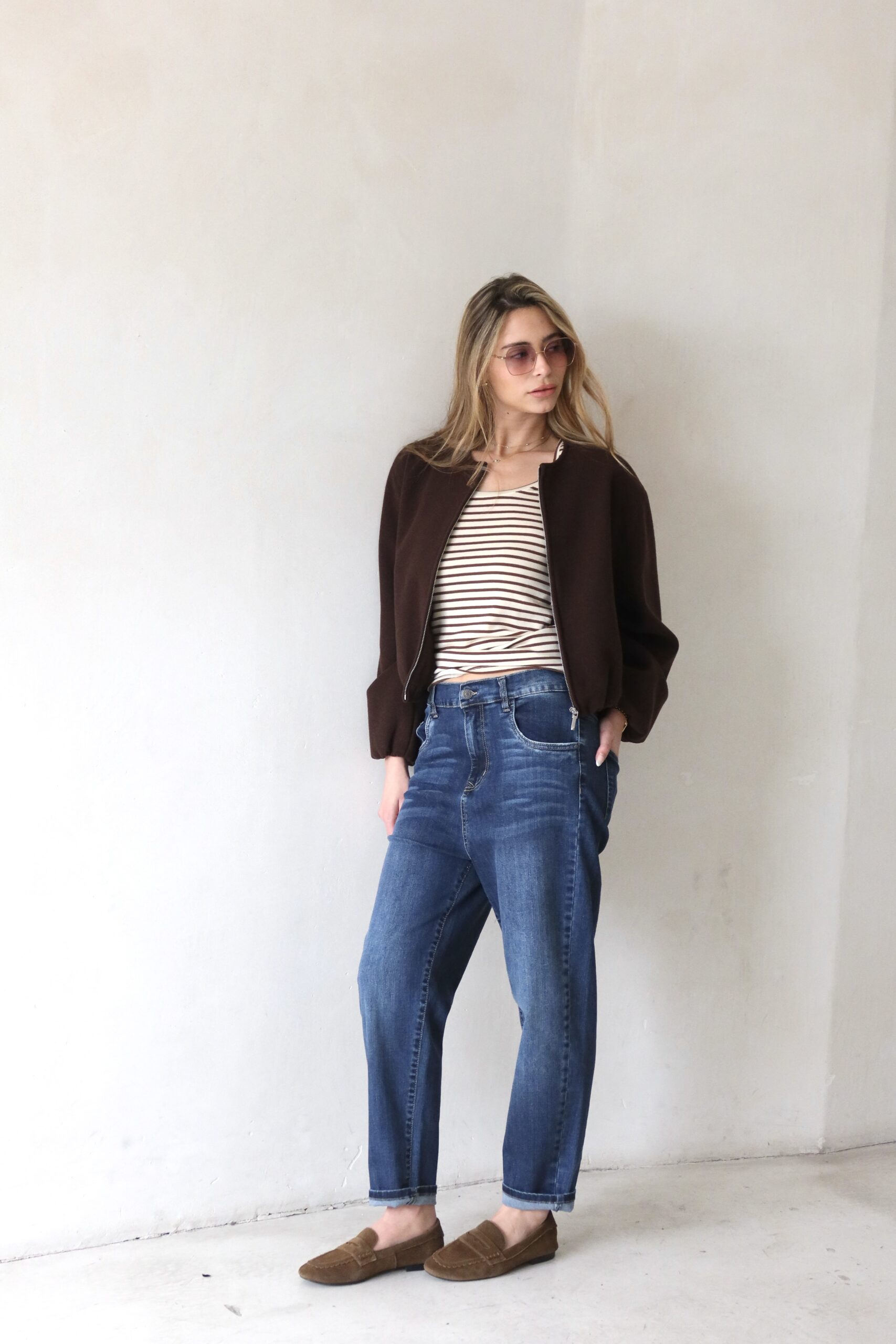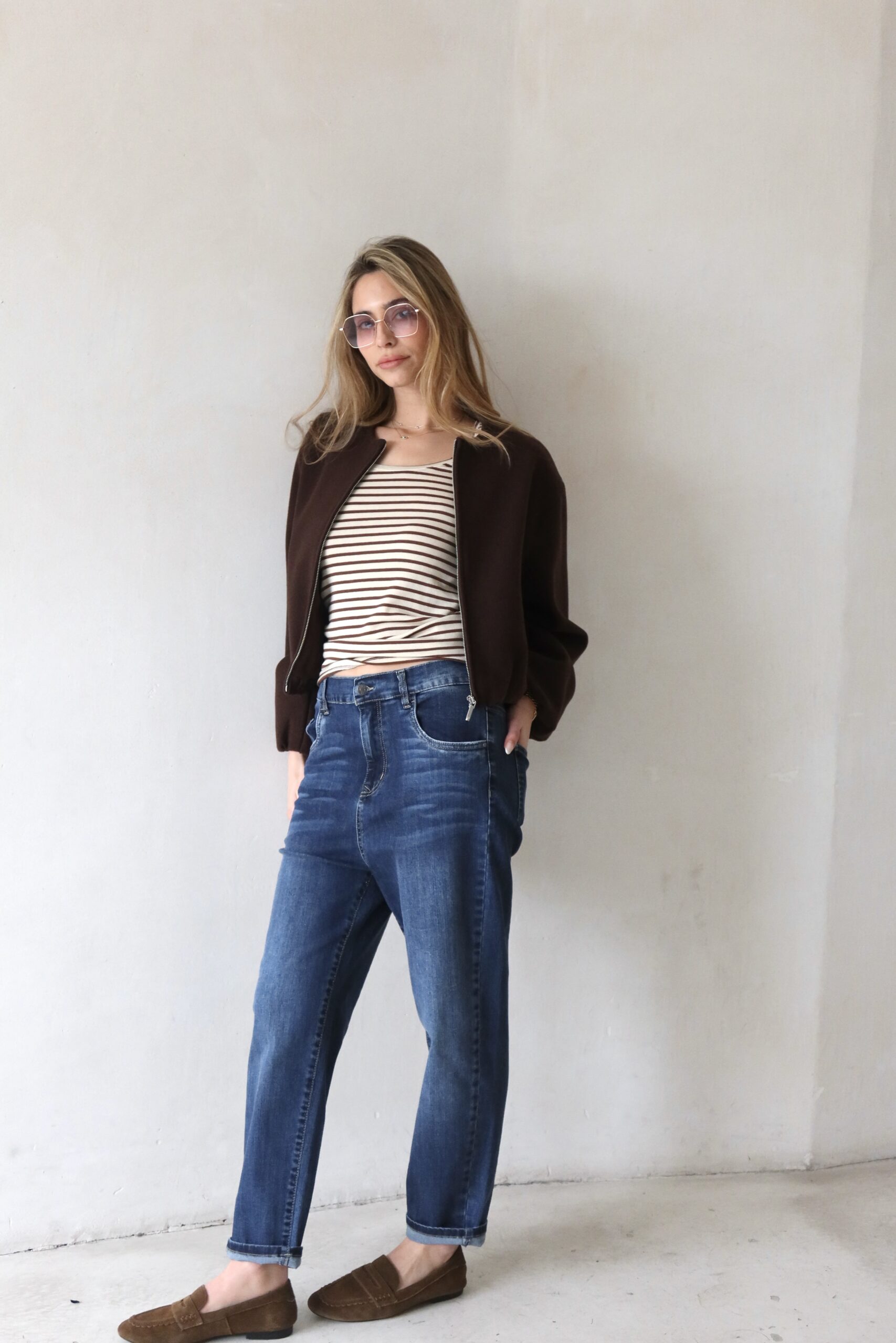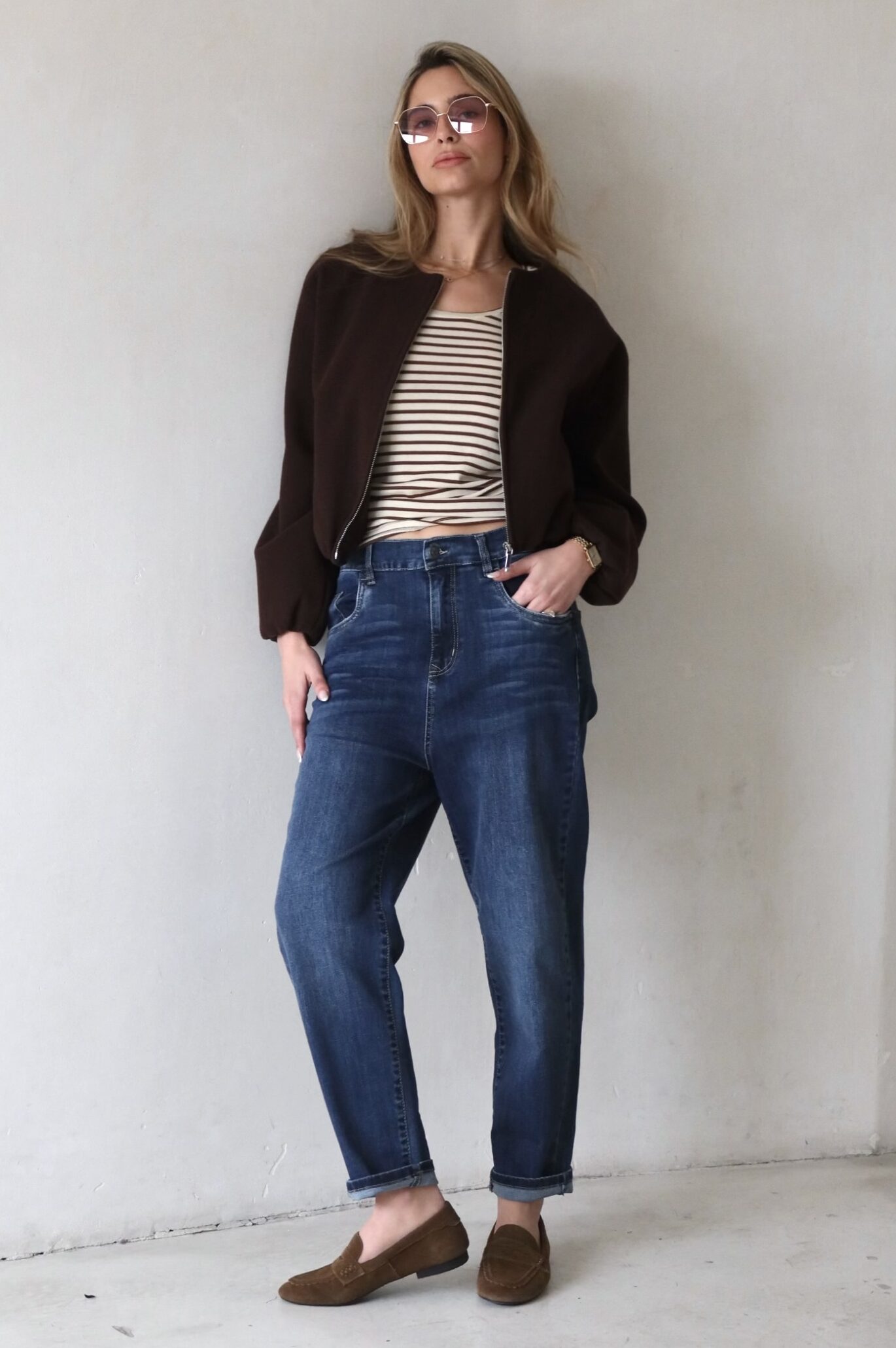 גינס בגזרת MOM בגוון כחול עם לייקרה וחצי גומי נסתר בחגורה