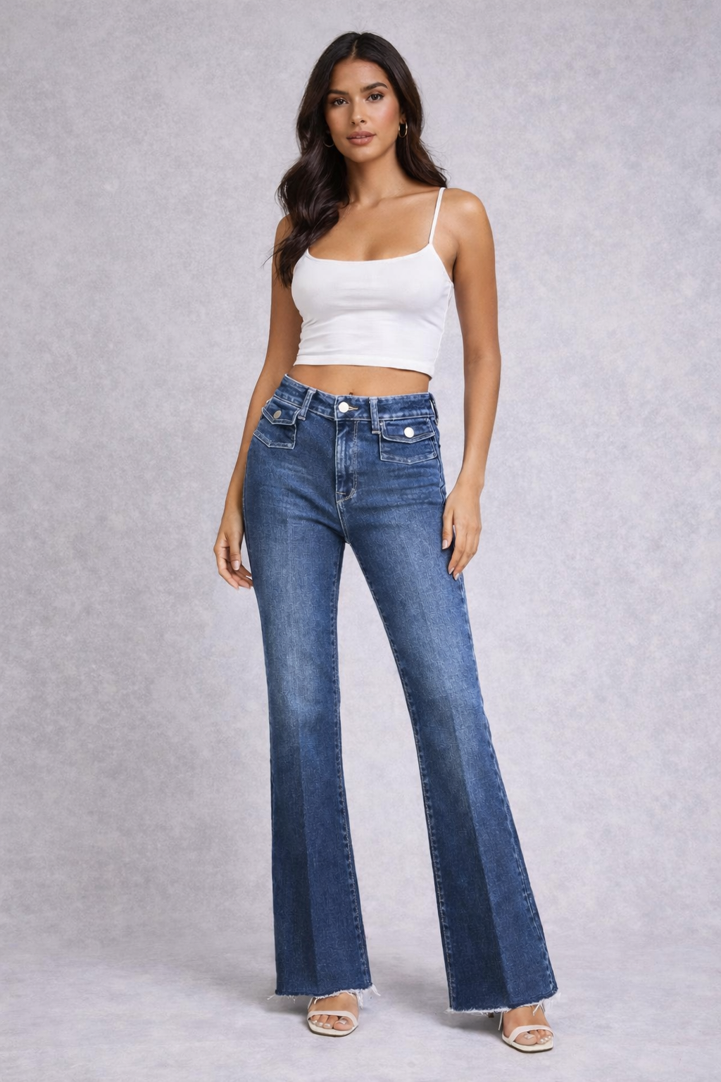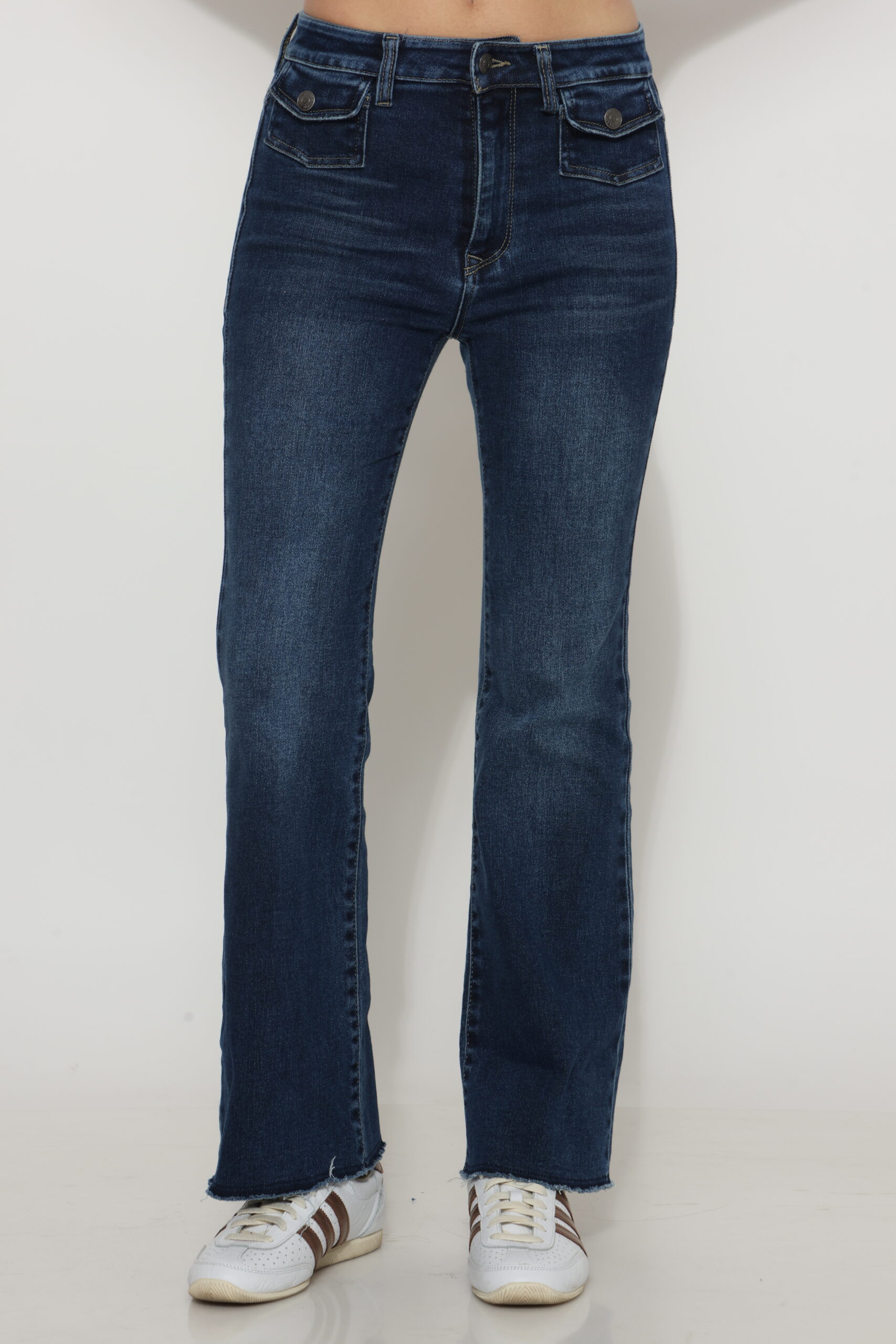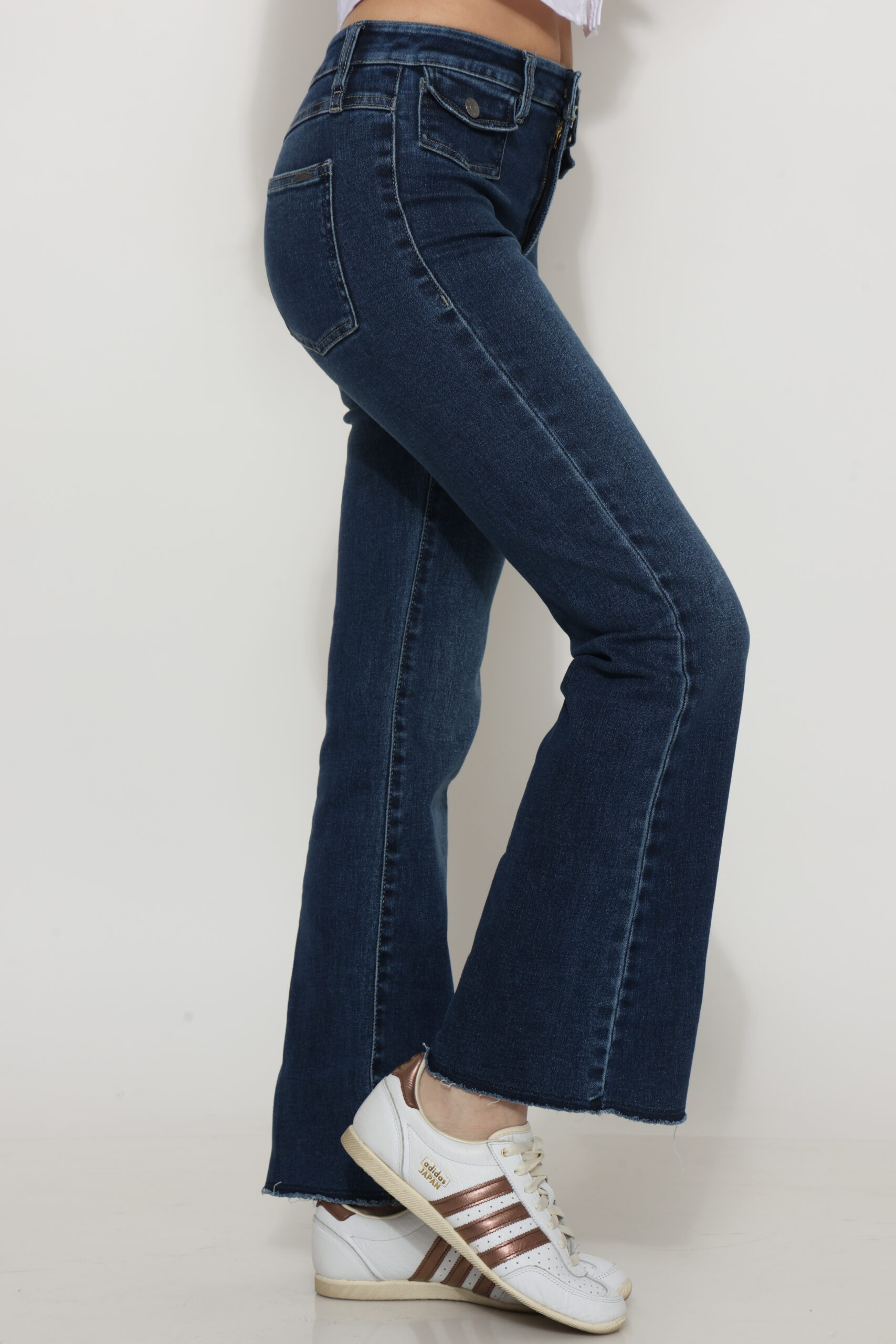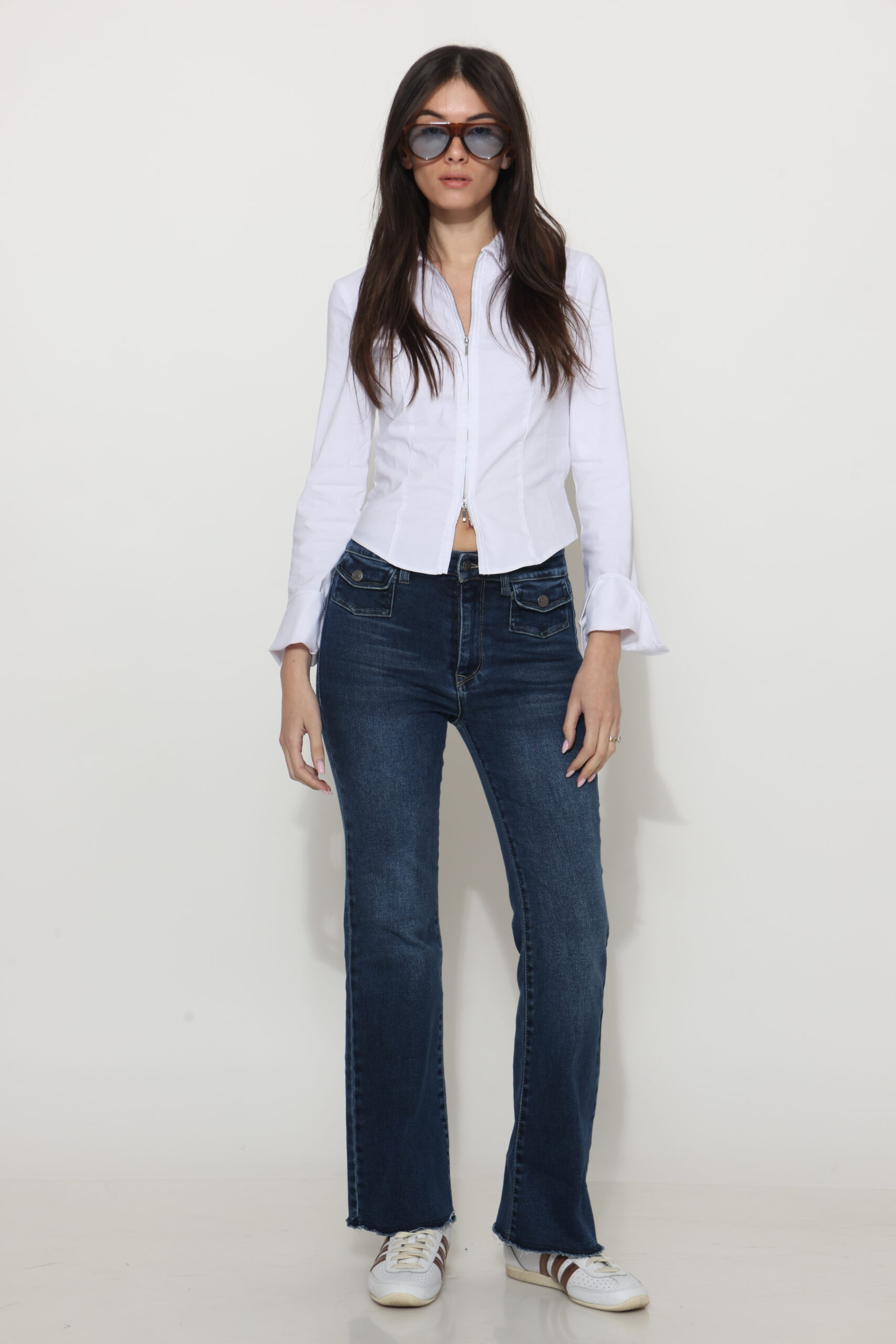 גינס כחול עם שני כיסי קלפות קדמיים וסגירת כפתור ורוכסן. בגזרת פלייר עם לייקרה