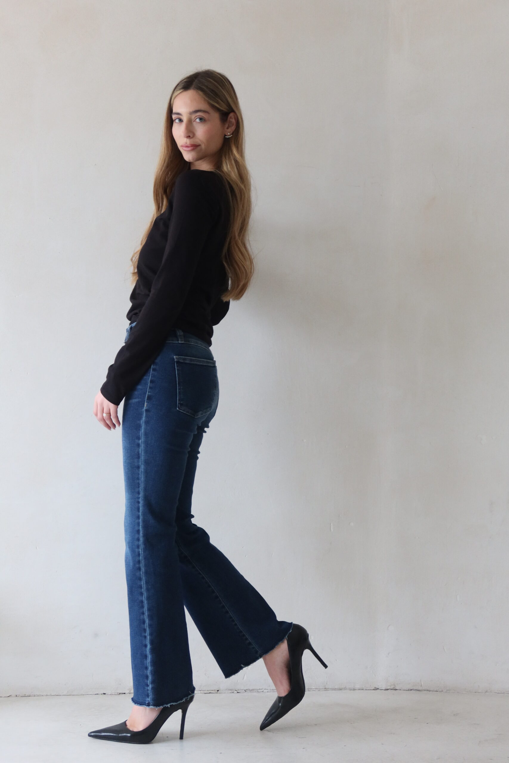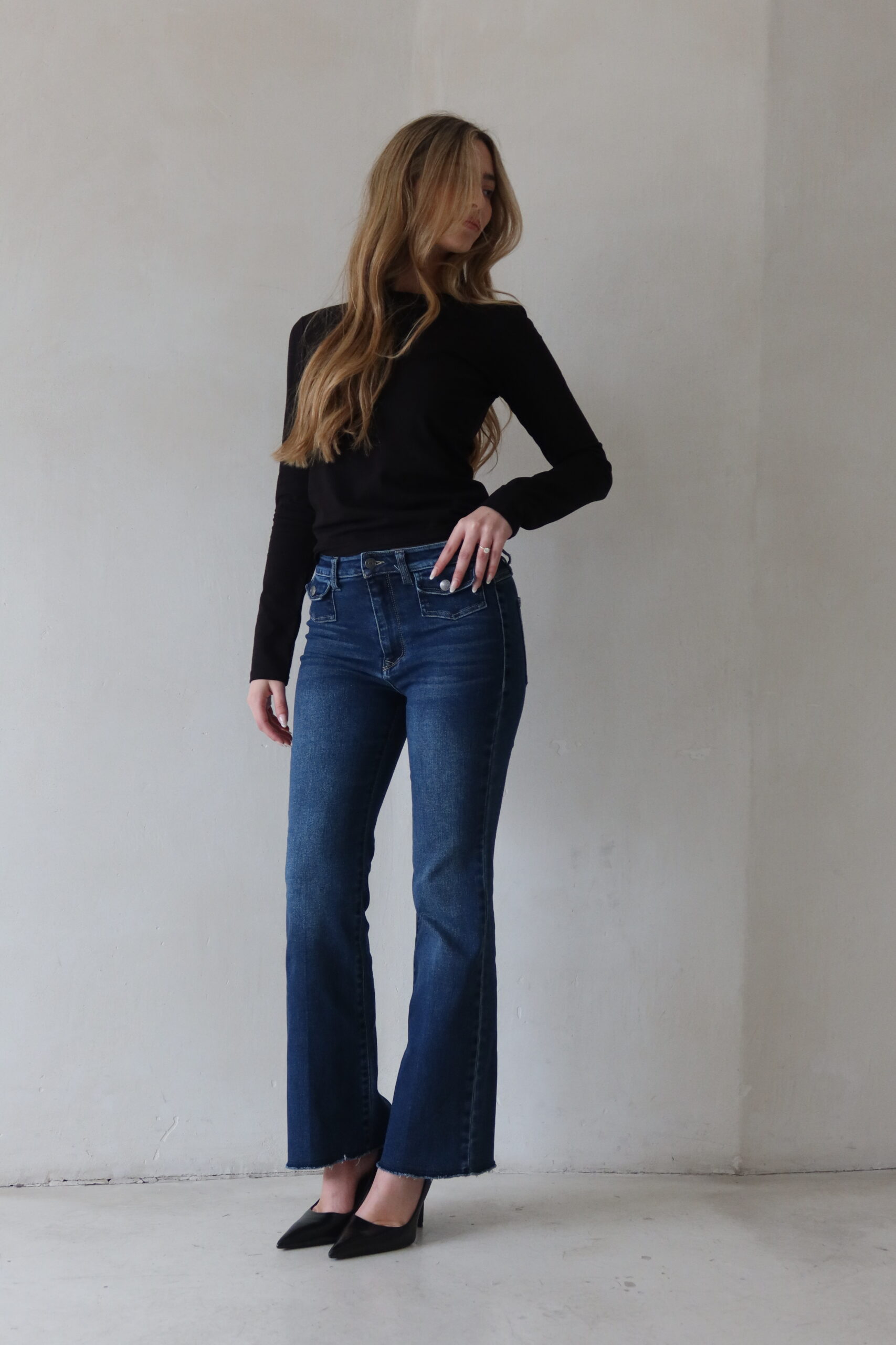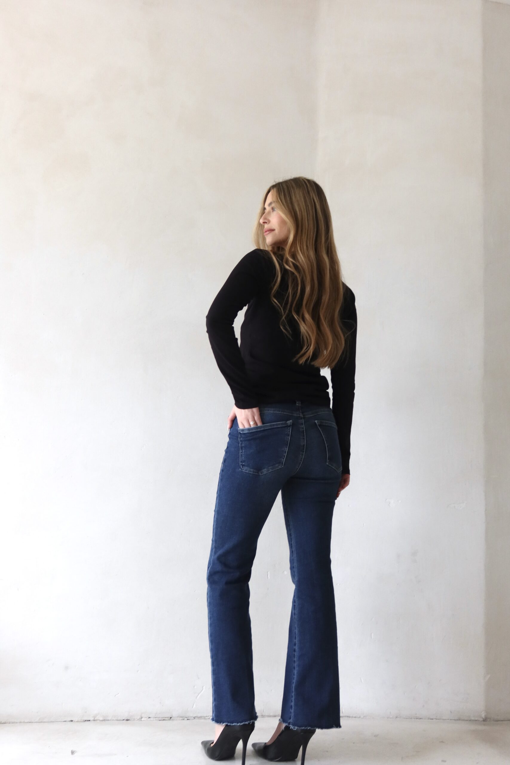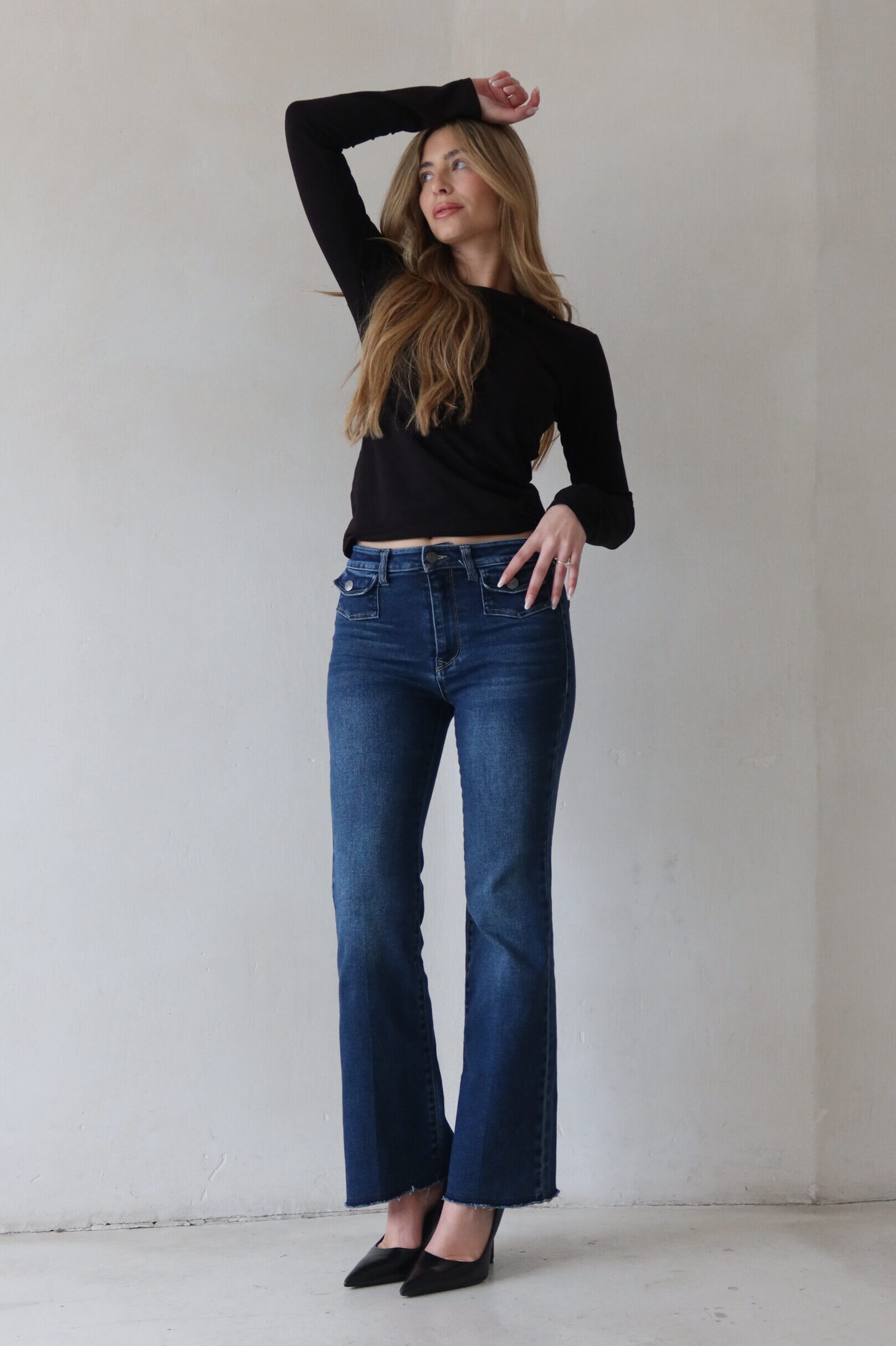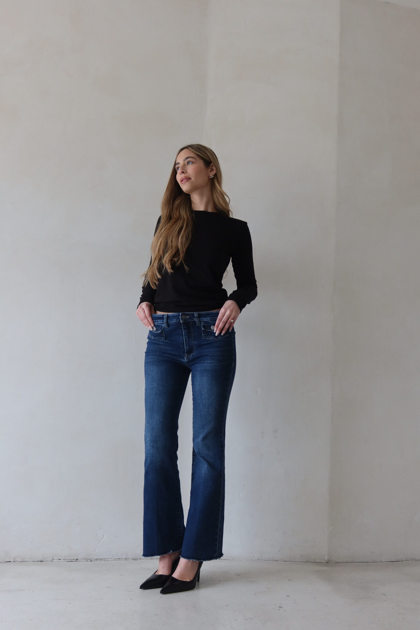 גינס כחול עם שני כיסי קלפות קדמיים וסגירת כפתור ורוכסן. בגזרת פלייר עם לייקרה