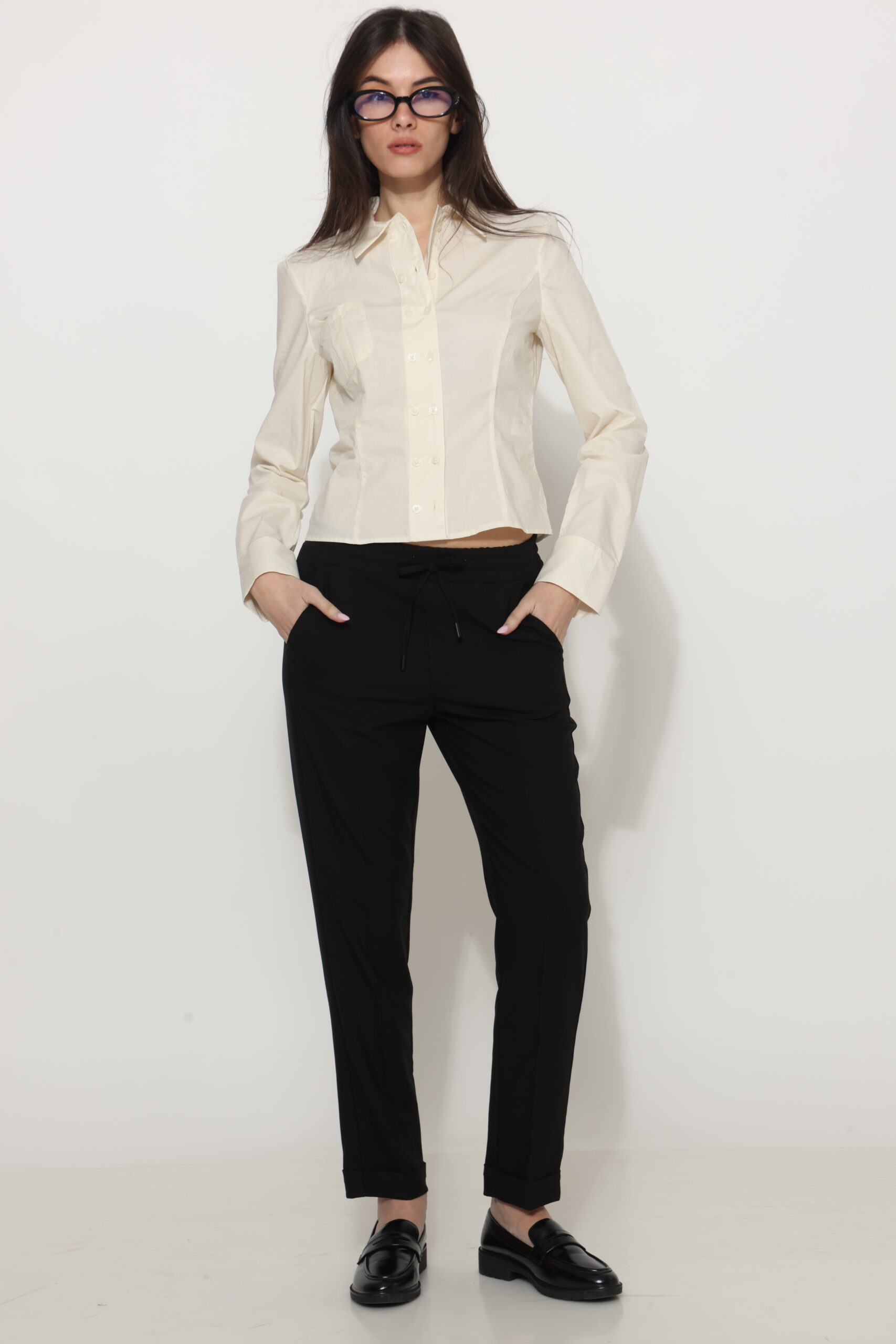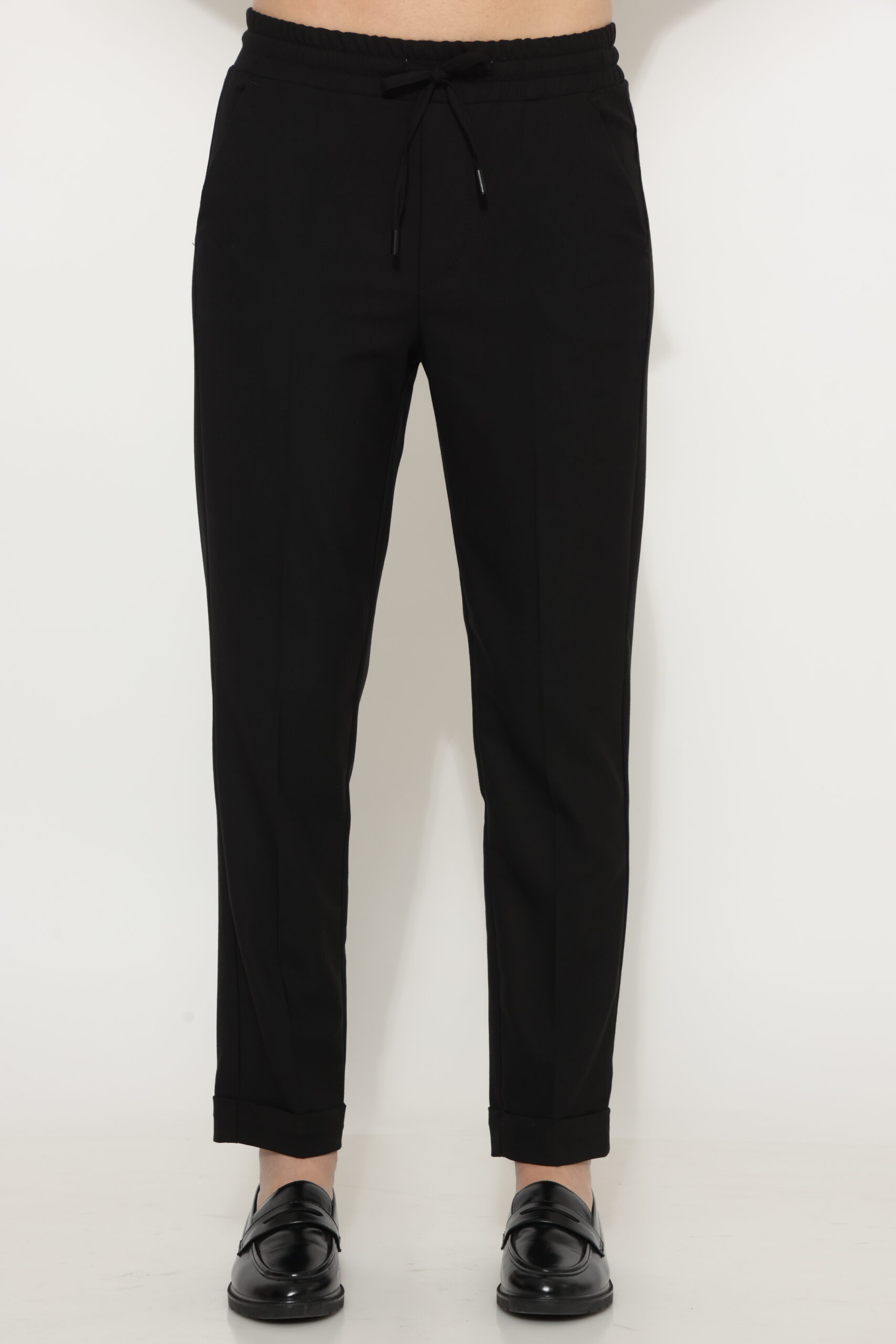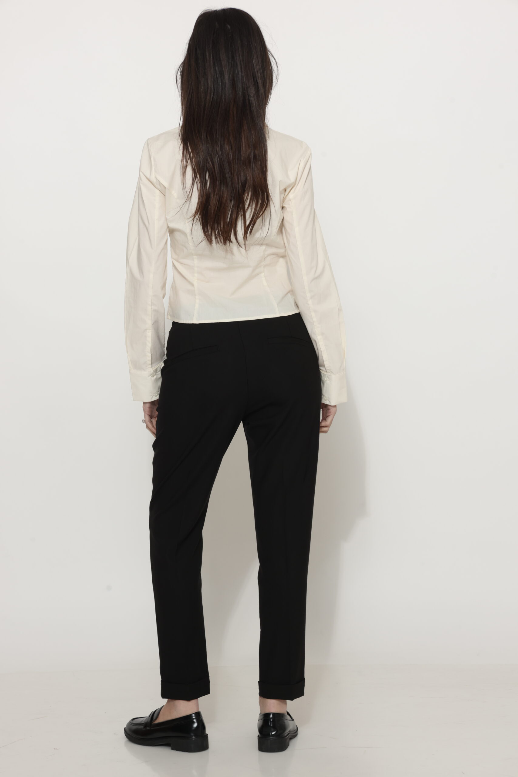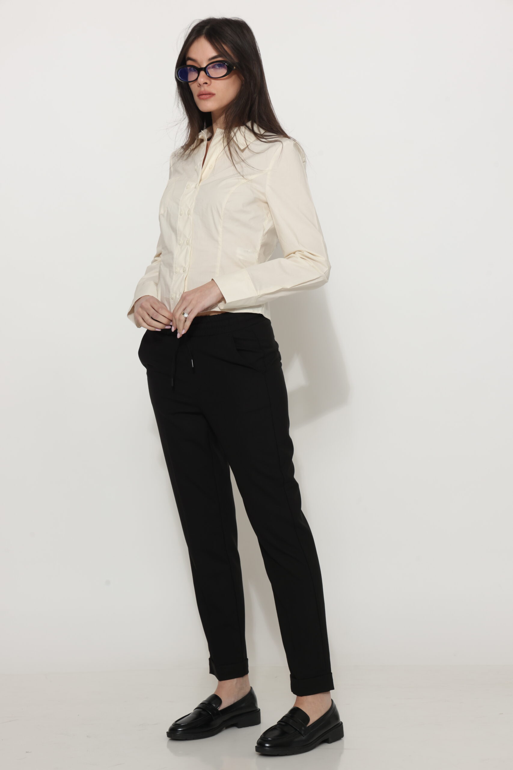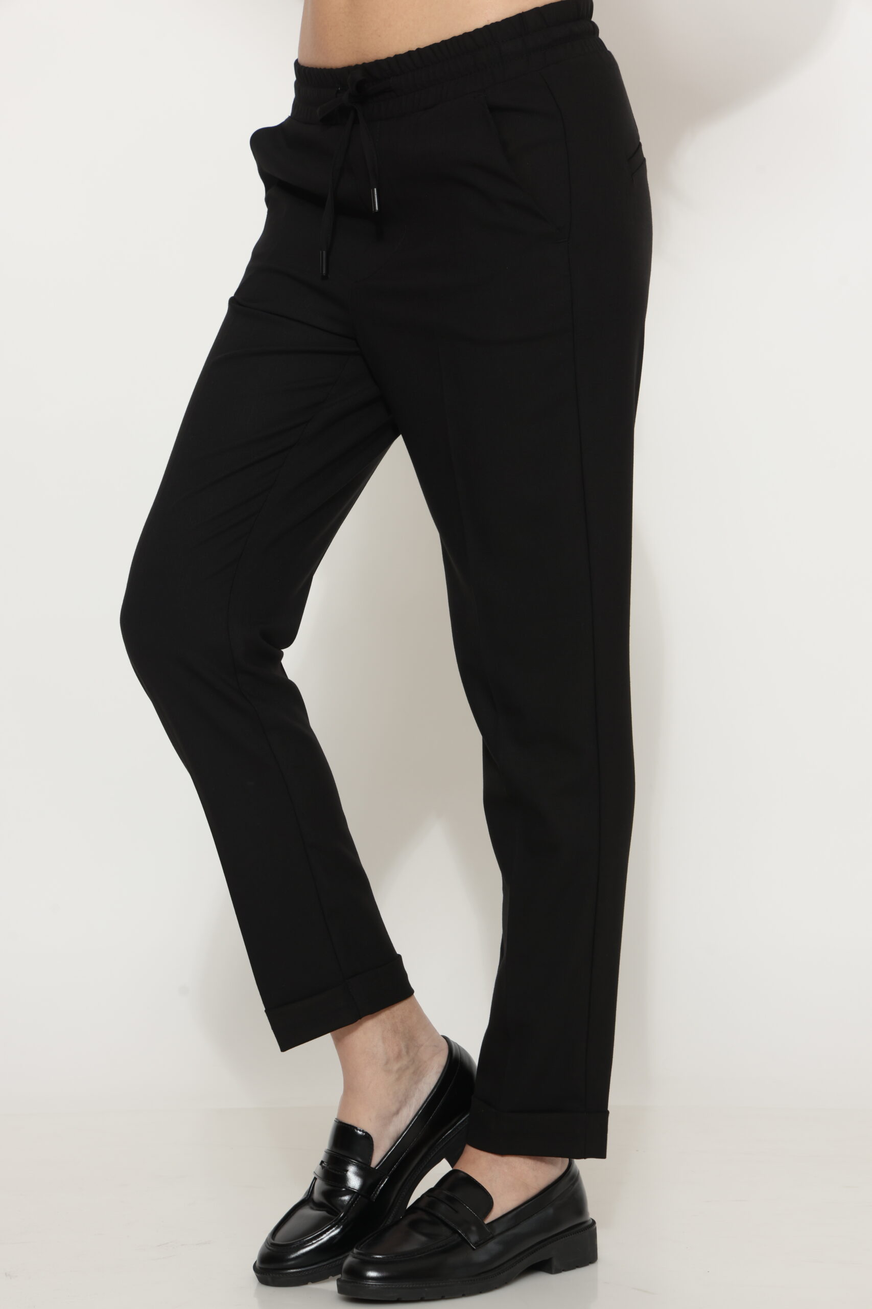 מכנסיים בגזרת לוס מבד במראה פשתן, אורך קרסול עם גומי במותן ושרוך קשירה. קיפול מובנה בסיומת. מוצר משלים ל- ווסט מוריאל שחור